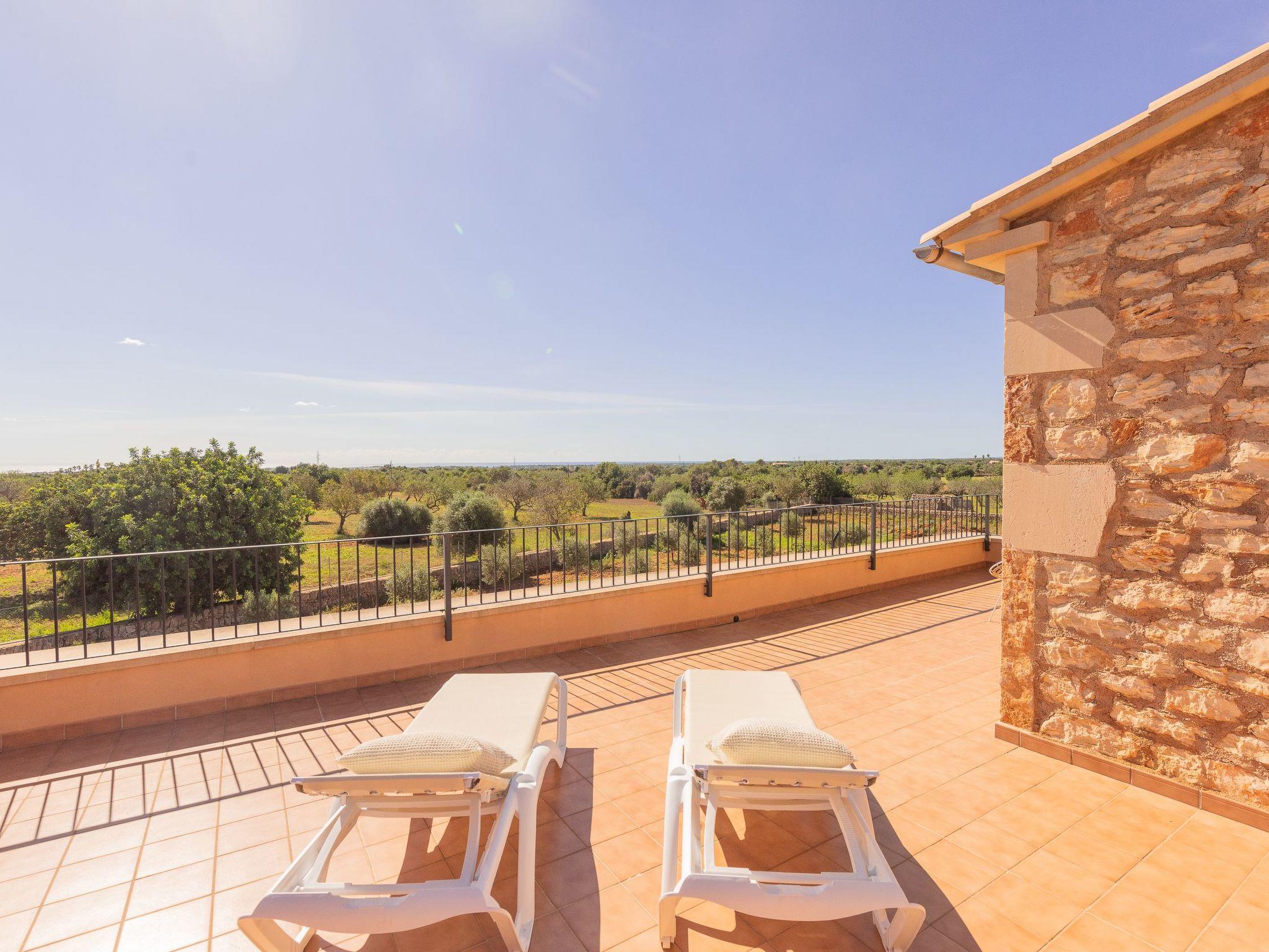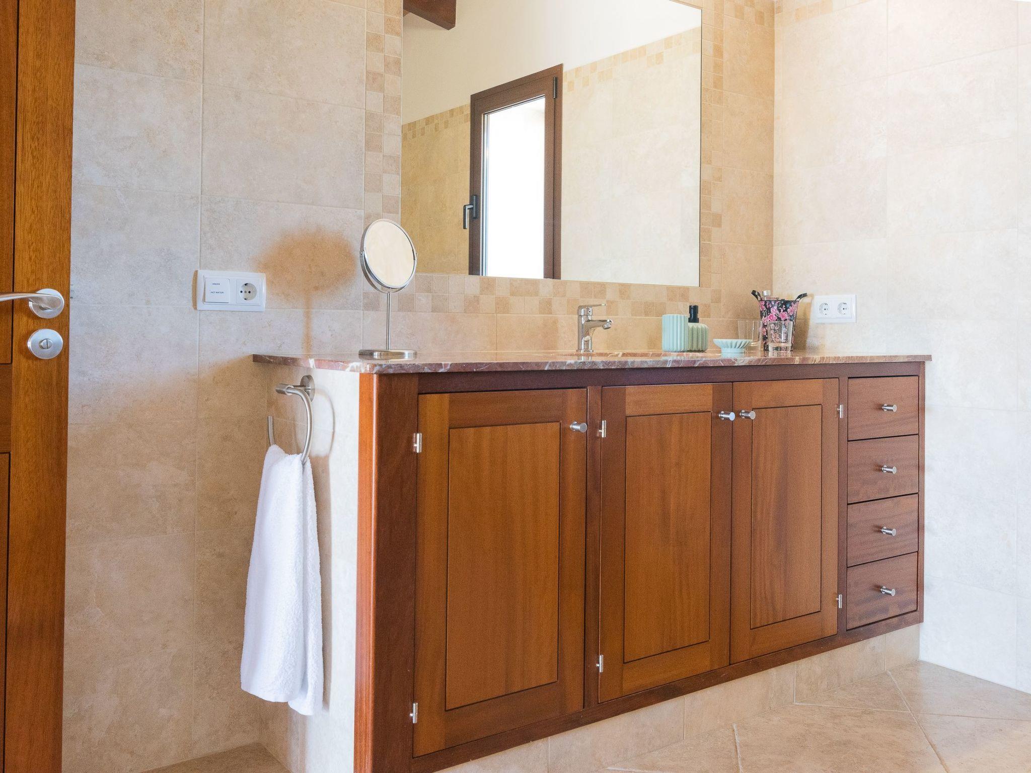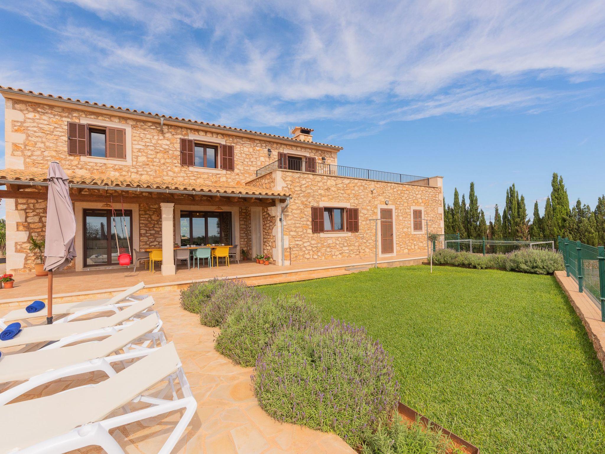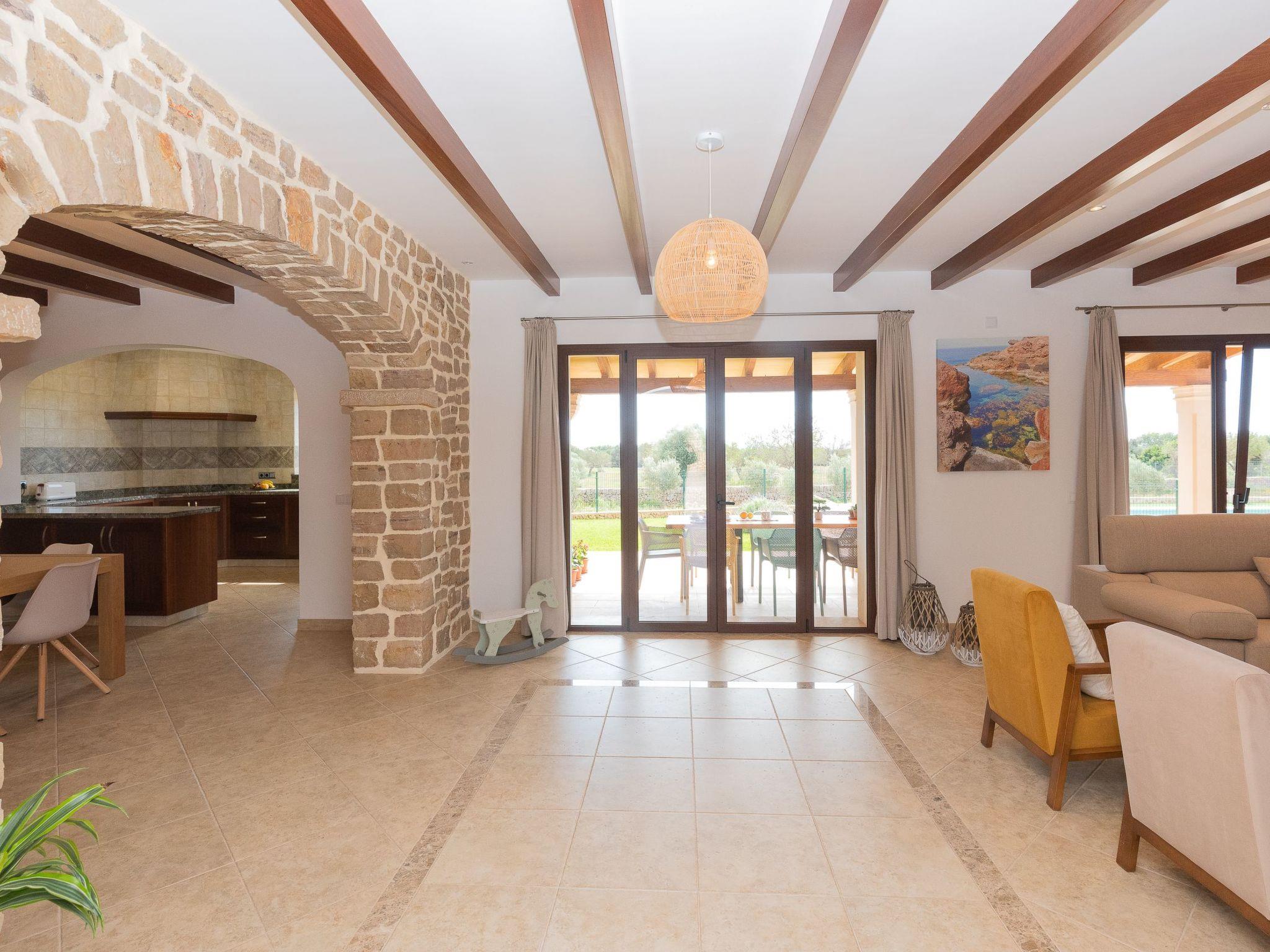 Dreamlike noble finca on two floors. On the ground floor is the living room and the open-plan kitchen with dining area. The furnishings are chic but not overloaded. There is also a bedroom with double bed and en suite shower room on the ground floor. There is also a utility room and a guest toilet. 4 further bedrooms are located on the first floor. There are two bedrooms with double beds and two bedrooms with two single beds each. These rooms share 2 bathrooms, one with separate bath and shower, the other with shower. Large sun terrace with views of the rural surroundings. Very nice outdoor area. Large long veranda with dining table. Lawned garden, with pool safely fenced for small children and artificial grass area. The magnificent pool has Roman steps. There is also an outdoor shower, outdoor barbecue and garden shed with outdoor bathroom. Air conditioning hot / cold with limited and fixed usage times of 10 hours/day.