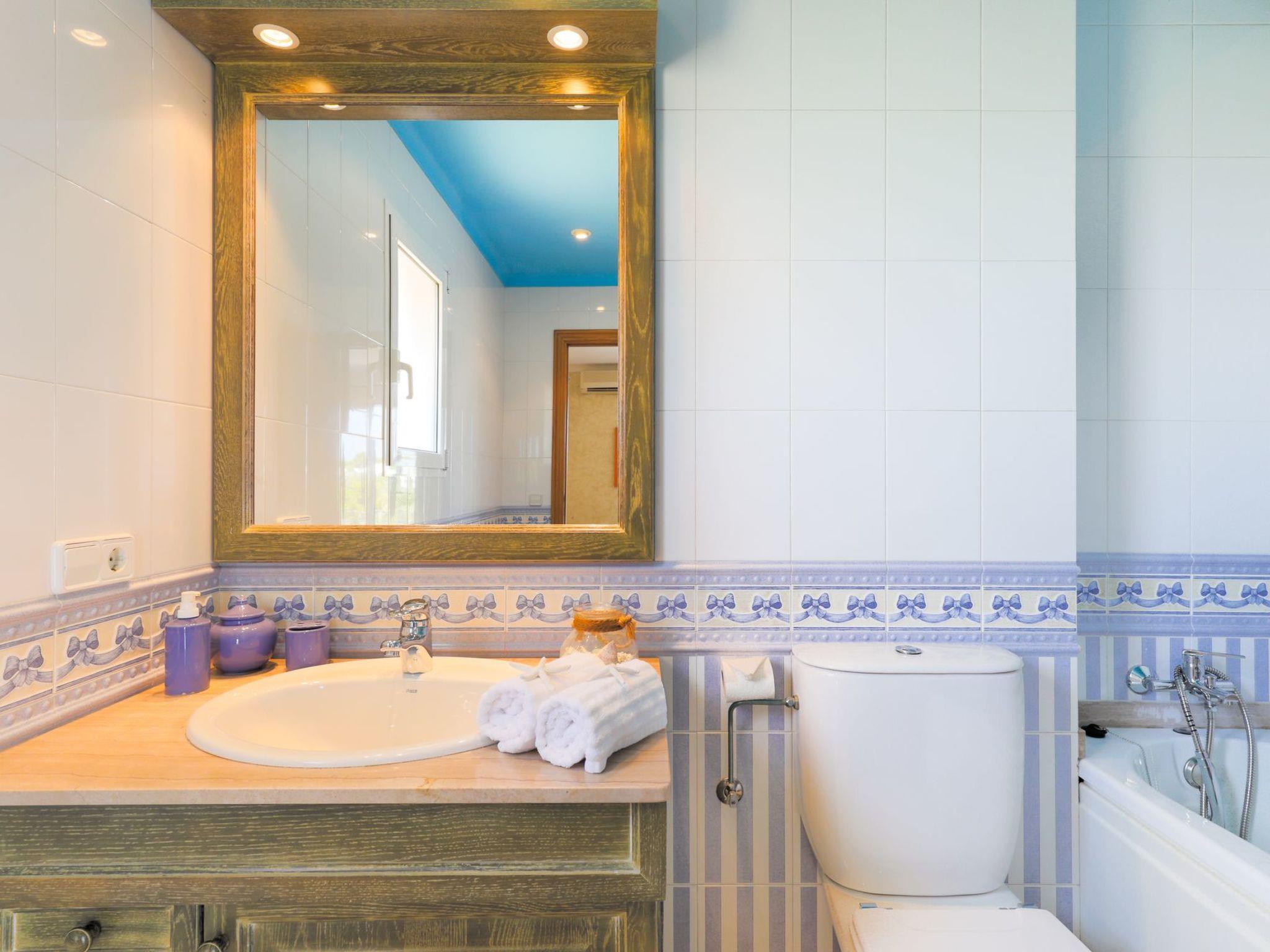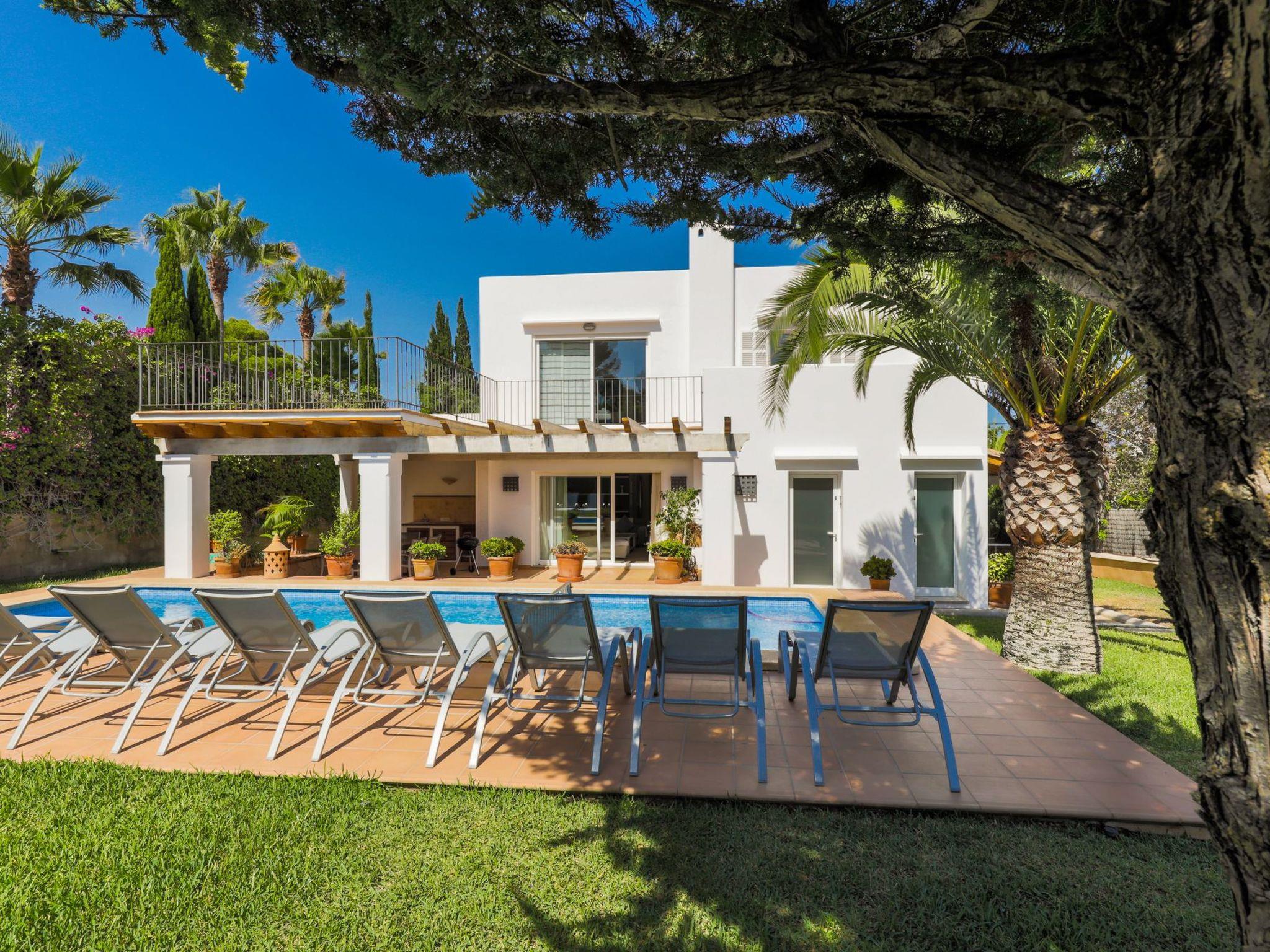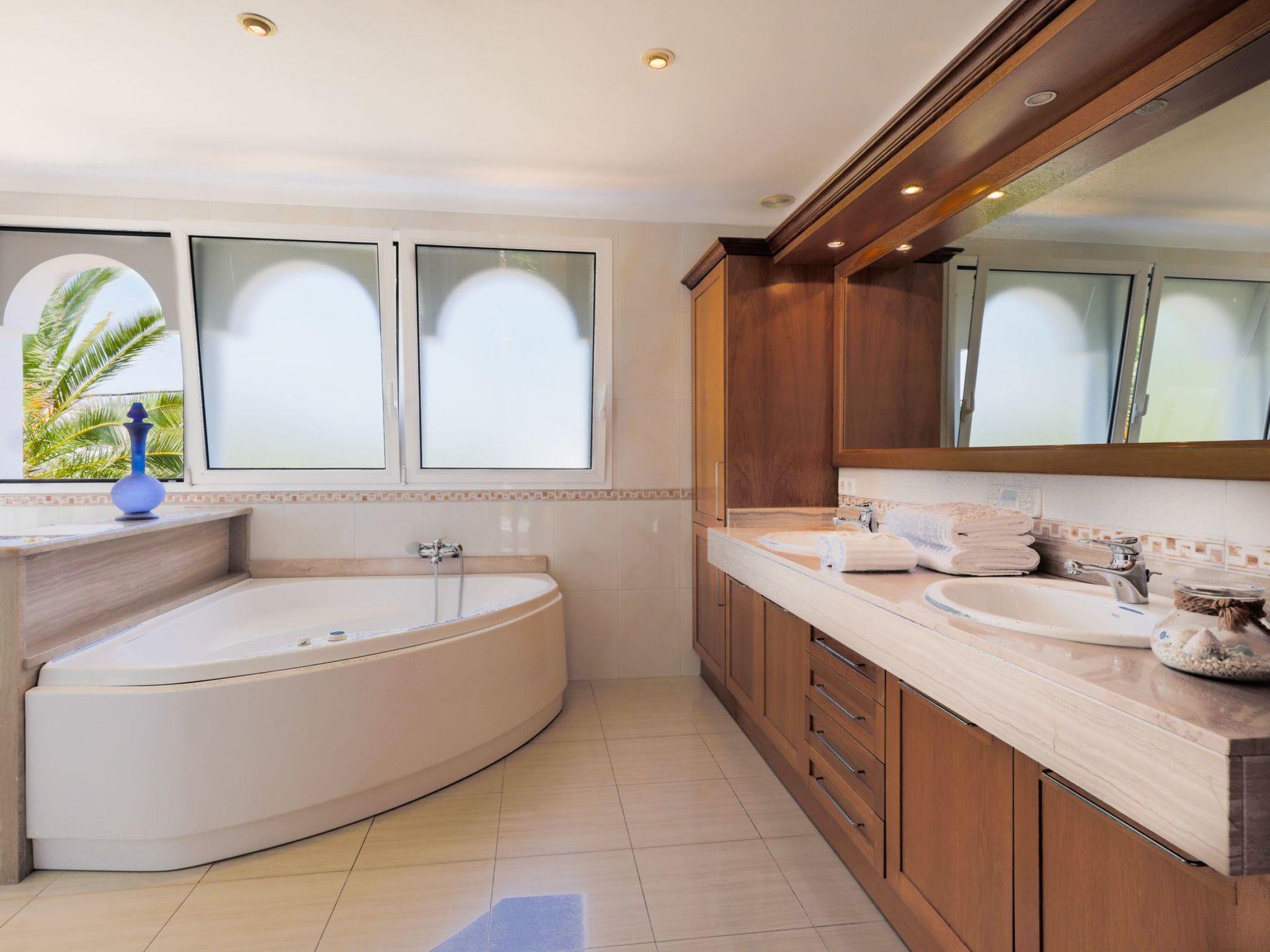 Villa Marques de Comillas 12 is a beautiful, detached villa over 2 floors. Large windows give the rooms plenty of natural light and an airy ambience. The ground floor has high-quality wooden laminate flooring and all rooms have both air conditioning and central heating. The ground floor has a spacious lounge with comfortable seating, TV, DVD and music system. Large sliding glass doors lead out onto the covered terrace, which is furnished with beautiful wooden outdoor furniture. The spacious dining room is very tastefully furnished, with a staircase connecting the ground floor with the upper floor. The modern kitchen with a large cooking island is equipped to a high standard and also offers ample seating. There is also a utility room with washing machine, tumble dryer, iron and ironing board as well as a guest toilet. A bedroom with two single beds as well as a full bathroom (shower and bath) en suite and access to the outside area complete the ground floor. Upstairs is the spacious master bedroom with two single beds joined together as a double bed, a dressing room and a fantastic en suite bathroom with a large Jacuzzi bath and a separate shower. The room has access to an outside terrace overlooking the garden and pool area. Furthermore, this floor offers another double bedroom with 2 single beds and one with a double bed. Both bedrooms have en suite bathrooms with a Jacuzzi bath and a small terrace.