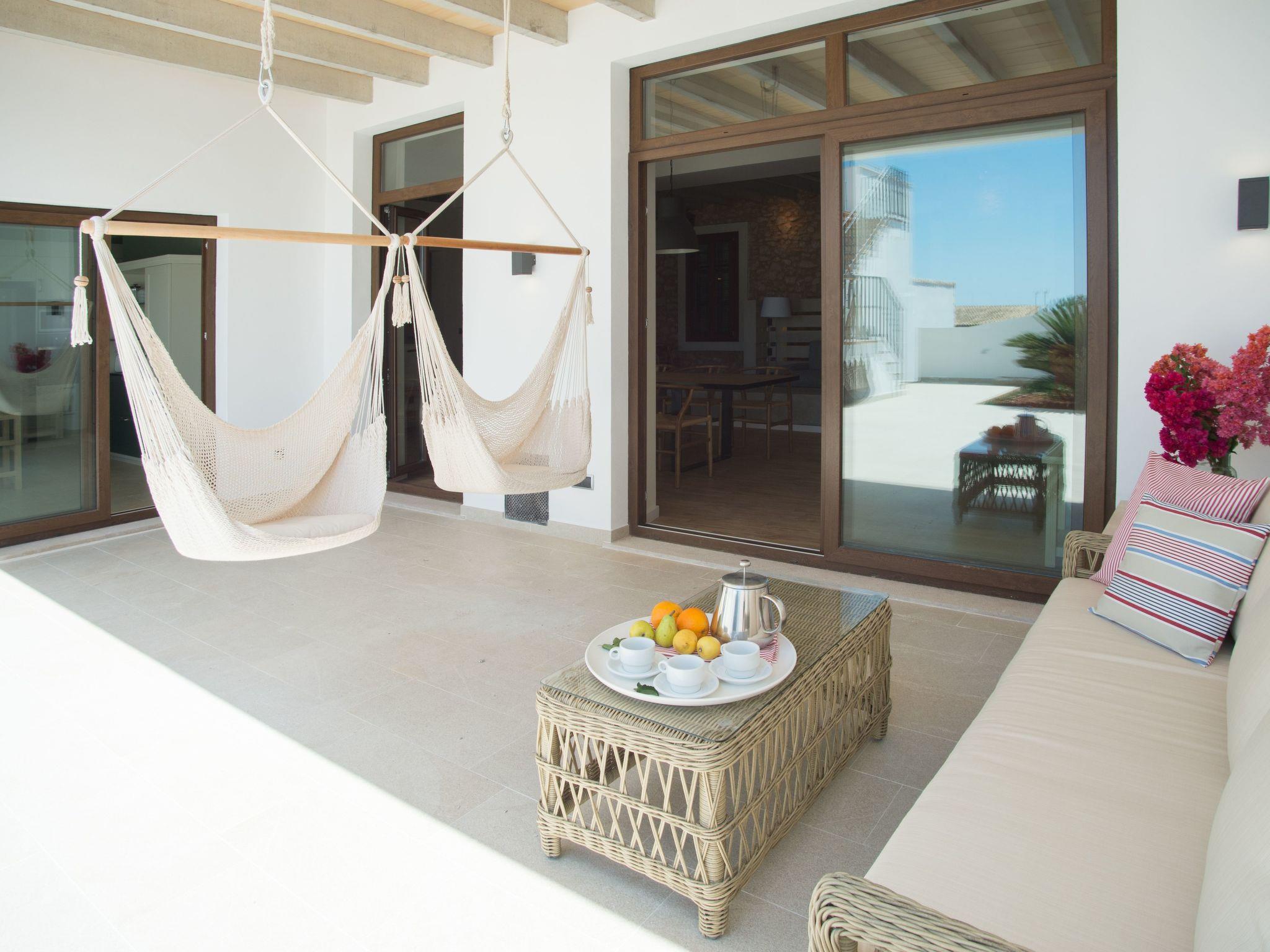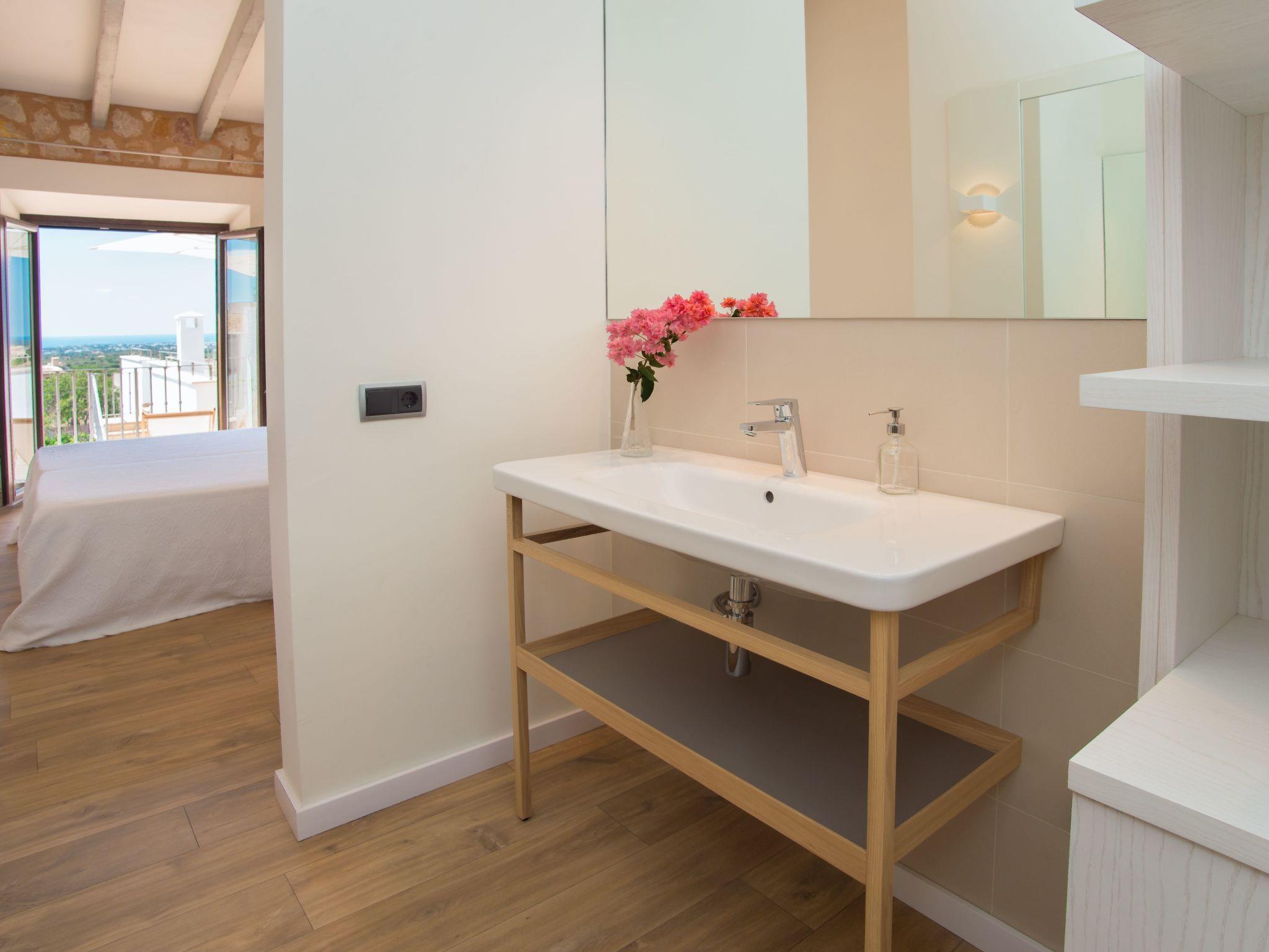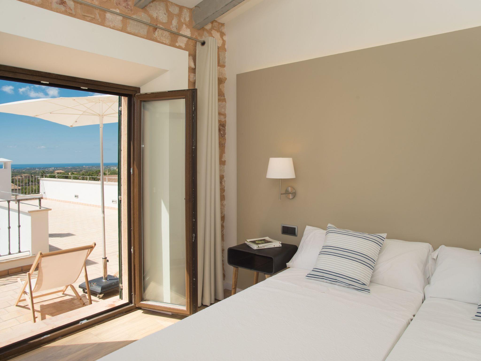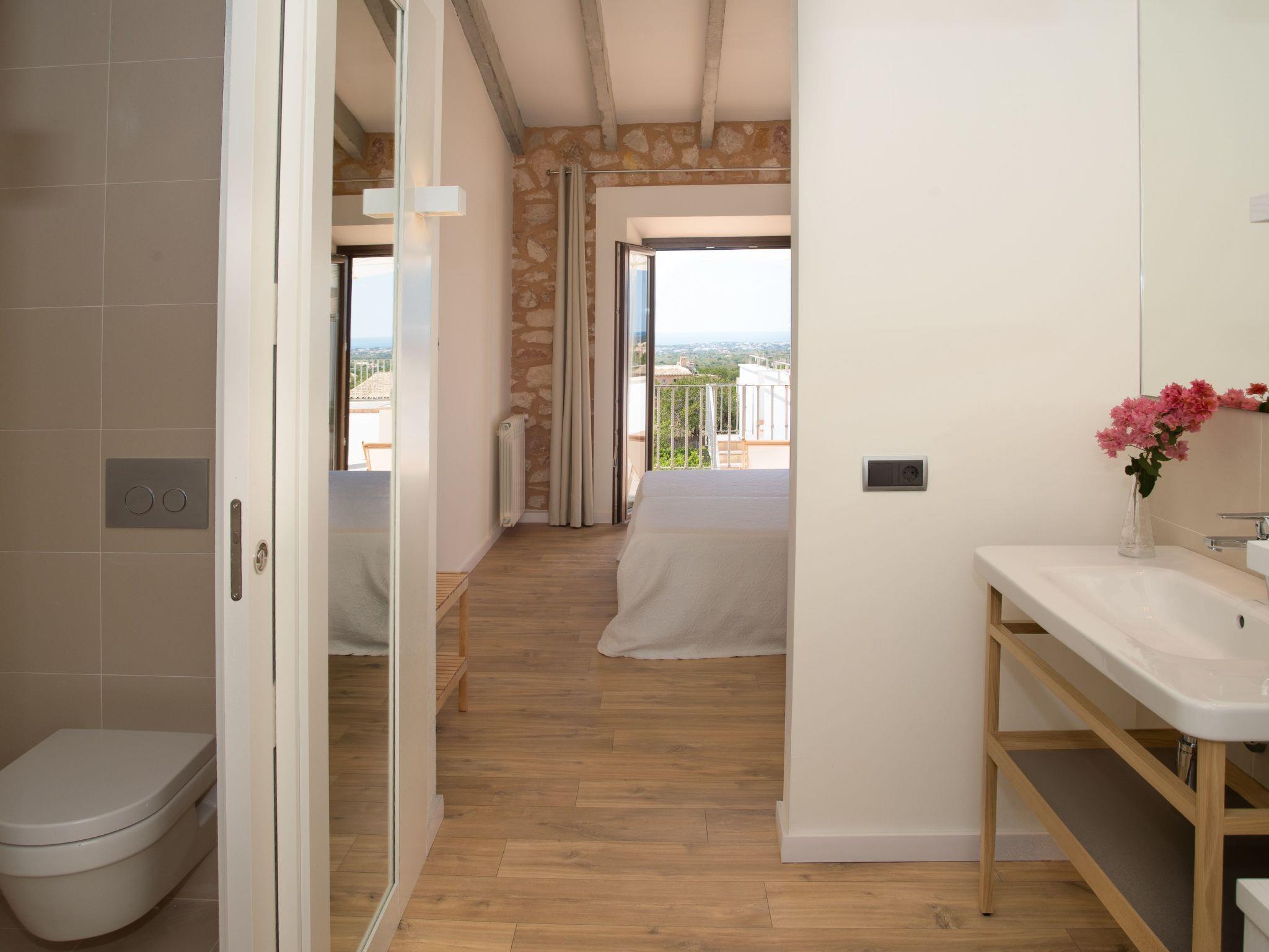 Ferrer de S'Horta is a spacious house, newly renovated and equipped to a high standard. Modern furniture and decoration are tastefully combined with high ceilings with exposed concrete beams and some walls clad with dry stone, giving the house a rustic ambience. The entrance is via the pool area. Sliding glass doors lead into the open, well-equipped, bright kitchen with cooking island. From here we reach the spacious, bright and open-plan living/dining area. Two areas have cosy sofas and a long wooden table invites you to enjoy meals together. Sliding glass doors lead out onto the terrace. Two bedrooms with access to the pool, each with 2 single beds and en suite shower rooms are located on the ground floor, which is completed by a guest toilet and service room. A staircase leads from the living/dining area to the first floor. Here there are three further bedrooms, each with two single beds and en suite shower room and access to a terrace with sun loungers and parasols, the perfect place to relax and enjoy the views of the countryside and the sea in the distance. Heating and air conditioning in the bedrooms with fixed hours of use from 21.00 h - 09.00 h.