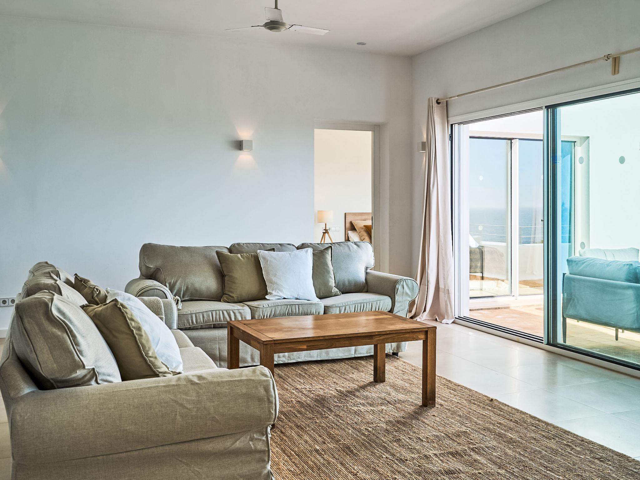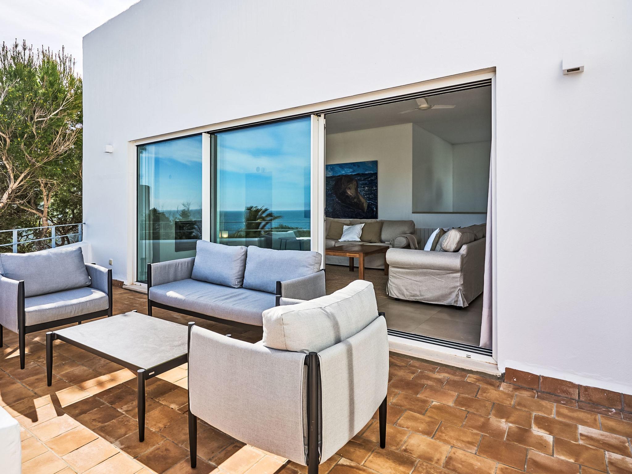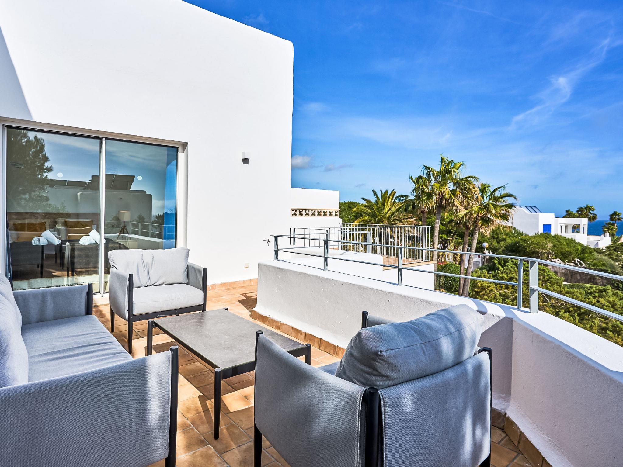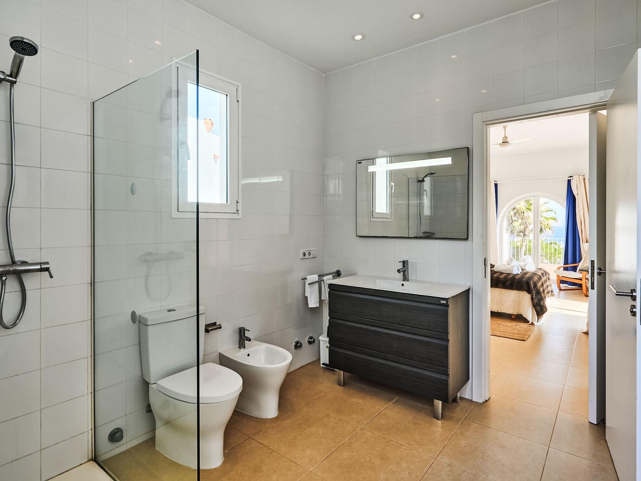 Villa Gran Mar is built in the old Ibizan style. A short path leads to the house through a small garden with a lawn. The entrance area leads into the spacious, bright and cosily furnished living/dining room. Patio doors open out to the pool area and a further private terrace, a perfect place for al fresco dining. You have a well-equipped modern kitchen. From the living room you enter a beautiful double bedroom with an en-suite shower room and access to the terrace and pool area. A further bedroom is located on the opposite side of the living room. Steps lead from the dining area to the first floor. There is a seating area here. Large French windows allow you to enjoy the fantastic sea view and access to the terrace, which is also equipped with a seating area. From this living room there is access to the 3rd bedroom with en-suite shower room, which also has access to the terrace.