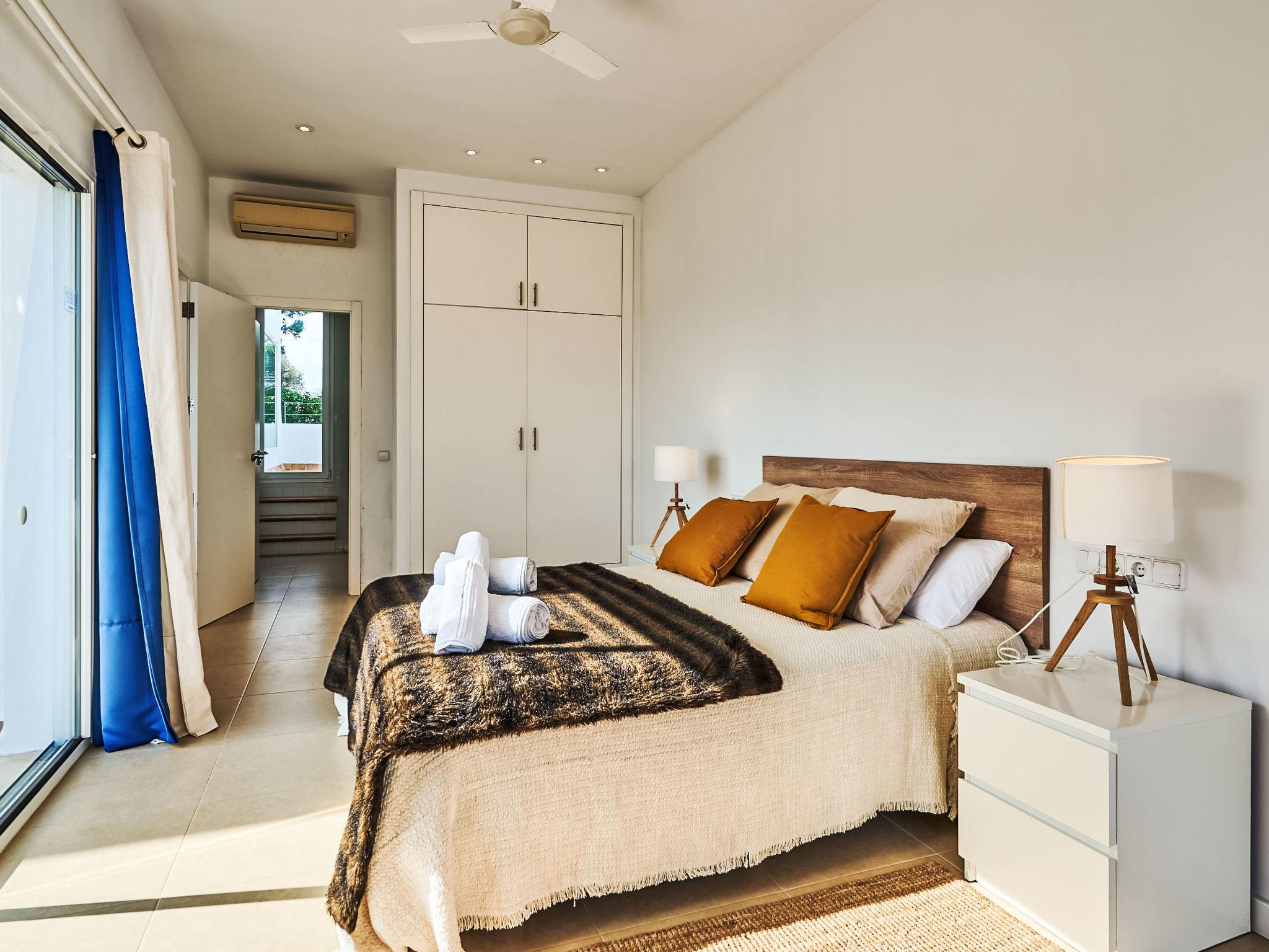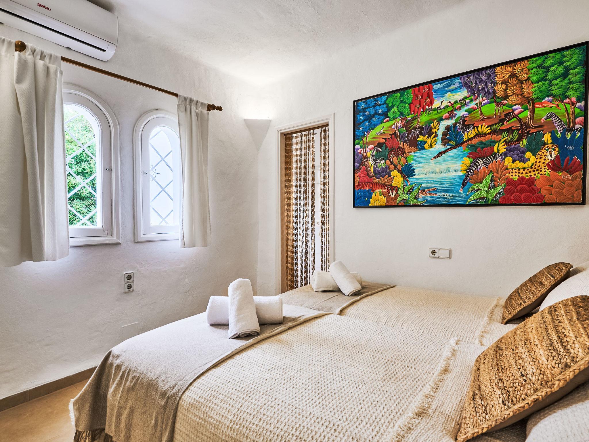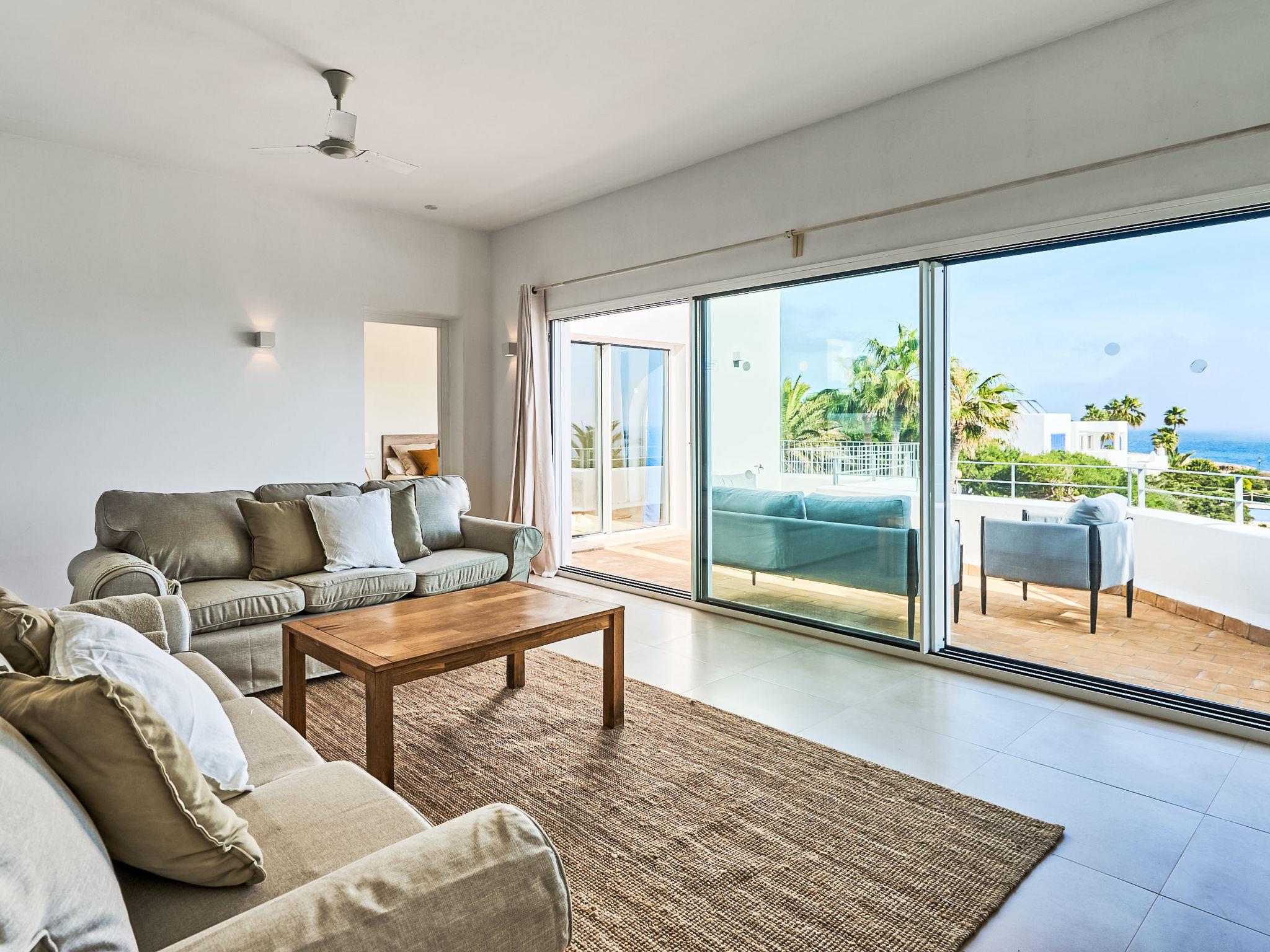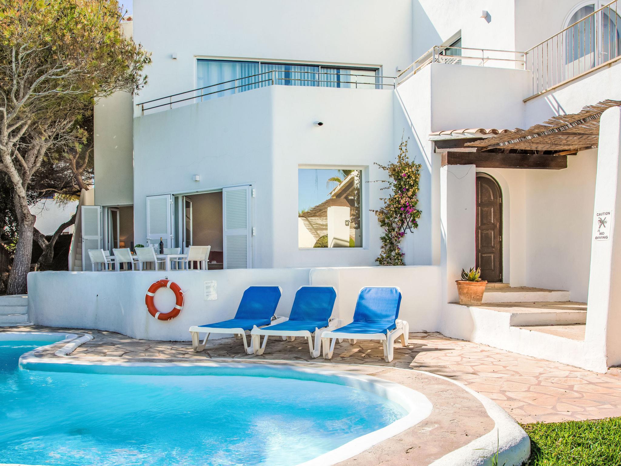 Villa Gran Mar is built in the old Ibizan style. A short path leads to the house through a small garden with a lawn. The entrance area leads into the spacious, bright and cosily furnished living/dining room. Patio doors open out to the pool area and a further private terrace, a perfect place for al fresco dining. You have a well-equipped modern kitchen. From the living room you enter a beautiful double bedroom with an en-suite shower room and access to the terrace and pool area. A further bedroom is located on the opposite side of the living room. Steps lead from the dining area to the first floor. There is a seating area here. Large French windows allow you to enjoy the fantastic sea view and access to the terrace, which is also equipped with a seating area. From this living room there is access to the 3rd bedroom with en-suite shower room, which also has access to the terrace.