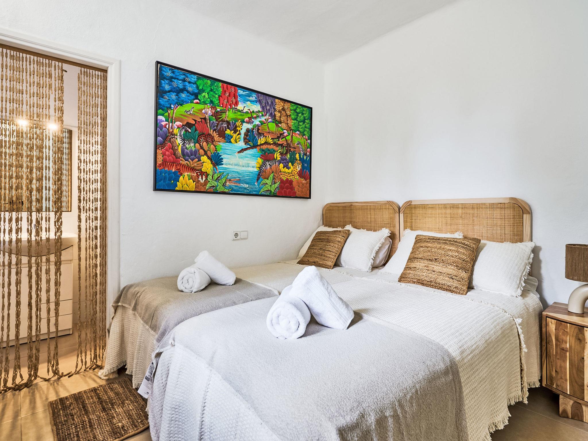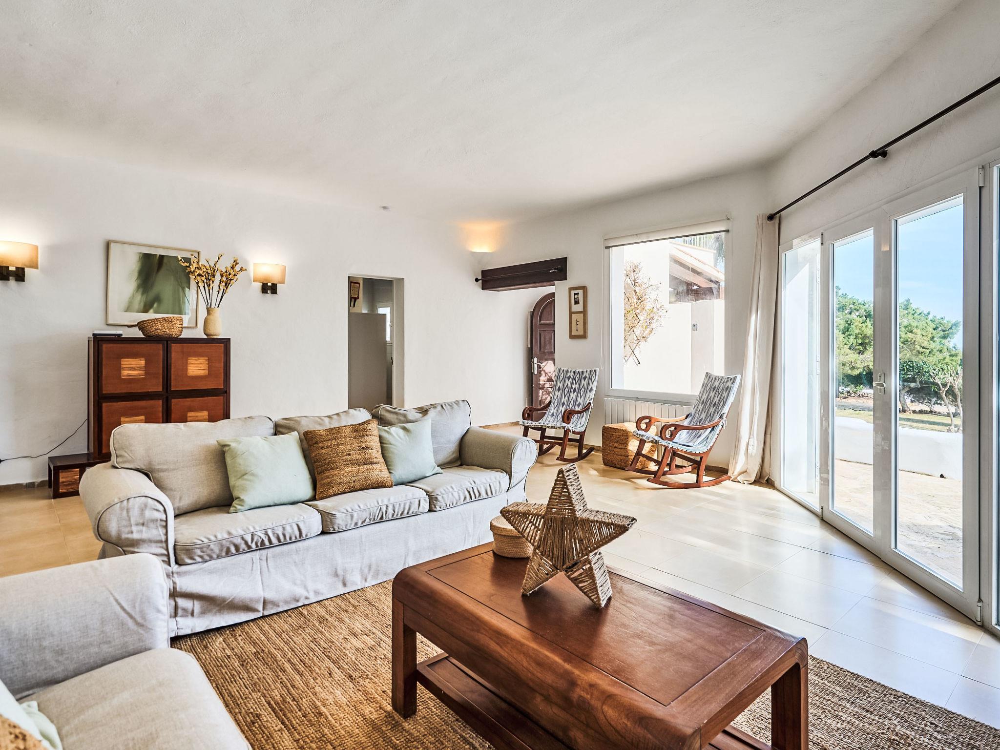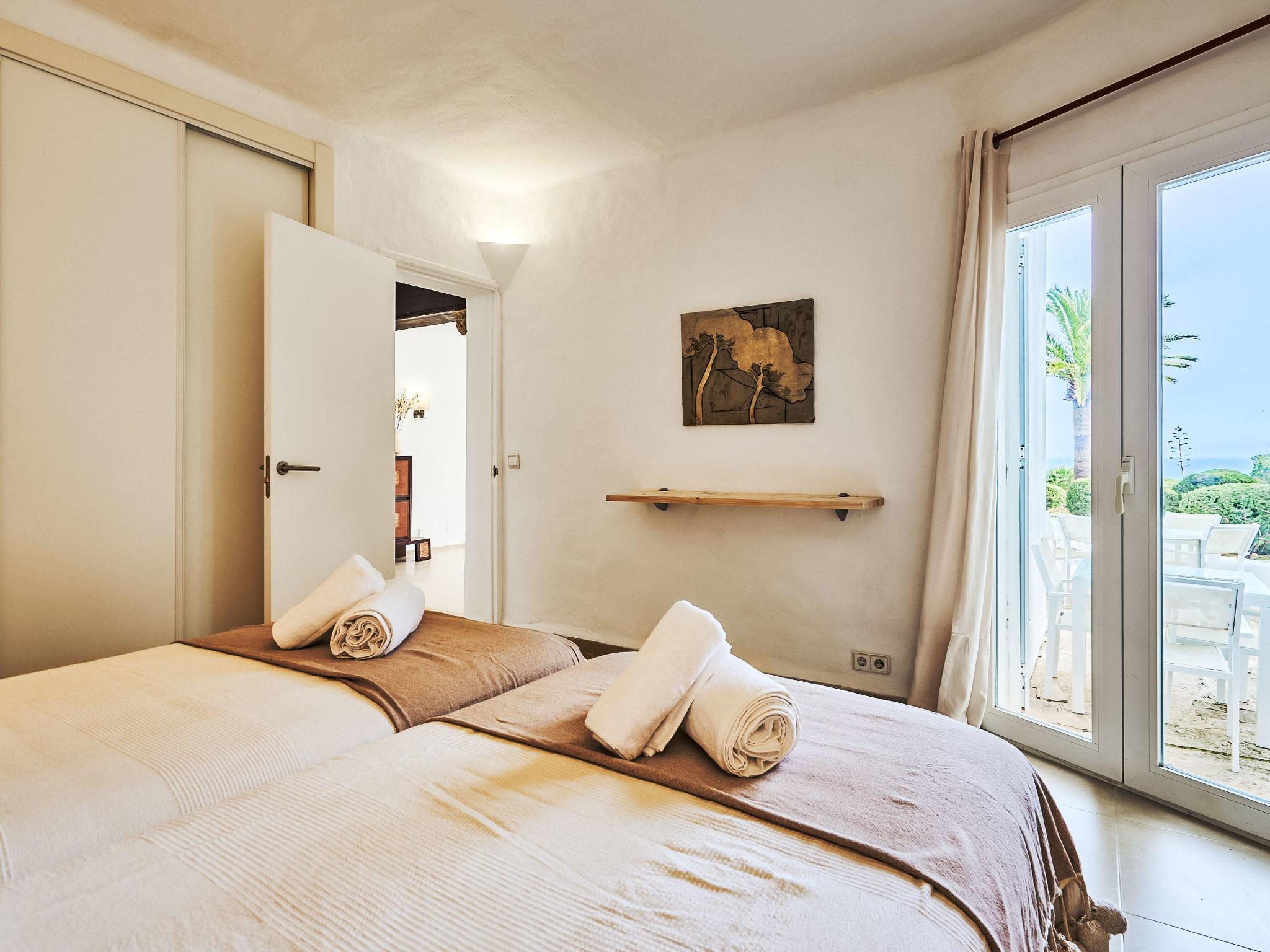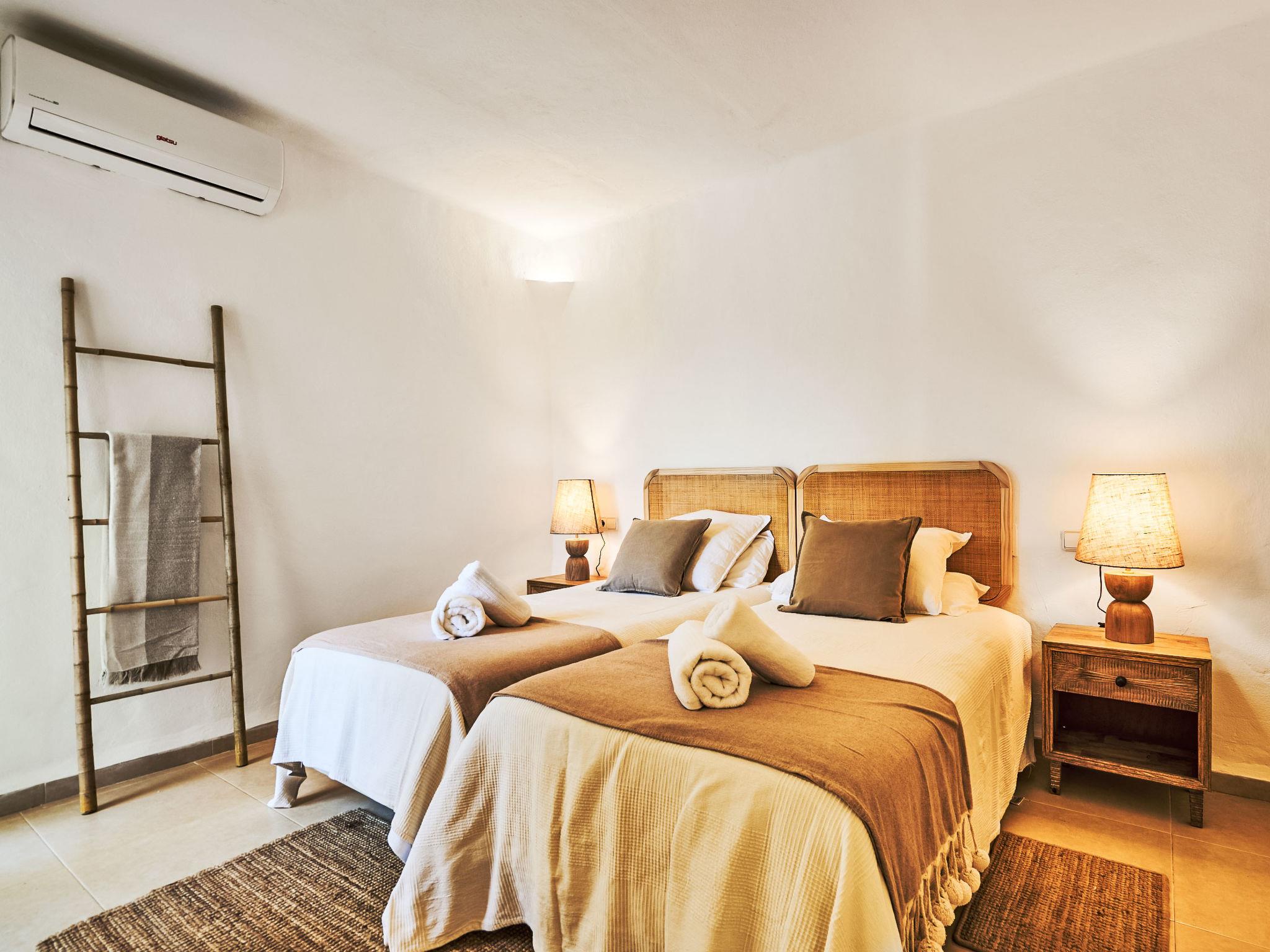 Villa Gran Mar is built in the old Ibizan style. A short path leads to the house through a small garden with a lawn. The entrance area leads into the spacious, bright and cosily furnished living/dining room. Patio doors open out to the pool area and a further private terrace, a perfect place for al fresco dining. You have a well-equipped modern kitchen. From the living room you enter a beautiful double bedroom with an en-suite shower room and access to the terrace and pool area. A further bedroom is located on the opposite side of the living room. Steps lead from the dining area to the first floor. There is a seating area here. Large French windows allow you to enjoy the fantastic sea view and access to the terrace, which is also equipped with a seating area. From this living room there is access to the 3rd bedroom with en-suite shower room, which also has access to the terrace.
