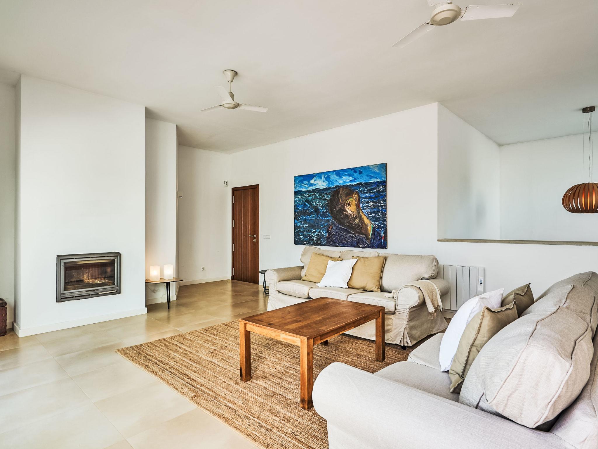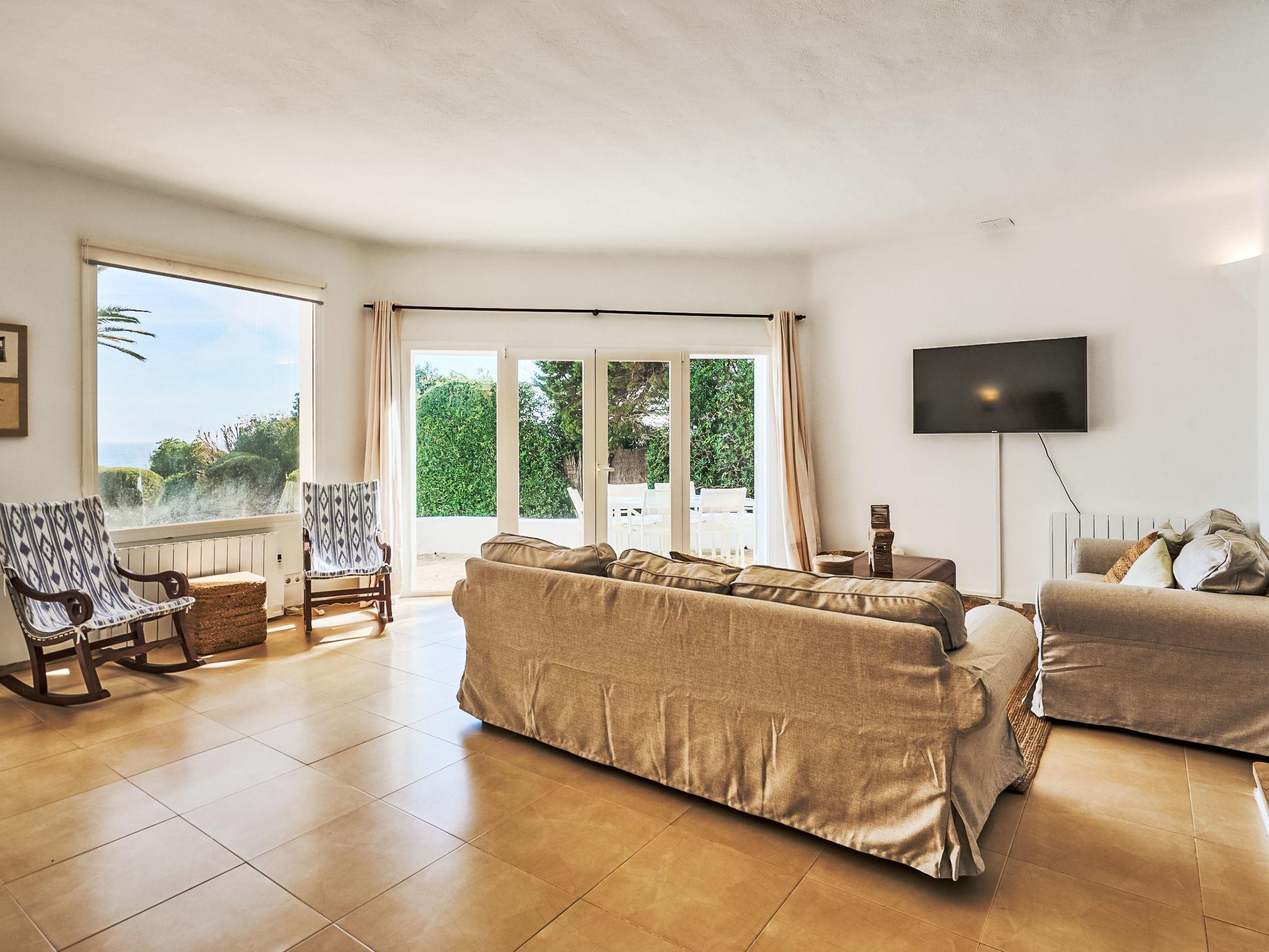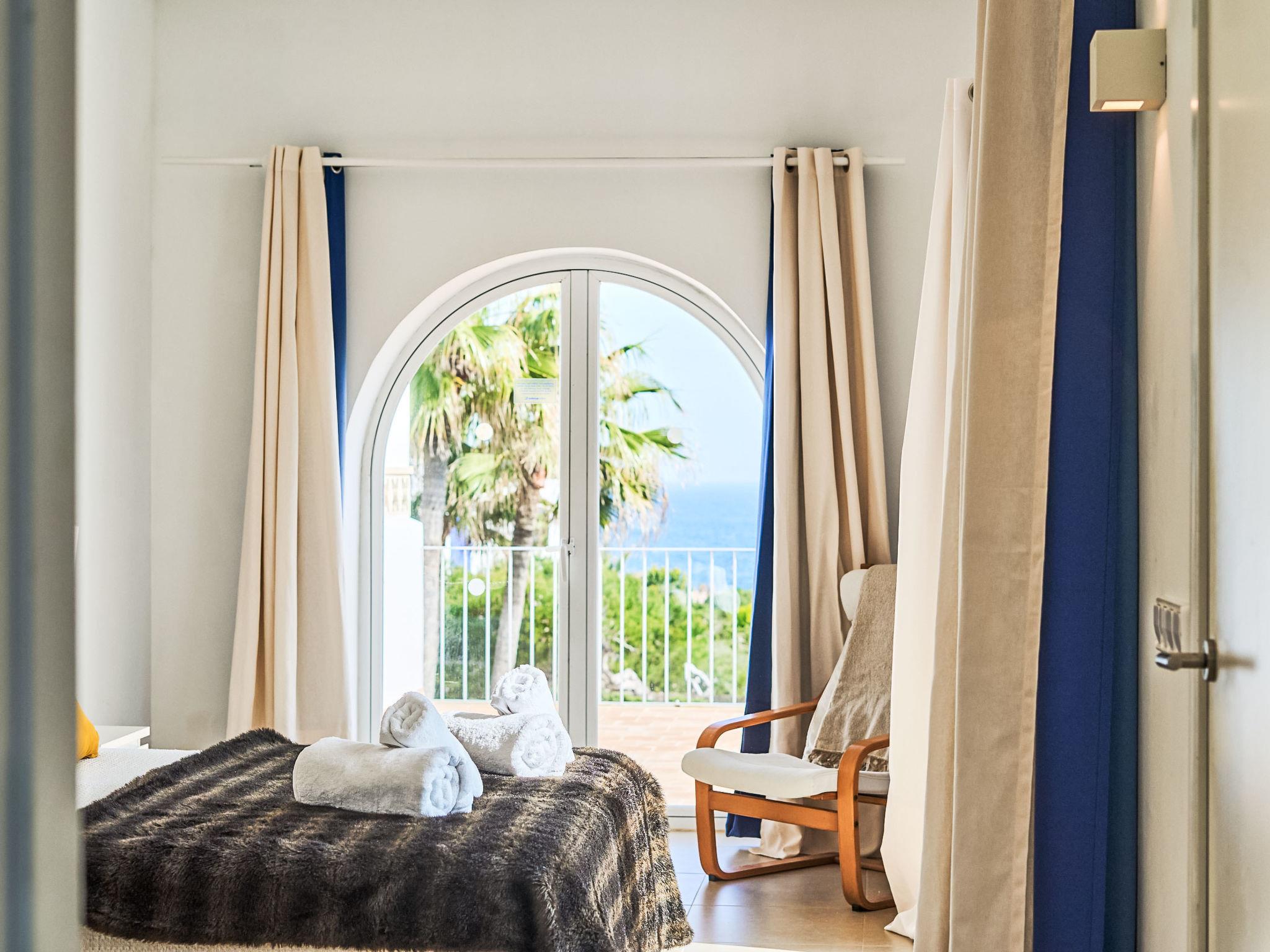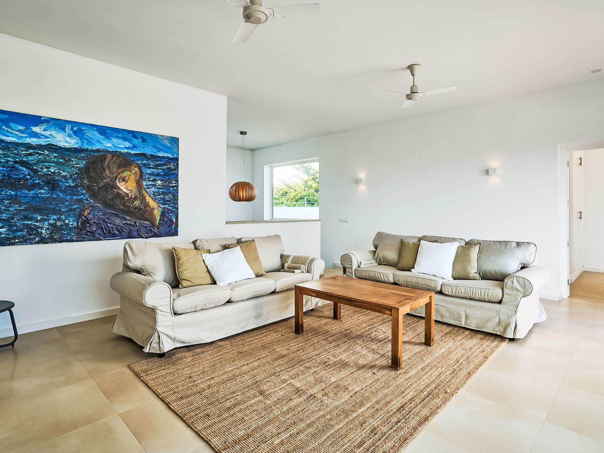 Villa Gran Mar is built in the old Ibizan style. A short path leads to the house through a small garden with a lawn. The entrance area leads into the spacious, bright and cosily furnished living/dining room. Patio doors open out to the pool area and a further private terrace, a perfect place for al fresco dining. You have a well-equipped modern kitchen. From the living room you enter a beautiful double bedroom with an en-suite shower room and access to the terrace and pool area. A further bedroom is located on the opposite side of the living room. Steps lead from the dining area to the first floor. There is a seating area here. Large French windows allow you to enjoy the fantastic sea view and access to the terrace, which is also equipped with a seating area. From this living room there is access to the 3rd bedroom with en-suite shower room, which also has access to the terrace.