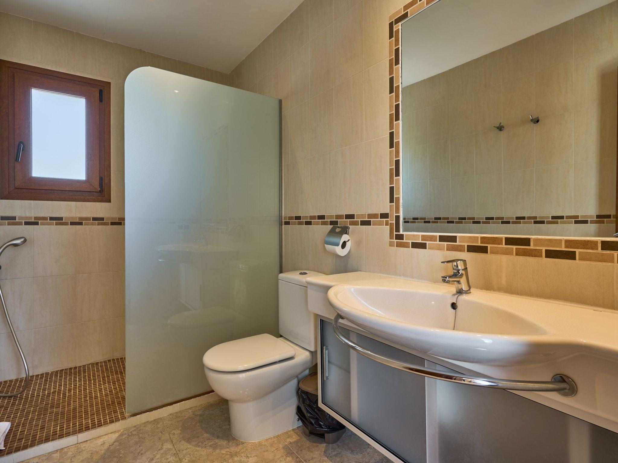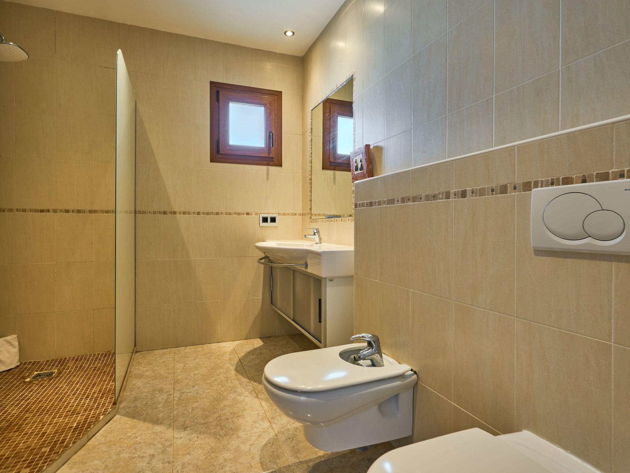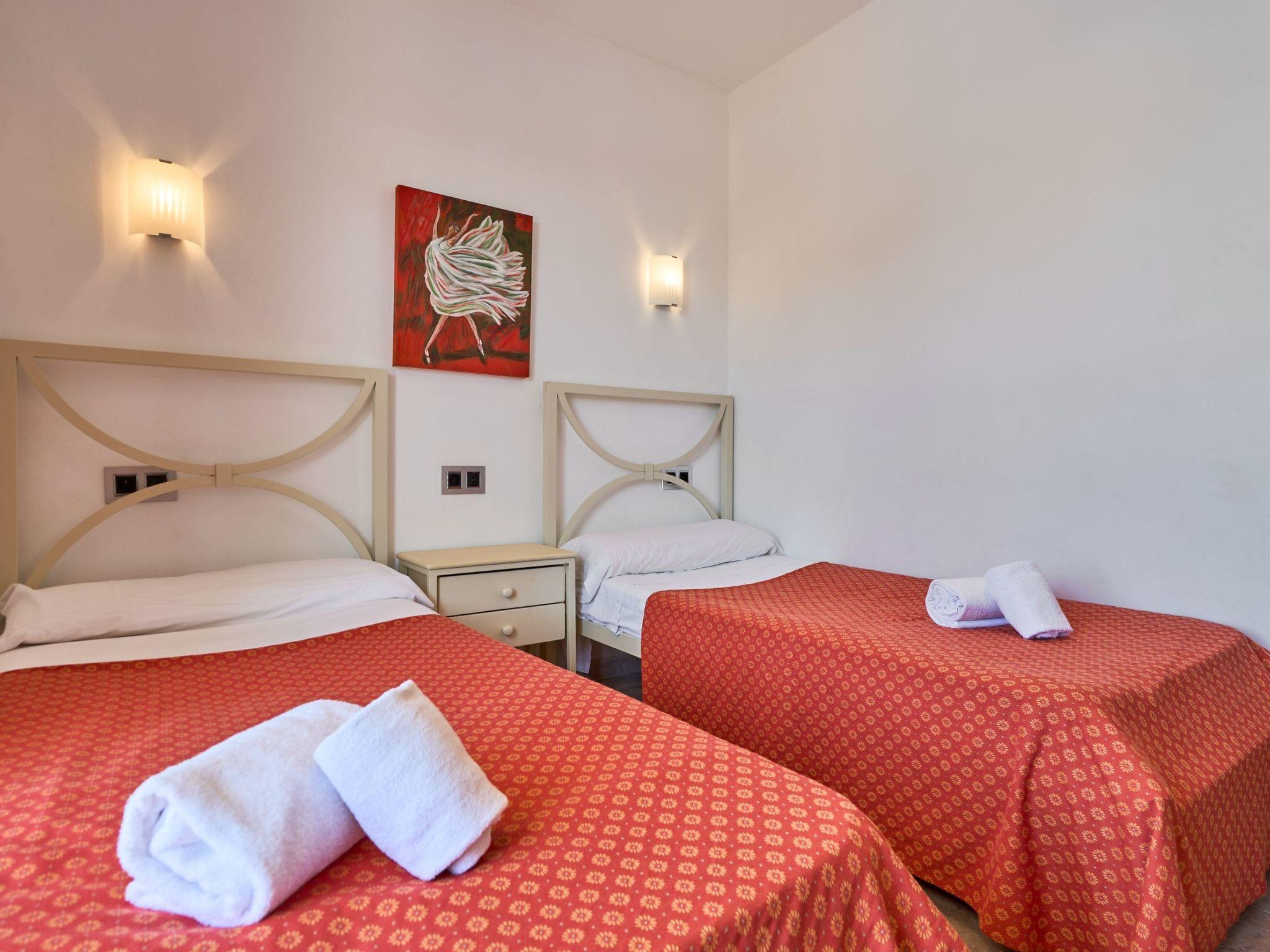 Semi-detached house on three floors. A few steps lead to the entrance of the villa on the ground floor (middle floor). On this level there is an open-plan dining room with access to the terrace. Kitchen and laundry room are accessible from the dining room. Guest toilet. A staircase leads to the first floor where there is a bedroom with two single beds and an ensuite bathroom with shower. This bedroom has access to two terraces. On the lower floor there is a double bedroom with en-suite bathroom with shower and two twin bedrooms sharing a separate bathroom with bathtub. These bedrooms have access to the pool terrace.