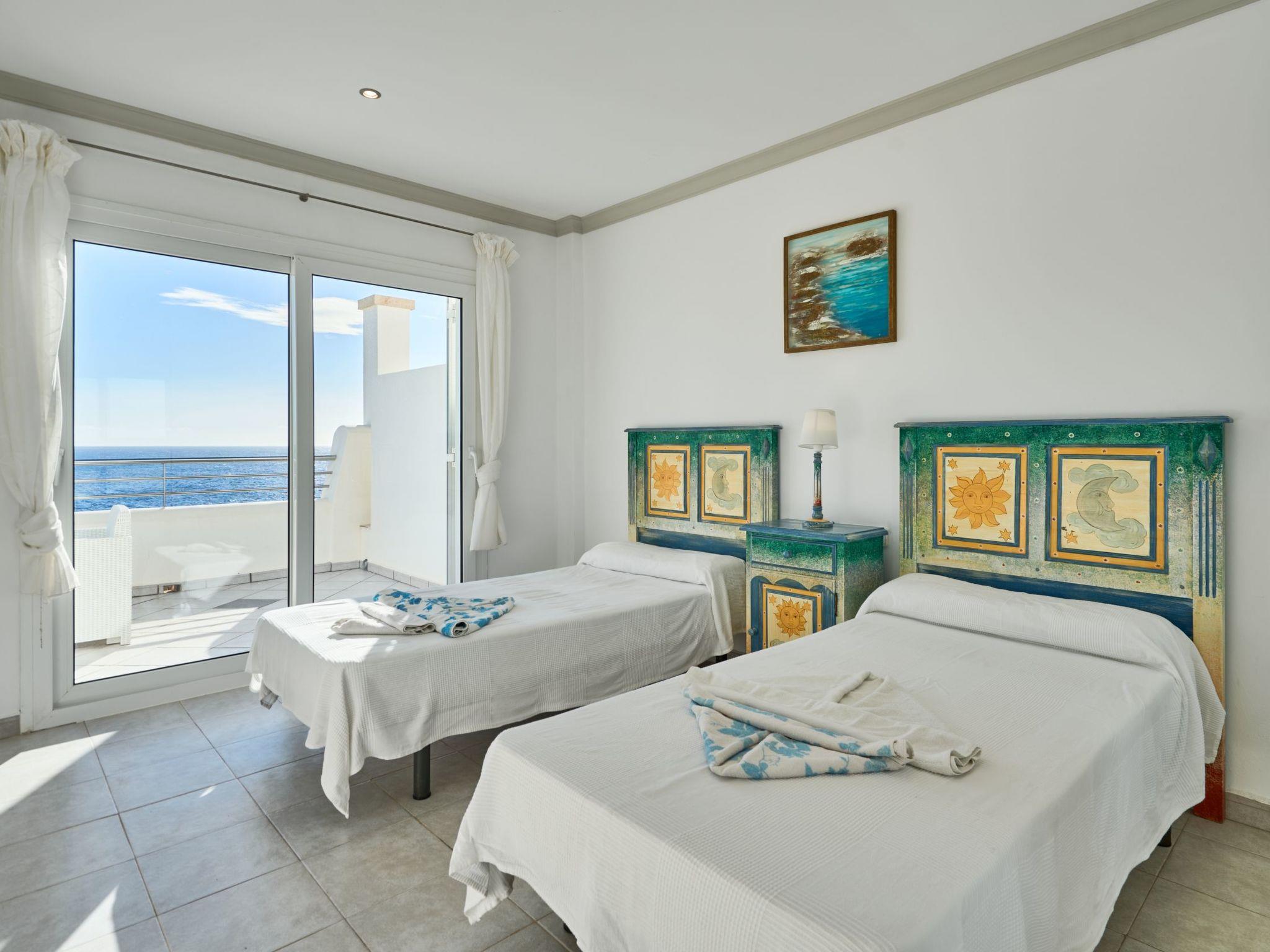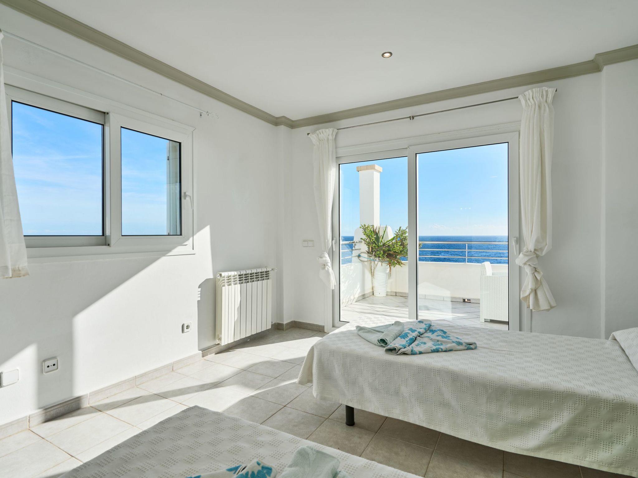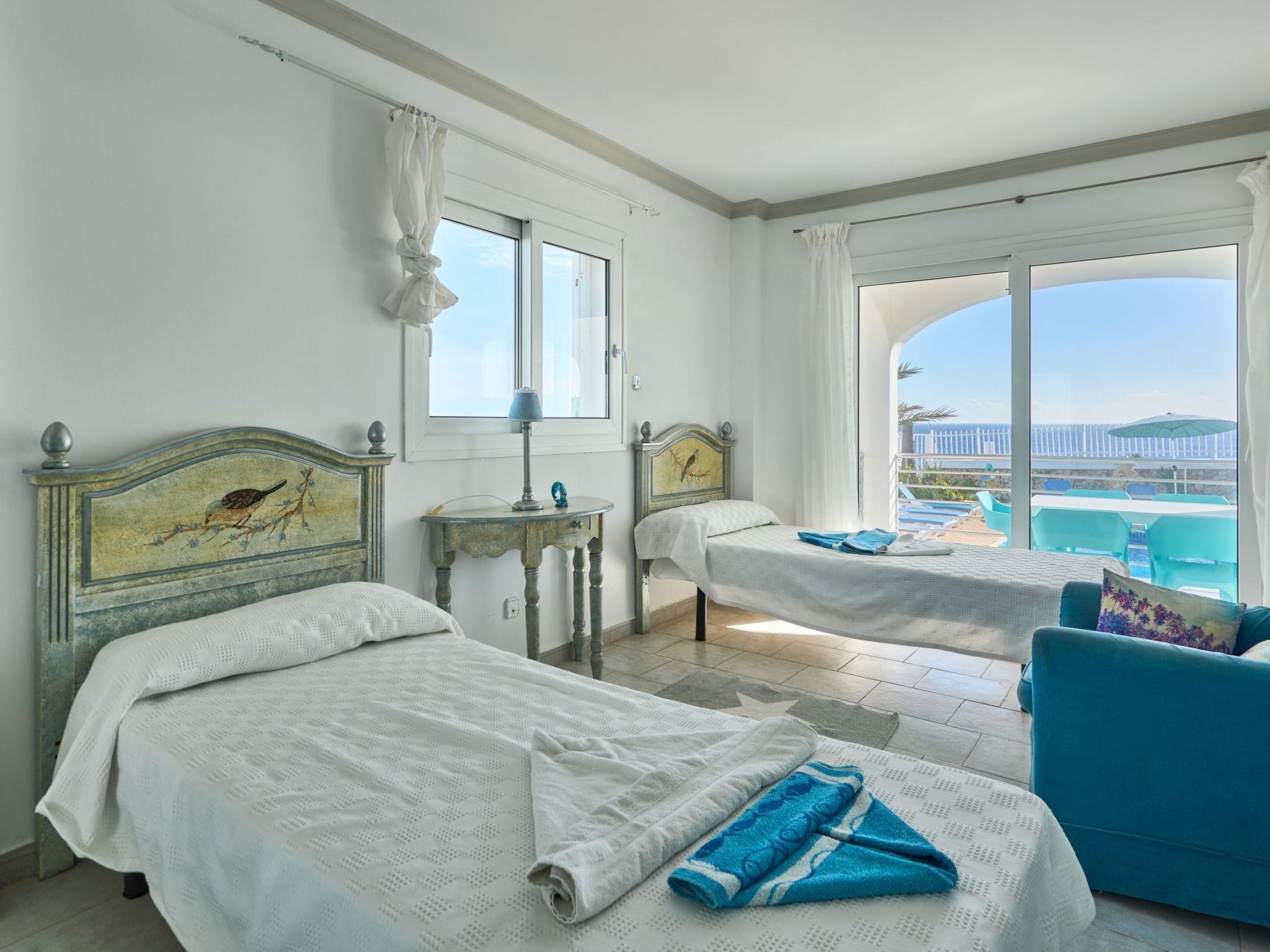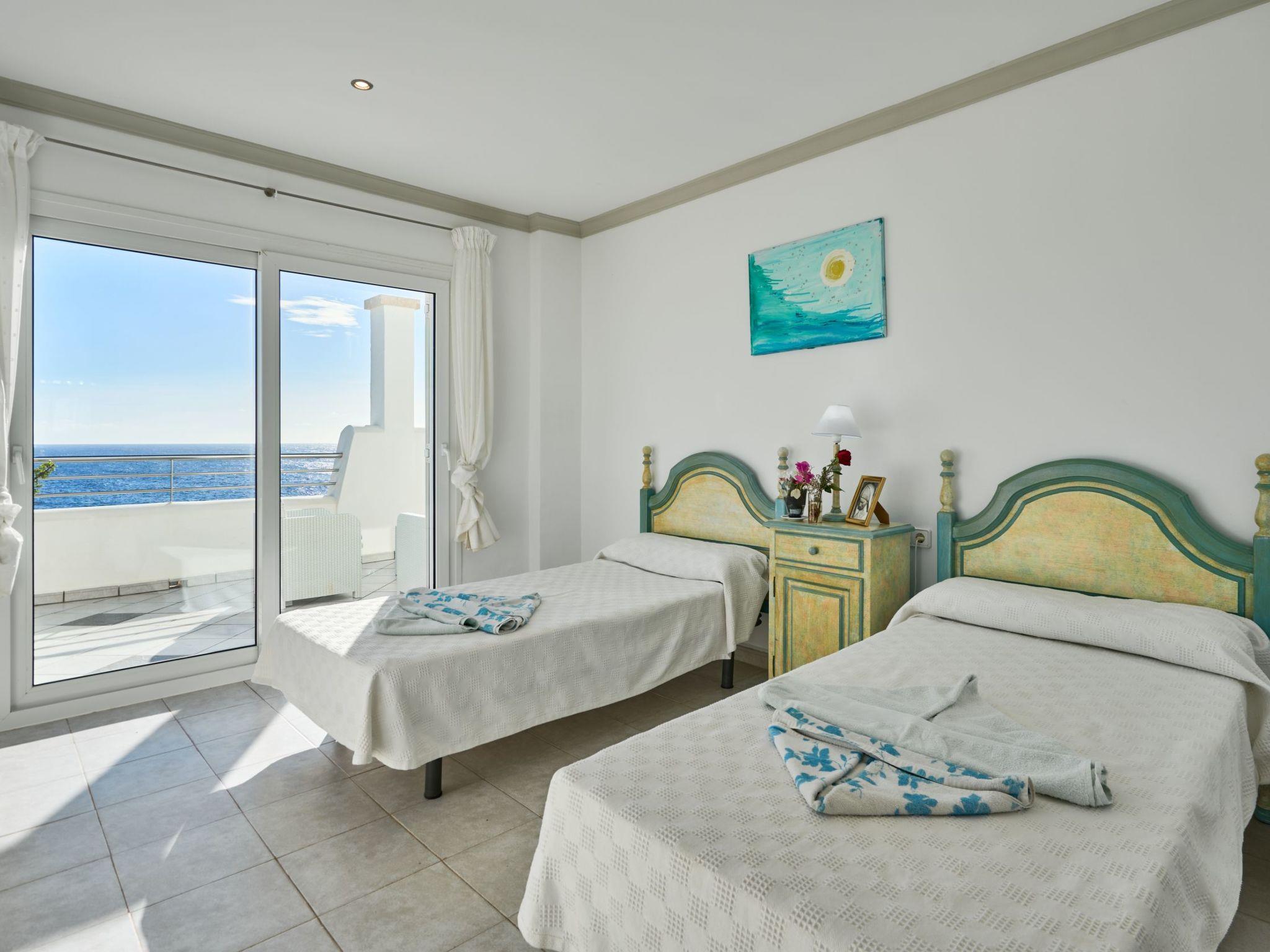 Estella Matutina is a beautiful semi-detached house on 3 floors. On the ground floor are the kitchen and the living/dining room with access to the pool area. There is also a bedroom with two single beds, access to the covered terrace and a bathroom. There are a further 3 bedrooms on the first floor. Two of them share a bathroom. One bedroom has an en suite bathroom. Two of the bedrooms have access to a beautiful terrace with breathtaking sea views. On the second floor is the 5th bedroom with two single beds, en-suite shower room and private terrace with equally spectacular sea views.