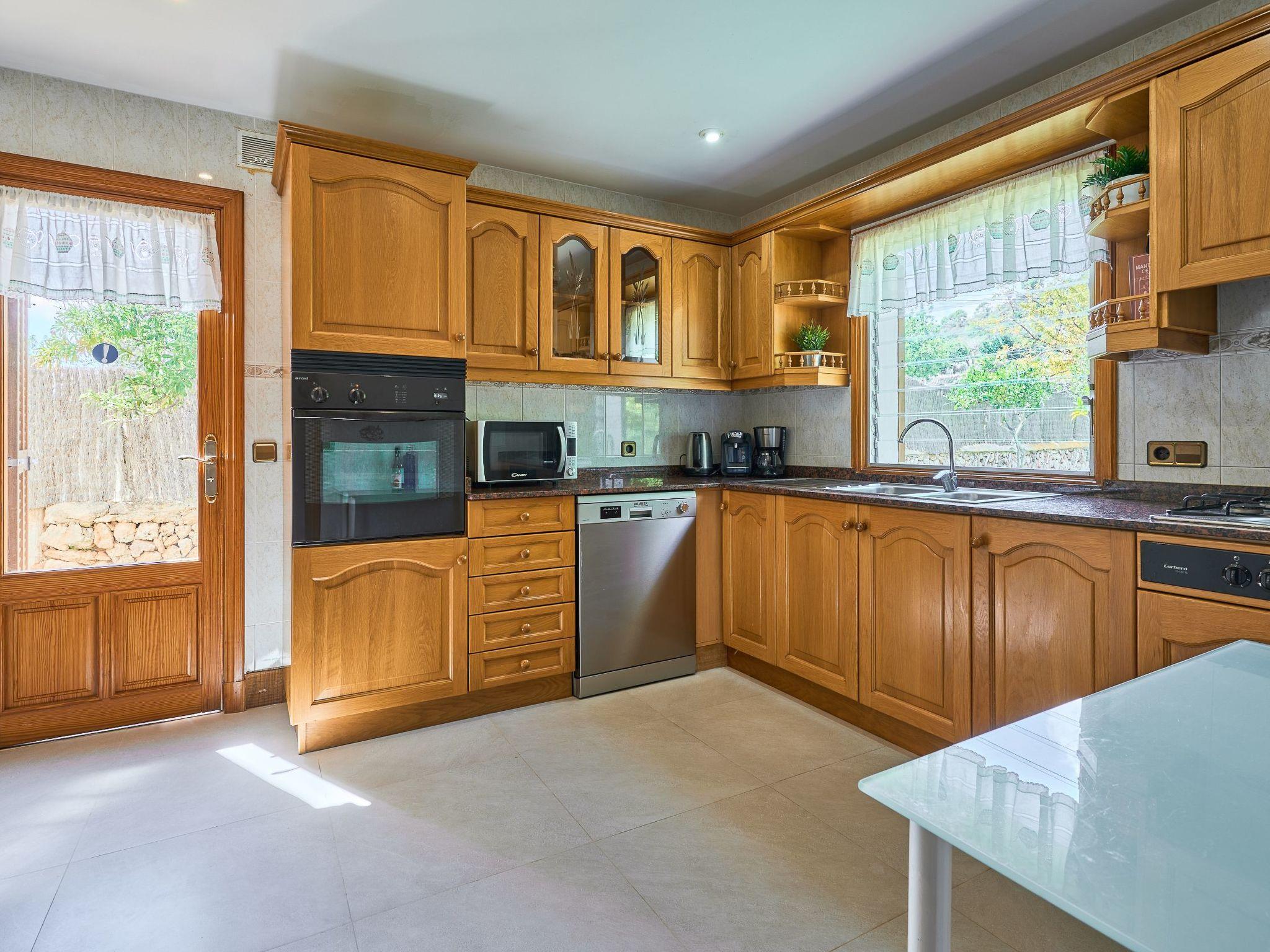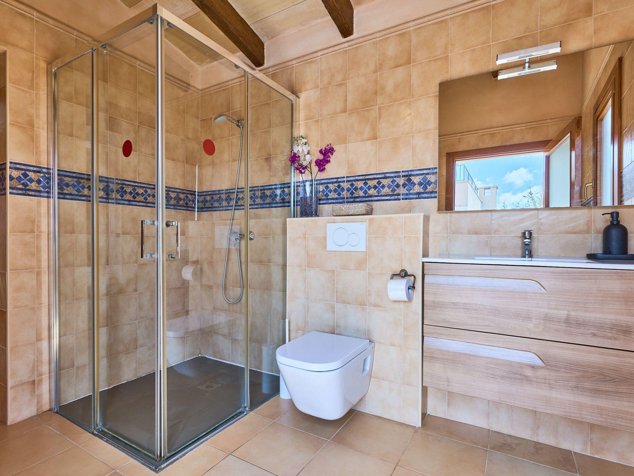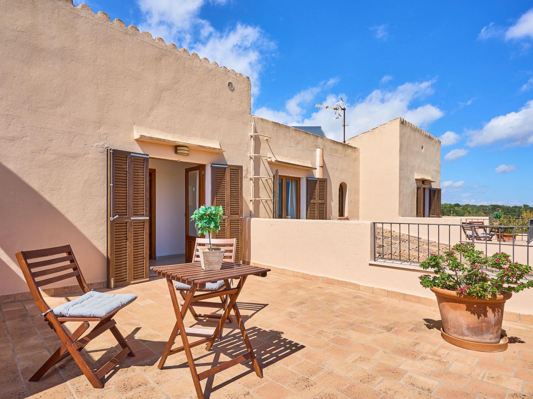 Die Garrovers de S'Horta, a two-storey, spacious house in the countryside. On the ground floor is the open-plan living and dining area with a charming corner fireplace. From the living area there is access to a terrace with marvellous views over the fields to the sea on the horizon. The kitchen is spacious, with a breakfast table and access to the outside area. On the ground floor there are two double bedrooms, one with an en-suite shower room, the other has a separate bathroom with a corner Jacuzzi bath. One of the bedrooms leads to a utility room with washing machine. On the upper floor there is a further double bedroom and a shower room. Each has its own terrace overlooking the pool.