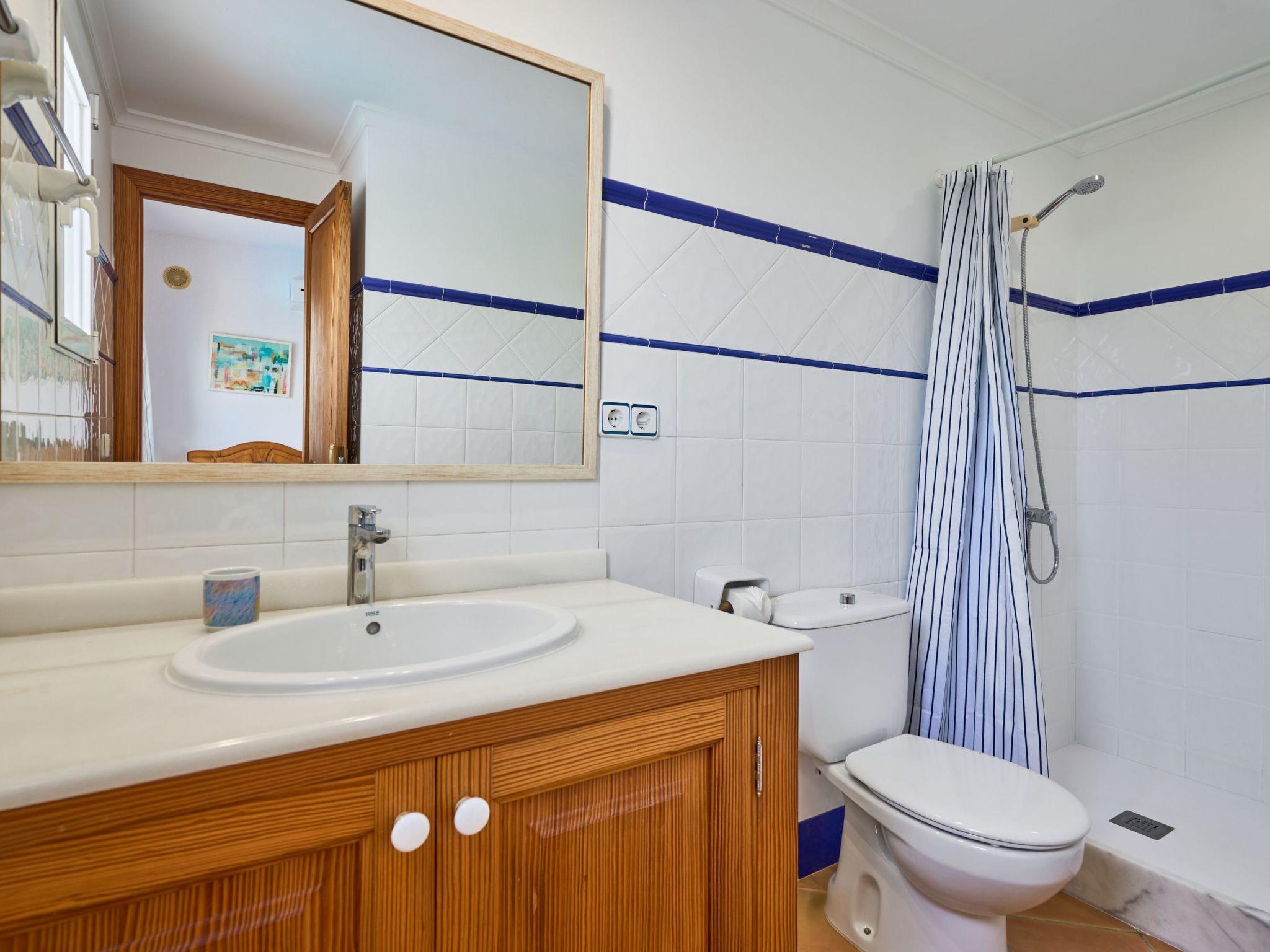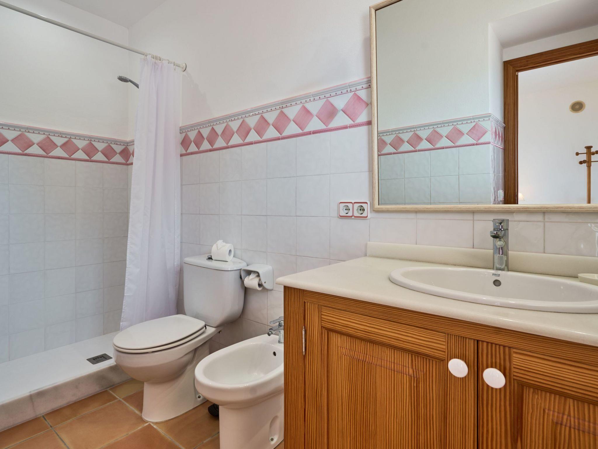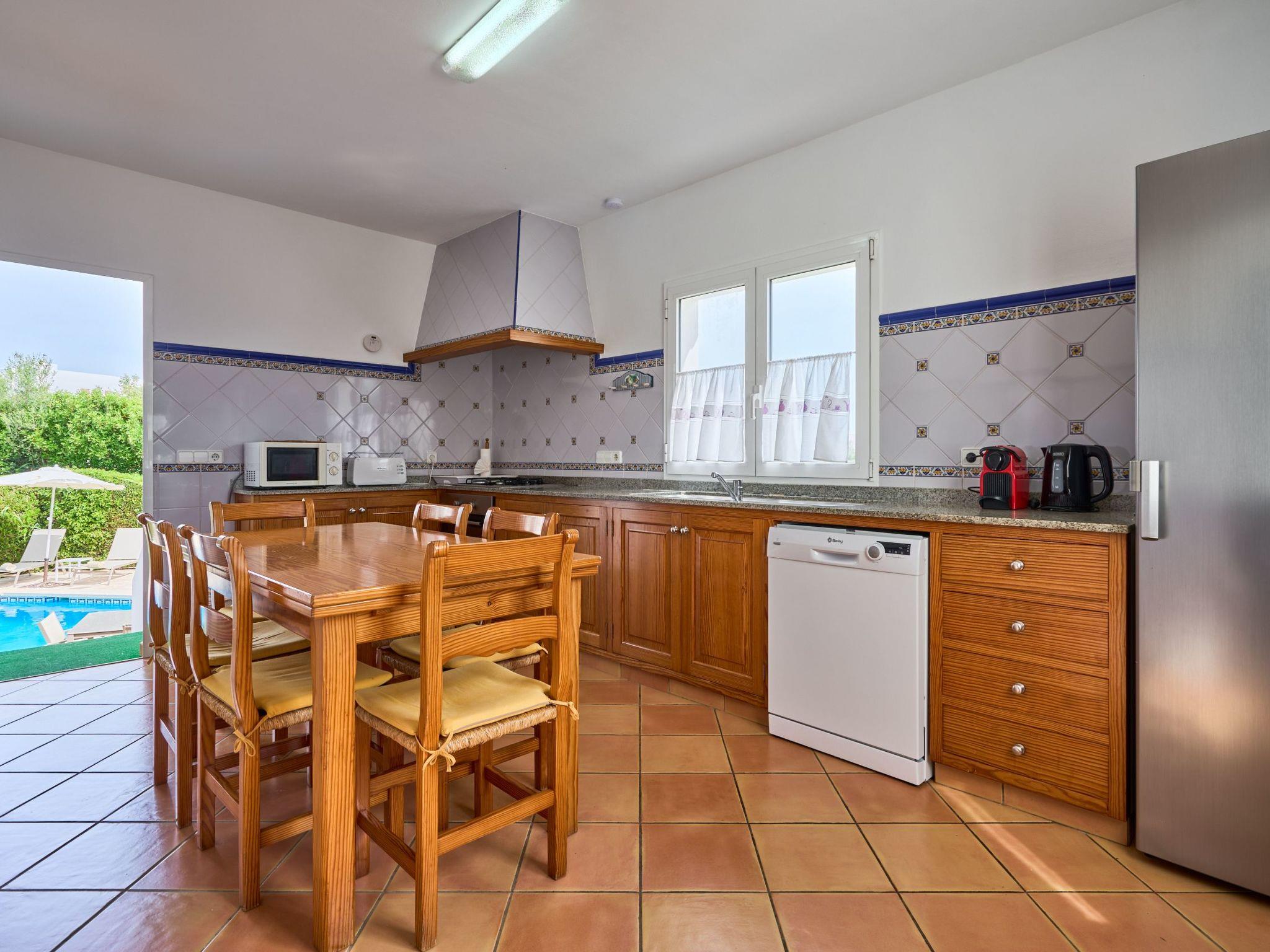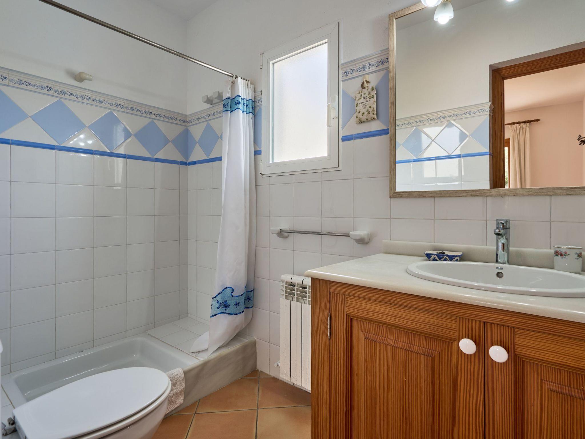 Holiday home on two floors with lawns, veranda and private pool. The ground floor has a living/dining room. Spacious, well-equipped kitchen with access to the pool area. Utility room with washing machine. One bedroom with double bed and en-suite bathroom with shower. The second bedroom with two single beds and en-suite bathroom with bathtub and two further bedrooms on the first floor. One with a double bed and the other with two single beds. Each with en-suite bathroom with bathtub and access to the terrace. Air conditioning in the bedrooms with fixed limited usage time.