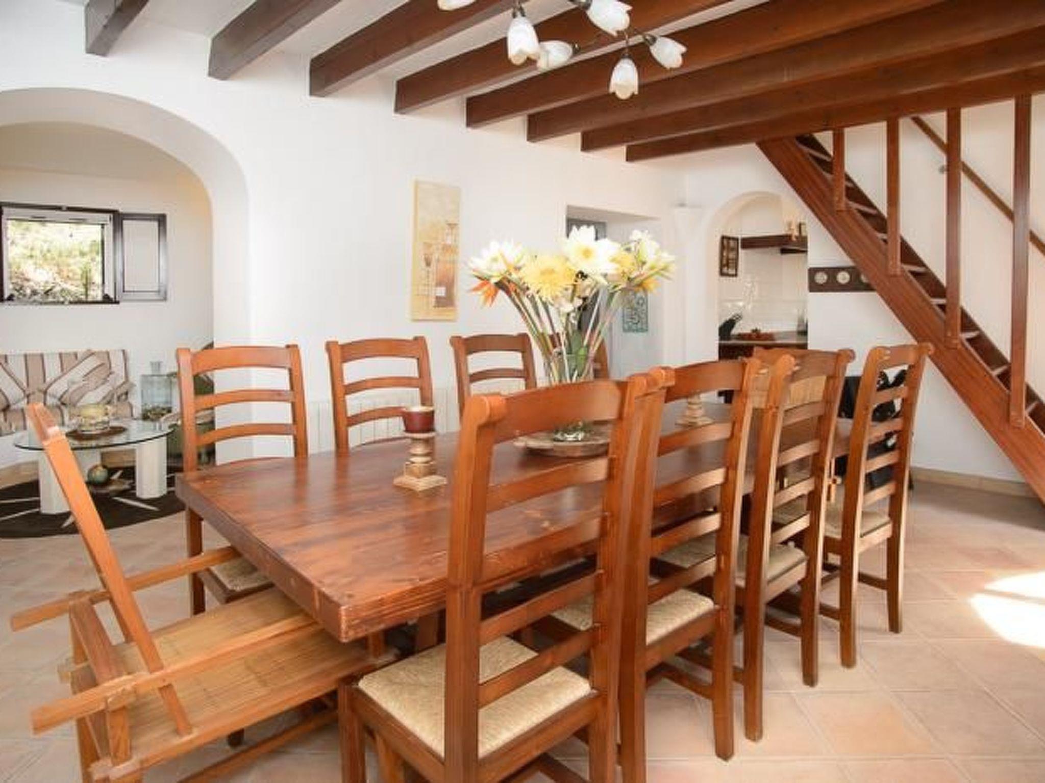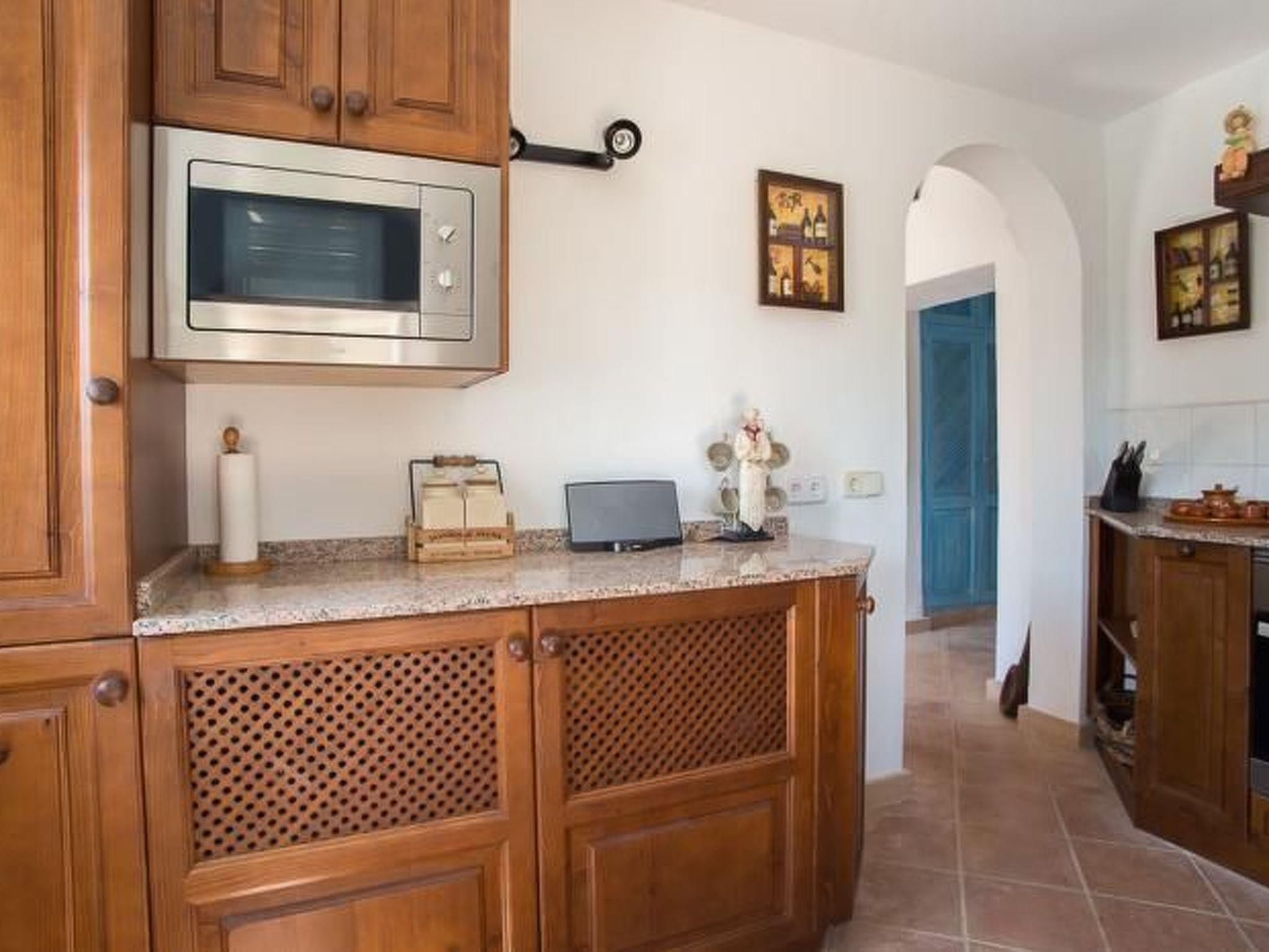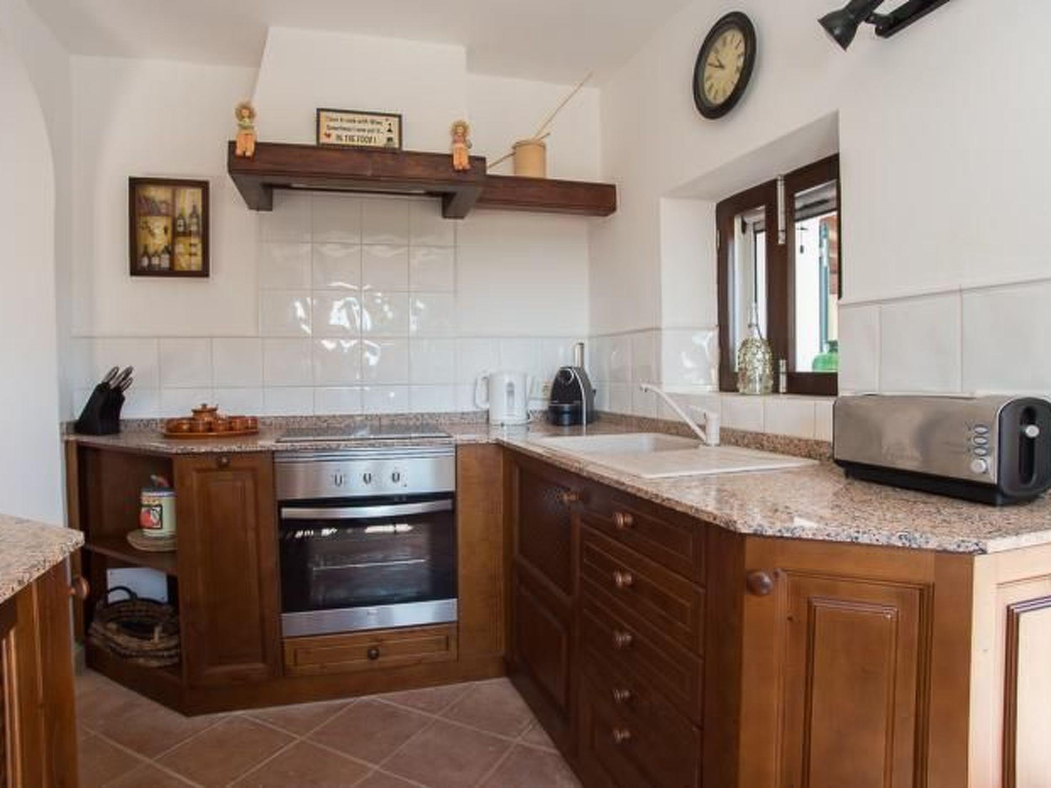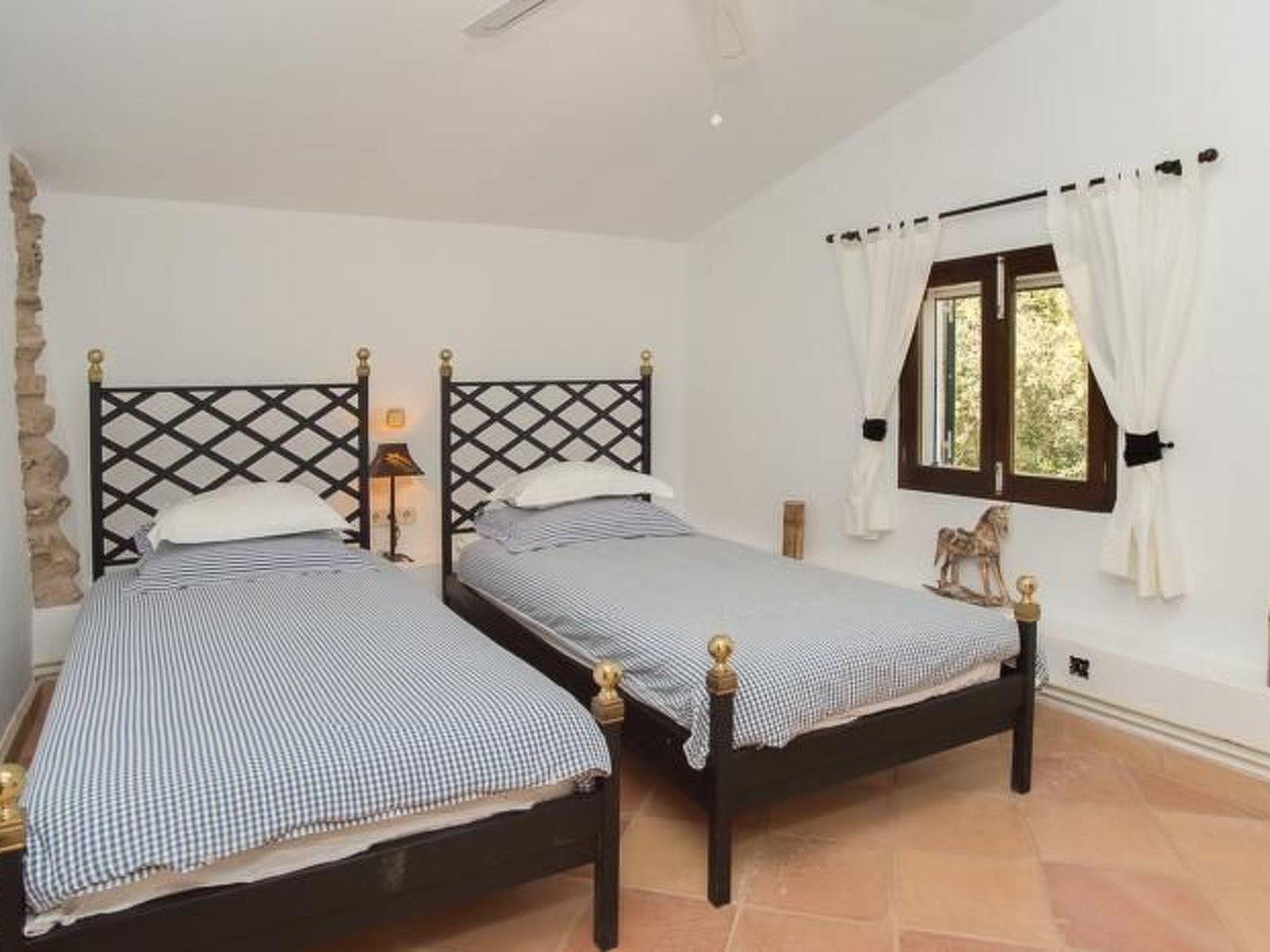 From the entrance we reach the dining room and the TV room. The kitchen is adjacent to the dining room and has access to the outside. The washing machine is located in a shower room. A narrow wooden staircase leads to the upper floor to a cosy sitting area with two armchairs. The master bedroom has a double bed, the other bedroom has two single beds. These two bedrooms share a separate shower room. The third bedroom is located separately by the pool and has a double bed and a compact shower room.