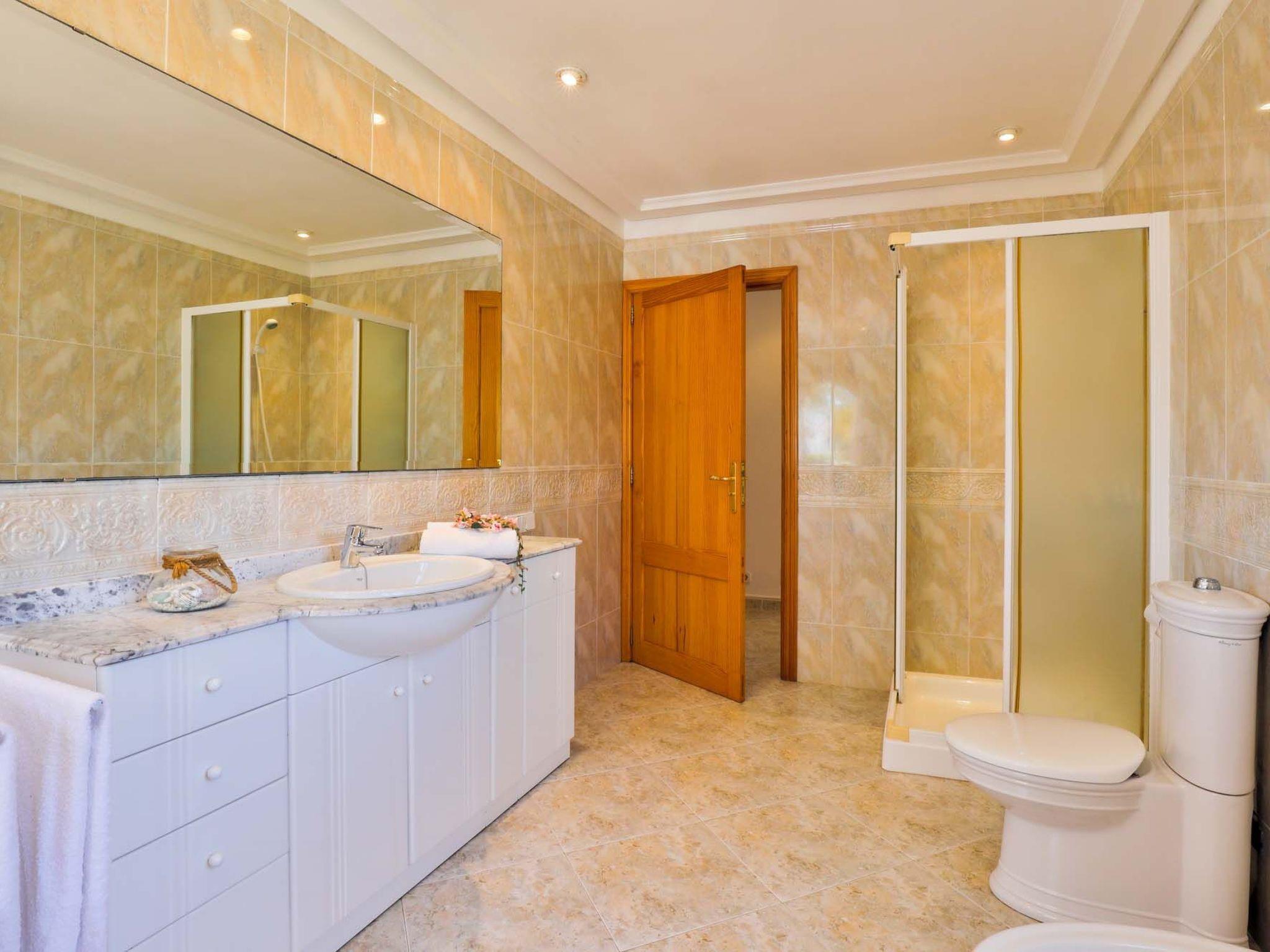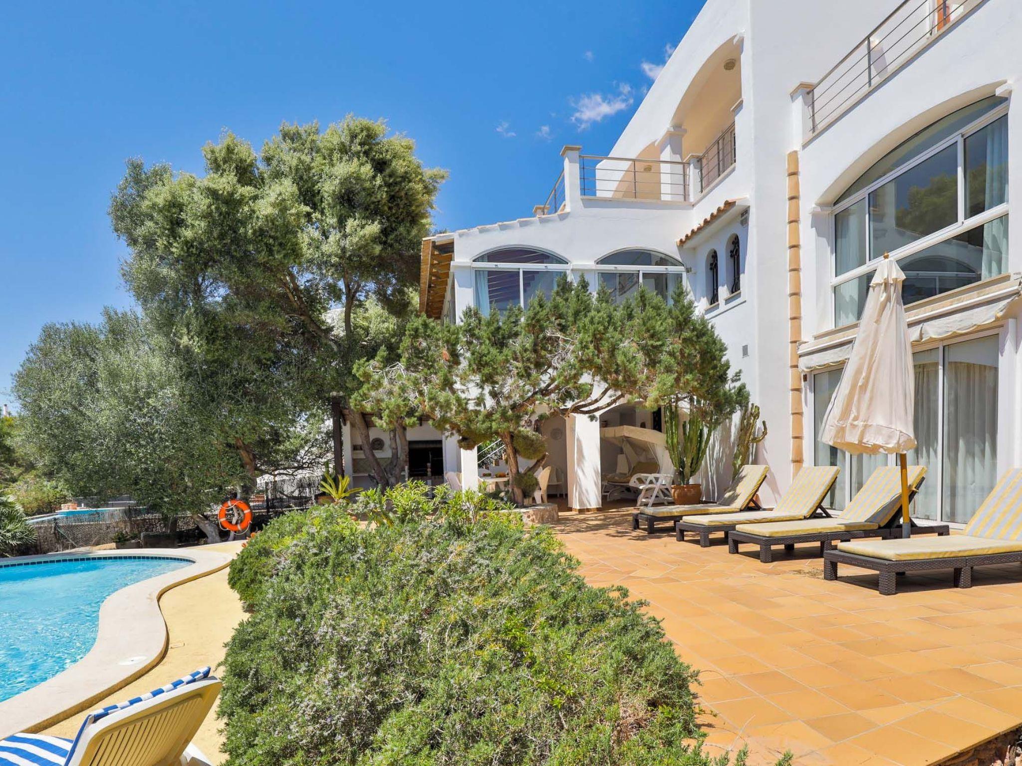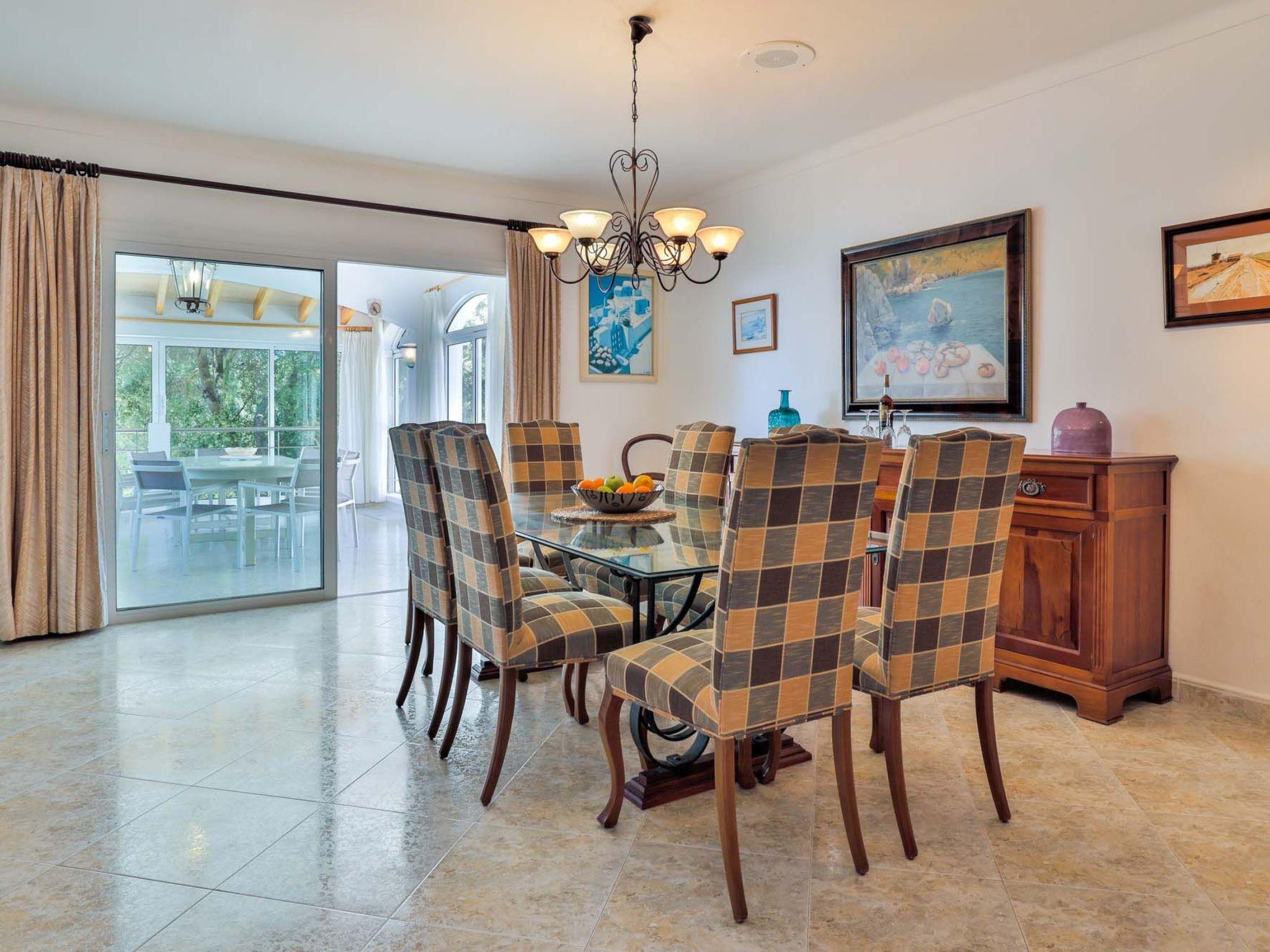 The reception area on the ground floor leads into a dining room. Sliding glass doors lead into a conservatory with a further dining table, sofas and partial sea views. Adjacent to the dining room are the kitchen and the living room, where beautiful views are also a priority, with the sofa overlooking the pool area and the sea beyond. There is also a satellite TV in the living room and WLAN internet access is available. The living room leads to a bedroom with 2 single beds and en suite shower room. On the ground floor there is also a utility room, guest toilet and access to the garage, which leads to the pool terrace. There are a further 4 bedrooms on the 1st floor. The master bedroom with double bed, dressing room and en suite bathroom with separate shower and terrace with sea views. The 3 remaining bedrooms, one with double bed, 2 with 2 single beds each, share a bathroom and on the terrace near the pool (10 x 5 m) there is a room with sofas and table; ideal for children to play on fresh days in the low season. Shower room/ WC in the garage. Air conditioning hot/cold with set hours of use.