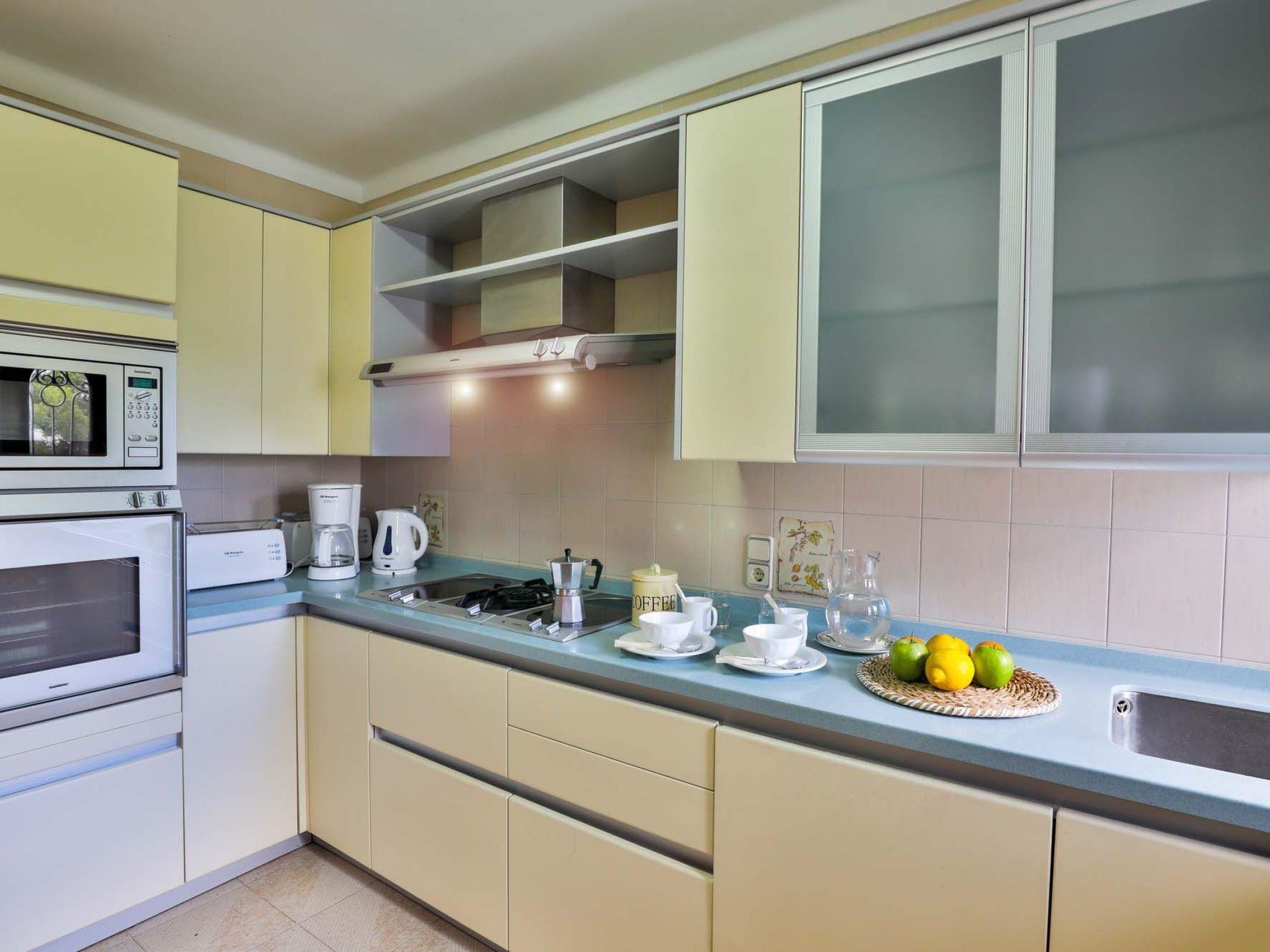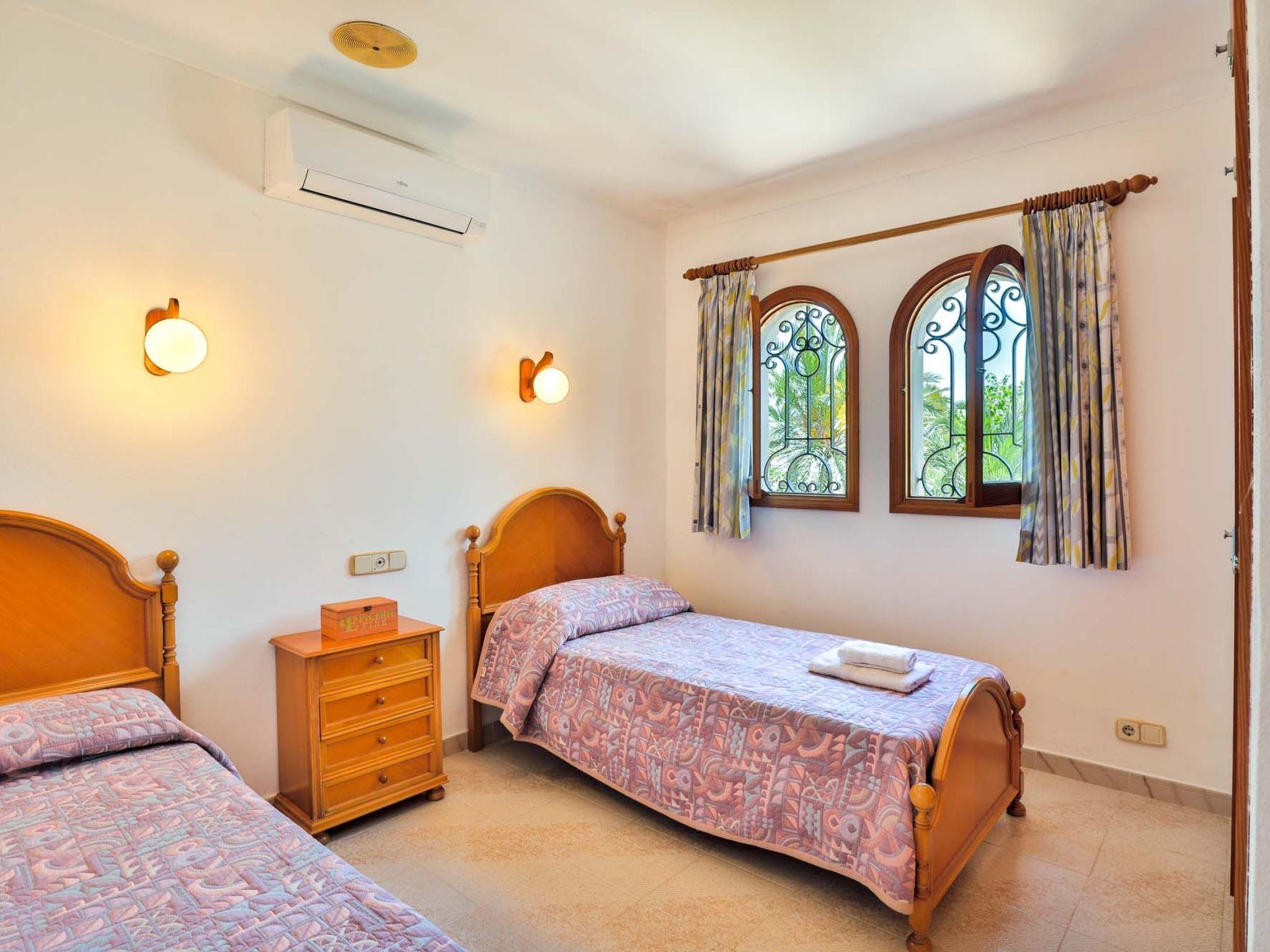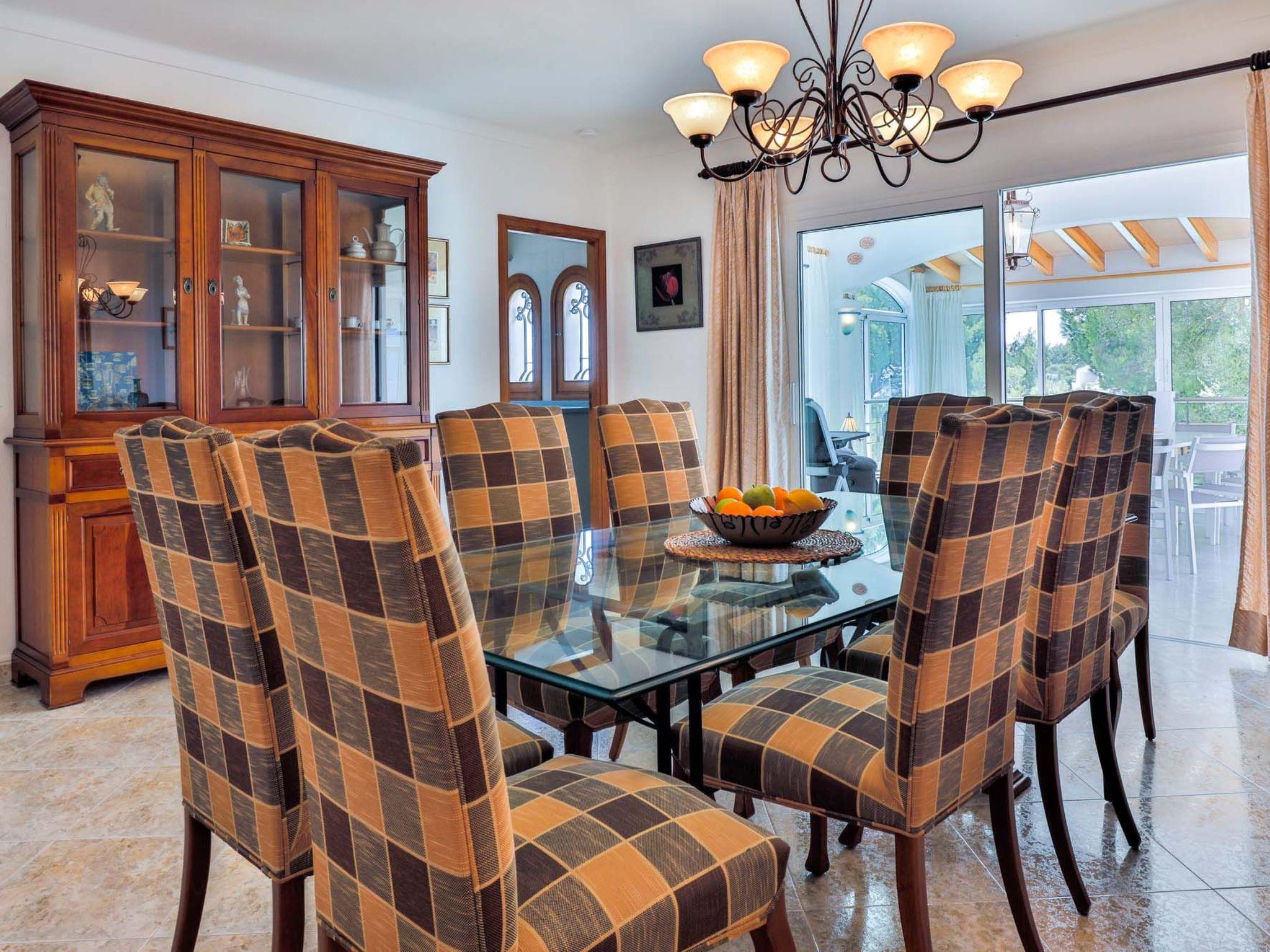 The reception area on the ground floor leads into a dining room. Sliding glass doors lead into a conservatory with a further dining table, sofas and partial sea views. Adjacent to the dining room are the kitchen and the living room, where beautiful views are also a priority, with the sofa overlooking the pool area and the sea beyond. There is also a satellite TV in the living room and WLAN internet access is available. The living room leads to a bedroom with 2 single beds and en suite shower room. On the ground floor there is also a utility room, guest toilet and access to the garage, which leads to the pool terrace. There are a further 4 bedrooms on the 1st floor. The master bedroom with double bed, dressing room and en suite bathroom with separate shower and terrace with sea views. The 3 remaining bedrooms, one with double bed, 2 with 2 single beds each, share a bathroom and on the terrace near the pool (10 x 5 m) there is a room with sofas and table; ideal for children to play on fresh days in the low season. Shower room/ WC in the garage. Air conditioning hot/cold with set hours of use.