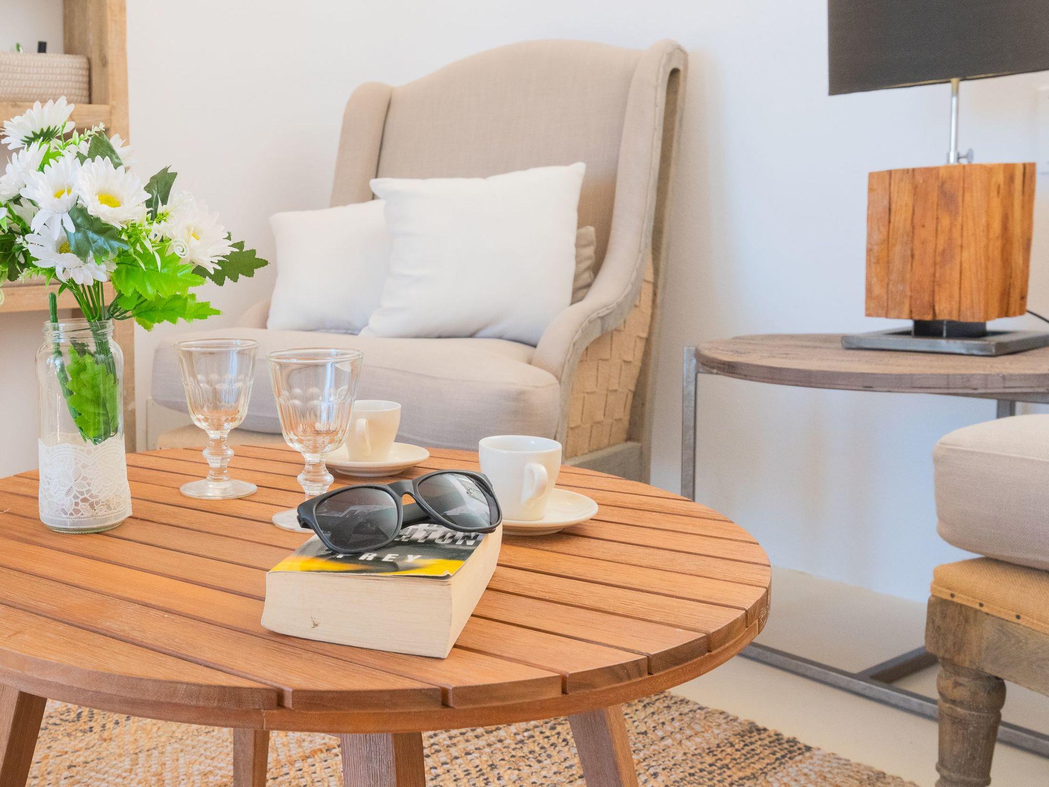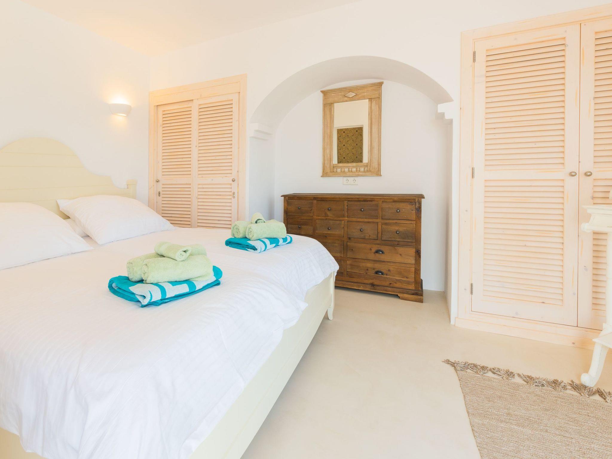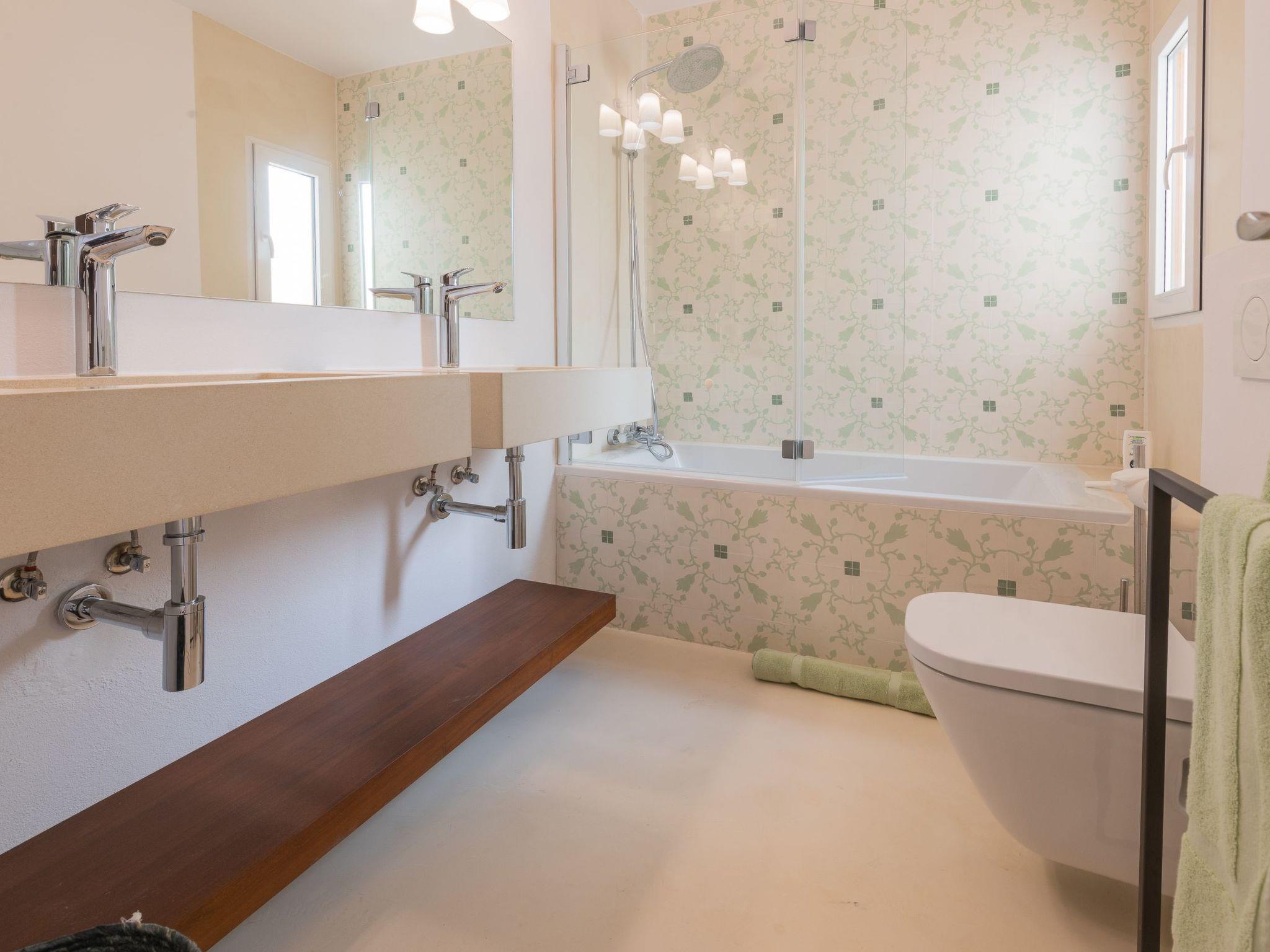 The house is spread over two floors, the furniture in neutral colours with accentuated splashes of colour gives the interior of the house a cosy, relaxing atmosphere. The bathrooms and kitchen have a vintage style and the ground floor has a kitchen with pantry, where the washing machine and tumble dryer are located. The dining room offers access to a terrace overlooking the garden. The living area is very cosy and has a reading corner, both offer access to the main covered terrace with views of the pool and the sea. A guest toilet completes the ground floor. There are three double bedrooms on the first floor. One of them offers an en suite shower room and a private balcony with incredible sea views. The other two bedrooms share a separate bathroom with bathtub and access to a balcony overlooking the garden.