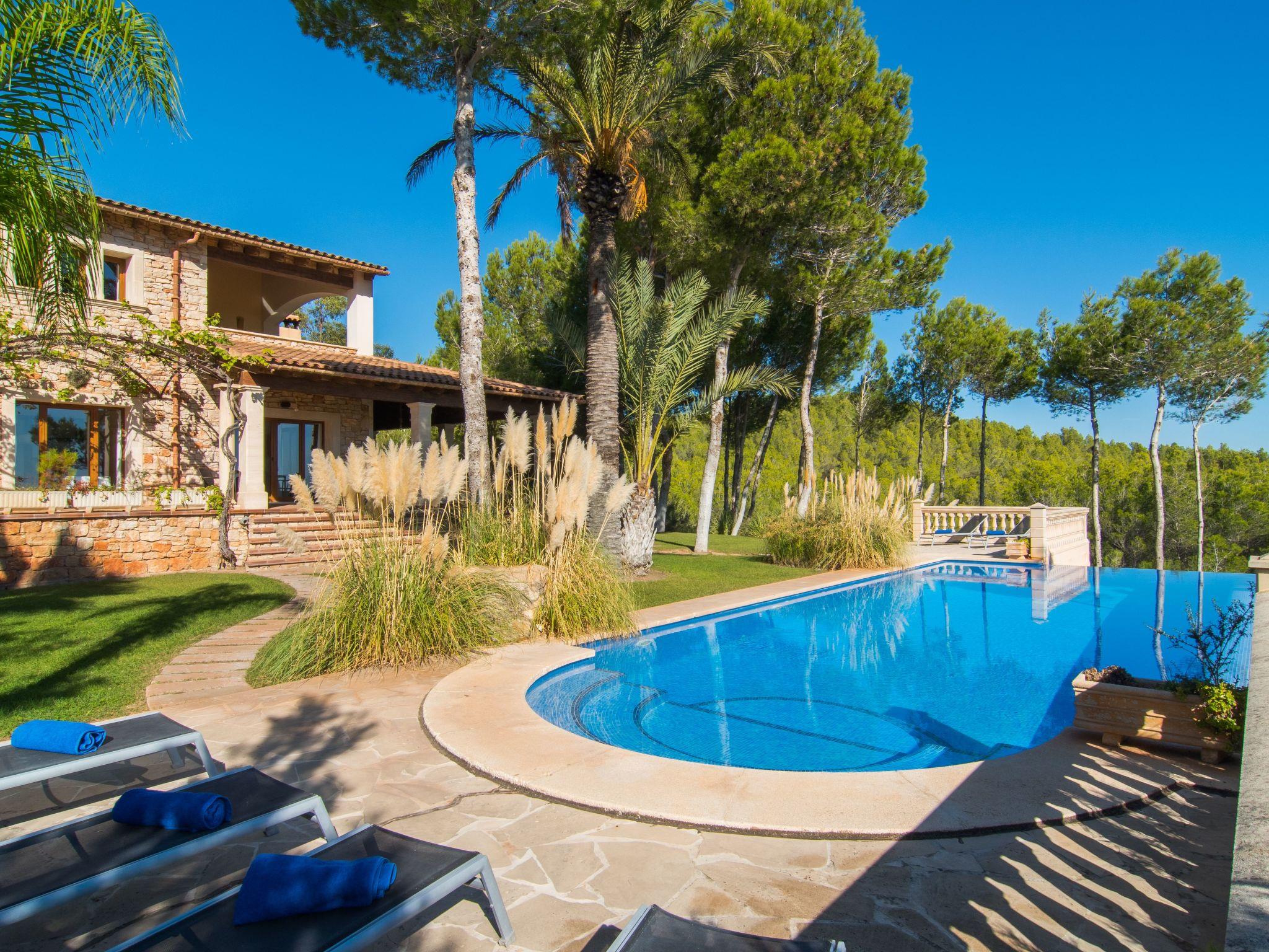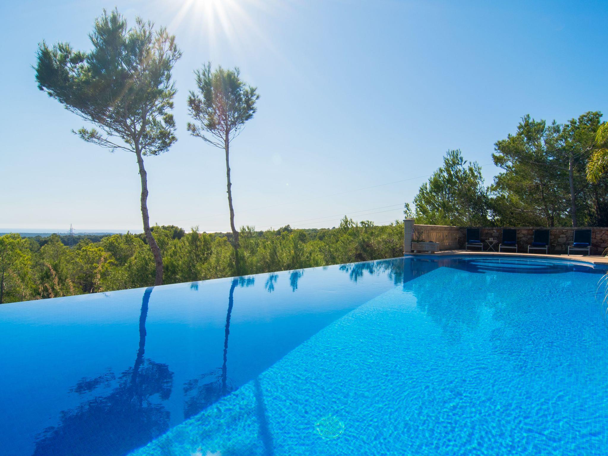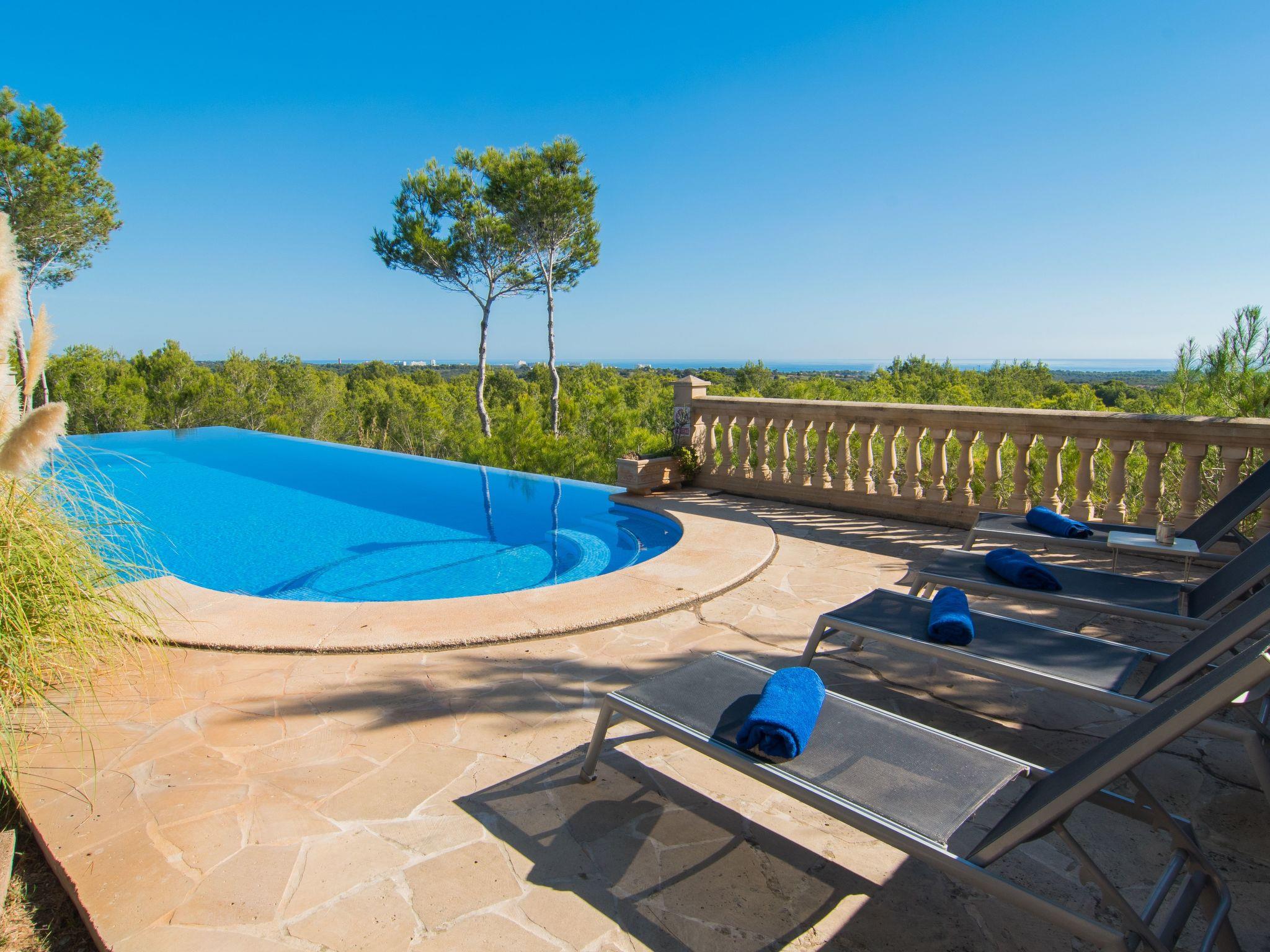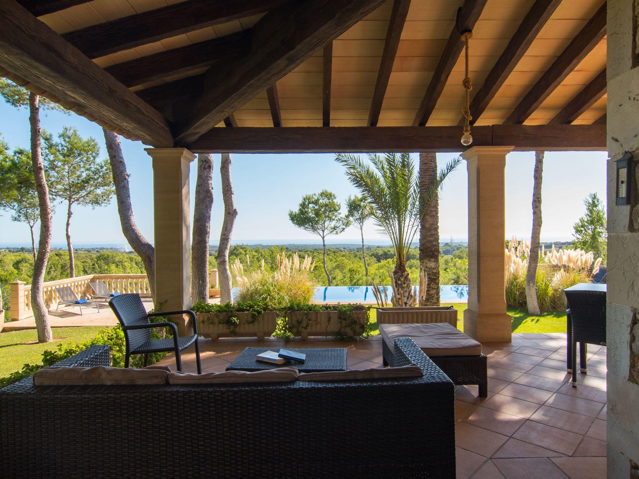 From terrace a few steps lead down to the garden lawns with mature Palm trees and the magnificent "infinity" swimming pool and comfortably furnished terraces. From here are fabulous far reaching views across Pine scented woods towards Porto Colom harbour and sea.