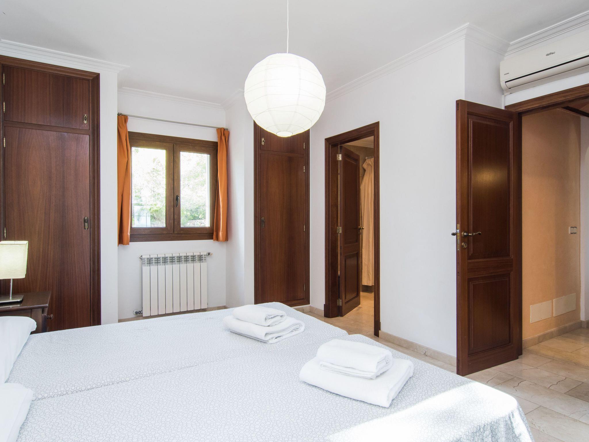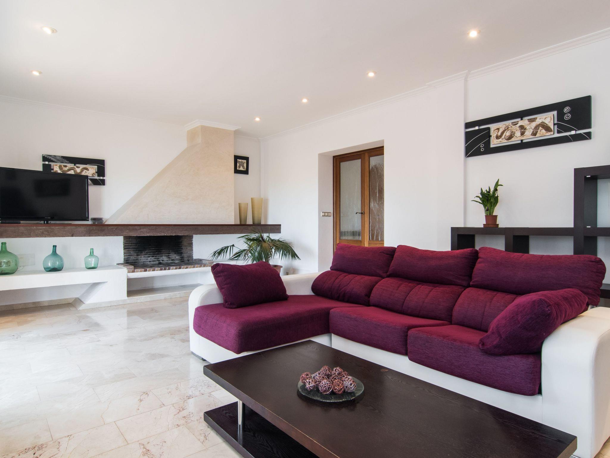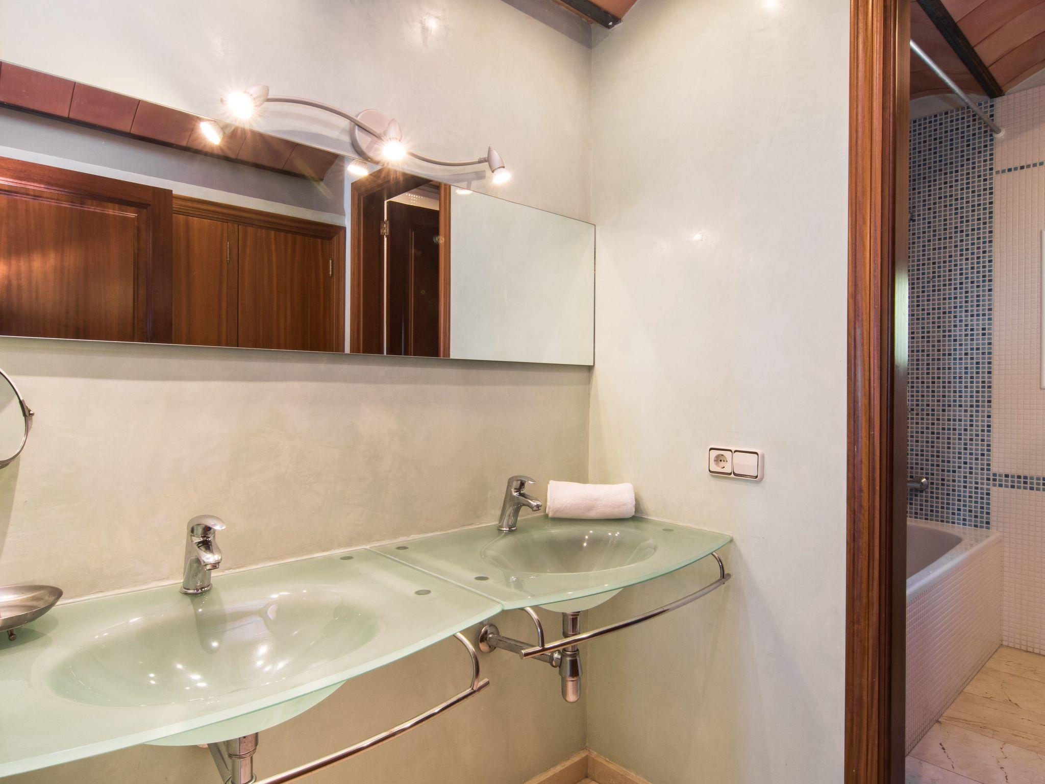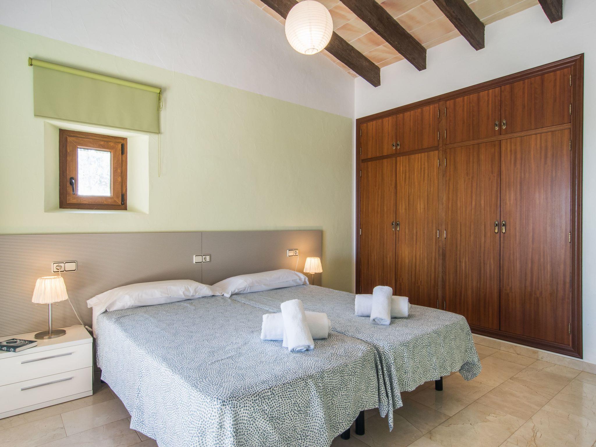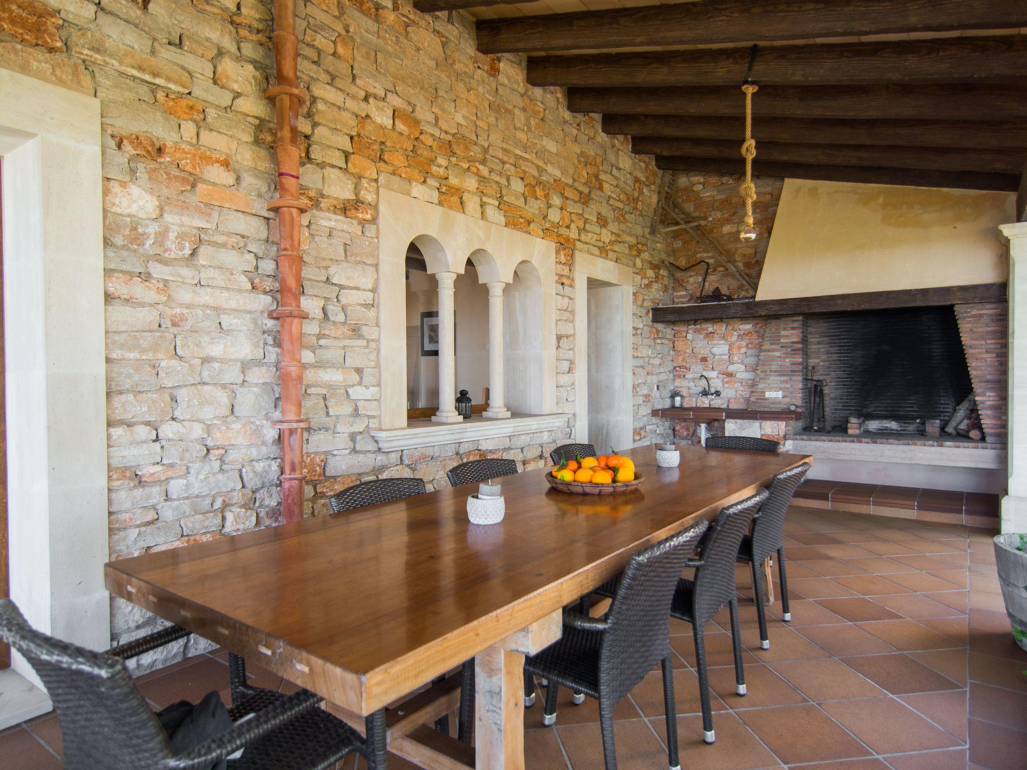 From terrace a few steps lead down to the garden lawns with mature Palm trees and the magnificent "infinity" swimming pool and comfortably furnished terraces. From here are fabulous far reaching views across Pine scented woods towards Porto Colom harbour and sea. The brick built BBQ has the original Bread Oven and washing facilities.There`s a great L-shaped covered terrace too with a dining table.
