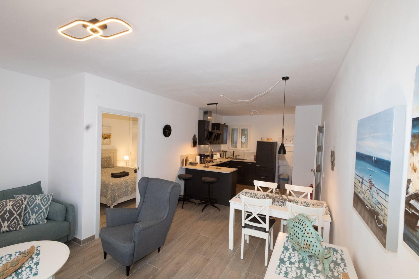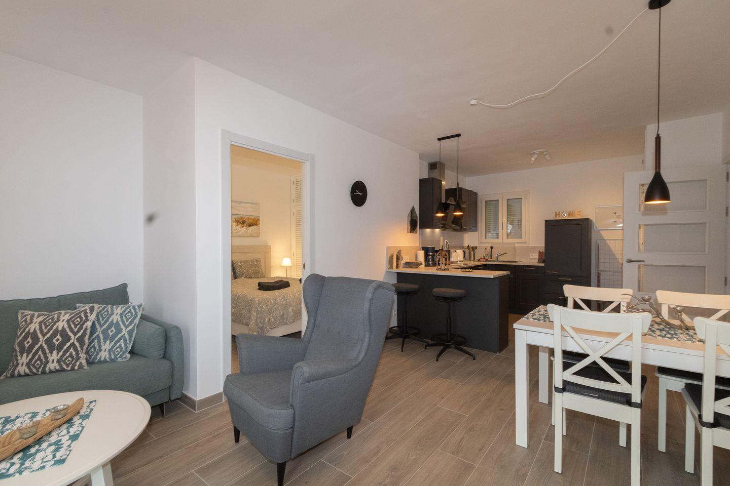 Ein echtes Highlight der Ferienwohnung ist der Balkon, auf dem Sie den Blick in den schönen Garten genießen und die mediterrane Atmosphäre in vollen Zügen auskosten können. Der Außenbereich ist perfekt, um bei einem Glas Wein zu entspannen oder die Kinder beim Spielen zu beobachten. Sie müssen diese Idylle jedoch nicht alleine genießen – auch die Umgebung hat einiges zu bieten: Der Strand ist nur 50 Meter entfernt und ein kurzer Spaziergang bringt Sie zu zahlreichen Restaurants und Einkaufsmöglichkeiten, die lediglich 200 Meter entfernt sind.