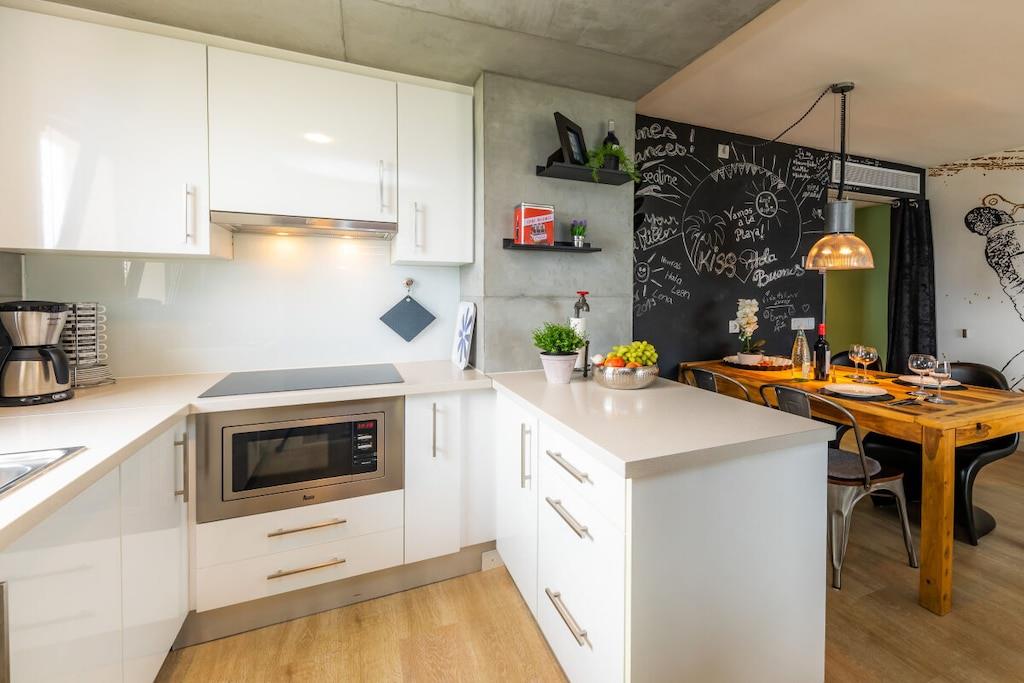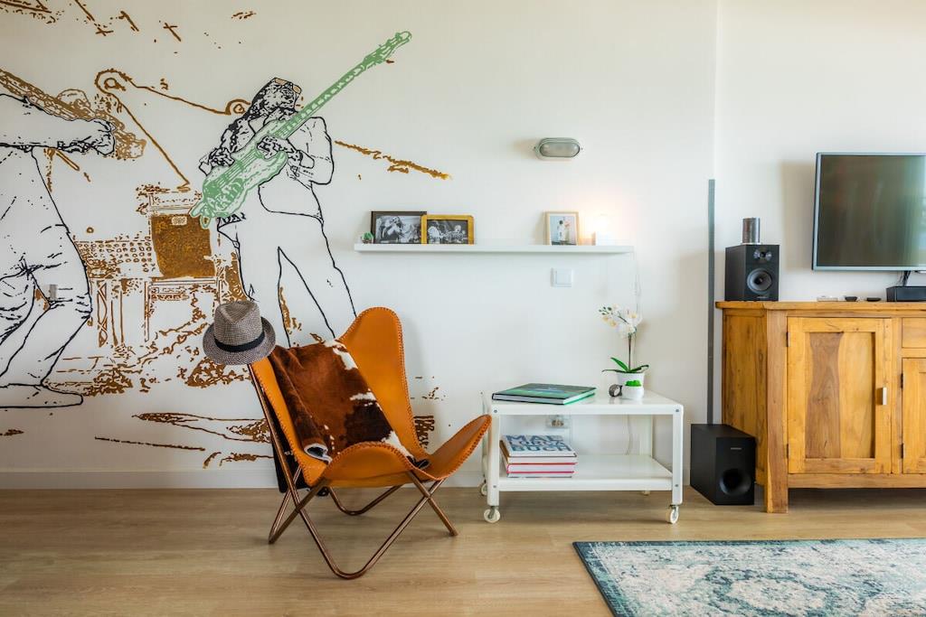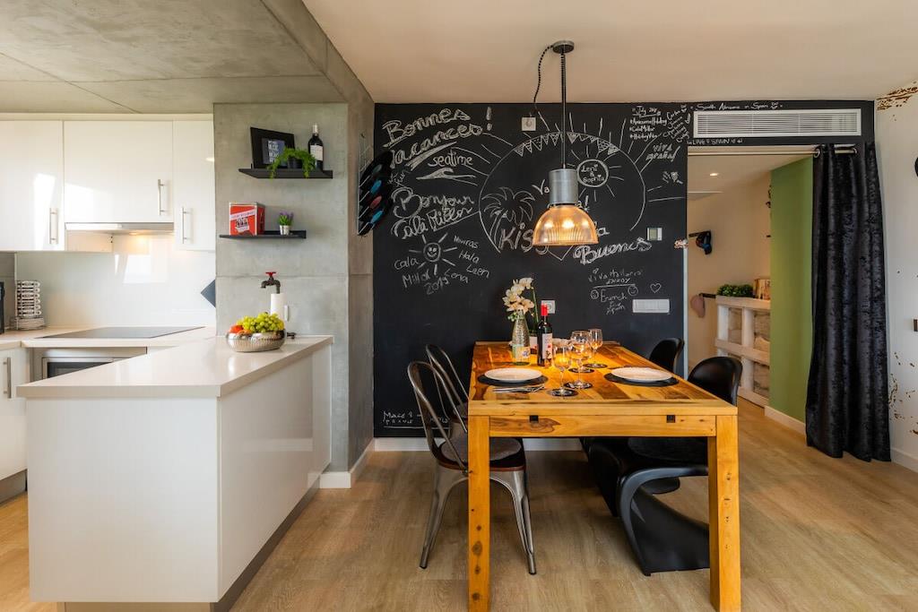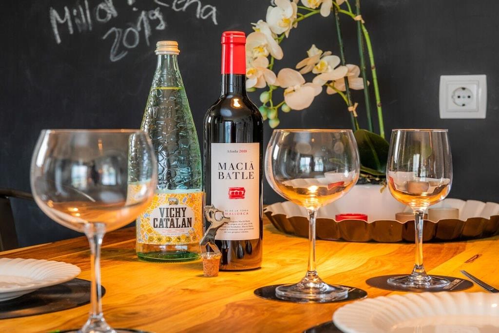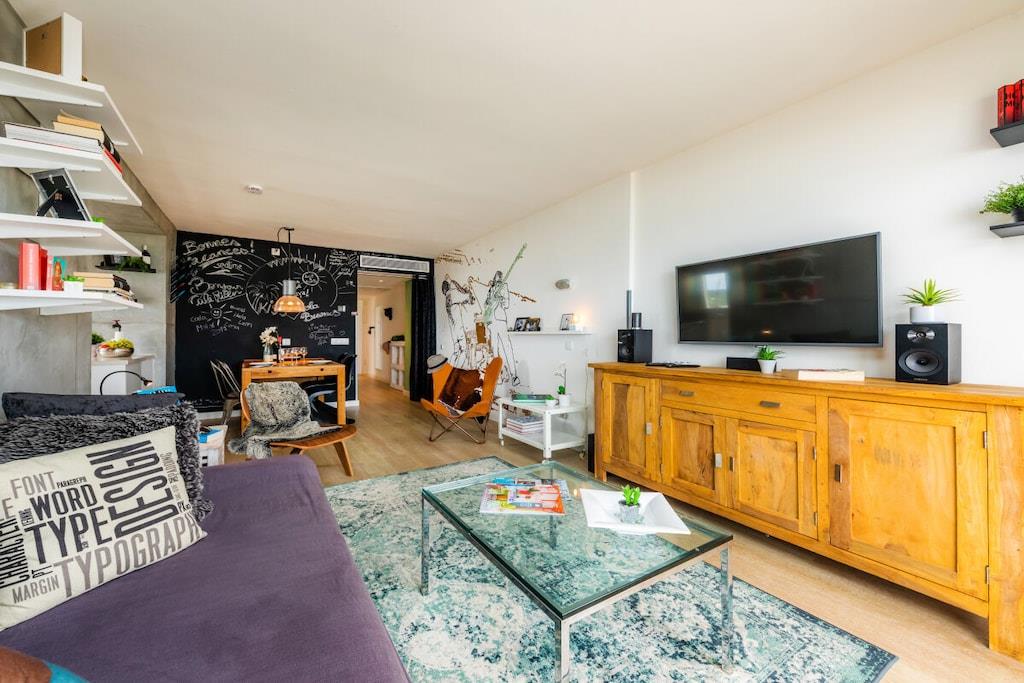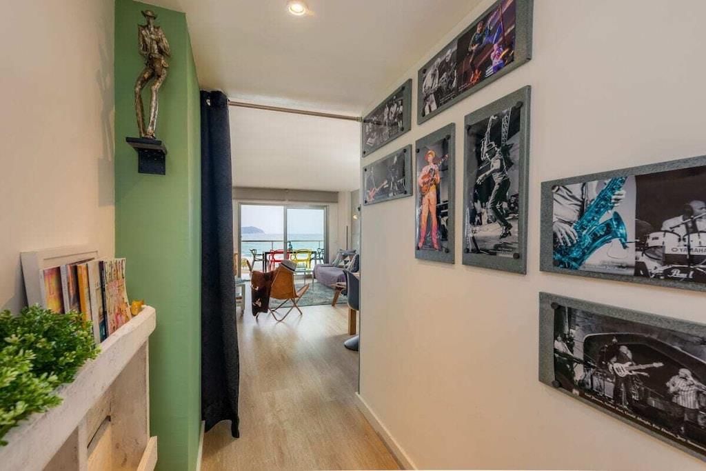 Lev som med venner! Individuell strandferieleilighet i loftstil på første linje av havet med uhindret panoramautsikt over hele bukten. Den 81 m² store ferieleiligheten i 2. etasje (heis tilgjengelig) har 2 soverom, bad med dusj, en stor stue/spisestue/kjøkken, en bod og en 11 m² overbygget balkong med utsikt over hele bukten foran havet. . Du kan også se stranden, palmene og naturparken Punta de n'Amer fra alle vinduer. Den lyse ferieleiligheten er designet etter mottoet "Vintage industrial meets music", ekte tre, skinn og metall dominerer. Begge soverommene har en 180 x 200 cm dobbeltseng (separate springmadrasser) og stuesofaen er uttrekkbar (150 x 200 cm) - så leiligheten har plass til 5 personer. Ferieleiligheten tilbyr også bøker (tysk, engelsk), DVDer, spill, stereoanlegg med CD/radio/USB, Astra satellittmottaker, svingbar LED-TV montert på veggen og gratis WiFi.