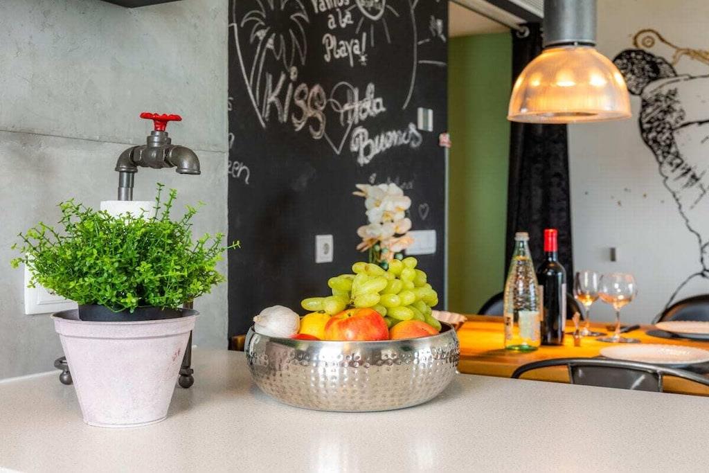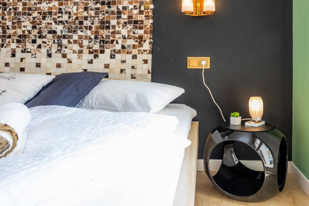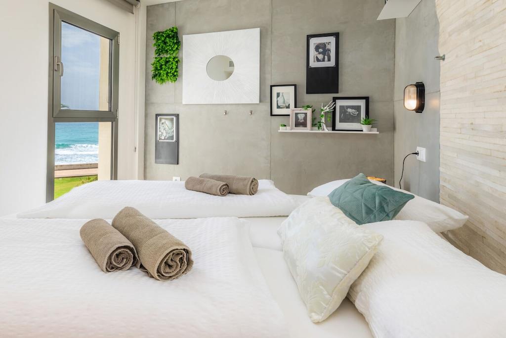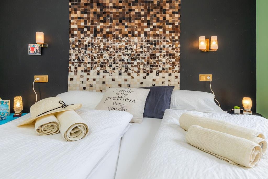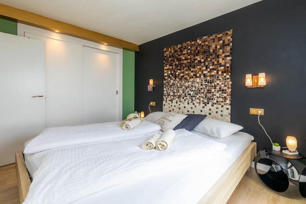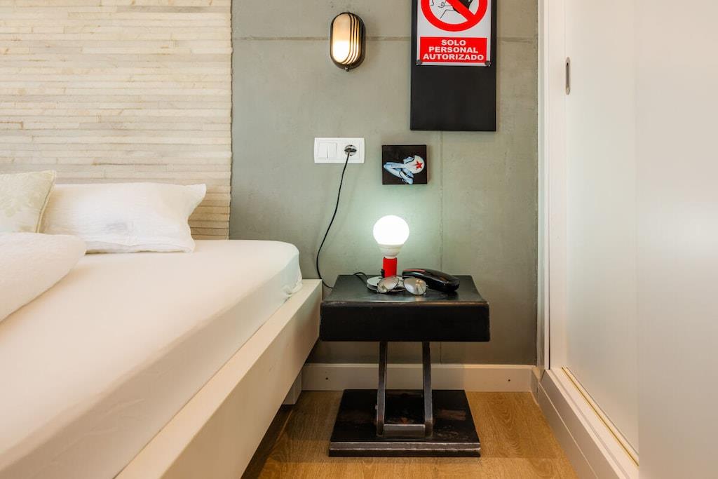 Lev som med venner! Individuell strandferieleilighet i loftstil på første linje av havet med uhindret panoramautsikt over hele bukten. Den 81 m² store ferieleiligheten i 2. etasje (heis tilgjengelig) har 2 soverom, bad med dusj, en stor stue/spisestue/kjøkken, en bod og en 11 m² overbygget balkong med utsikt over hele bukten foran havet. . Du kan også se stranden, palmene og naturparken Punta de n'Amer fra alle vinduer. Den lyse ferieleiligheten er designet etter mottoet "Vintage industrial meets music", ekte tre, skinn og metall dominerer. Begge soverommene har en 180 x 200 cm dobbeltseng (separate springmadrasser) og stuesofaen er uttrekkbar (150 x 200 cm) - så leiligheten har plass til 5 personer. Ferieleiligheten tilbyr også bøker (tysk, engelsk), DVDer, spill, stereoanlegg med CD/radio/USB, Astra satellittmottaker, svingbar LED-TV montert på veggen og gratis WiFi.