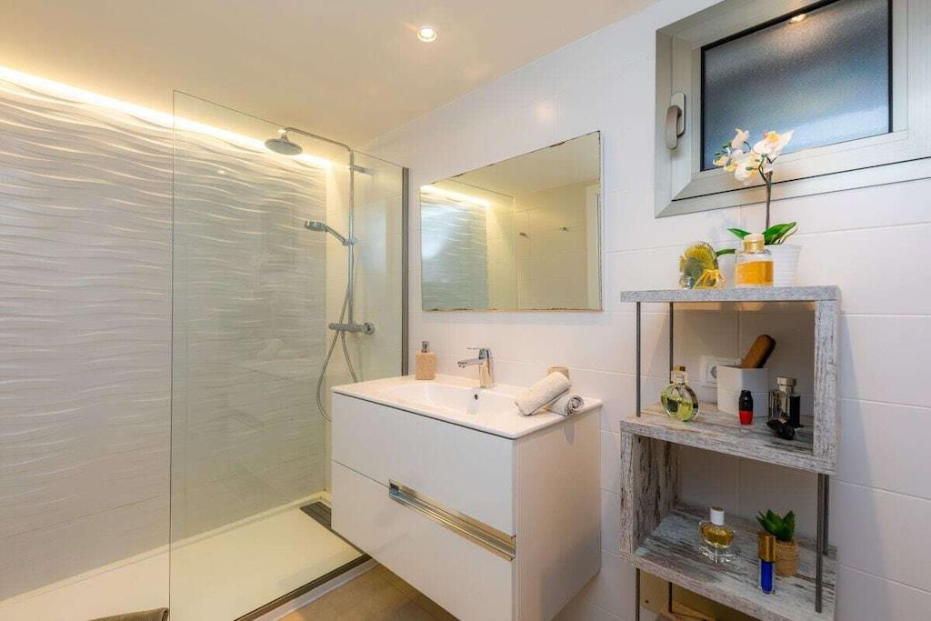 Første etasje: (entré, Stue(1 persons sovesofa, TV, DVD-spiller, radio, CD-spiller, klimaanlegg), Kjøkken(vedovn, komfyr med kokeplater, vannkoker, brødrister, kaffetrakter, stekovn, oppvaskmaskin, kjøleskap, fryser, klimaanlegg), soveværelse(dobbeltseng, klimaanlegg), soveværelse(dobbeltseng, klimaanlegg), bad(dusj, håndvask, toalett, Inkl. håndklær), oppbevaringsrom(vaskemaskin, strykebrett, strykejern)) vaskemaskin, balkon, hagemøbler, strykebrett, strykejern