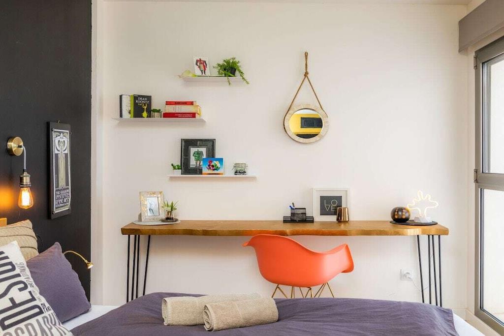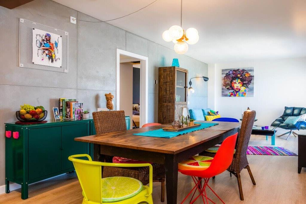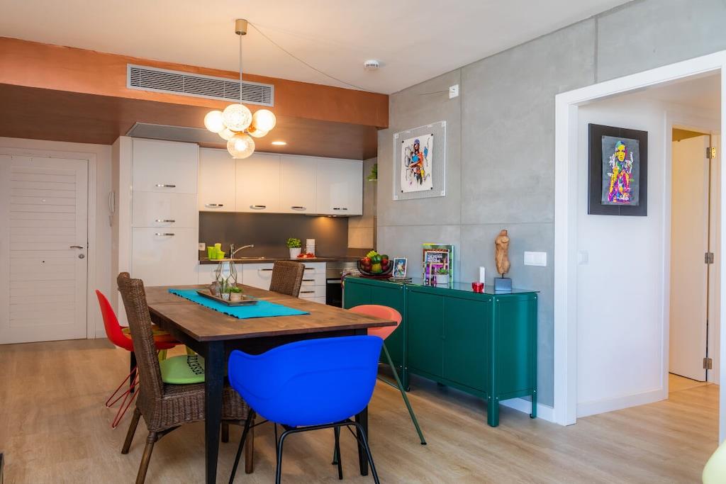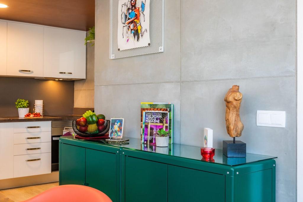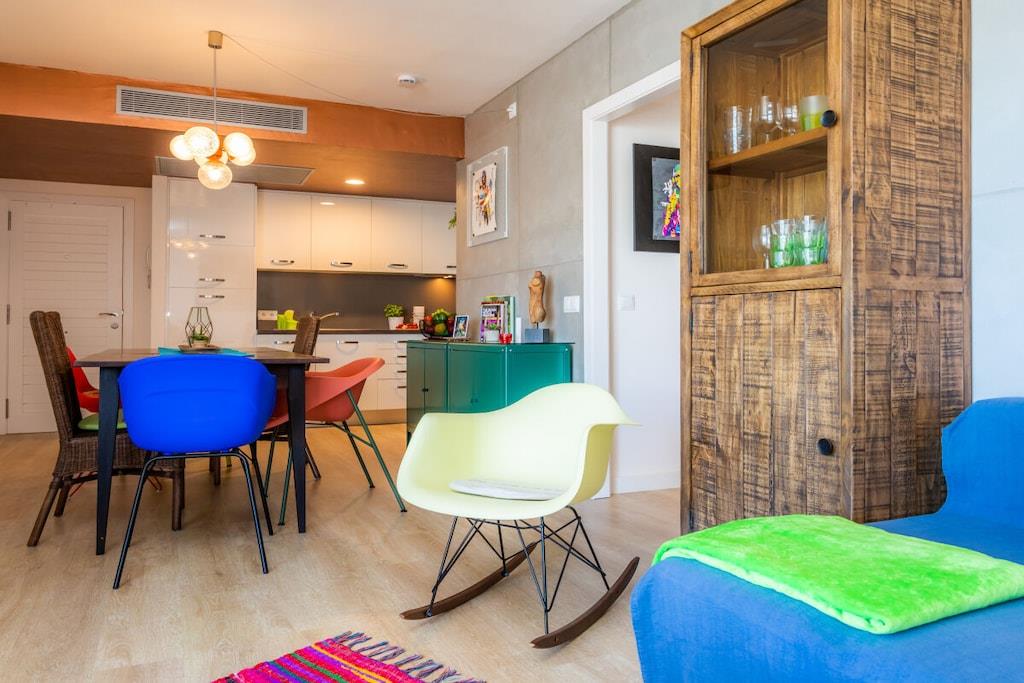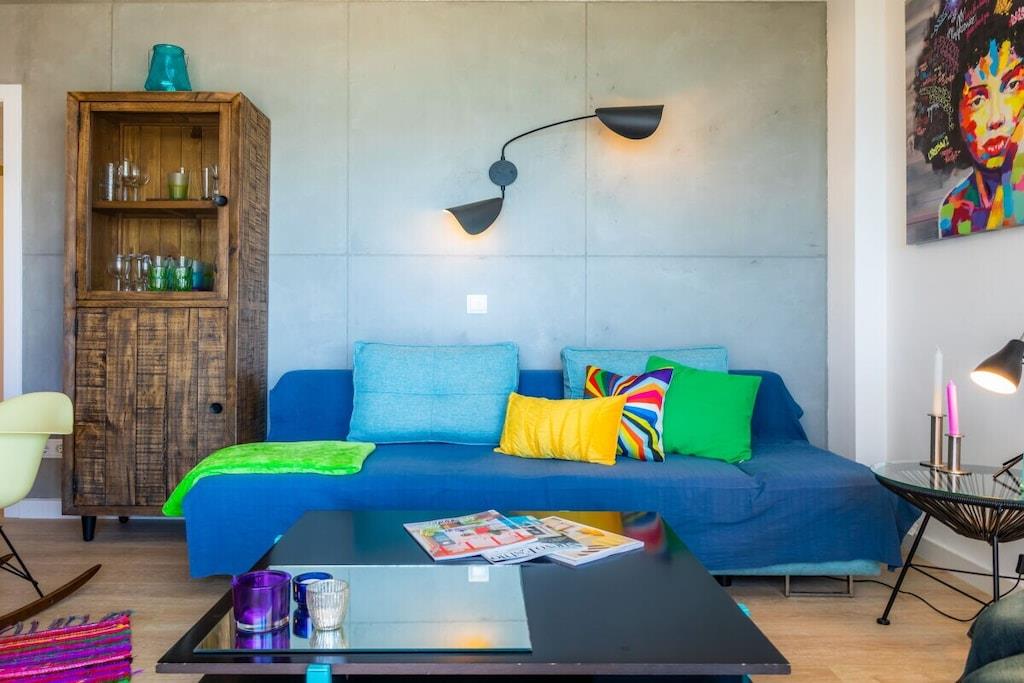Lev som med venner! Strandferieleilighet i loftstil i 6. etasje med majestetisk havutsikt på første linje. For det andre, vindstille vestvendt balkong. Den 84 m² store ferieleiligheten i 6. etasje (heis tilgjengelig) har 2 soverom, bad med dusj, stor stue/spisestue/kjøkken, en bod og 2 balkonger. Den 11 m² overbygde balkongen, som grenser til stue, ser østover over Cala Millor-bukten, men fanger også kveldssolen på baksiden. Den 4 m² store, solrike og vindbeskyttede vestvendte balkongen, som grenser til et soverom, ser innover mot fjellet. Den lyse ferieleiligheten er stilfullt og kreativt innredet med stor sans for detaljer etter mottoet "Heavy metal meets funky colors". Begge soverommene har en 180 x 200 cm dobbeltseng (separate springmadrasser) og stuesofaen er uttrekkbar (ca. 150 x 200 cm) - så leiligheten har plass til 5 personer. Ferieleiligheten tilbyr også bøker (tysk, engelsk), DVDer, spill, stereoanlegg, Astra satellittmottaker, flatskjerm-TV og gratis WiFi.