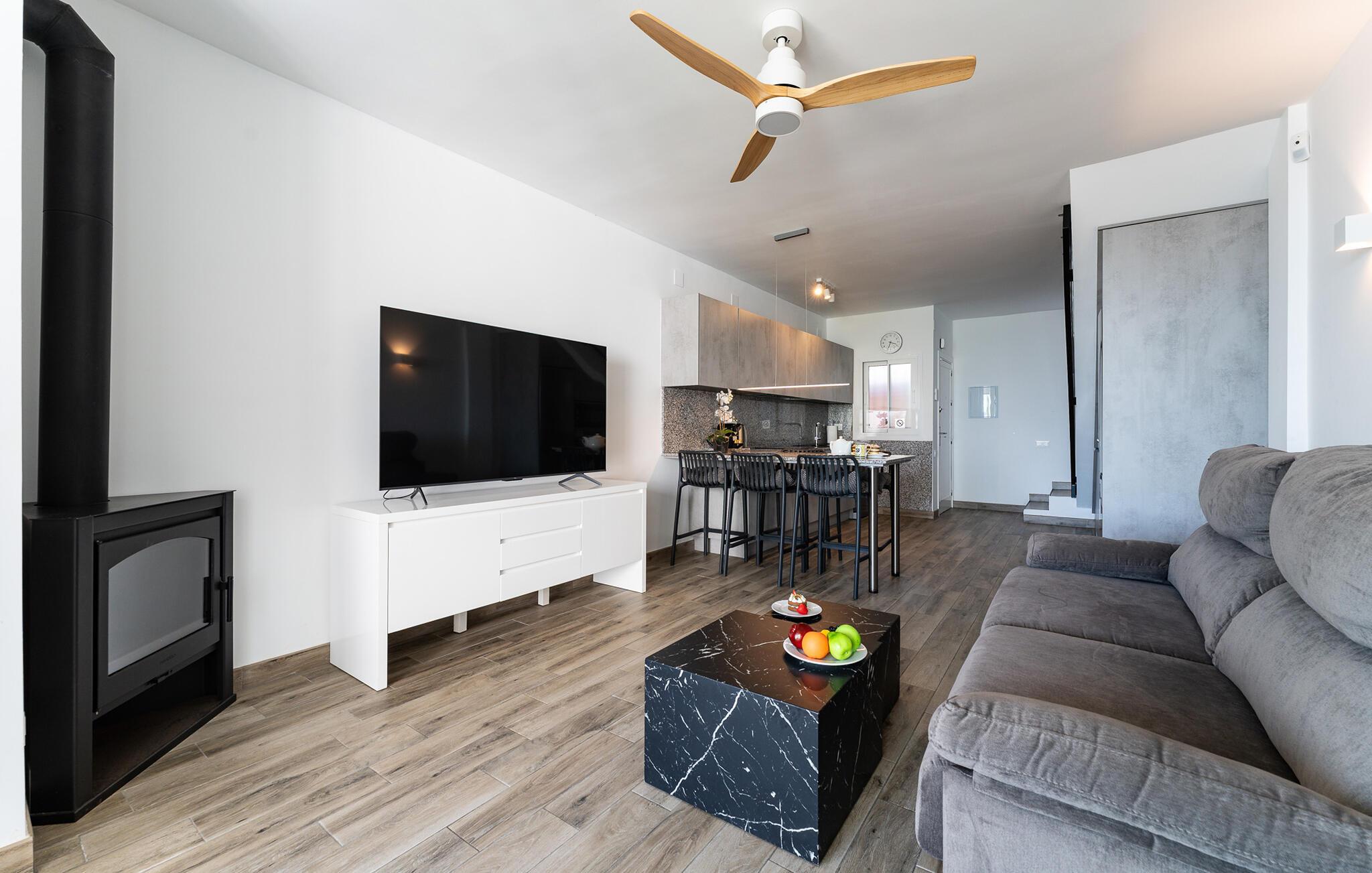 Bli ønsket velkommen av den klare, moderne designen. Slå deg ned i den komfortable sofaen og nyt avslappende timer med utsikt over terrassen. Hjemmet ditt kombinerer stue og kjøkken på en hyggelig måte og skaper en koselig atmosfære. Tilbered måltidene dine på det stilfulle kjøkkenet. Store vinduer og dører slipper inn rikelig med naturlig lys og åpner opp rommet mot utsiden.