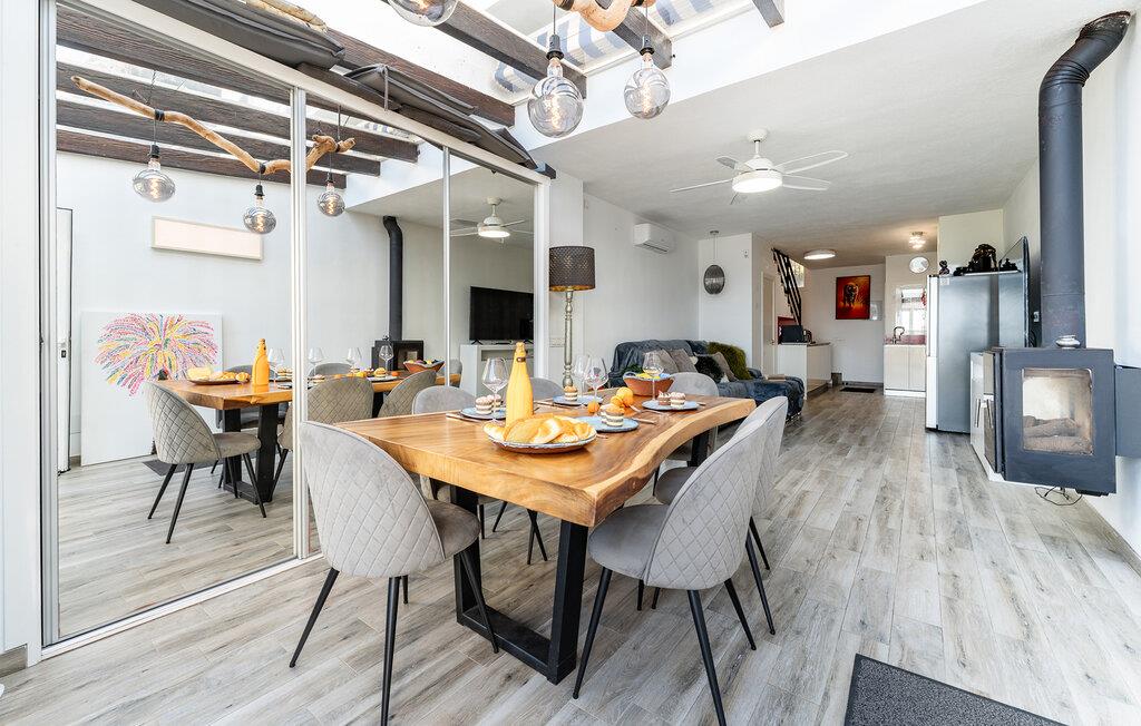 Bli ønsket velkommen av den klare, moderne designen. Slå deg ned i den komfortable sofaen og nyt avslappende timer med utsikt over terrassen. Hjemmet ditt kombinerer stue og kjøkken på en hyggelig måte og skaper en koselig atmosfære. Tilbered måltidene dine på det stilfulle kjøkkenet. Store vinduer og dører slipper inn rikelig med naturlig lys og åpner opp rommet mot utsiden.