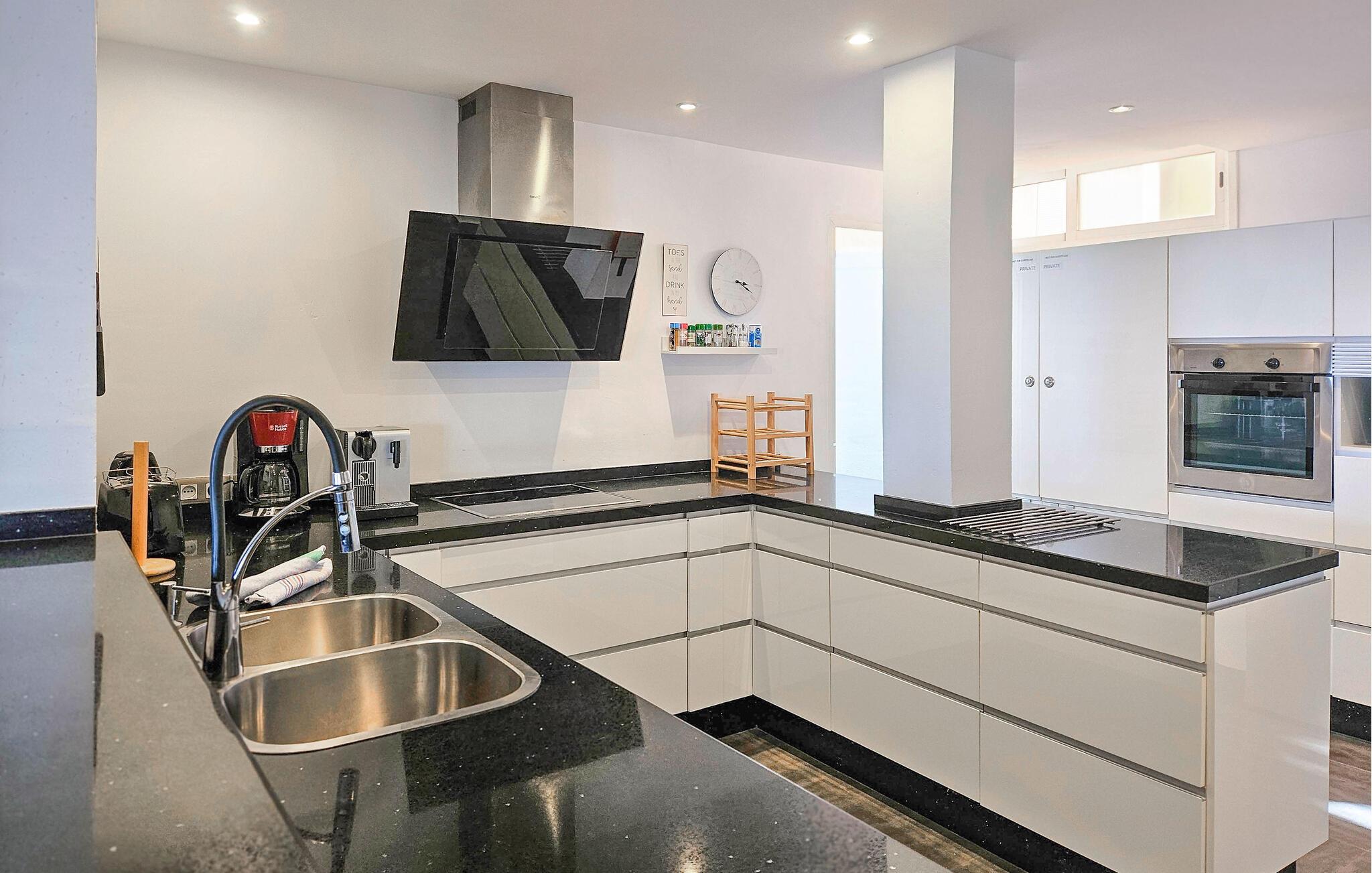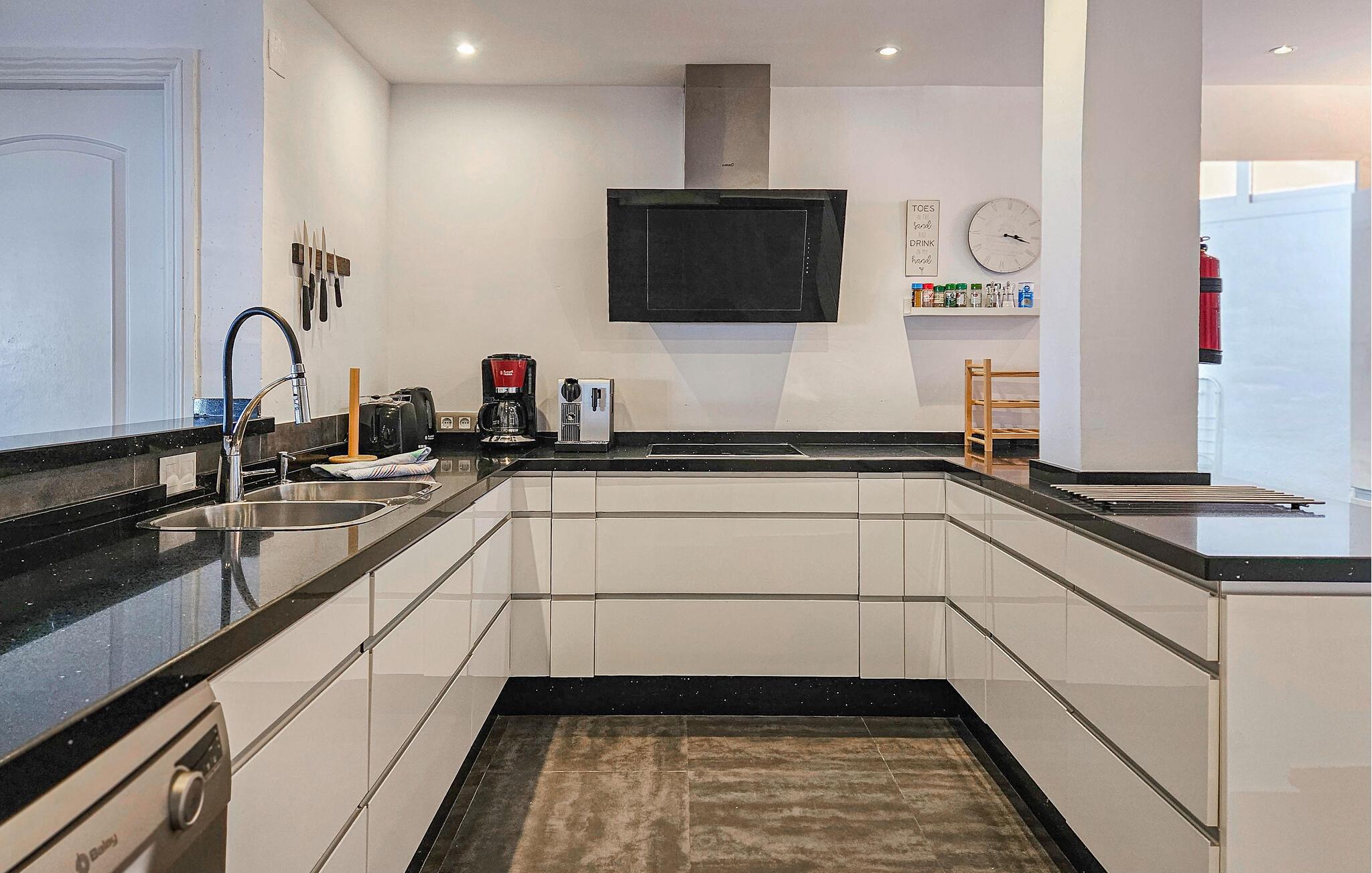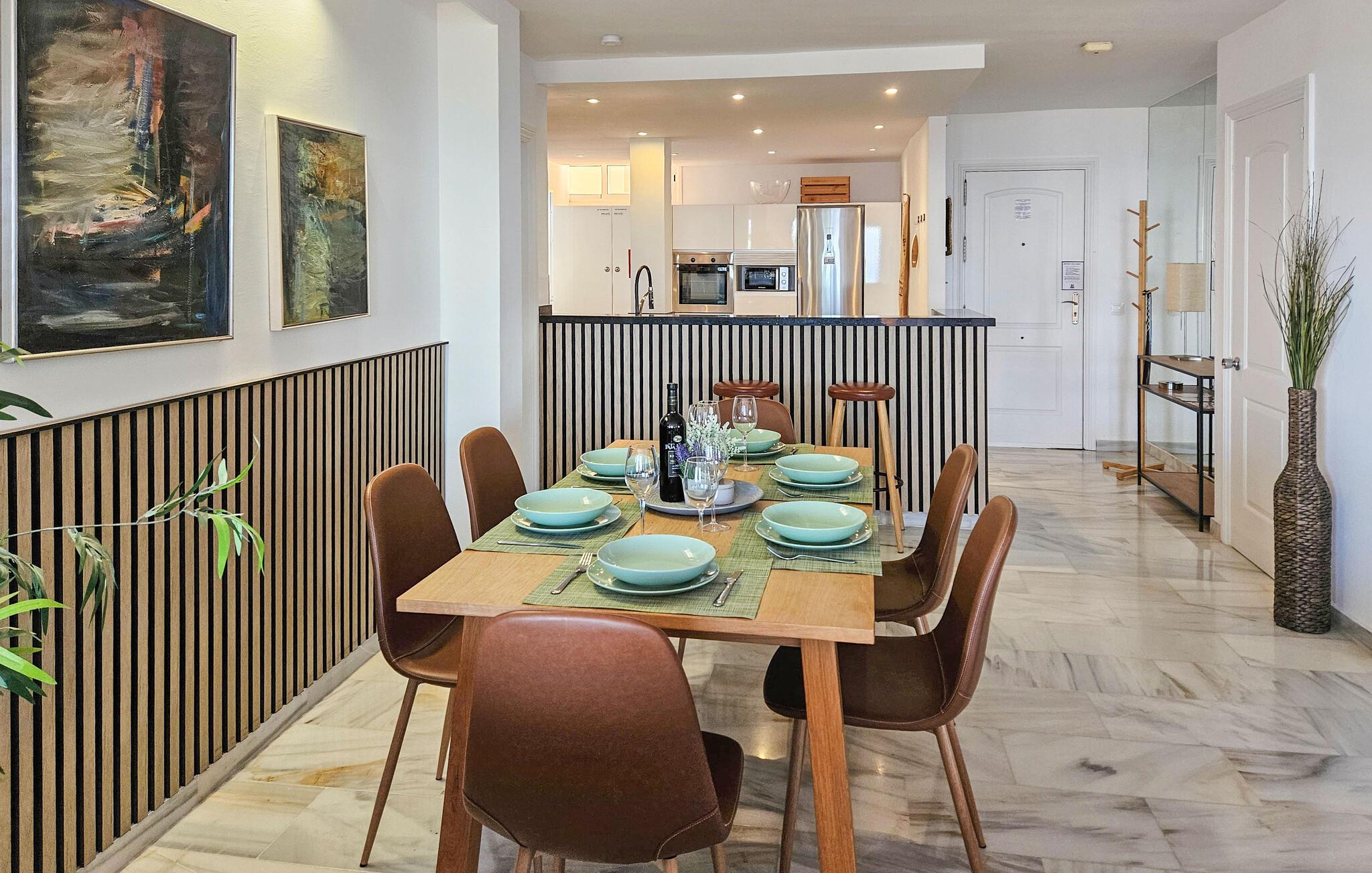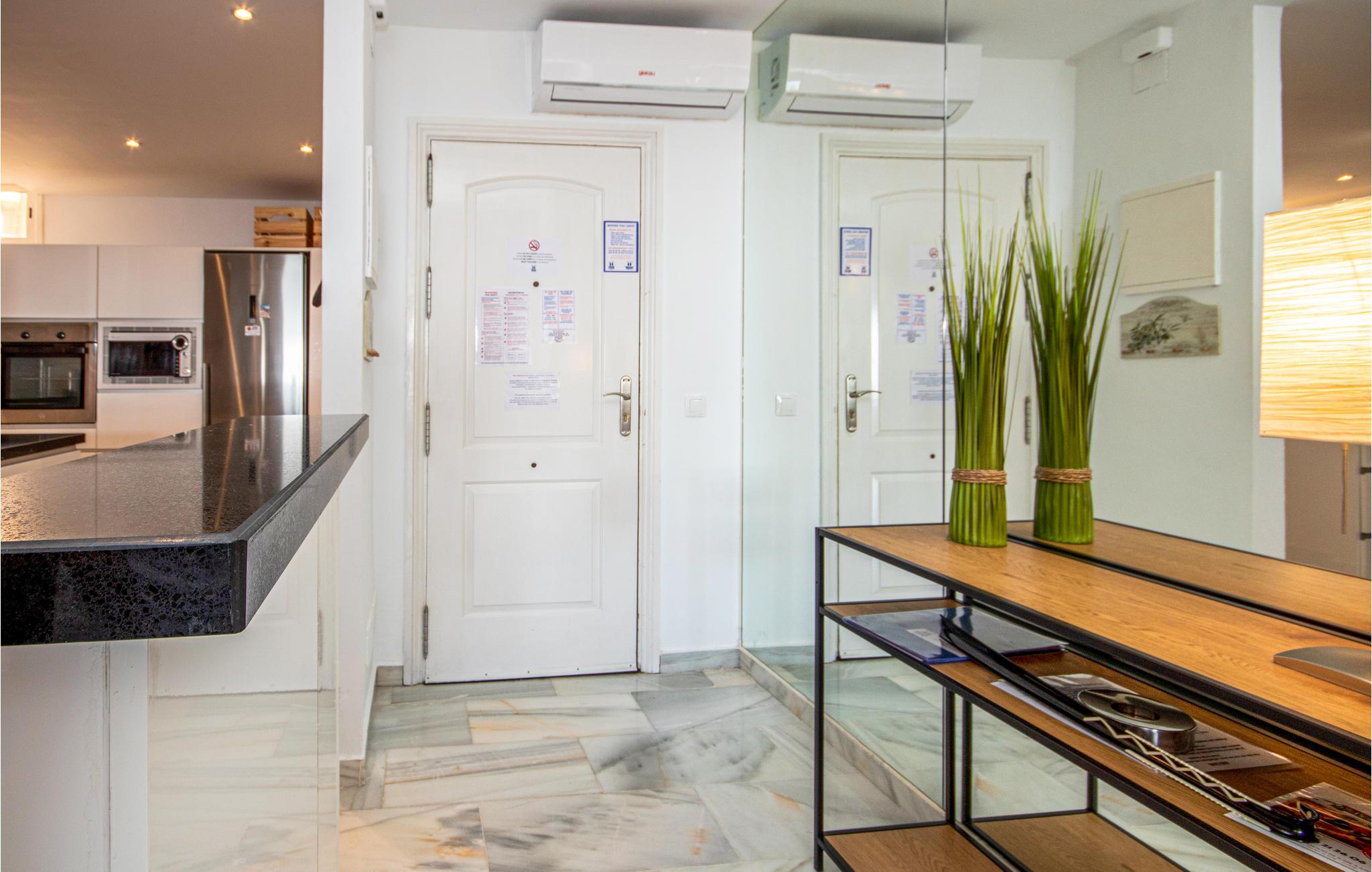 Den renoverte, romslige leiligheten ligger i 2. etasje med tilgang til heis. Innkvarteringen er arrangert over en etasje og består av en veldig romslig stue / spisestue med åpen planløsning, stort, moderne og fullt utstyrt kjøkken med vaskerom og vaskemaskin. Leiligheten er innredet til en meget høy standard overalt og har varm og kald luftkondisjonering i stuen og alle soverom. Det er også fiberoptisk wifi og en digital boks som sender internasjonale kanaler på TV-en. Andre fasiliteter inkluderer en Blueray DVD-spiller og en radio.