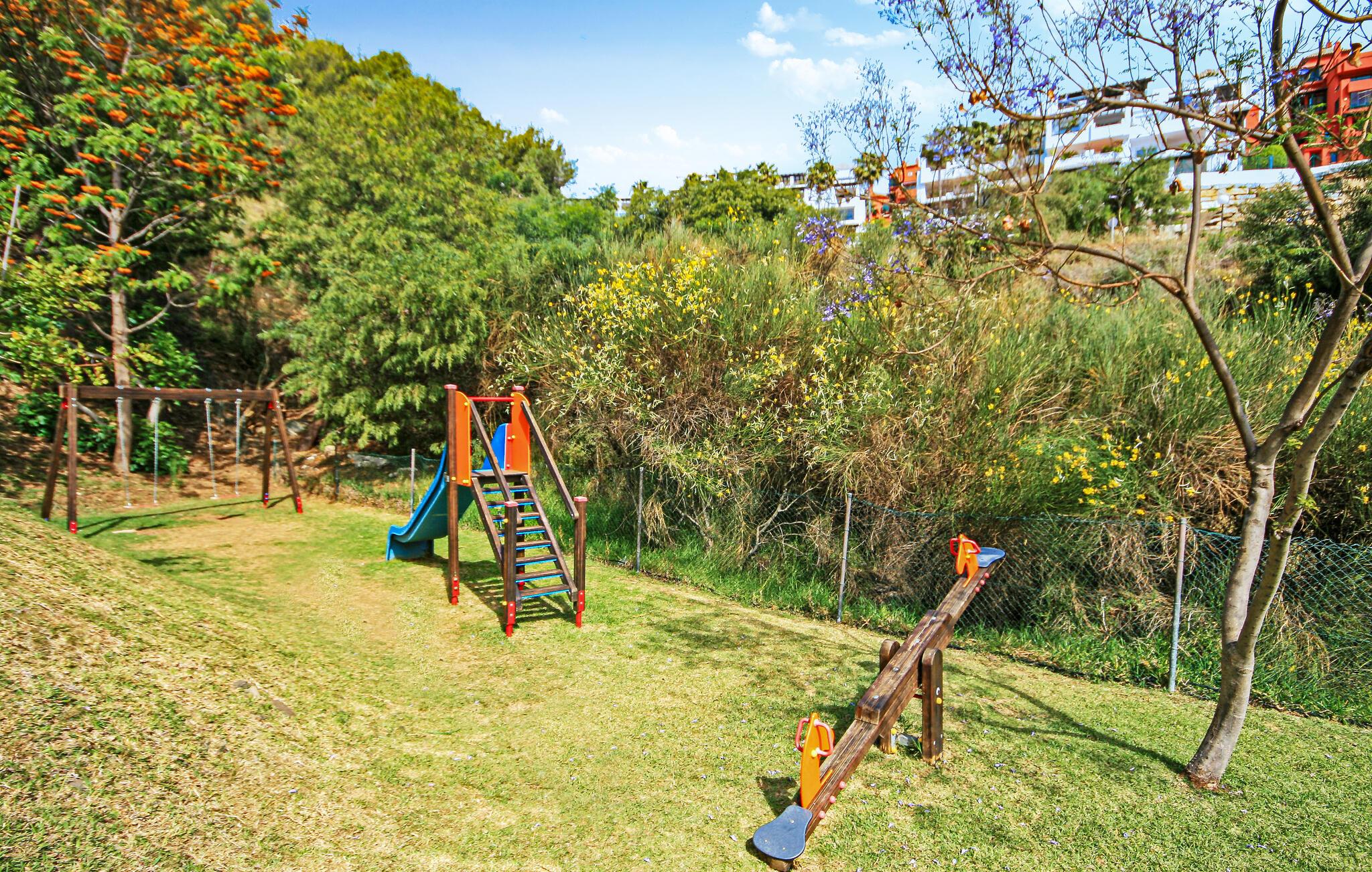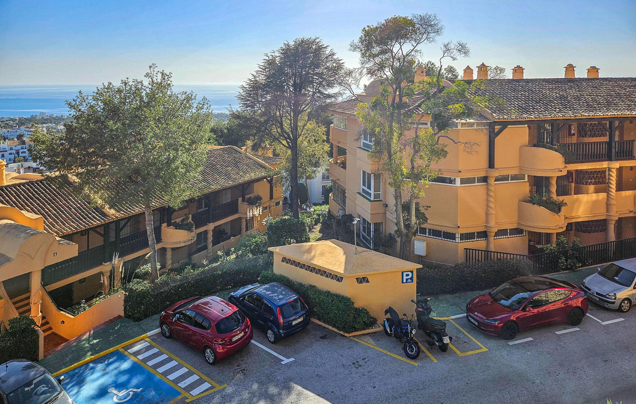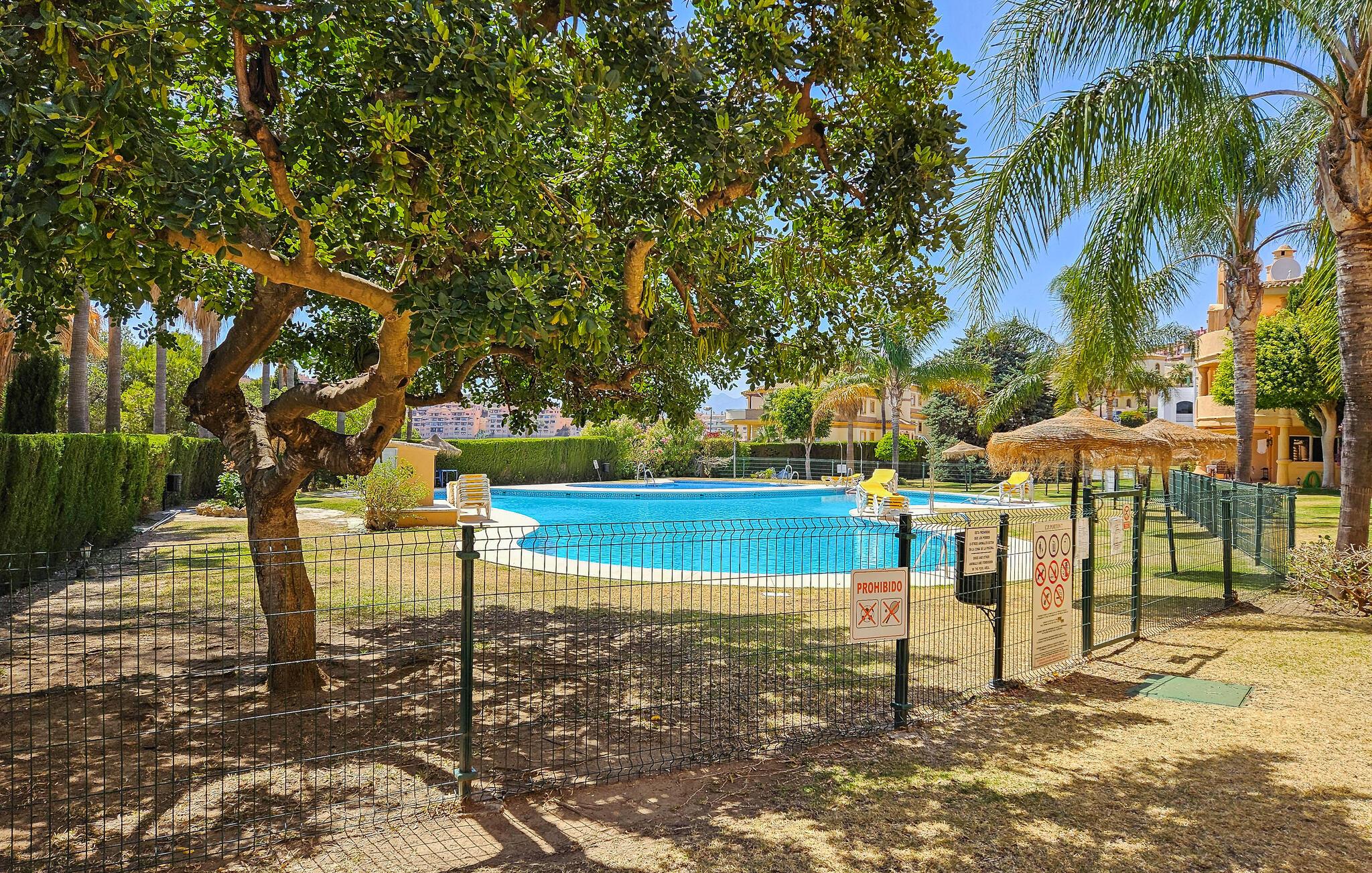 Denne luksuriøse og solrike ferieleiligheten med 3 soverom ligger i 'El Portón'-komplekset i Sitio de Calahonda og tilbyr fantastisk utsikt fra stuen og hovedsoverommet over det omkringliggende området til Middelhavet. Komplekset har omfattende velstelte hager og 2 store bassengområder (hvorav ett er uten badevakt og er åpent til slutten av oktober) samt et barnebasseng og lekeområde. Det tilbyr også utendørs parkering innenfor komplekset. Restauranter er innen gangavstand, så vel som med bil.