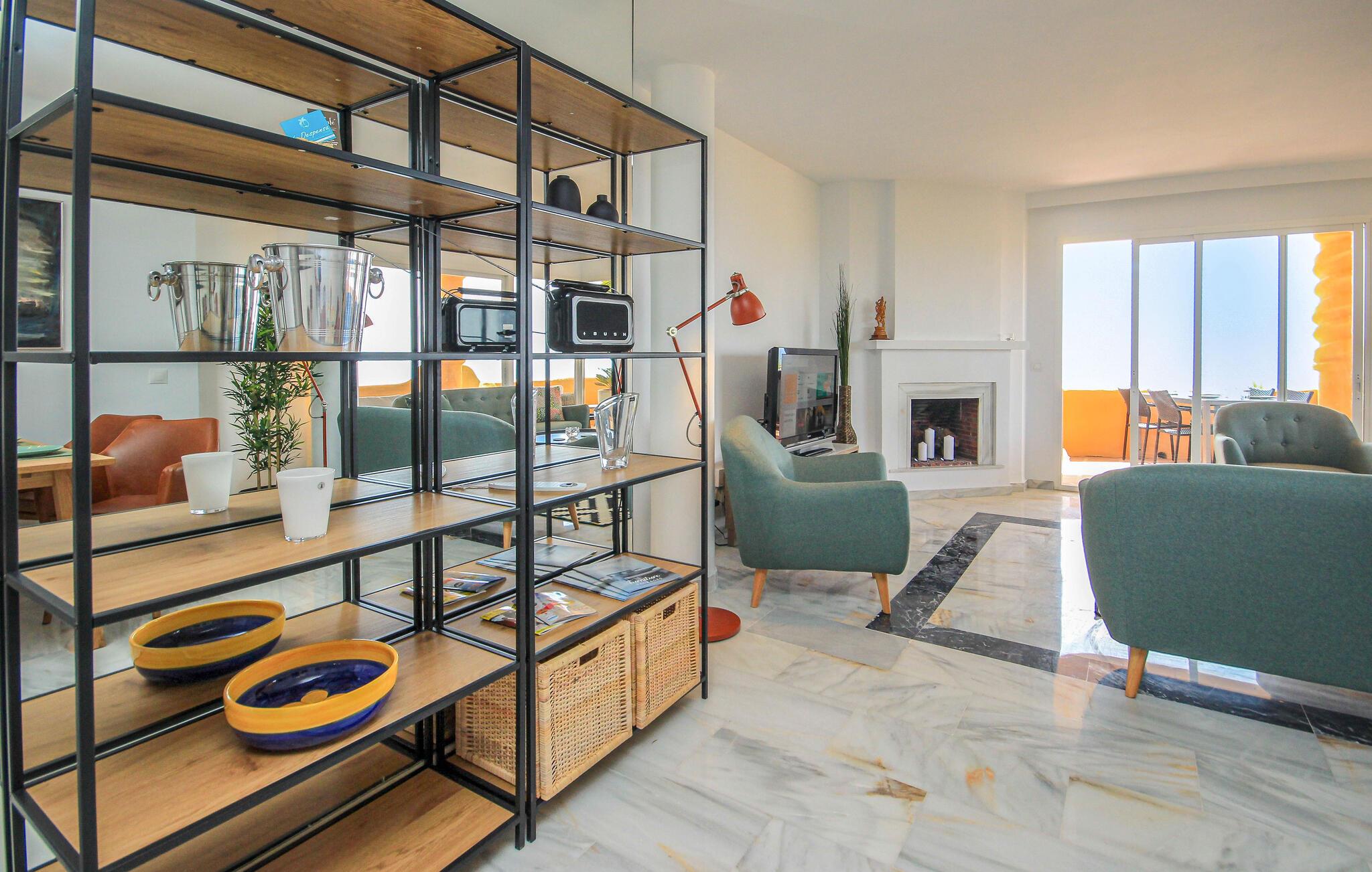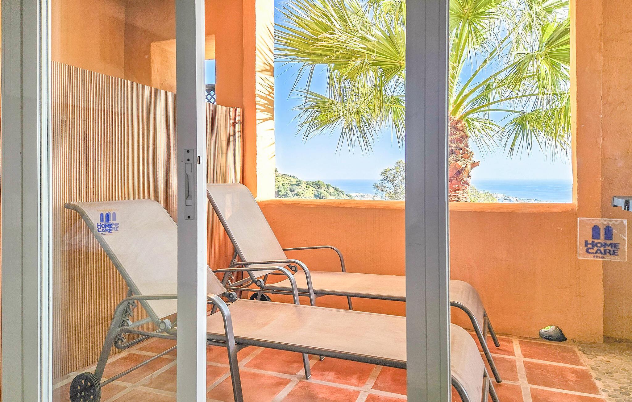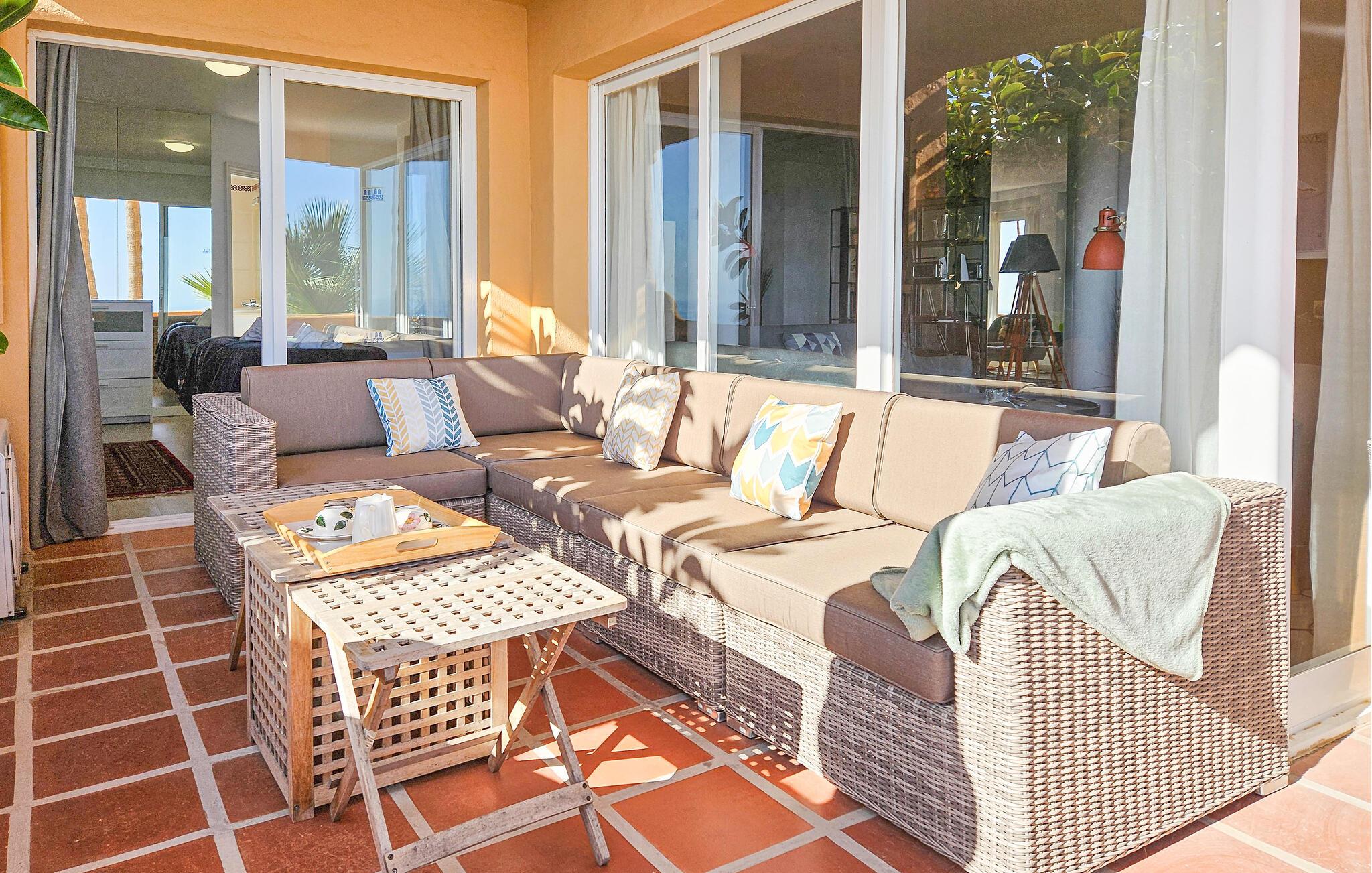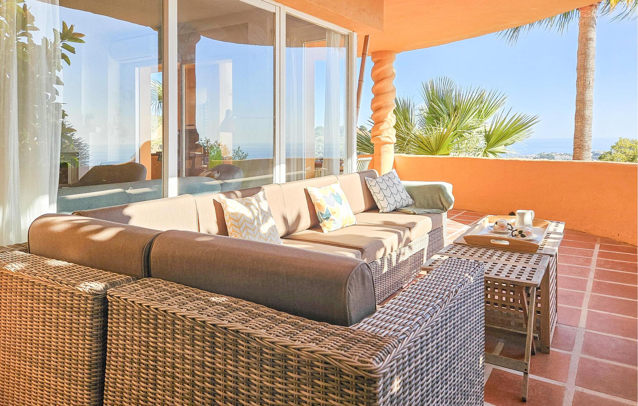 Salongen fører ut til en vakker terrasse med spektakulær havutsikt. Terrassen er utstyrt med spiseplass, en stor sofa, 2 solsenger og en gassgrill.