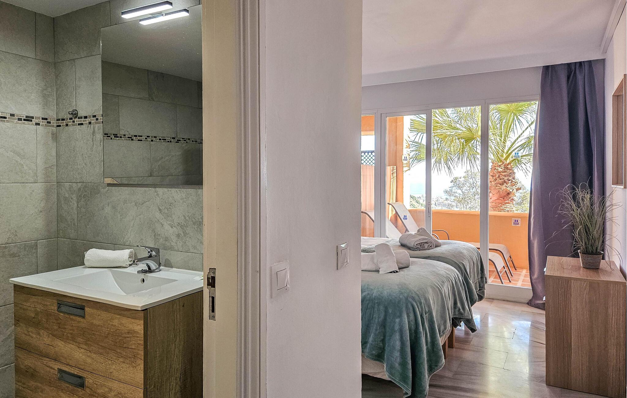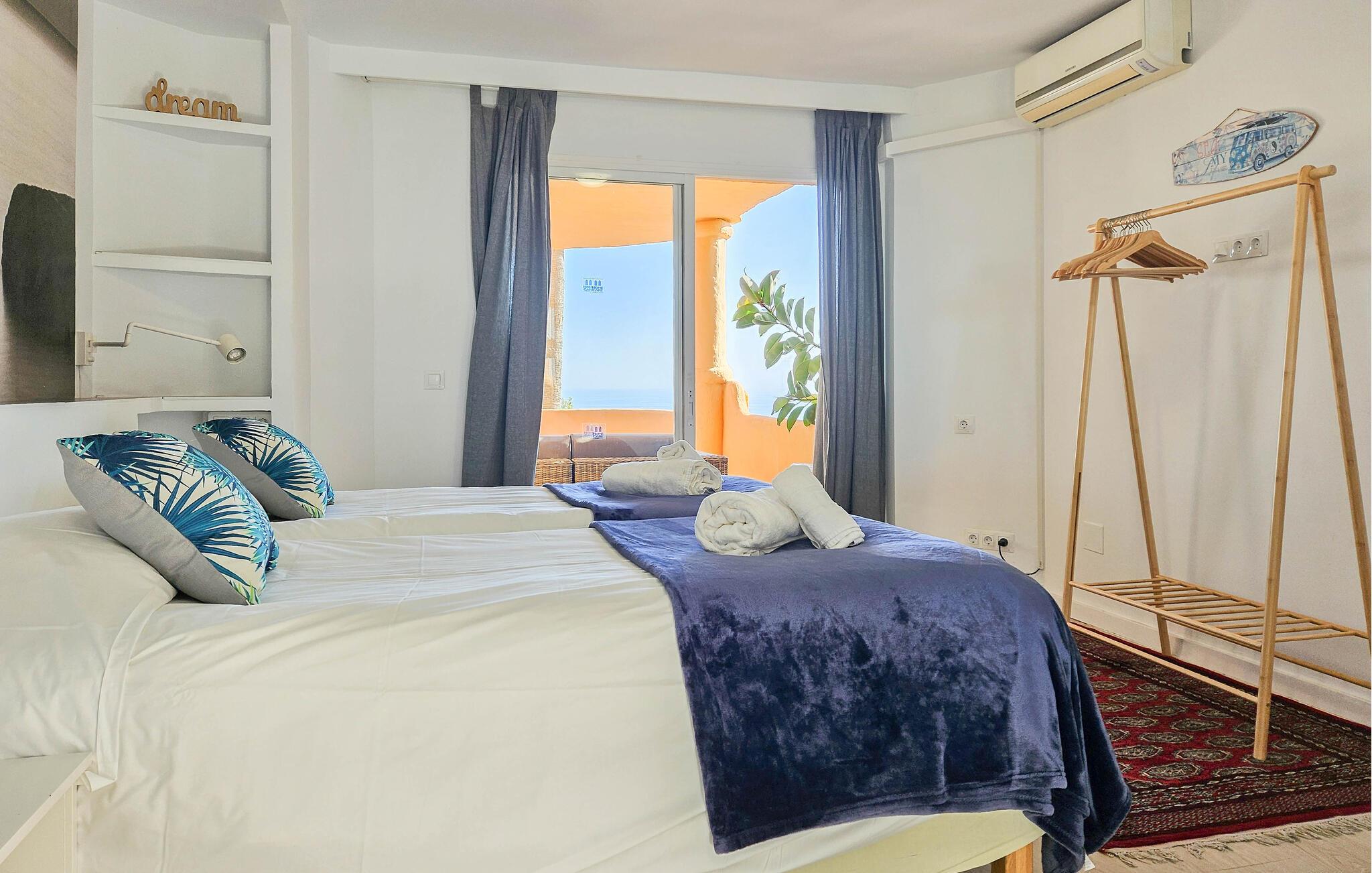 Alle soverommene er innredet med 2 enkeltsenger som enten kan brukes som enkeltsenger eller skyves sammen for å danne en king size-seng. Hovedsoverommet har et stort bad med et rundt badekar med takdusj og vinduer med naturlig lys og spektakulær utsikt. Ett gjestesoverom har også eget dusjrom, og det tredje soverommet bruker gjestedusjrommet.
