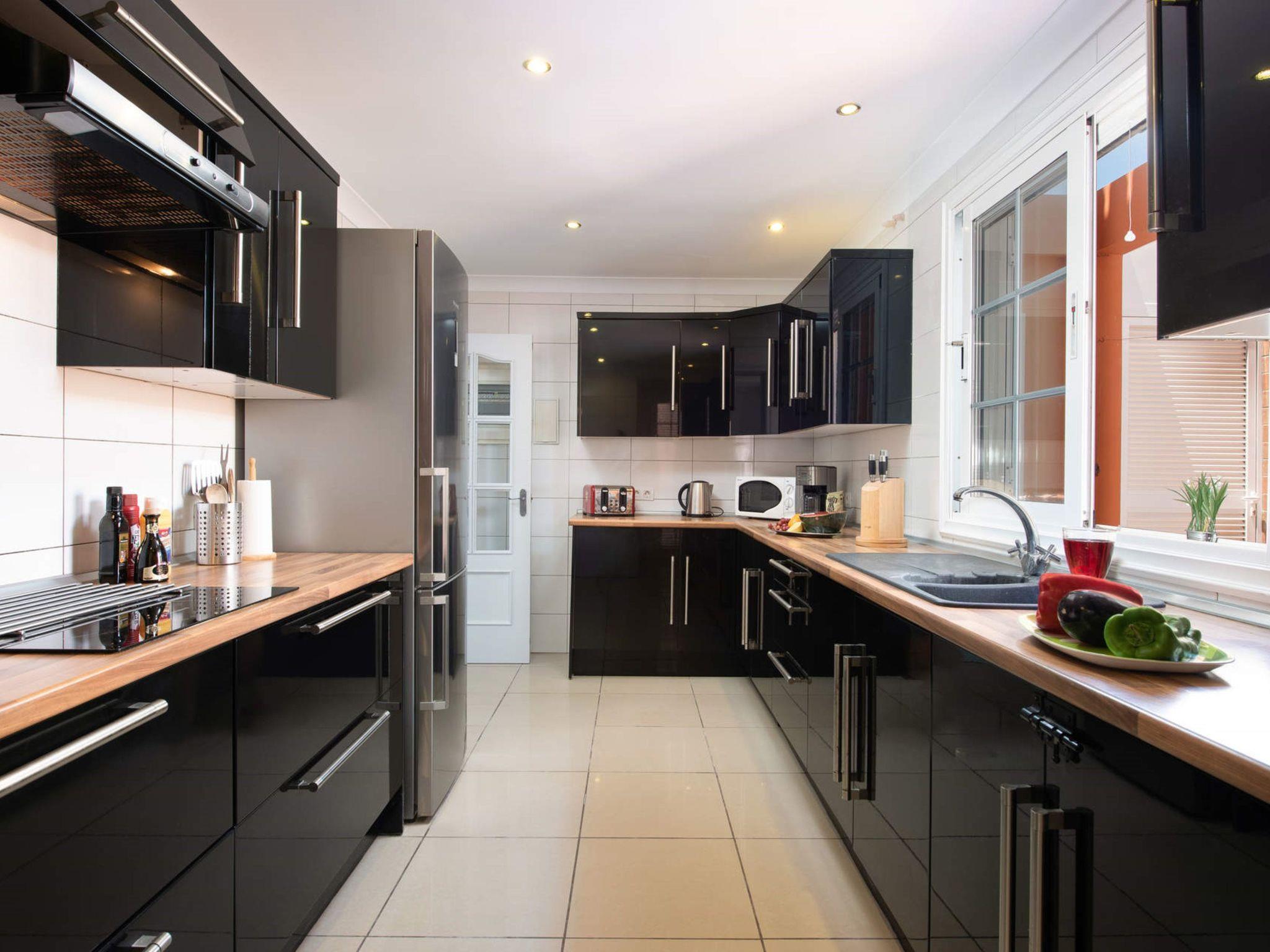 On the ground floor is the spacious living room with flat screen TV (with international TV programmes including BBC and ITV), a conservatory with access to the outside area, a dining room with access to the terrace with views of the pool, a guest toilet, a bedroom with a queen-size bed and en-suite bathroom, as well as the fully equipped, separate kitchen.