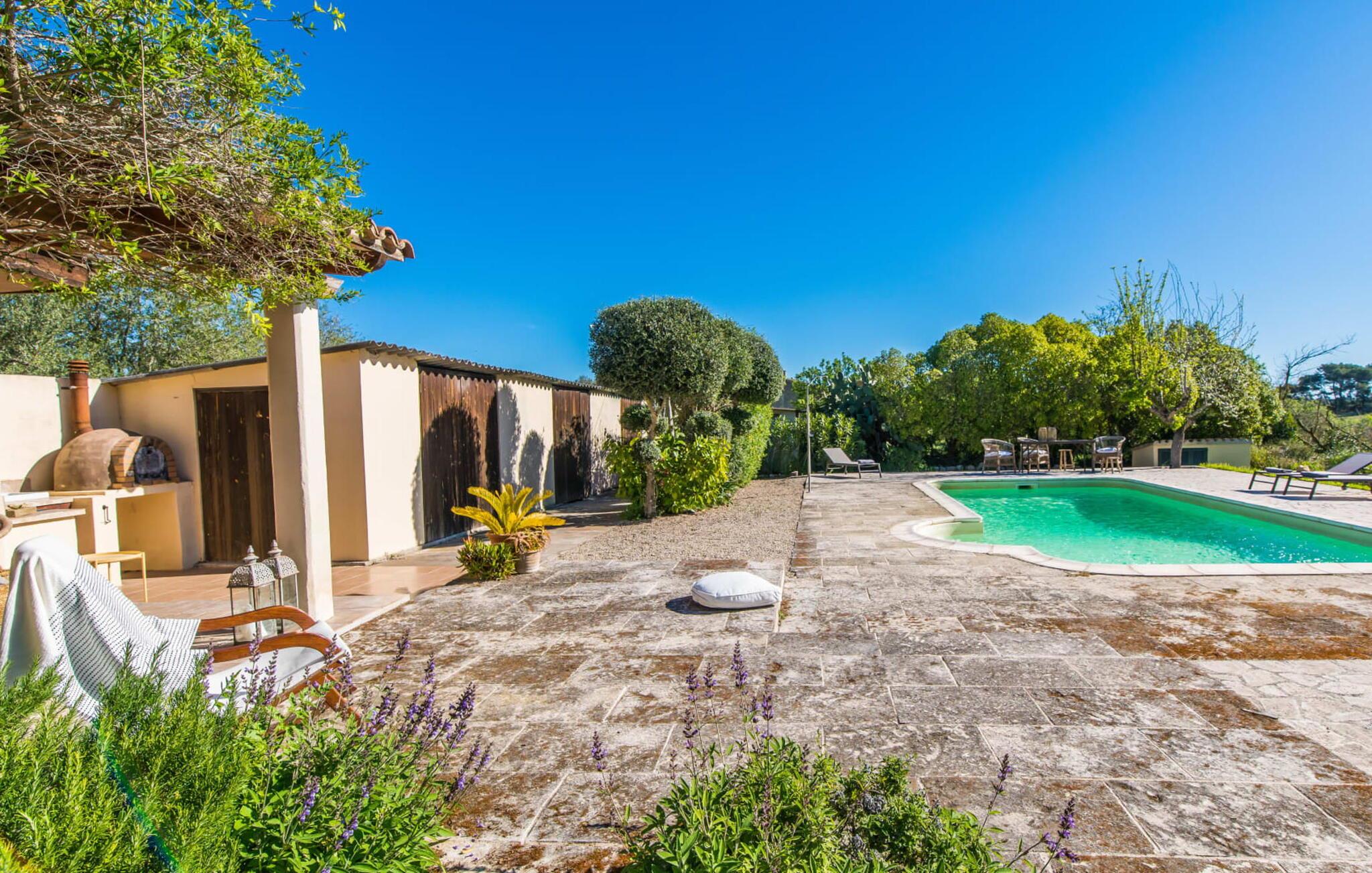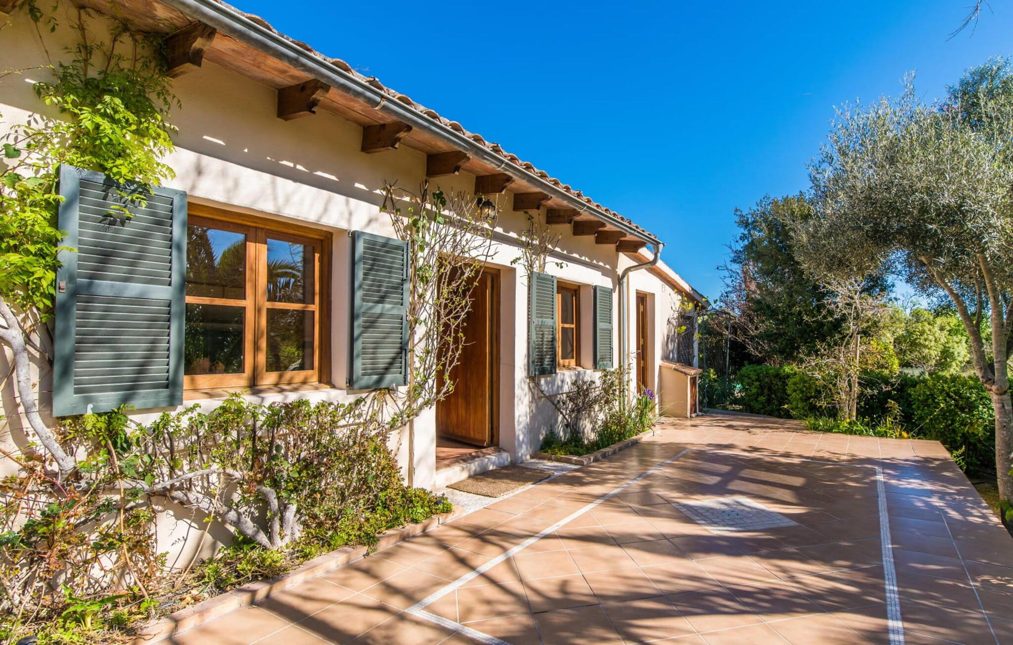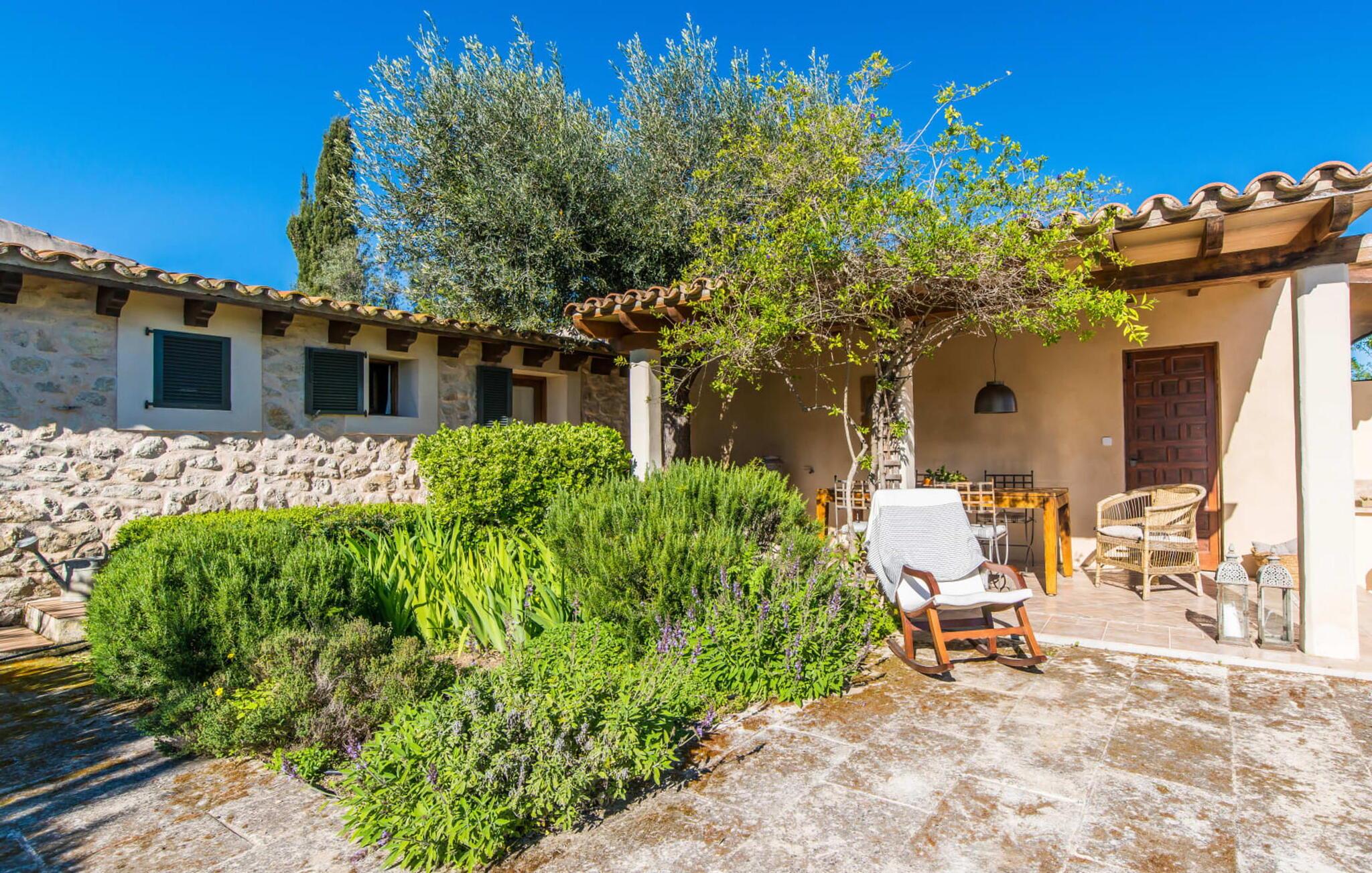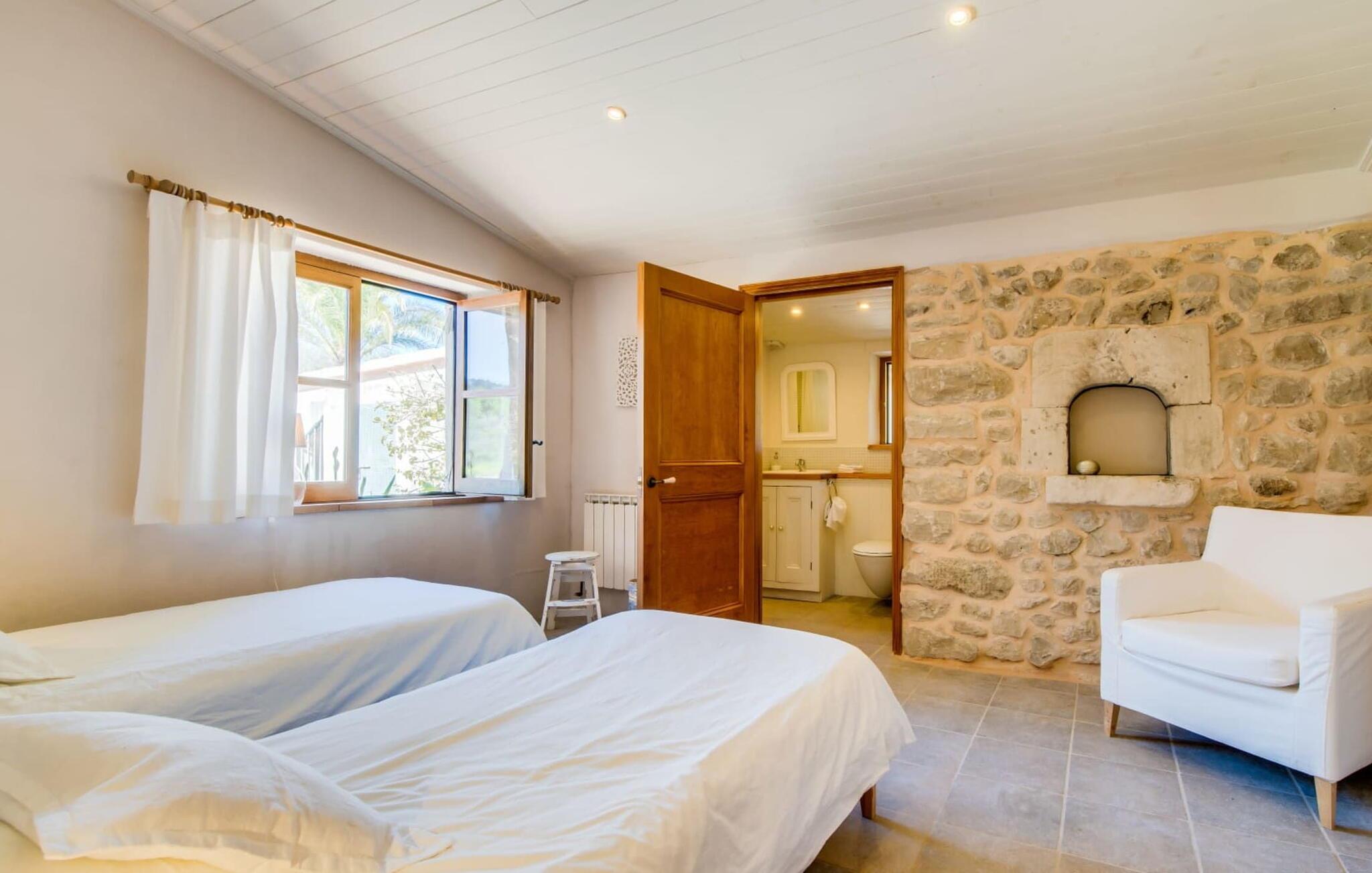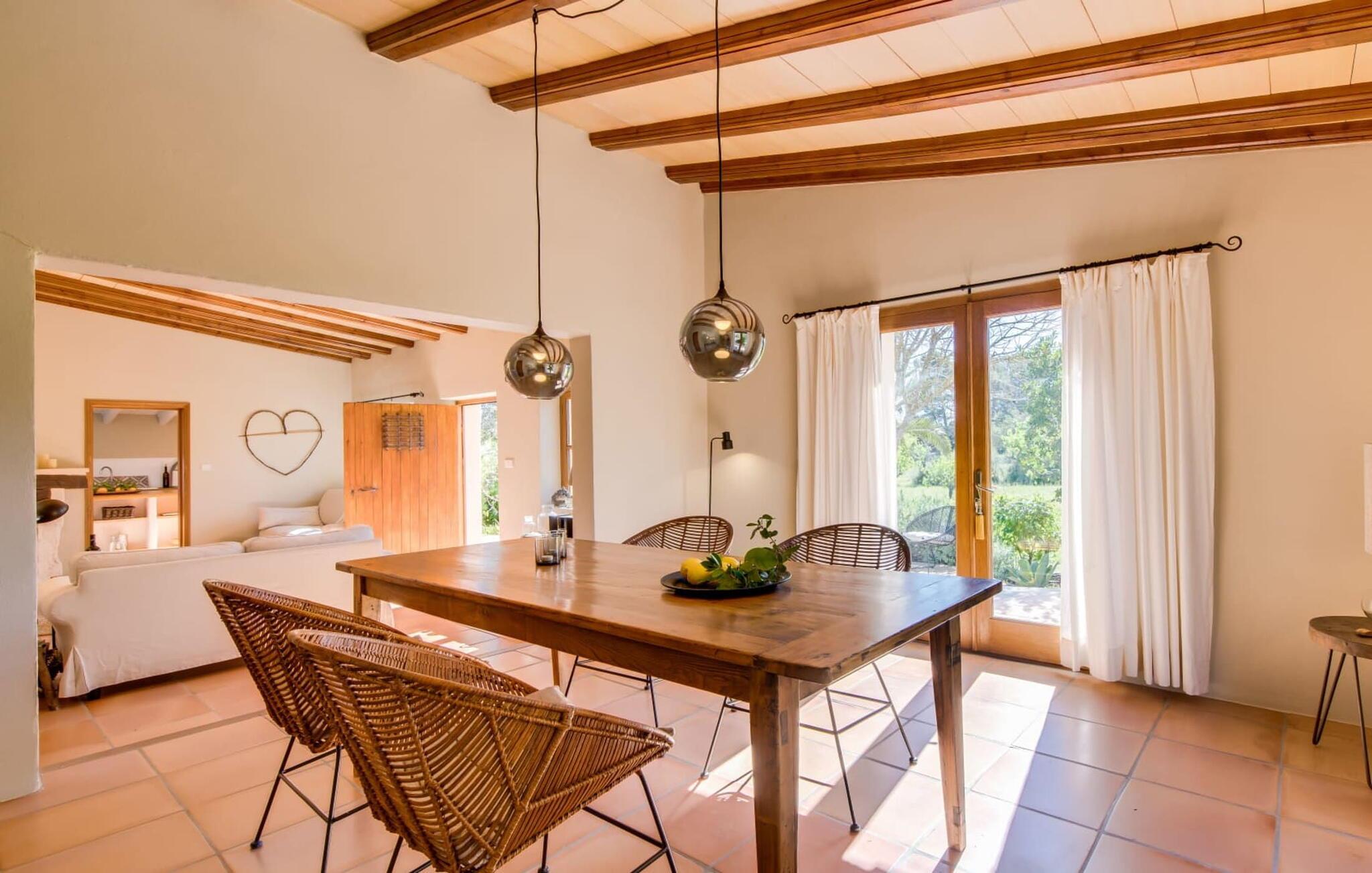 Med en rolig og tilbaketrukket beliggenhet, omgitt av frodige grøntområder og uberørt natur, finner du et fantastisk feriehus som du umiddelbart vil forelske deg i. Hvis du er ute etter en autentisk mallorcinsk atmosfære, har du kommet til rett sted, ettersom eiendommen er en nennsomt renovert bygning fra 1850. Dette moderne feriehuset ble opprinnelig brukt til landbruksformål og har en fortryllende og romslig hage. Her venter bare én ting: ren avslapning. Spaser gjennom hagen og nyt duften av sitroner i luften, smak på en av de saftige olivenene eller fikenene som henger i trærne, og trekk pusten dypt: Det er ferietid! Når middagsvarmen kommer, kan du kjøle deg ned i det private bassenget. Etterpå er det bare å slappe av med en god bok på en av de komfortable solsengene under parasollen. Om kvelden inviterer grillen deg til å tilbringe dagen utendørs. Når du kommer inn i huset via en av terrassene, vil du umiddelbart føle deg hjemme takket være sjarmen og autentisiteten som gjennomsyrer hvert eneste rom. Varme terrakottagulv, gyllenbrunt iroko-treverk, eksponert murverk laget av bruddstein: Dette huset har stil. Under renoveringen ble det lagt vekt på å kun bruke utsøkte møbler og innredninger i huset. Stilen er puristisk, noe som passer perfekt til kombinasjonen av hvite og kremfargede toner og det honningfargede treverket som går igjen i hele huset. Du får umiddelbart lyst til å stryke over bordplaten på det store spisebordet i vakkert treverk for å kjenne på det. I den koselige stuen er det en stor åpen peis for koselige kvelder i kjøligere temperaturer. Det er også en TV med tysk satellittmottak. Kjøkkenet er veldig koselig takket være det svakt skrånende taket. Det har oppvaskmaskin, vannkoker og ulike kaffemaskiner og alt et selvhusholdningshjerte kan begjære. Soverommene er også innredet i duse pastellfarger, og alle har eget bad. Fincaen ligger midt på øya, bare 30 km fra hovedstaden Palma. Så sentralt, men likevel med en drømmeaktig tilbaketrukket beliggenhet, tilbyr den et bredt spekter av fritidsaktiviteter utenfor den vakre eiendommen. Særlig vandringsentusiaster vil komme til sin rett, for det lille ferieparadiset ligger nedenfor det markante fjellet Puig de Randa, som hever seg over det mallorcinske lavlandet og minner litt om Table Mountain i Sør-Afrika. På vei opp har du mulighet til å besøke tre klostre som ligger i forskjellige høyder. Vel oppe på toppen belønnes du med en spektakulær utsikt helt til Tramuntana-fjellene. Strender som Caló de Sant Antoni eller Es Trenc kan lett nås med leiebil på mindre enn 30 km. Den paradisiske Villa Calmita ligger midt i et spektakulært landskap i nærheten av det markante fjellet Puig de Randa. Den lille byen Montuiri, som ligger ca. 6,4 km unna, har alt du trenger, med bakerier, supermarkeder og et fantastisk marked som tilbyr et bredt utvalg av ferske, lokale råvarer. De populære strendene Platja de Palma og Platja de Sa Rapita ligger rundt 19 km unna, men flere andre vakre bukter, som Es Trenc, er også lett tilgjengelige med leiebil.