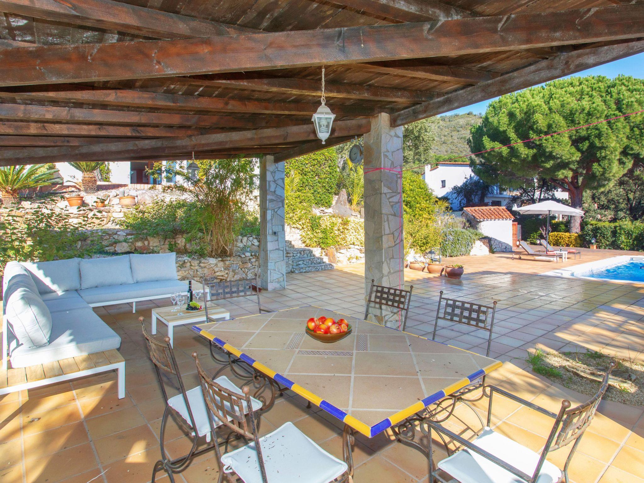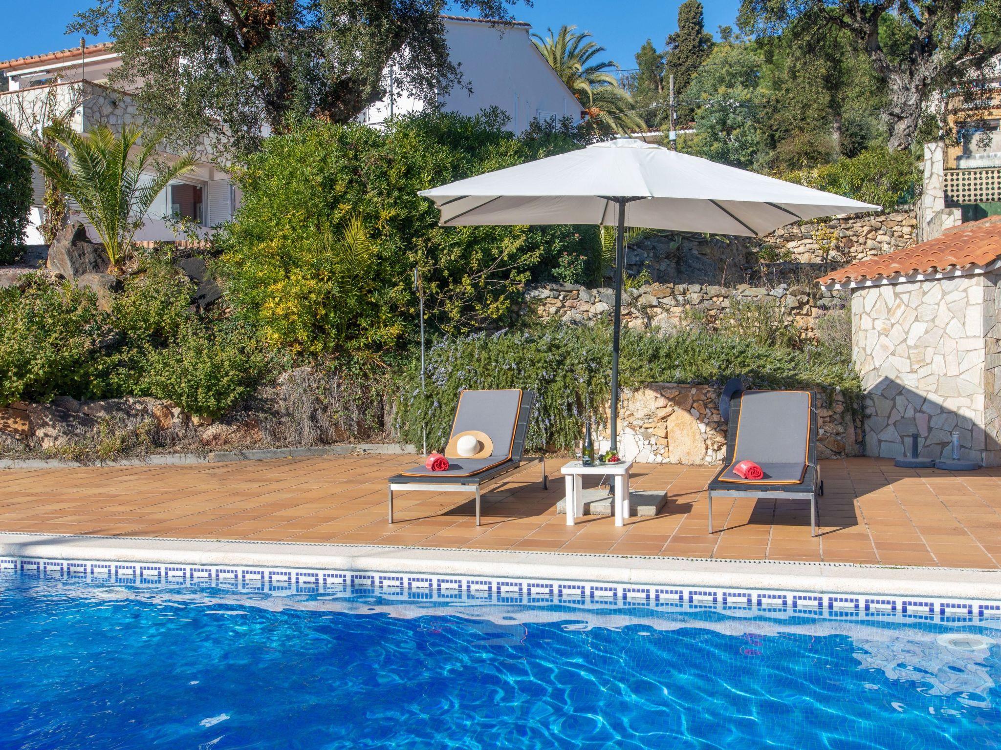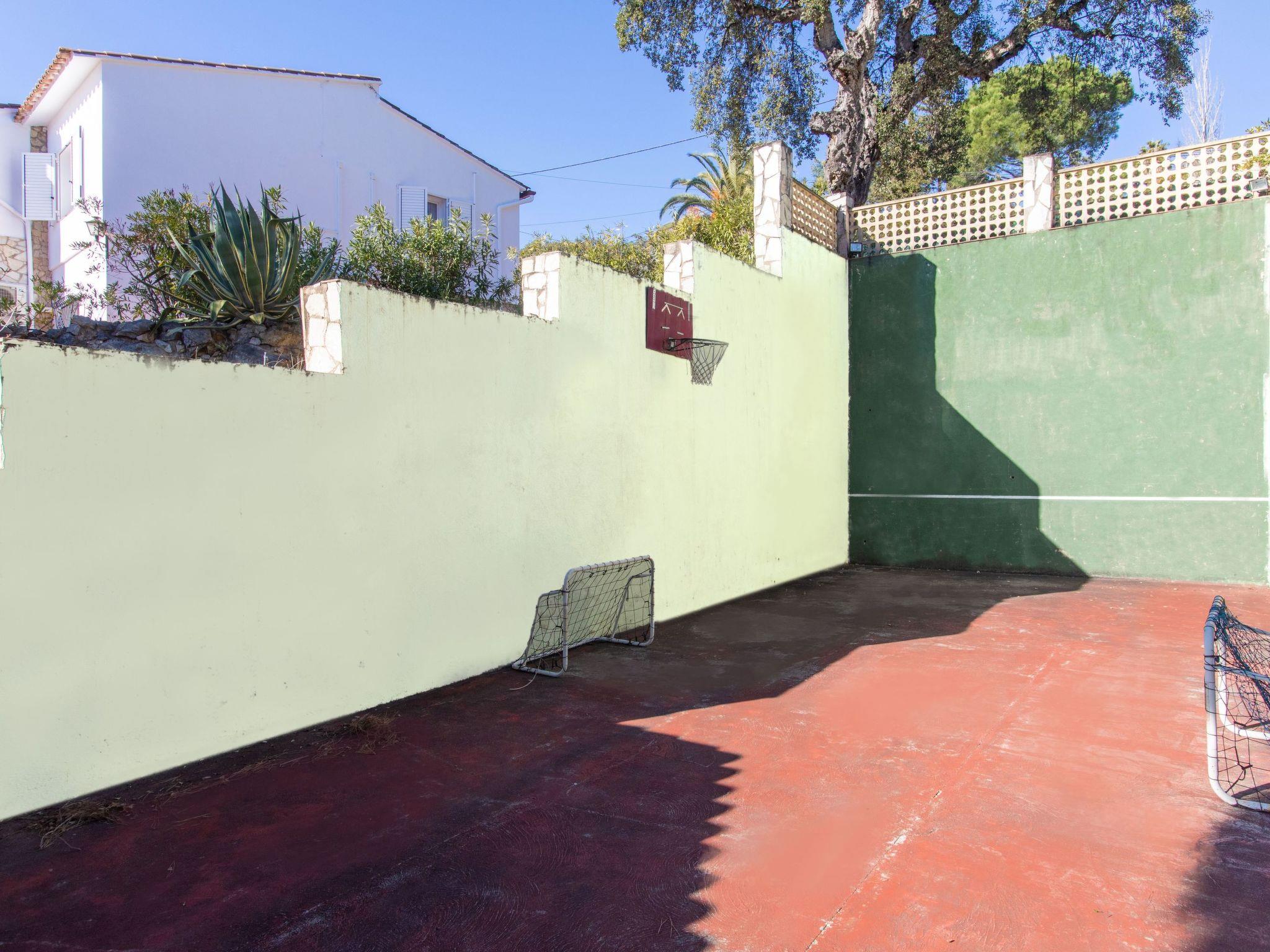 Urb. Mas Ambros 2 km from Calonge: Cosy house "El Suro". In a quiet, sunny position, 5 km from the sea, in a cul-de-sac. Private: large garden (fenced), swimming pool angular (10 x 5 m, seasonal availability: 01.May. - 30.Oct.) with internal staircase. Outdoor shower, table tennis, basketball, patio, arbour, pergola, garden furniture, barbecue, barbecue house. In the house: solarium. Parking (for 5 cars) at the house on the premises. Supermarket 2 km, restaurant 1 km, bus stop 1 km, sandy beach "Sant Antoni de Calonge" 5 km. Sports harbour 7 km, golf course (18 hole) 7 km, riding stable 12 km. Please note: car recommended. The owner does not accept any youth groups. Neighbourhood highly sensitive to noise. Quietness and good behaviour expected.