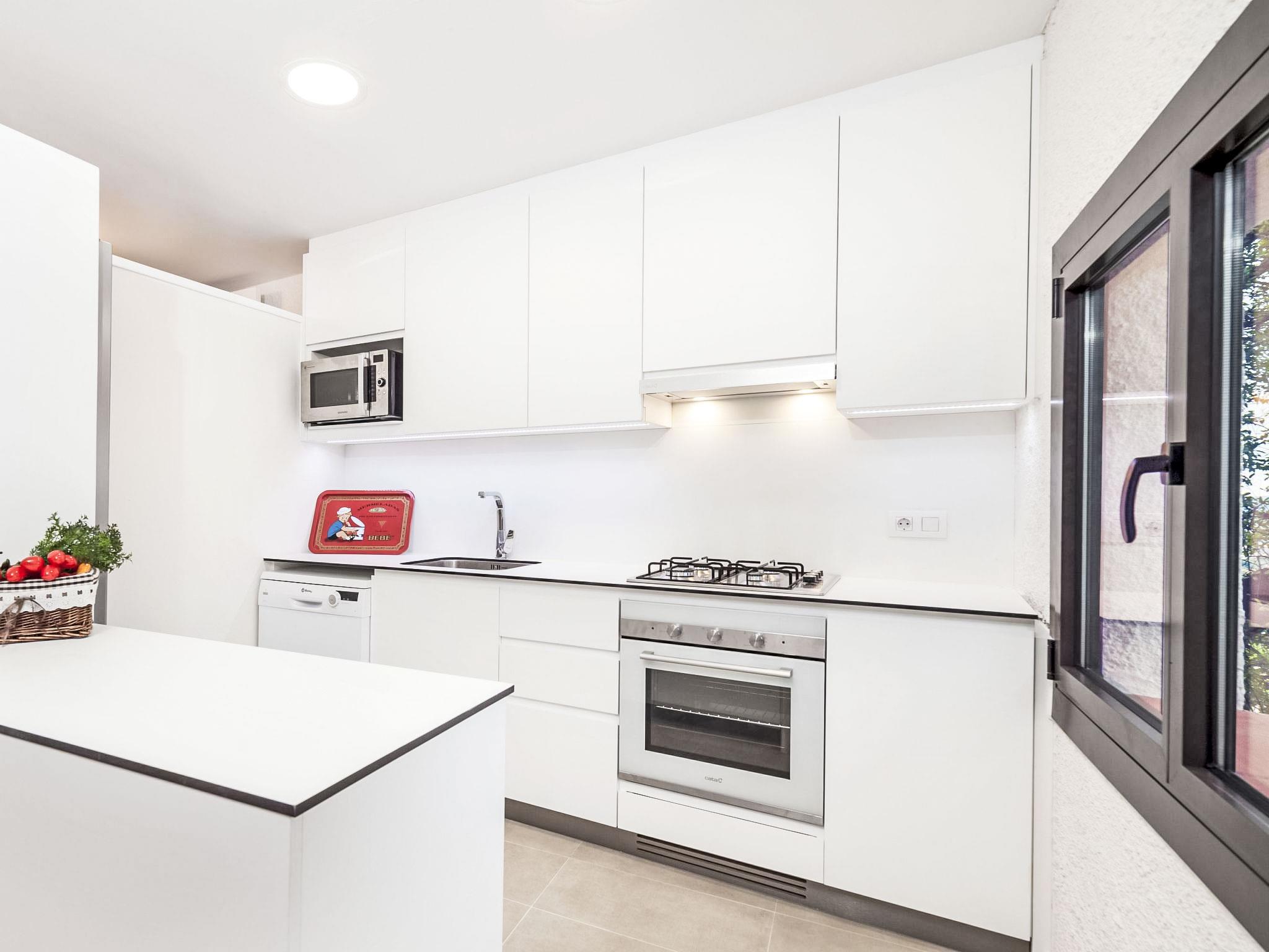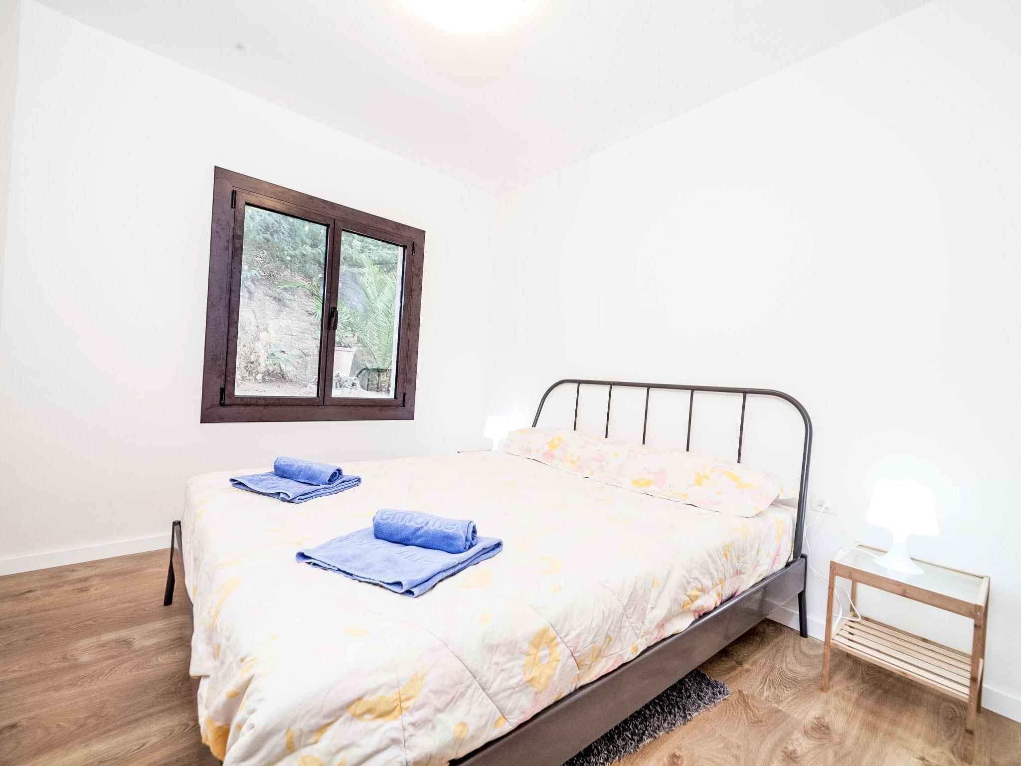 "Paris", 5-room house 95 m2 on 2 levels. Practical furnishings: living/dining room with digital TV and fan. Exit to the patio, to the swimming pool. Kitchen (4 hot plates, dishwasher, toaster, kettle, microwave, freezer, electric coffee machine). 2 showers/WC. No heating option. Upper floor: 2 rooms, each room with 2 beds (80 cm, length 190 cm), fan. 1 room with 1 bed (80 cm, length 190 cm), fan with 1 french bed (150 cm, length 190 cm), fan. Deck chairs (6). Distant view of the sea, the countryside and the resort. Facilities: washing machine, children's high chair, baby cot, hair dryer. Internet (WiFi, free). Parking space n en la misma calle. Please note: non-smoking house. TV only ES. HUTG-028018 // Reg. Nr.: ESFCTU00001701500020675800000000000000000HUTG-0280180
