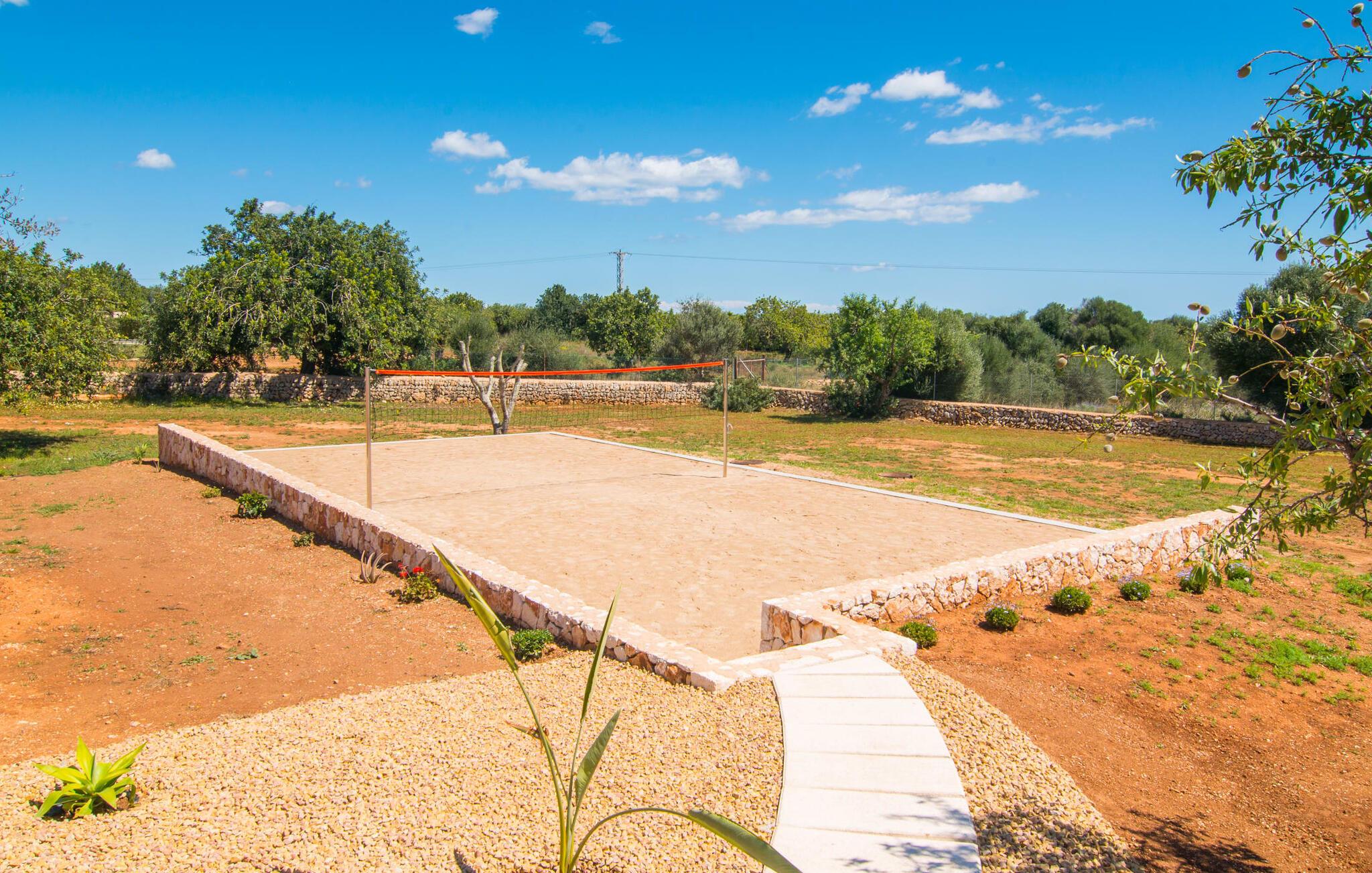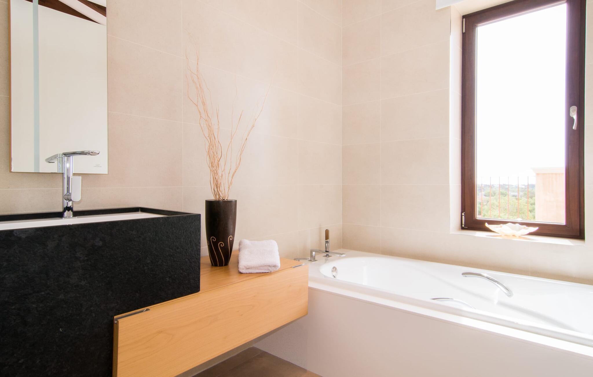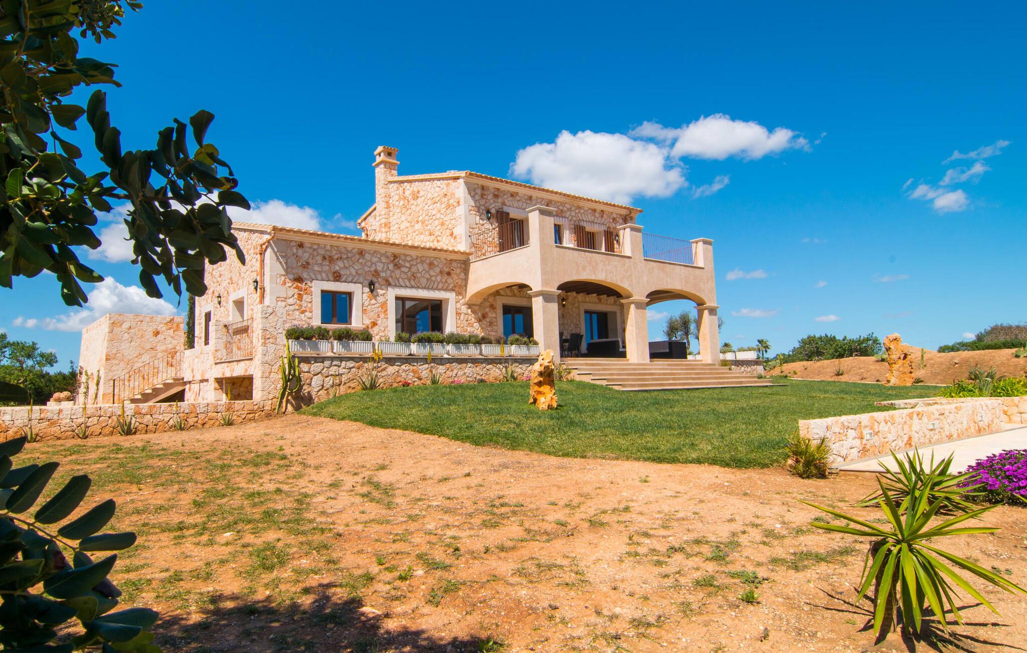 Den stilfulle, moderne, men likevel typisk mallorcinske villaen i autentisk bruddstein ble ferdigstilt i 2014, og henvender seg særlig til familier og feriegjester som ønsker å slappe av. Ved første øyekast blir vi møtt av en imponerende toetasjes bygning i vennlige, fargerike terrakottatoner. Men til tross for den tradisjonelle stilen med flettede buer på en utstikkende terrasse og balkongen over, ser det trente øyet raskt at dette er postmoderne arkitektur. Arkitekturen kan gjenkjennes på pannekakedesignet eller detaljer som de vertikale lyslistene. Uteområdet rundt huset er nyplantet og har ennå ikke fått utfolde sin fulle prakt. Likevel kan du allerede nå nyte utsikten over en olivenlund og de grønne omgivelsene. Under den overbygde terrassen ved huset er det en avslappet polyrattan-salong laget av mørkt flettverk med lyse puter. Denne frodige, skyggefulle terrassen har også et stort glassbord med plass til opptil 8 personer. Her kan du for eksempel ha en herlig grillfest, for det er en grill tilgjengelig. Hvis du går ned noen få trappetrinn fra terrassen over det grønne området som er dekorert med treskulpturer, kommer du til det fantastiske bassengområdet som måler 10 x 5 meter. I tillegg til solterrassen rundt og utedusjen er det spesielle med dette bassenget et annet, grunnere basseng som fører ned trappene til det 1,80 meter dype bassenget. Dette gjør det ideelt for babyer eller småbarn å plaske rundt i.