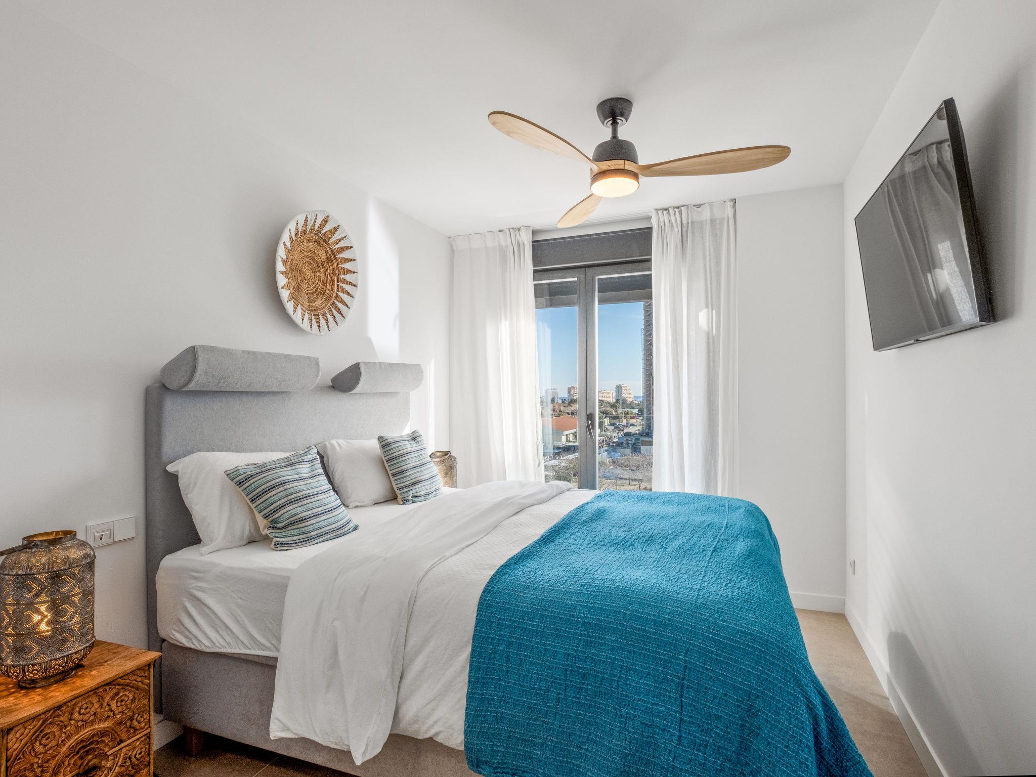 "Sunrise Tower", 3-room apartment 97 m2 on 5th floor. Spacious and bright, beautiful and modern furnishings: open living/dining room with digital TV, air conditioning and forced-air heating. Exit to the terrace. 1 room with 1 french bed (1 x 180 cm, length 200 cm), shower/WC, air conditioning, fan and forced-air heating. 1 room with 1 french bed (1 x 160 cm, length 200 cm), air conditioning and fan. Open kitchen (toaster, kettle, microwave). Bath/WC. Forced-air heating. Terrace. Terrace furniture. View of the sea and the city. Facilities: washing machine, iron, children's high chair, baby cot for up to 2 year olds, hair dryer. Internet (WiFi, free). Parking space n 36 (roofed). Please note: non-smoking house. VT-501537-A // Reg. Nr.: ESFCTU00000302900076398900000000000000000VT-501537-A4