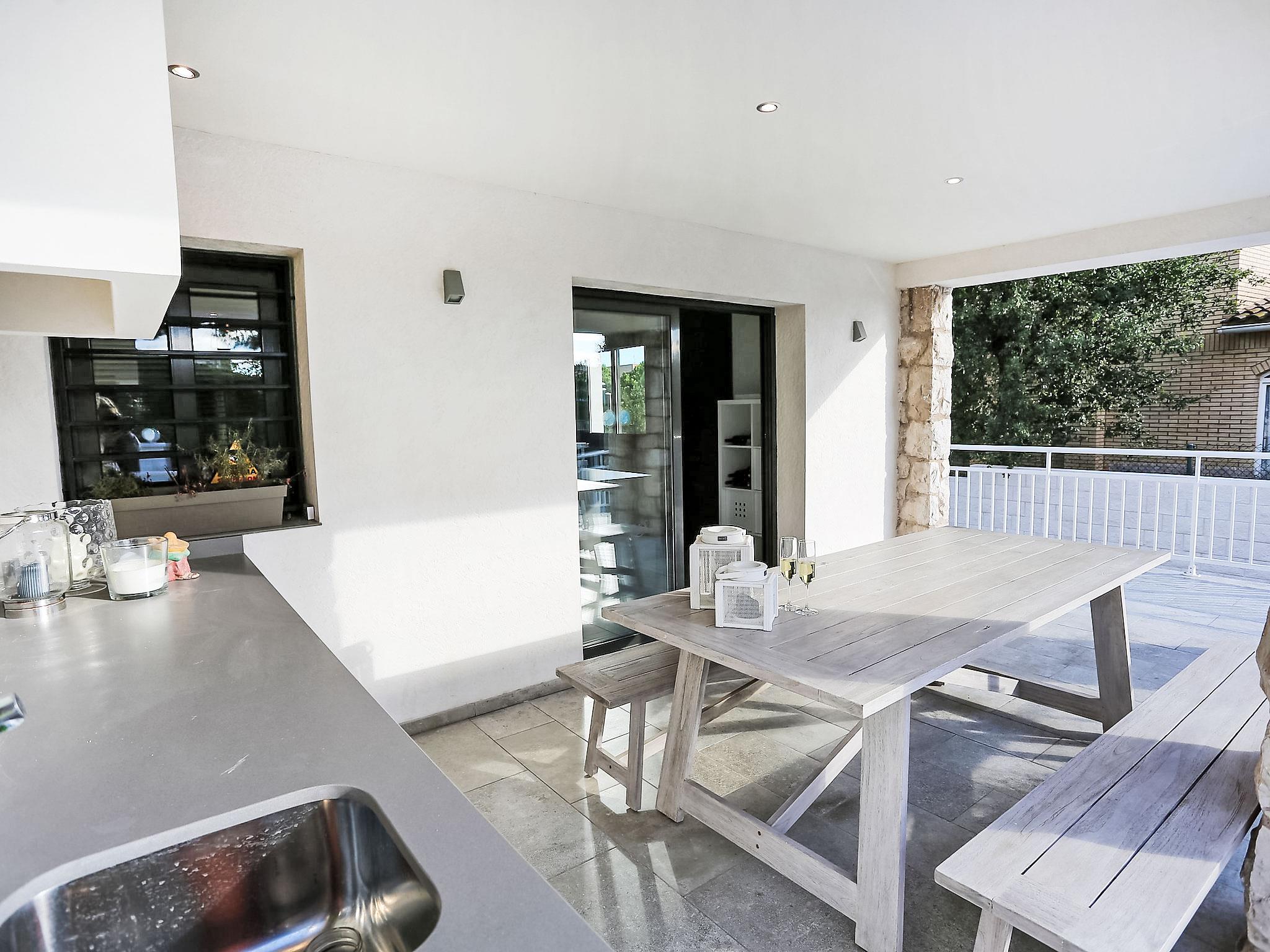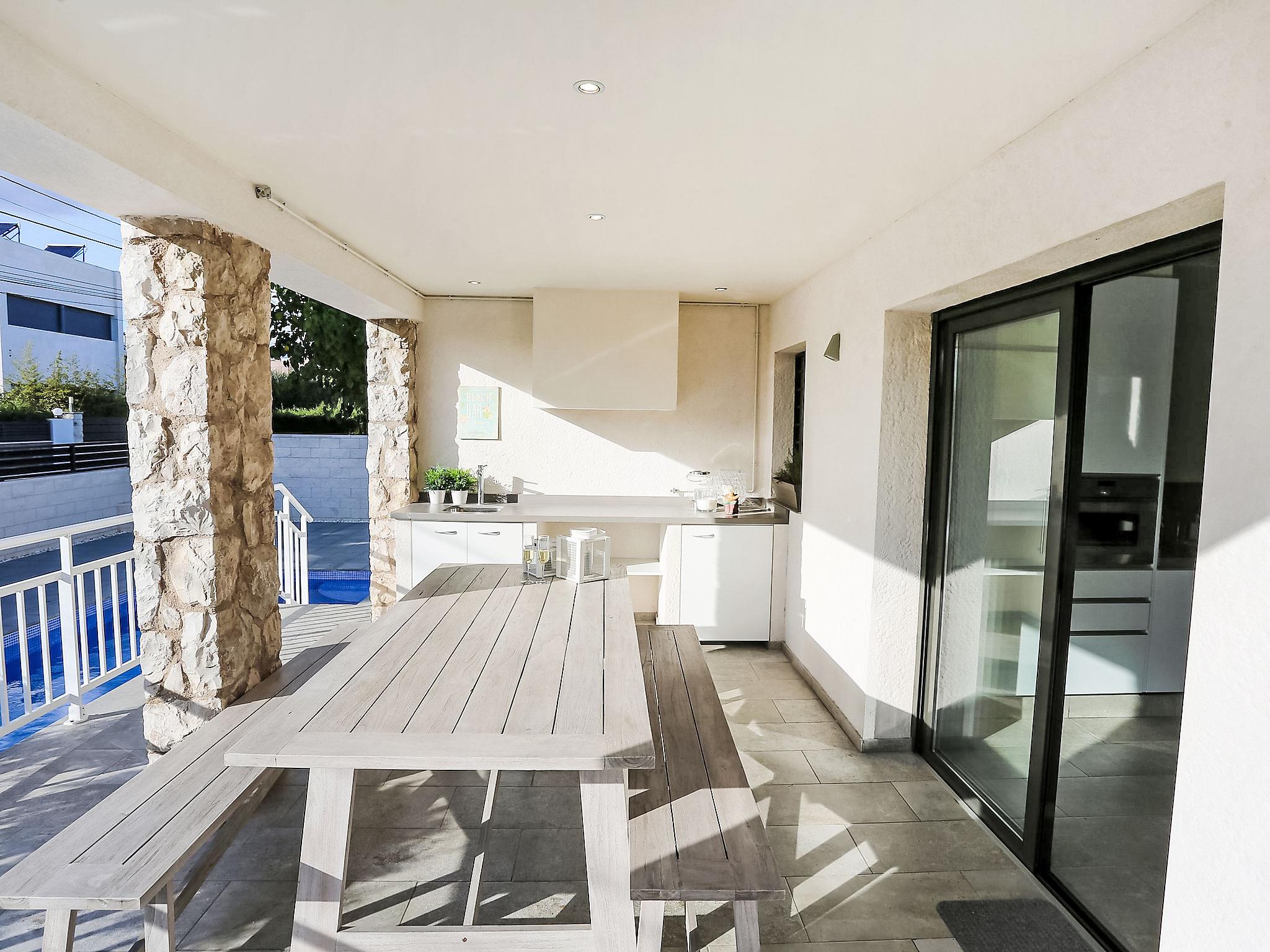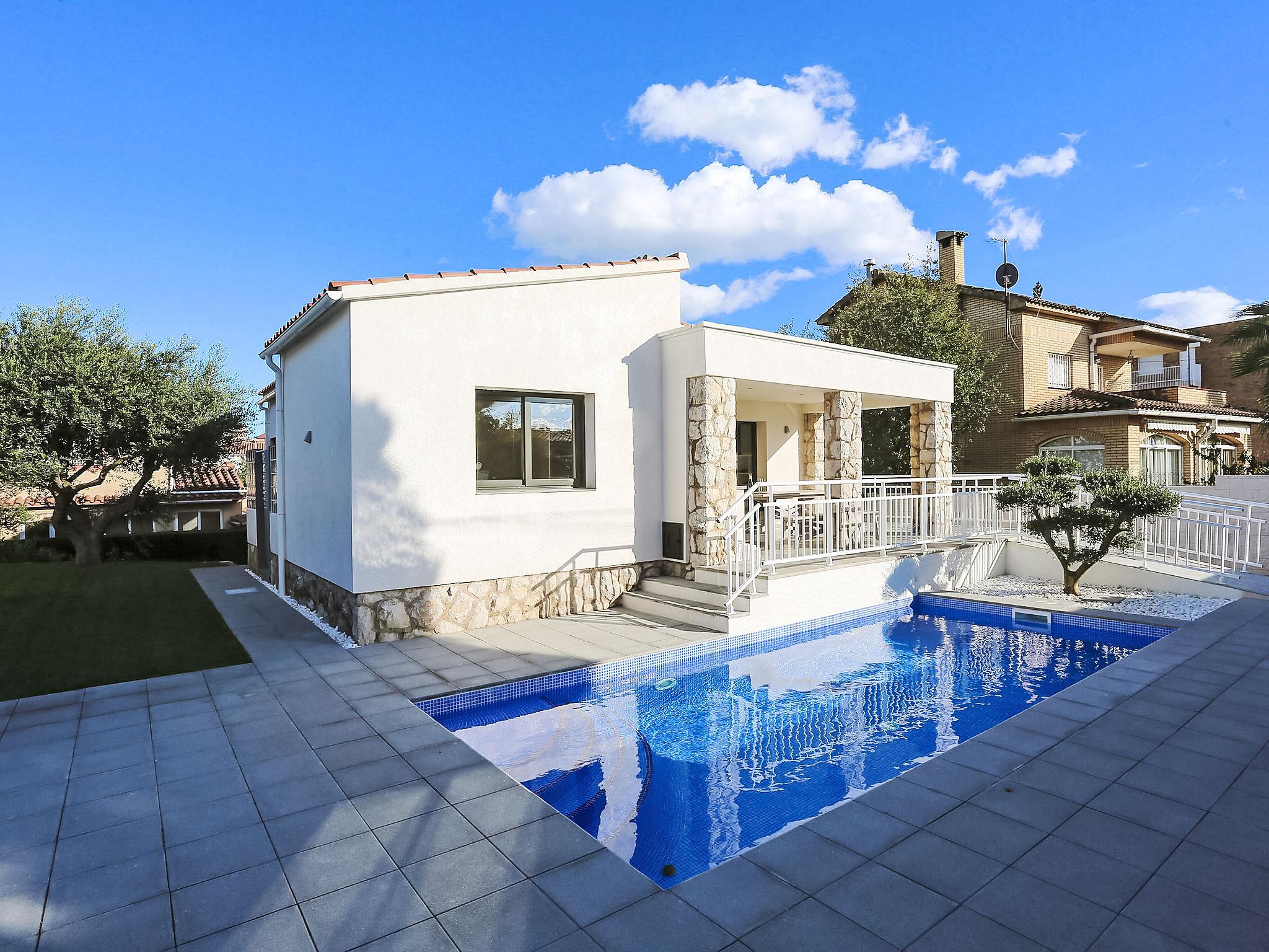 Cambrils Badia 1 km from Cambrils: Very modern, beautiful house "Gunella", detached, renovated in 2014. Outside the resort Cambrils, 300 m from the sea, 300 m from the beach. Private: property (fenced), garden with lawn, swimming pool (7 x 3 m, depth 140 - 150 cm, seasonal availability: 01.Jan. - 31.Dec.) with internal staircase. Shower/WC in the pool area, terrace, garden furniture, barbecue, pool maintenance by the owner/gardener. Parking at the house, public parking on the road. Shop 1 km, grocery 200 m, supermarket 600 m, restaurant 1 km, bus stop 400 m, railway station 3 km. Sports harbour 1 km. Nearby attractions: Port Aventura 3 km, Aquopolis 6 km. Please note: baby equipment (included). Groups of teenagers on request only.