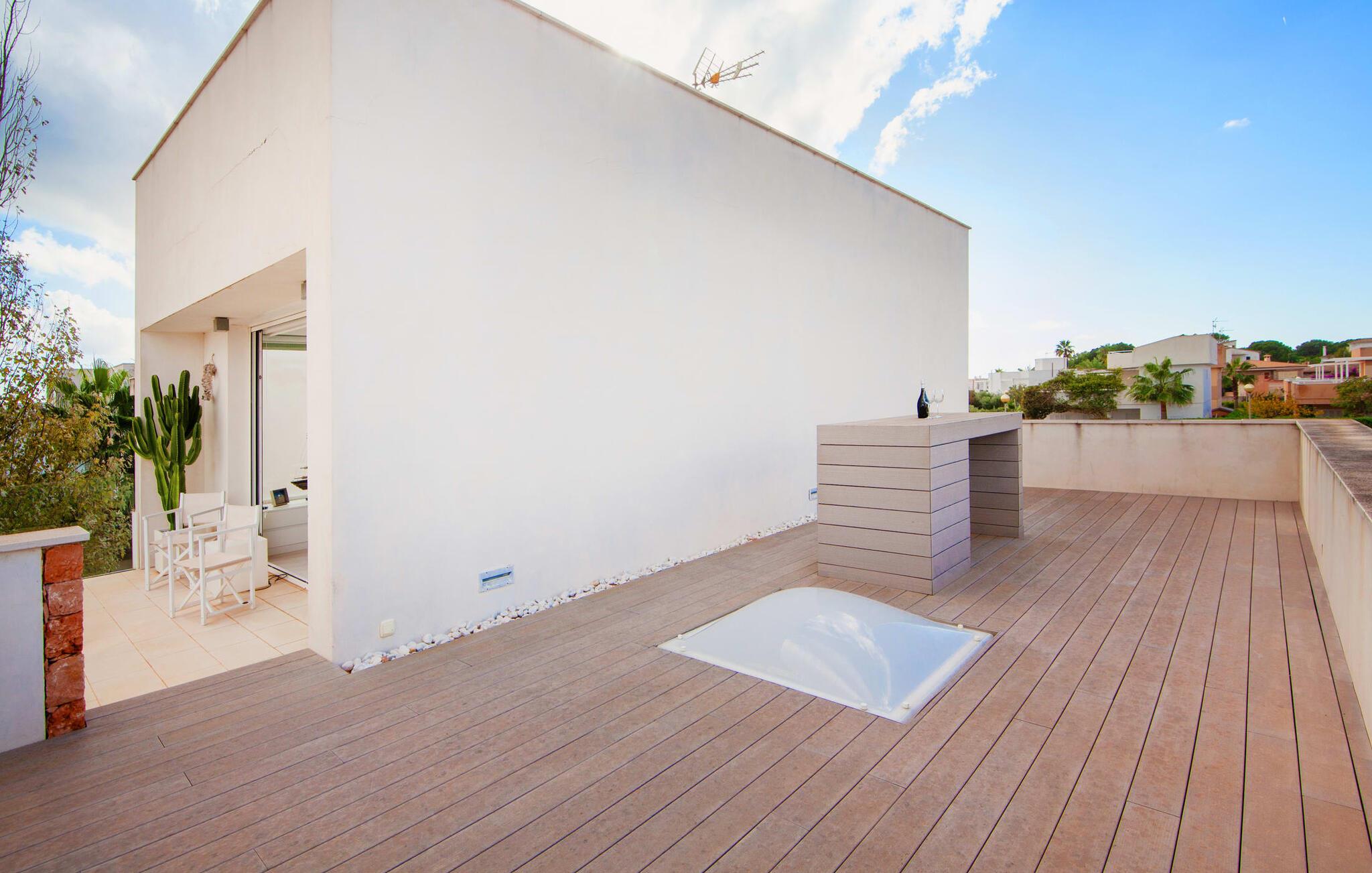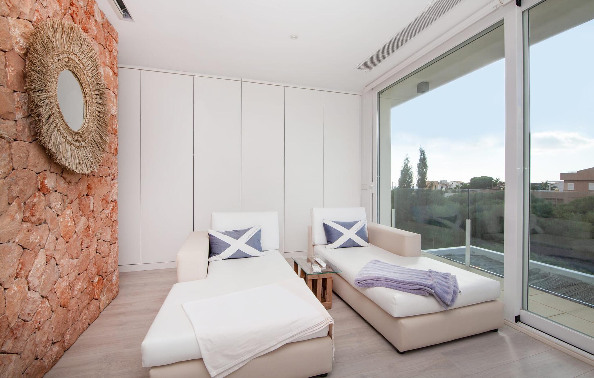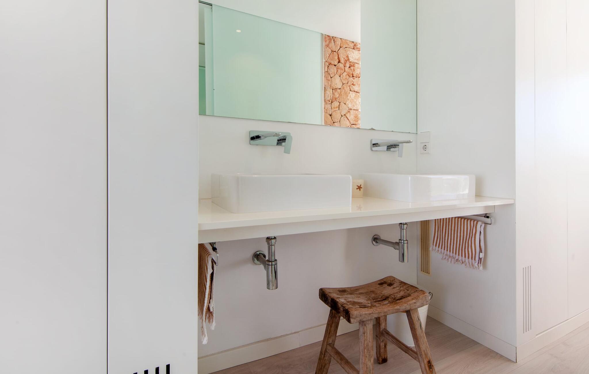 Denne kubeformede bondegården på Mallorca er et fantastisk sted for en bekymringsfri ferie ved havet. Den iøynefallende tilbygningen med fasade i naturstein kjennetegner det stilfulle hjemmet, som først og fremst ønsker å være én ting: individuelt. Plener og en mur med innsynsskjerm preger uteområdet, der det langstrakte bassenget er midtpunktet. Det lover herlig avkjøling på varme dager og er lett tilgjengelig via en trapp. For alle soldyrkere finnes det komfortable solsenger som enkelt kan plasseres på favorittstedet ditt, og hvor du kan nyte ferien i fulle drag. Den litt opphøyde terrassen rett ved siden av huset har en innbydende chill-out-lounge med utsikt over hagen og bassenget. På den andre siden av huset er det en annen veranda som tilbyr en like koselig plass, i dette tilfellet rett foran kjøkkenet.