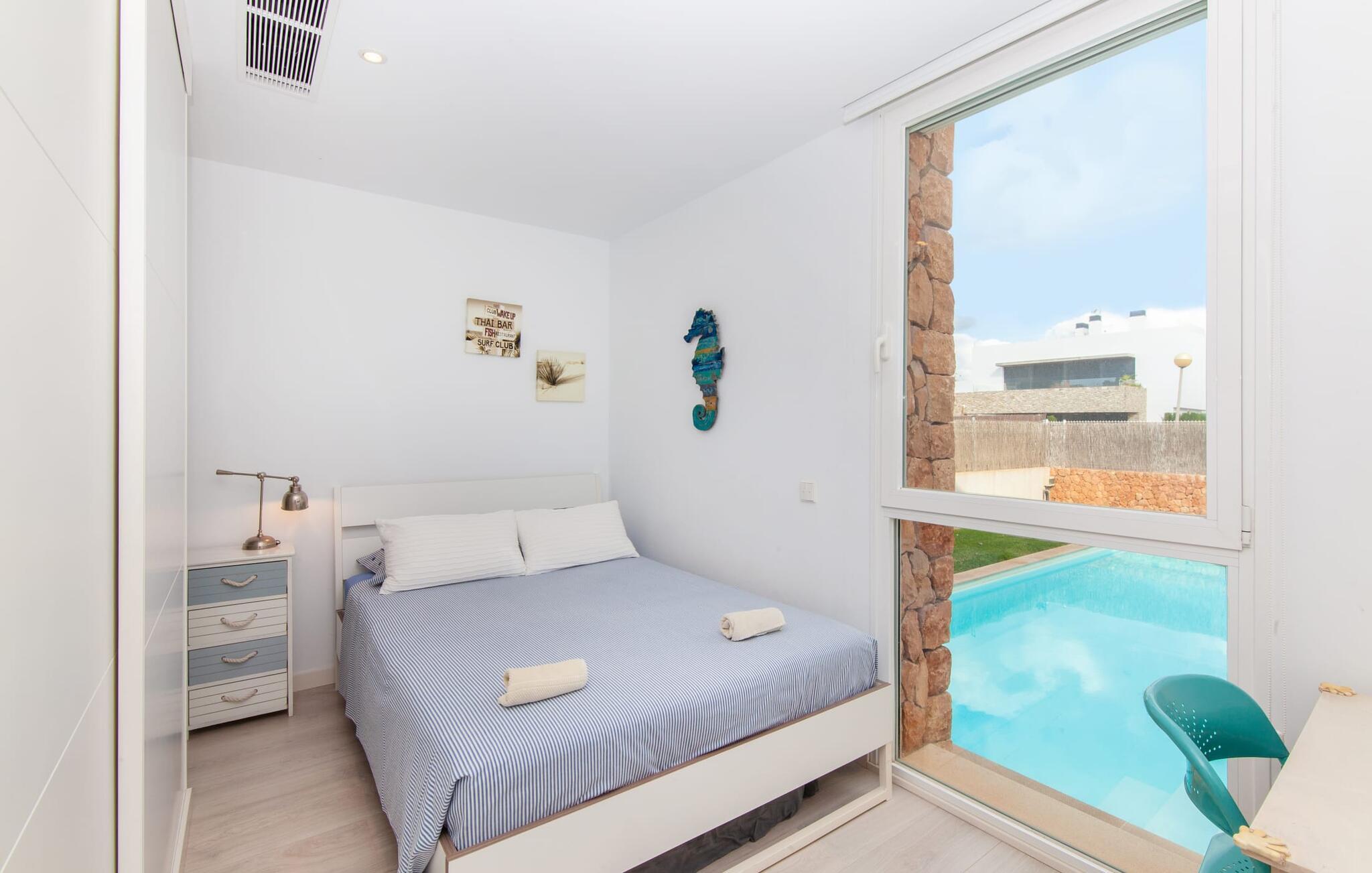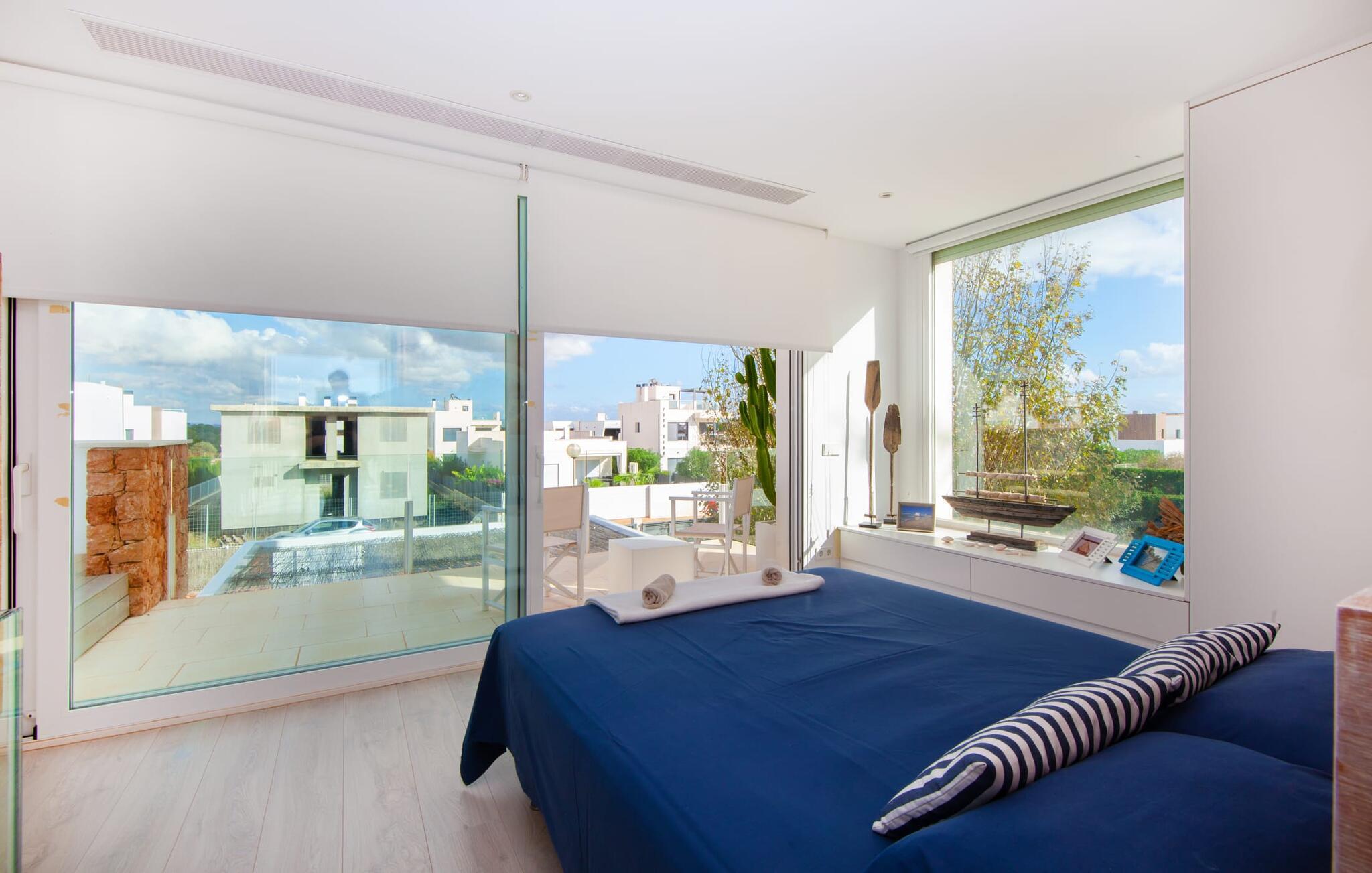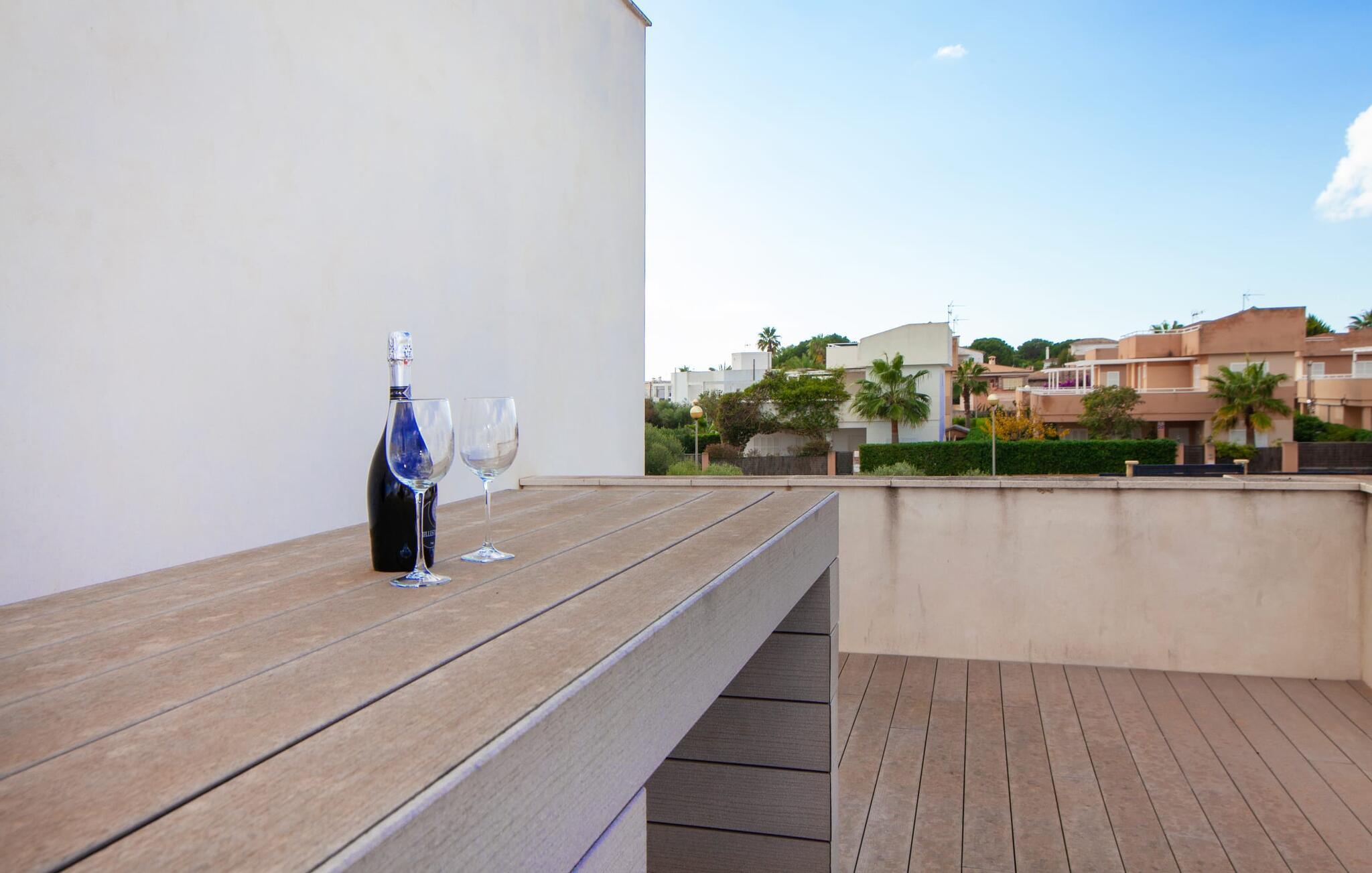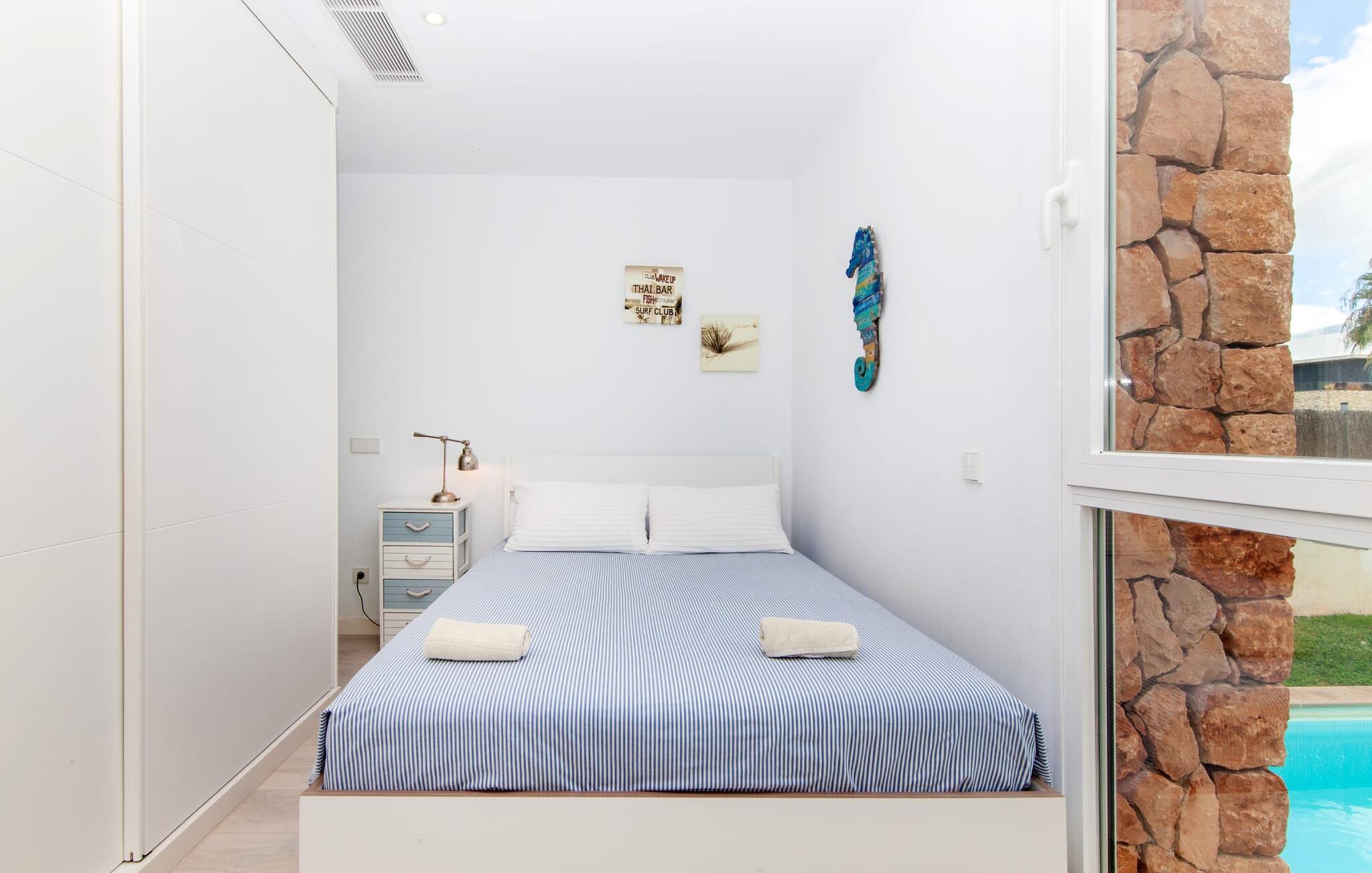 Denne kubeformede bondegården på Mallorca er et fantastisk sted for en bekymringsfri ferie ved havet. Den iøynefallende tilbygningen med fasade i naturstein kjennetegner det stilfulle hjemmet, som først og fremst ønsker å være én ting: individuelt. Plener og en mur med innsynsskjerm preger uteområdet, der det langstrakte bassenget er midtpunktet. Det lover herlig avkjøling på varme dager og er lett tilgjengelig via en trapp. For alle soldyrkere finnes det komfortable solsenger som enkelt kan plasseres på favorittstedet ditt, og hvor du kan nyte ferien i fulle drag. Den litt opphøyde terrassen rett ved siden av huset har en innbydende chill-out-lounge med utsikt over hagen og bassenget. På den andre siden av huset er det en annen veranda som tilbyr en like koselig plass, i dette tilfellet rett foran kjøkkenet.