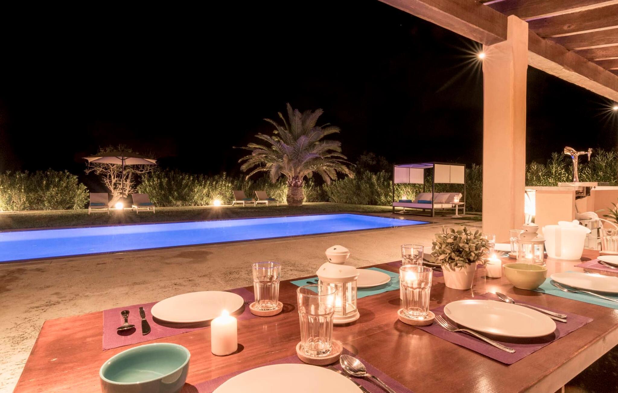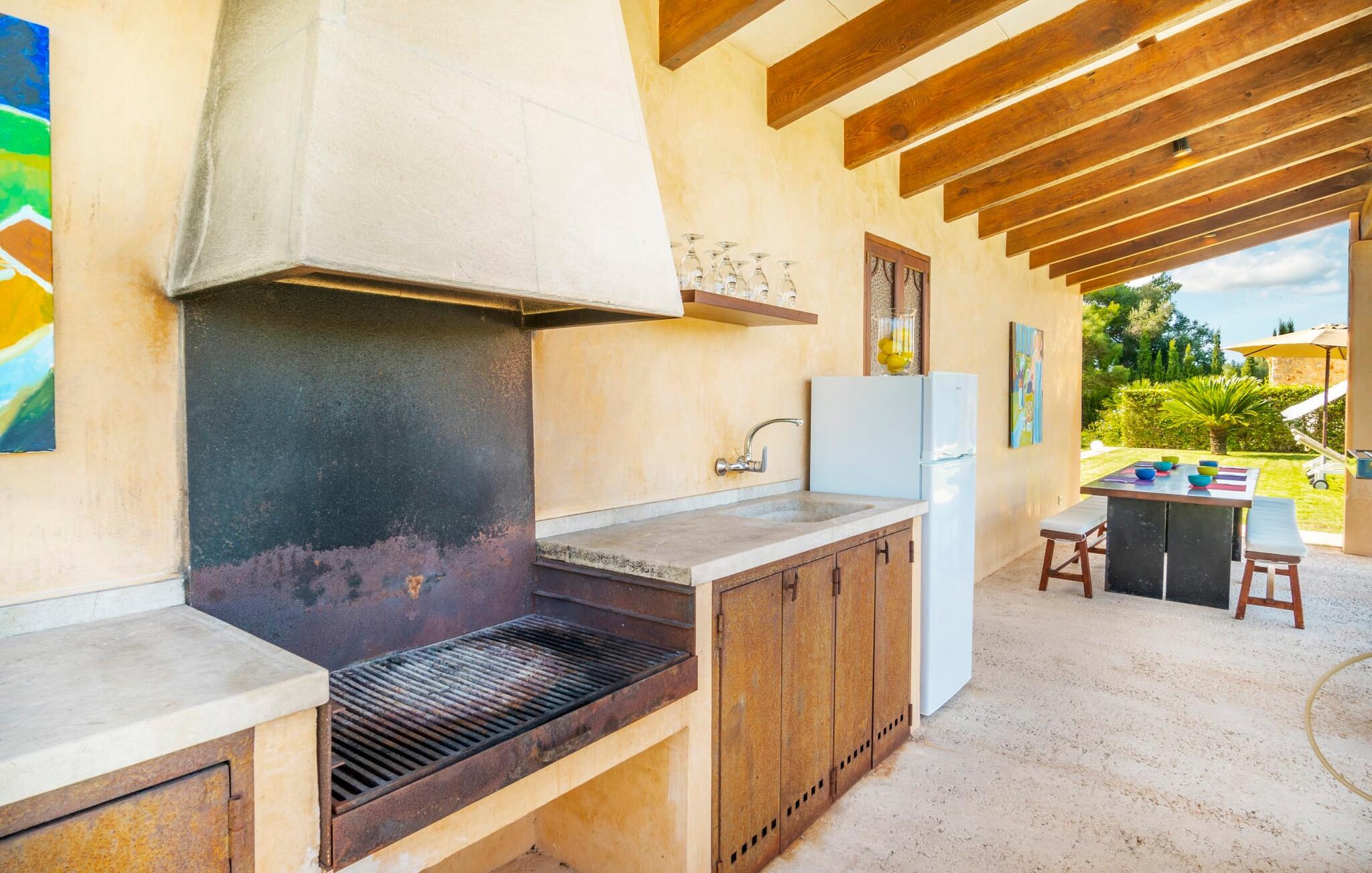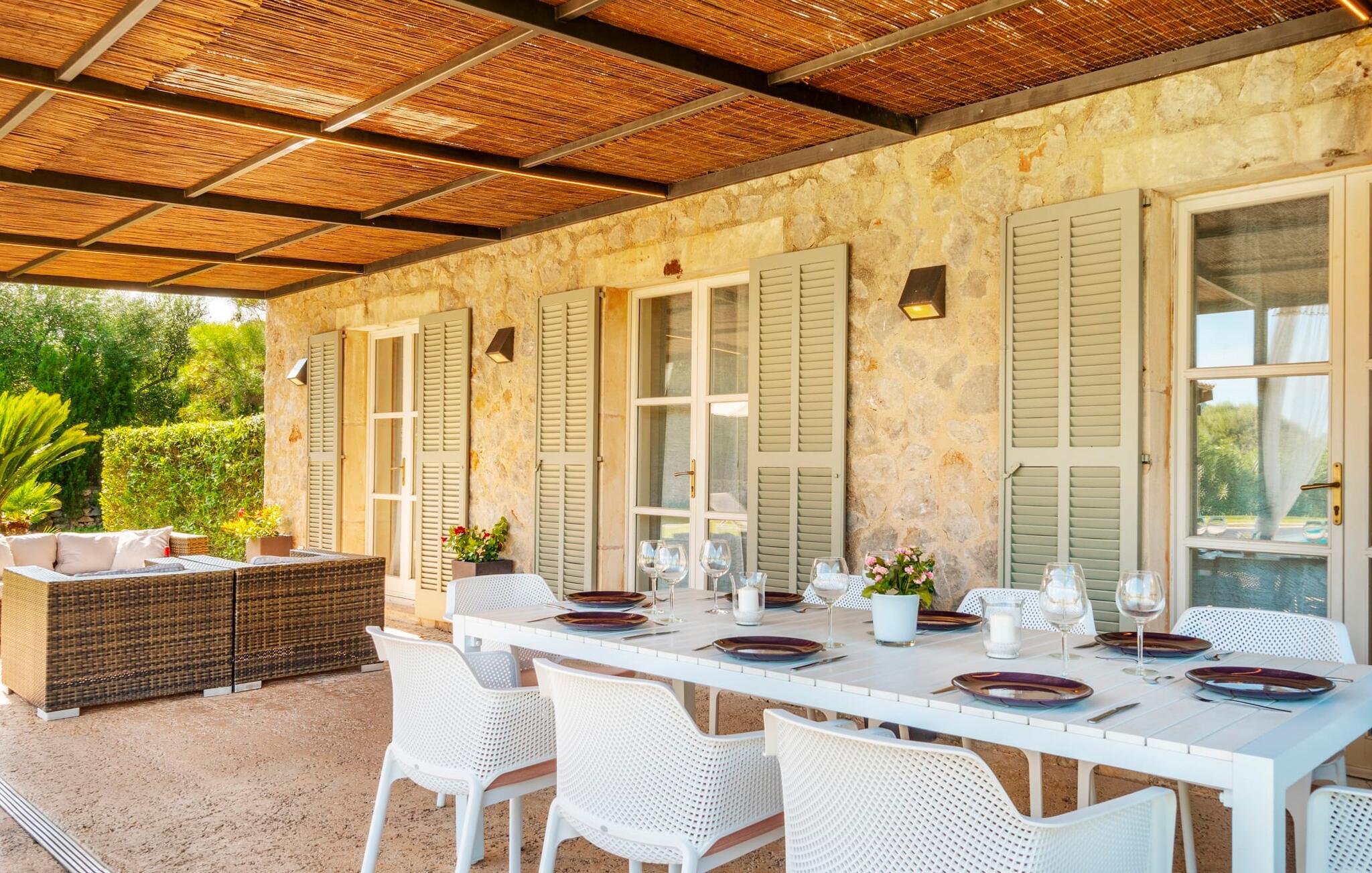 Den elegante og barnevennlige Villa Can Bossa imponerer med fantastisk valuta for pengene. Her er alt på stell: planløsning, møblering, uteområde, flott beliggenhet og alt til en gunstig pris, selv i bryllupssesongen. Villaen ligger mellom golfbanene Capdepera og Canyamel, og sistnevnte er spesielt populær fordi de gamle steinmurene ble bevart under byggingen av banen, noe som minner om den tidligere jordbruksinndelingen av området. Noen av hullene på banen har til og med utsikt over Menorca på klare dager. Ferierende som liker å tilbringe ferien utendørs i tillegg til å spille golf, trenger ikke lete lenger etter den perfekte villaen. En velstelt hage med store gressplener innbyr til utstrakt utendørs avslapning. Et virkelig høydepunkt er det originale bassenghuset, der den overbygde delen er utstyrt med en mursteinsgrill, et lite utekjøkken og et innbydende spisebord. Loungeområdet rett ved bassenget innbyr til avslapping med en deilig drink for den rene feriefølelsen. Terrassen ved siden av det store bassenget med en dybde på 1,50 meter har ti solsenger og flere parasoller som gir skygge. Rett ved siden av huset, under markisen med rundbuer og bambusbelegg, finner du en annen sittegruppe med et bord for 8 personer og et avslapningsområde med sofa, lenestoler og salongbord. Disse kan selvfølgelig også settes sammen for å nyte en koselig frokost eller middag med en stor gruppe. Lekne og koselige nisjer som en sideterrasse med bare to stoler ved siden av duftende lavendelbusker eller den overbygde terrassen på forsiden med høye stoler i rotting er absolutt også verdt å nevne her. Utemøblene består av hvite solstoler i jern med beige puter.