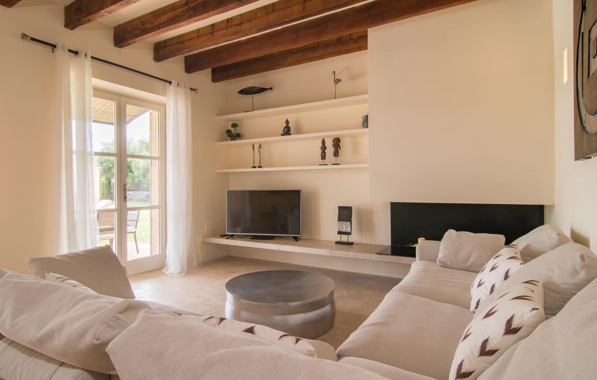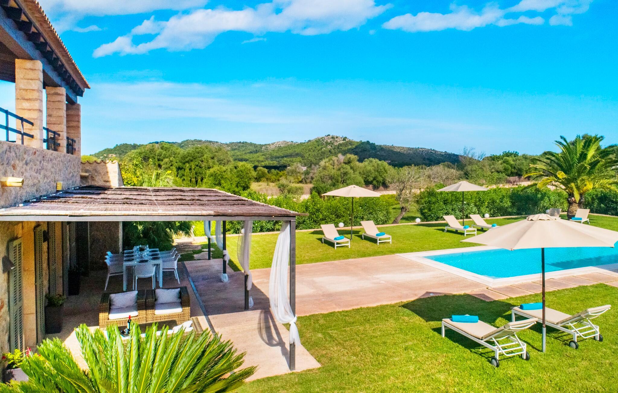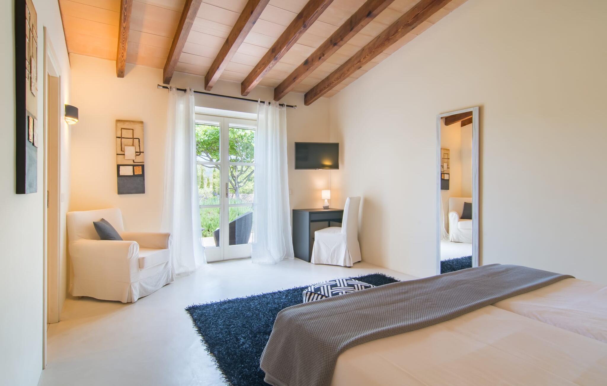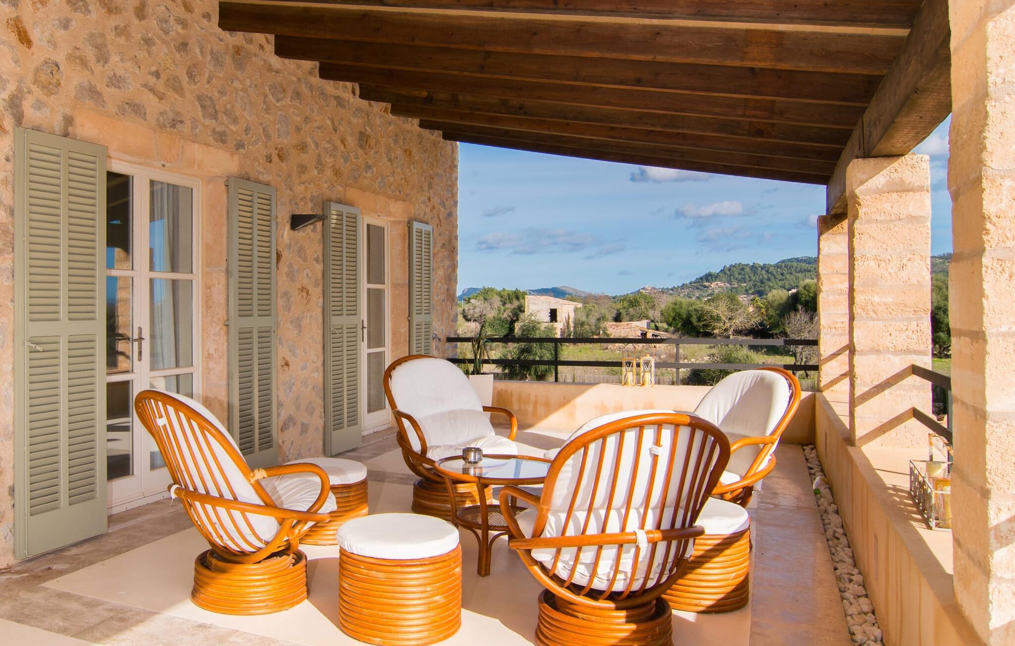 Selv om det sjenerøst utstyrte uteområdet inviterer deg til å tilbringe mesteparten av tiden utendørs under en knallblå himmel på varme dager, er interiøret i bygningen også attraktivt og vil helt sikkert appellere til alle som elsker en sofistikert boligatmosfære. Romslige og lyse rom med rene linjer, hvite vegger og smakfulle gulvfliser venter på oss så snart vi kommer inn gjennom vinduene med sprosser og lysegrønne skodder. Den kombinerte stue-/spisestuen imponerer med sin puristiske design, stilfullt supplert med en moderne og komfortabel stor beige sofa, et moderne spisebord med rottingstoler og puter med høy rygg. Takket være den åpne planløsningen kan alle gjøre det de vil her uten å forstyrre andre for mye. Du kan slappe av i sofaen, spille et brettspill ved det store spisebordet, dele ferieopplevelsene dine med dem du er glad i hjemme via smarttelefon, nettbrett eller bærbar PC eller spise middag sammen. Det stilfulle kjøkkenet i tre er moderne og fullt utstyrt med keramisk komfyr, stekeovn, oppvaskmaskin, kjøleskap med fryserom, mikrobølgeovn, kaffemaskin og vannkoker. Disse fasilitetene gjør at du kan tilbringe de dagene du har bestemt deg for å tilberede din egen middag i fullstendig avslapping og uavhengighet. De fire romslige dobbeltrommene med klimaanlegg inviterer deg inn med sin vennlige eleganse. Disse estetisk utformede avslapningsområdene får et ekstra streif av individualitet av de moderne, store kunstverkene. Her vil alle finne den sjarmen som naturlig passer dem. De store garderobeskapene gir god oppbevaringsplass for medbrakte eller kjøpte ferieklær på Mallorca. Hvert soverom er også utstyrt med TV med internasjonale kanaler. Noen av soverommene har direkte utgang til balkong eller terrasse. Nyt freden og roen i naturen, det herlige middelhavsklimaet med en lett havbris og duften av blomstrende planter før høysesongen eller når du våkner. To av soverommene har eget bad, mens de andre soverommene deler et annet bad. Badene er smakfullt innredet i italiensk stil og har svært luksuriøse møbler.