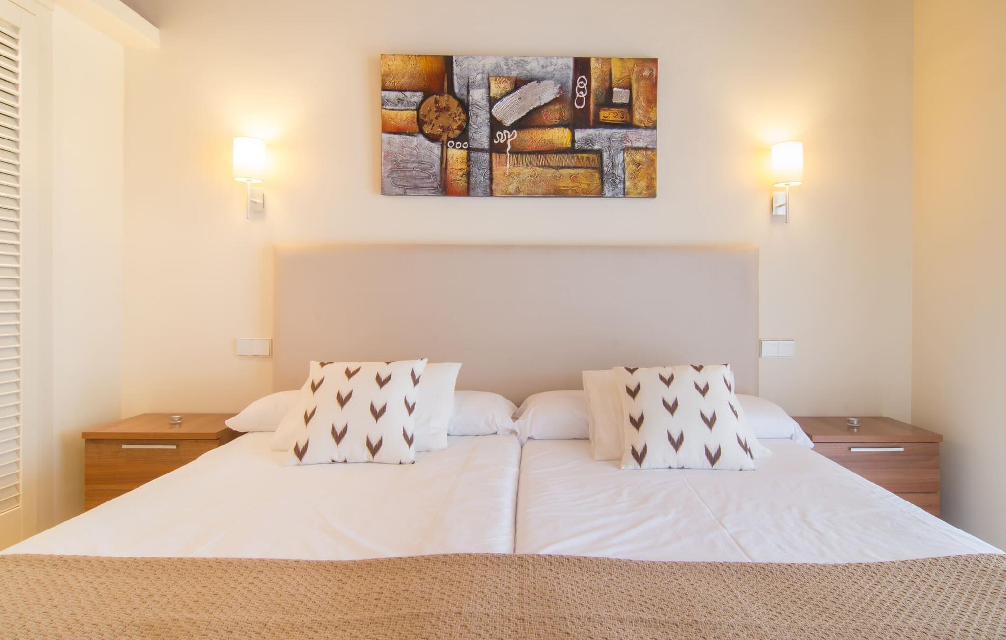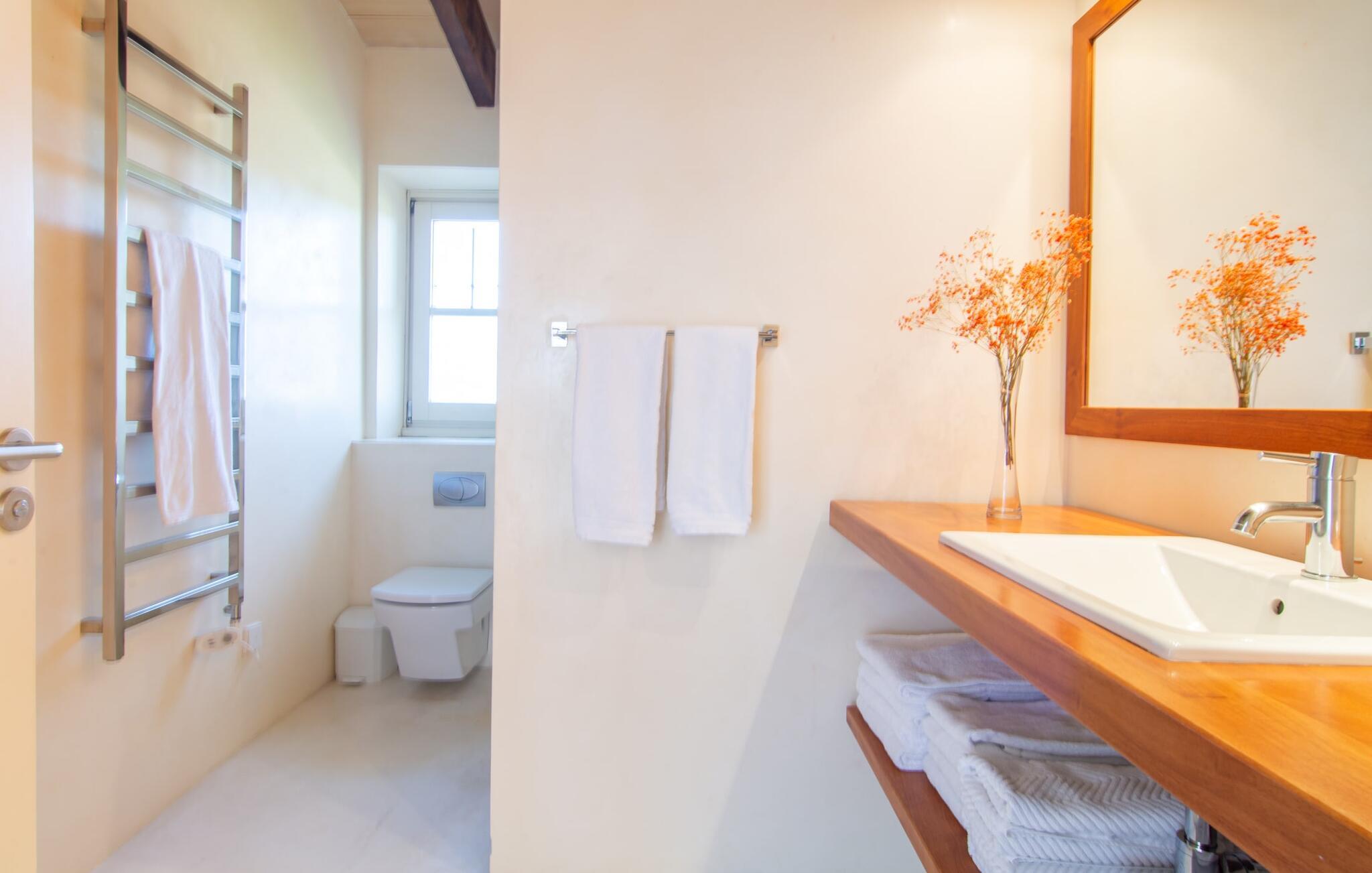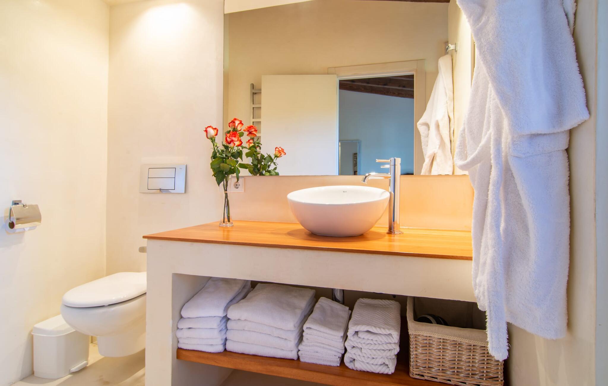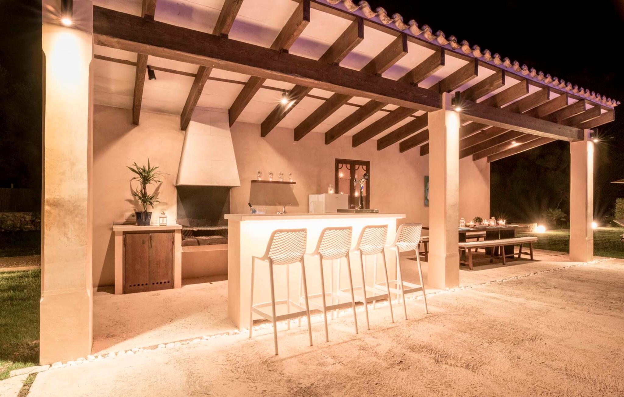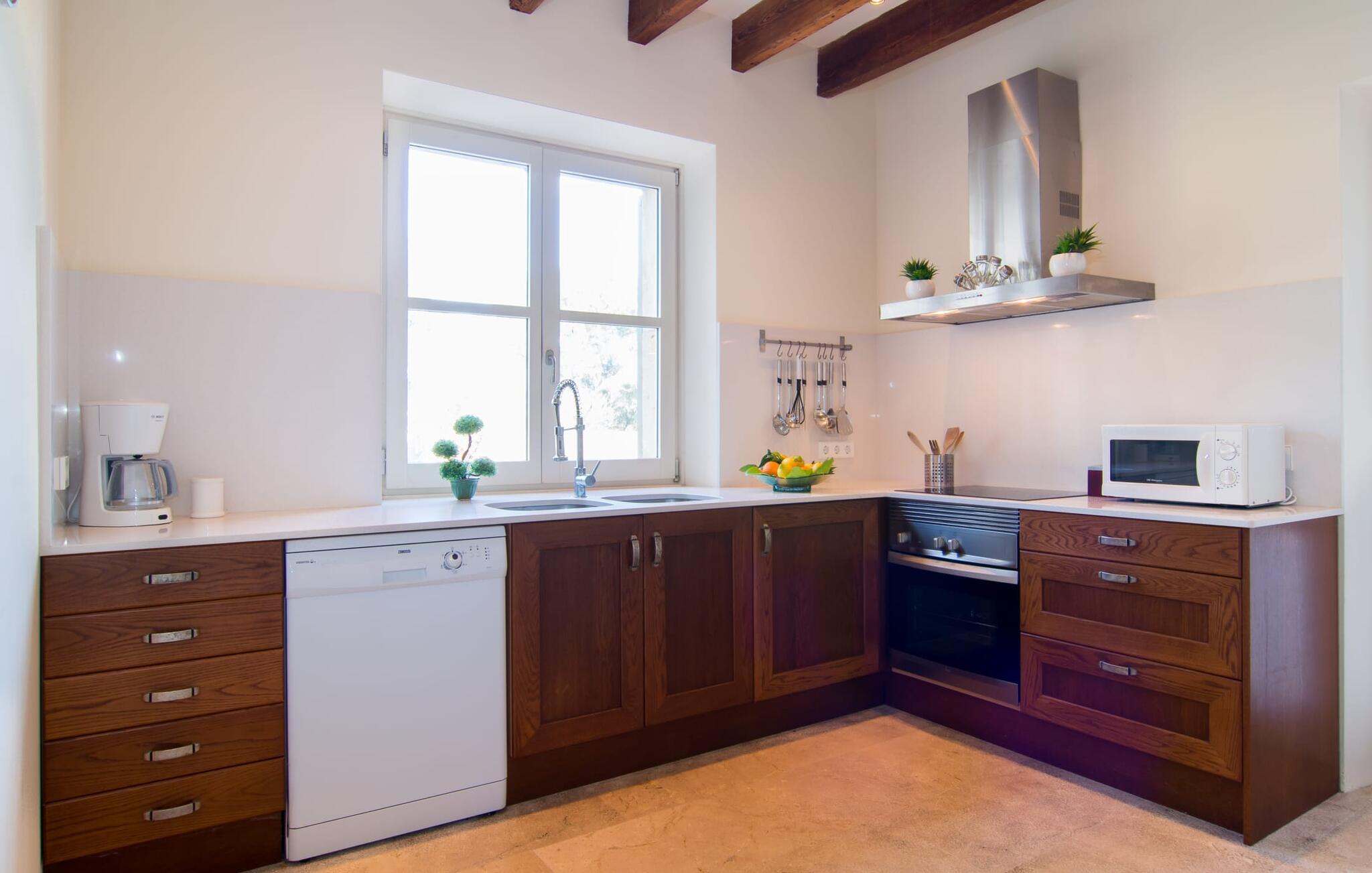 Selv om det sjenerøst utstyrte uteområdet inviterer deg til å tilbringe mesteparten av tiden utendørs under en knallblå himmel på varme dager, er interiøret i bygningen også attraktivt og vil helt sikkert appellere til alle som elsker en sofistikert boligatmosfære. Romslige og lyse rom med rene linjer, hvite vegger og smakfulle gulvfliser venter på oss så snart vi kommer inn gjennom vinduene med sprosser og lysegrønne skodder. Den kombinerte stue-/spisestuen imponerer med sin puristiske design, stilfullt supplert med en moderne og komfortabel stor beige sofa, et moderne spisebord med rottingstoler og puter med høy rygg. Takket være den åpne planløsningen kan alle gjøre det de vil her uten å forstyrre andre for mye. Du kan slappe av i sofaen, spille et brettspill ved det store spisebordet, dele ferieopplevelsene dine med dem du er glad i hjemme via smarttelefon, nettbrett eller bærbar PC eller spise middag sammen. Det stilfulle kjøkkenet i tre er moderne og fullt utstyrt med keramisk komfyr, stekeovn, oppvaskmaskin, kjøleskap med fryserom, mikrobølgeovn, kaffemaskin og vannkoker. Disse fasilitetene gjør at du kan tilbringe de dagene du har bestemt deg for å tilberede din egen middag i fullstendig avslapping og uavhengighet. De fire romslige dobbeltrommene med klimaanlegg inviterer deg inn med sin vennlige eleganse. Disse estetisk utformede avslapningsområdene får et ekstra streif av individualitet av de moderne, store kunstverkene. Her vil alle finne den sjarmen som naturlig passer dem. De store garderobeskapene gir god oppbevaringsplass for medbrakte eller kjøpte ferieklær på Mallorca. Hvert soverom er også utstyrt med TV med internasjonale kanaler. Noen av soverommene har direkte utgang til balkong eller terrasse. Nyt freden og roen i naturen, det herlige middelhavsklimaet med en lett havbris og duften av blomstrende planter før høysesongen eller når du våkner. To av soverommene har eget bad, mens de andre soverommene deler et annet bad. Badene er smakfullt innredet i italiensk stil og har svært luksuriøse møbler.
