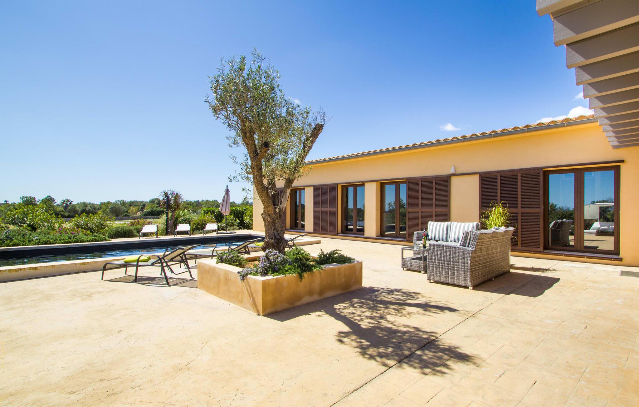 Denne L-formede villaen i én etasje med integrert bassengterrasse er en umiddelbar hit, og kalles Can Cariño med et kjærlig tilnavn. Og det er virkelig mye å forelske seg i ved første blikk når du kjører opp den lange innkjørselen. Den store, velholdte, men nesten uberørte eiendommen lar deg nyte utsikten og la tankene vandre i det fjerne. I den fortryllende hagen er det ikke bare et piknikområde med grill, men også en luftig Bali-seng, og på lune sommernetter vil en gjest med pute og teppe under armen garantert vandre inn på soverommet under åpen himmel om morgenen og hoppe i bassenget i stedet for i dusjen. Mange komfortable solsenger, maritime loungesofaer i polyrattan og et stort bord gjør det behagelig å oppholde seg i solen eller skyggen, slik at alle kan finne sin favorittplass. Og hvis du har lyst på en strandstol, finnes det også en slik.