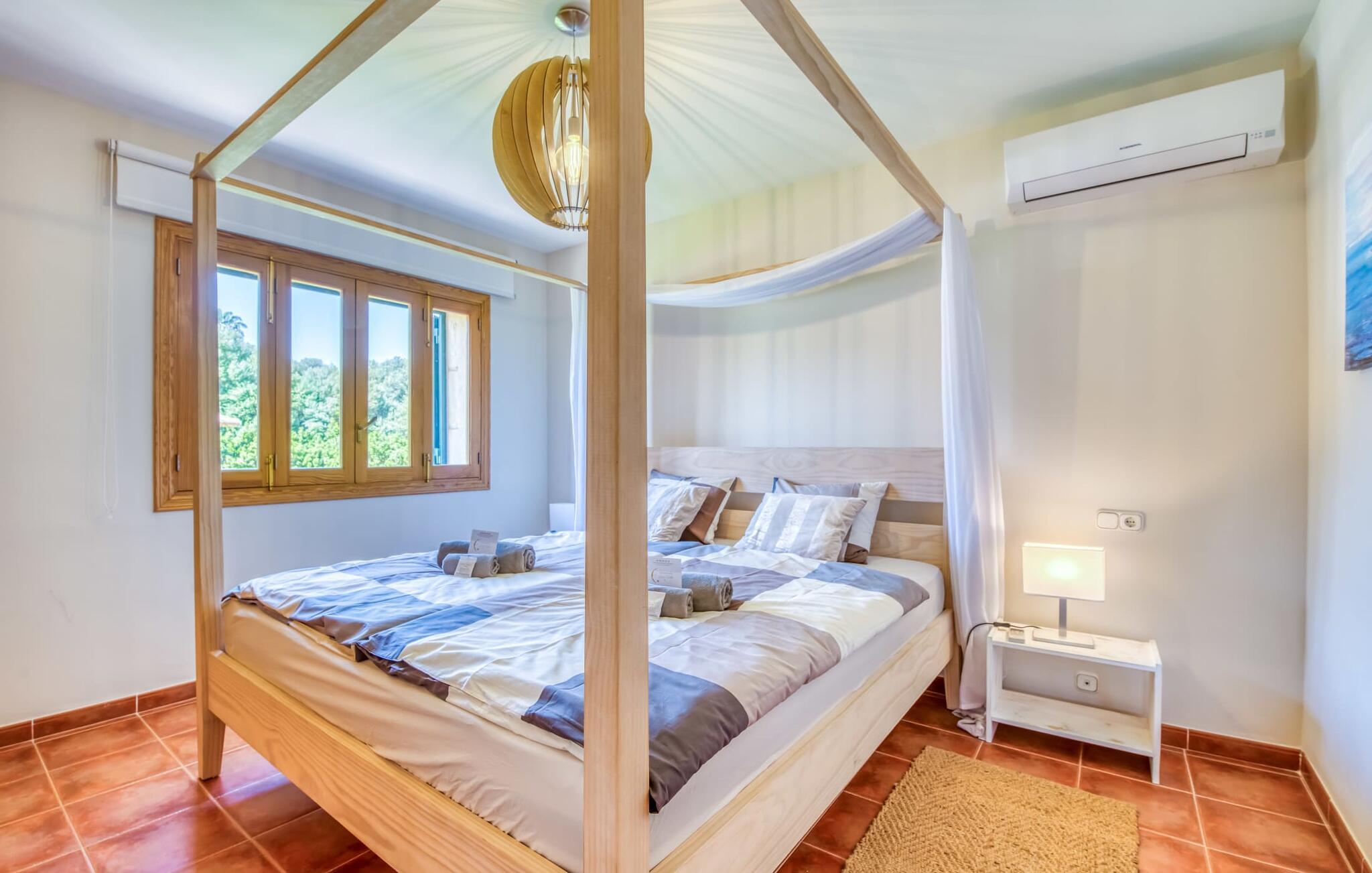Den romslige og lyse Finca Can Carmina ligger på en stor tomt med vidstrakt utsikt over landskapet og Tramuntana-fjellene. Bassengområdet har en overbygd pergola med solsenger og et utendørsbasseng. Den naturlige gressplenen innbyr til lek, og det samme gjør lekehuset, som er spesielt utstyrt for de minste.