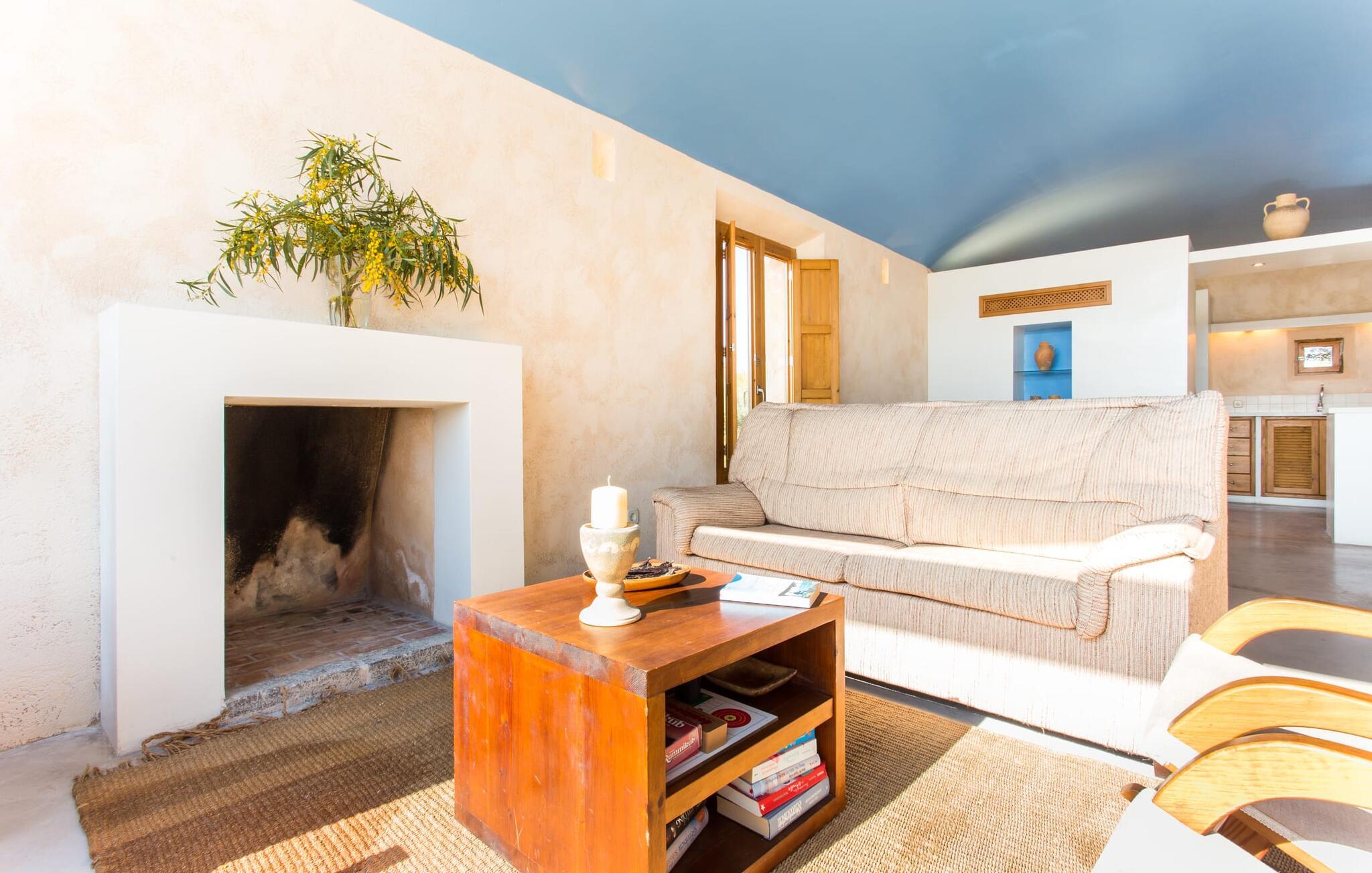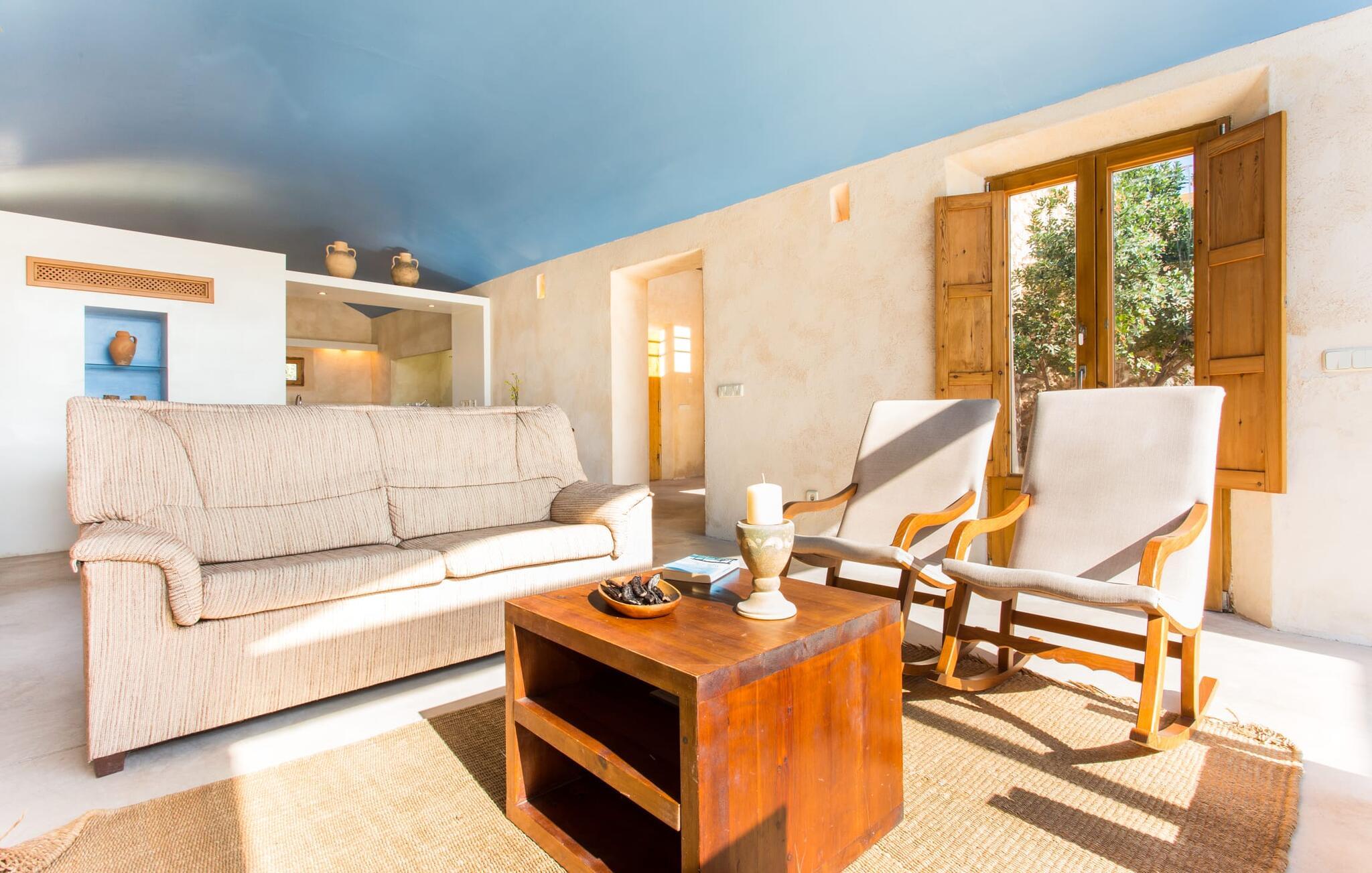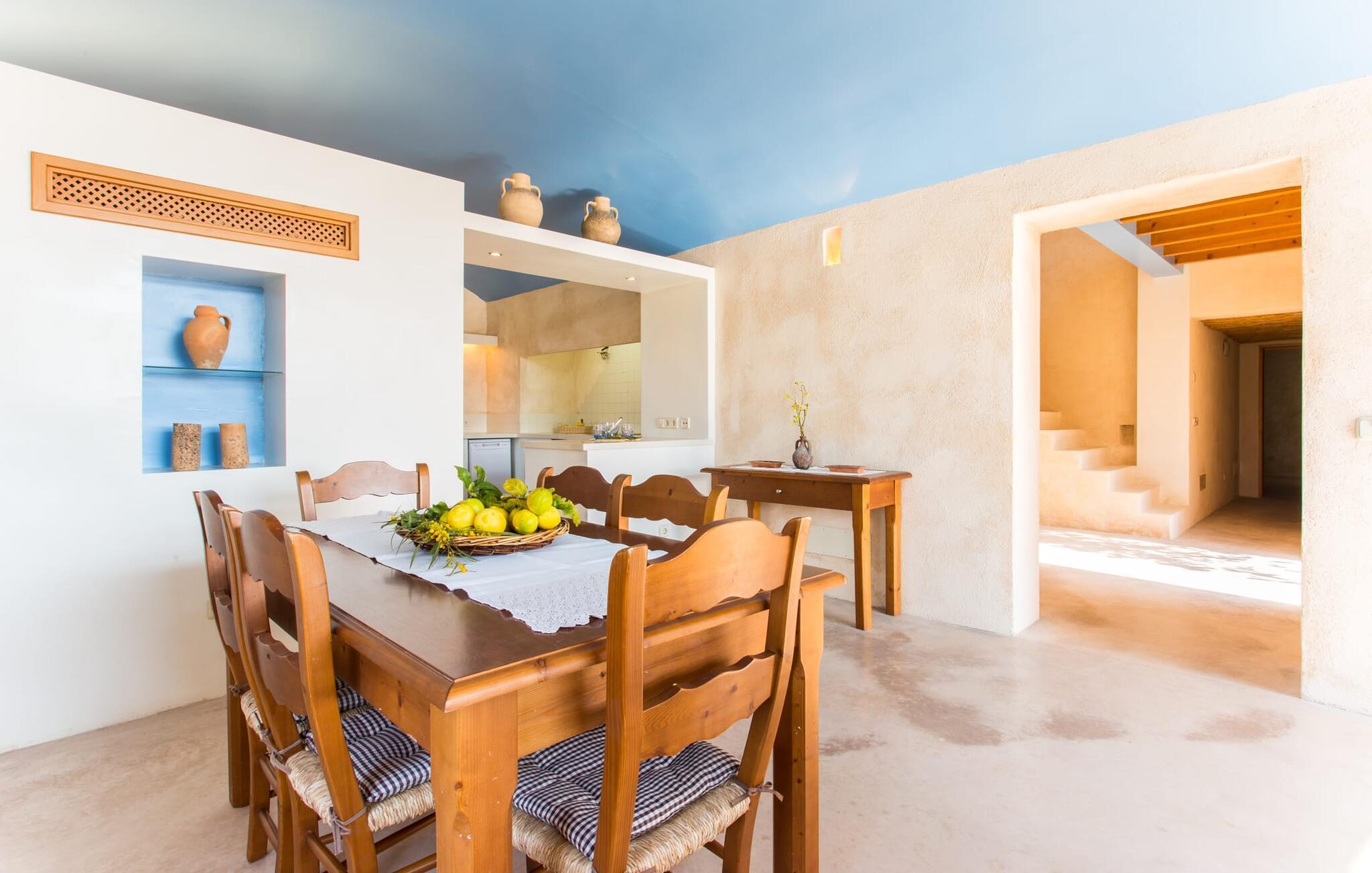 Den rustikke atmosfæren i villaen er forfriskende. Det lett hvelvede taket i stuen minner om en sjarmerende vinkjeller, men du kommer absolutt ikke til å fryse der! En sentral peis i rommet vil varme deg opp på kort tid. Her kombineres jord (åsene), luft (himmelen), vann (havet) og ild - de fire elementene som finnes så mange steder på øya. Fra sittegruppen med sofa, vippestoler og lenestoler kan du se en film eller, takket være moderne satellitteknologi, se på flatskjerm-TV. Eller bare lene deg tilbake og la fantasien løpe løpsk uten å måtte forlate den koselige peisen. Den kombinerte stue- og spisestuen med sitt store bord leder direkte inn i kjøkkenområdet, hvor du finner alle bekvemmeligheter i en moderne husholdning, inkludert vaskemaskin. Fra kjøkkenet fører en korridor til en av soveromsfløyene: ett av badene er direkte tilgjengelig via korridoren, og det andre ligger i tilknytning til det andre soverommet på dette nivået. Eierne har valgt klare, enkle konturer uten dekorative gjenstander. Det tredje soverommet kan nås via trappen, som deretter fører til en alkove med en annen sofa. På motsatt side av atriet kommer man ut på takterrassen. Det er også et bad i direkte tilknytning til soverommet i denne etasjen, slik at alle dine medreisende kan nyte privatlivet sitt uten å måtte stå i kø for å komme på badet om morgenen.