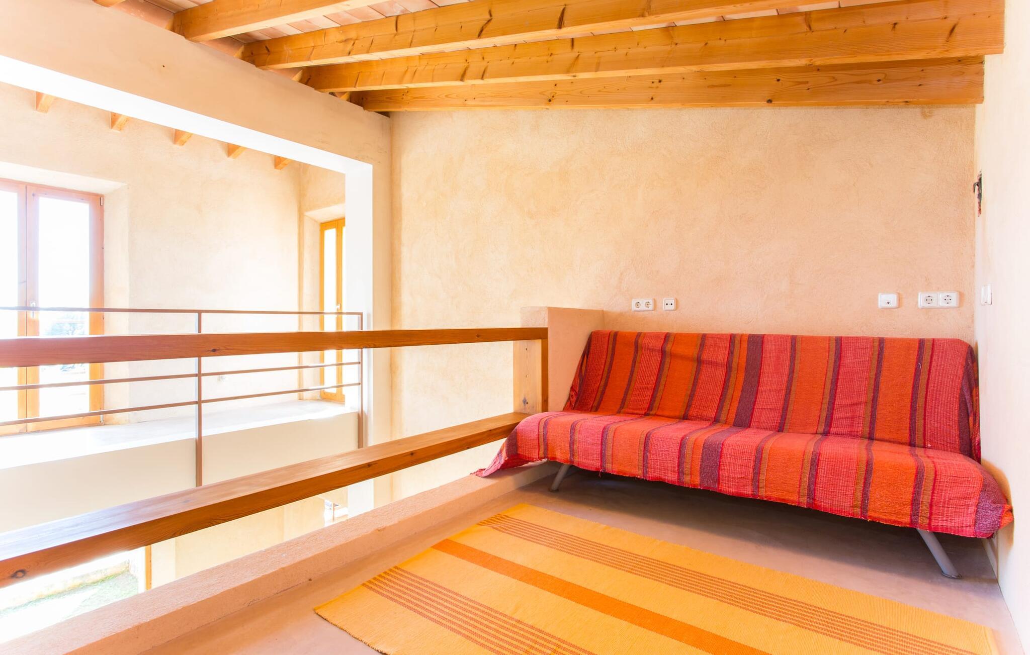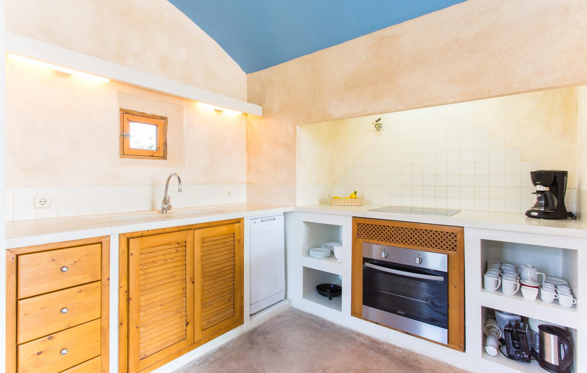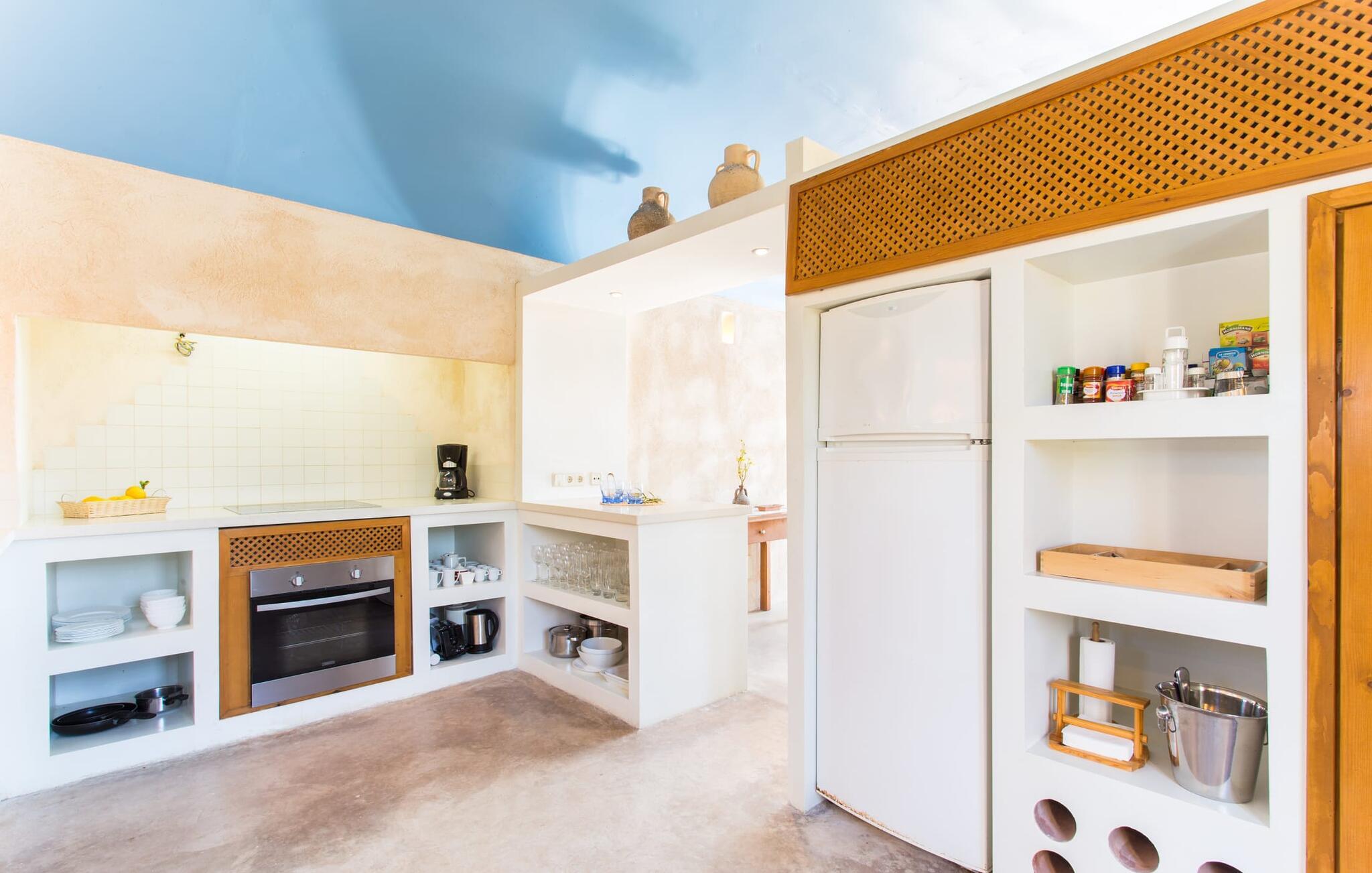 Den rustikke atmosfæren i villaen er forfriskende. Det lett hvelvede taket i stuen minner om en sjarmerende vinkjeller, men du kommer absolutt ikke til å fryse der! En sentral peis i rommet vil varme deg opp på kort tid. Her kombineres jord (åsene), luft (himmelen), vann (havet) og ild - de fire elementene som finnes så mange steder på øya. Fra sittegruppen med sofa, vippestoler og lenestoler kan du se en film eller, takket være moderne satellitteknologi, se på flatskjerm-TV. Eller bare lene deg tilbake og la fantasien løpe løpsk uten å måtte forlate den koselige peisen. Den kombinerte stue- og spisestuen med sitt store bord leder direkte inn i kjøkkenområdet, hvor du finner alle bekvemmeligheter i en moderne husholdning, inkludert vaskemaskin. Fra kjøkkenet fører en korridor til en av soveromsfløyene: ett av badene er direkte tilgjengelig via korridoren, og det andre ligger i tilknytning til det andre soverommet på dette nivået. Eierne har valgt klare, enkle konturer uten dekorative gjenstander. Det tredje soverommet kan nås via trappen, som deretter fører til en alkove med en annen sofa. På motsatt side av atriet kommer man ut på takterrassen. Det er også et bad i direkte tilknytning til soverommet i denne etasjen, slik at alle dine medreisende kan nyte privatlivet sitt uten å måtte stå i kø for å komme på badet om morgenen.