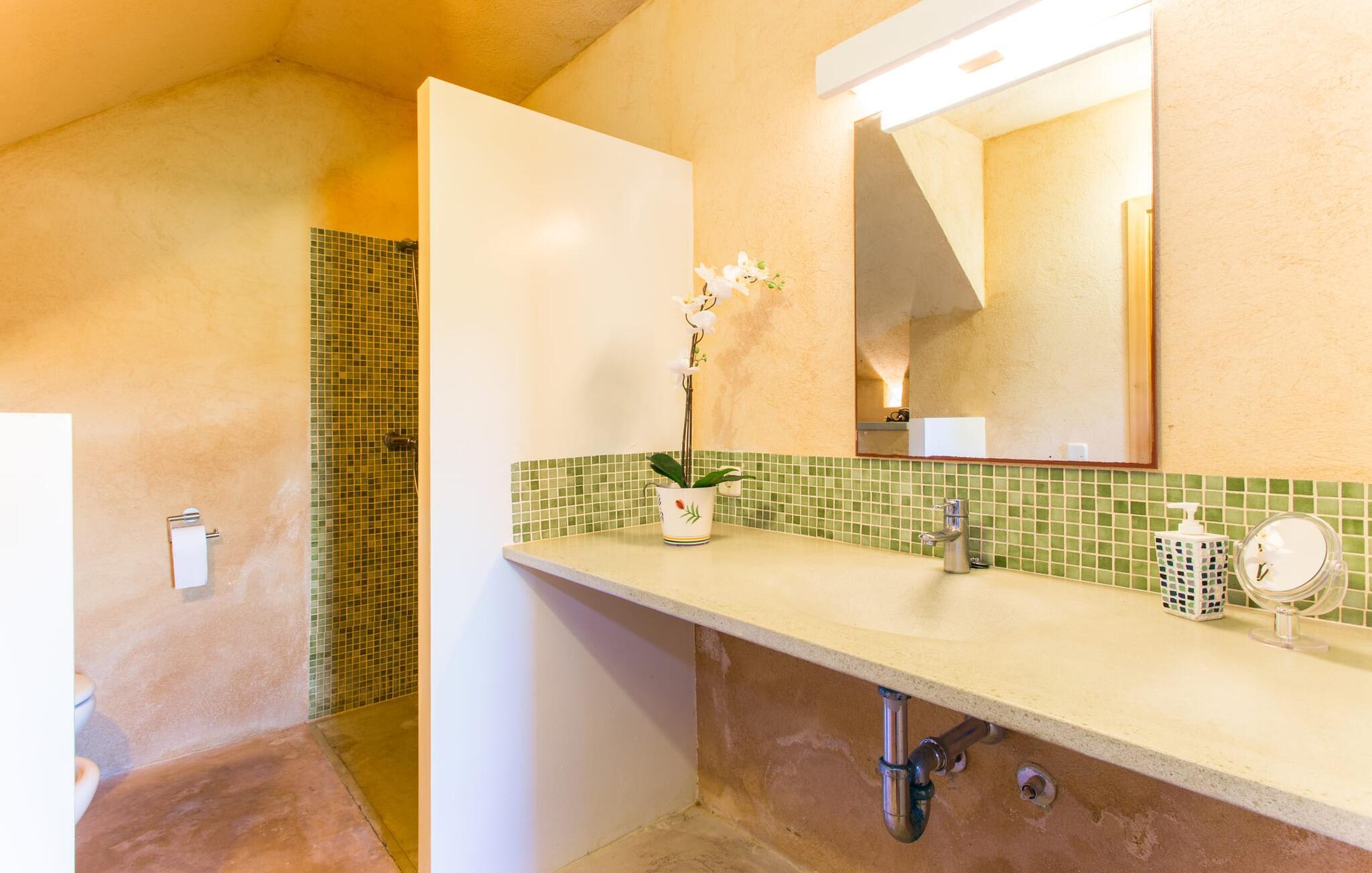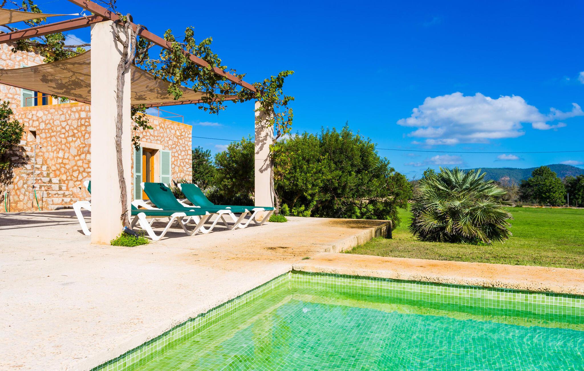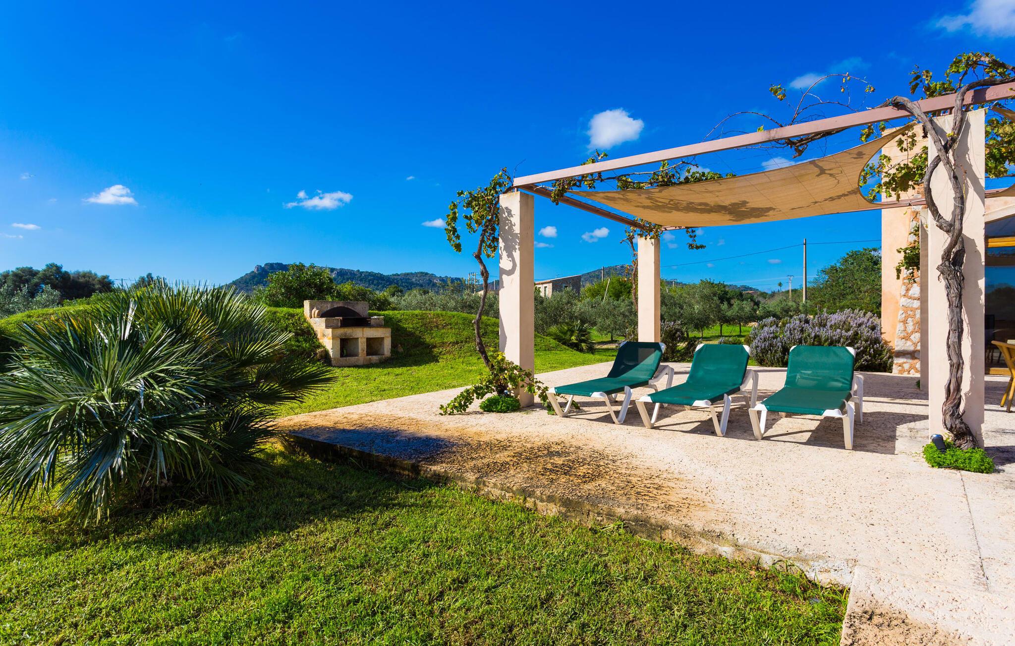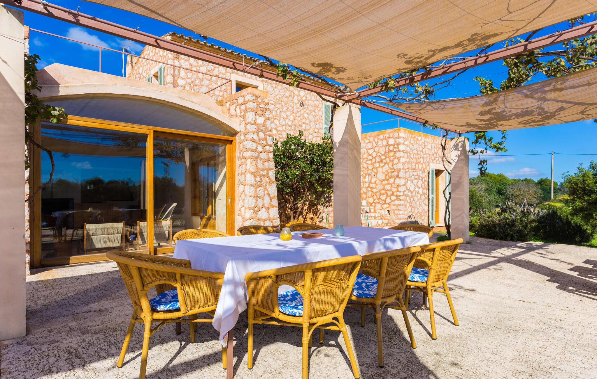 Fordyp deg i harmonien i naturen. Den tilsynelatende endeløse utsikten er typisk for villaens bølgende åser, krydret av en østlig salt bris fra det nærliggende havet. Ta deg tid til å nyte sjarmen i denne villaen med den ypperlige beliggenheten før du drar videre for å nyte mangfoldet på en av strandresortene. Dette er det ekte Mallorca, som blir stadig mer verdifullt etter hvert som drømmeøya utvikles på andre steder. Og mens du nyter utsikten, kan du velge og vrake mellom å slappe av i ditt eget private basseng, se på deilig fisk på grillen eller nyte en kald spansk øl på terrassen. Terrassen er en juvel i eiendommens krone. Planter som klatrer på markisen gir skygge. Takterrassene er ideelle for en prat i det fri og er tilgjengelige via første etasje.