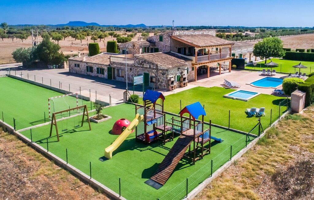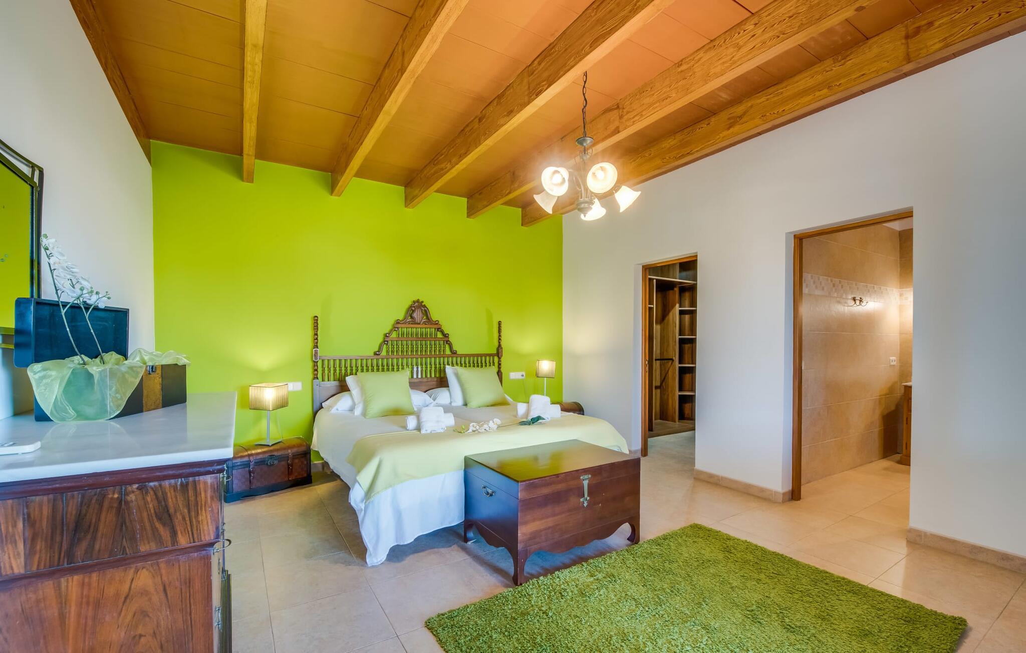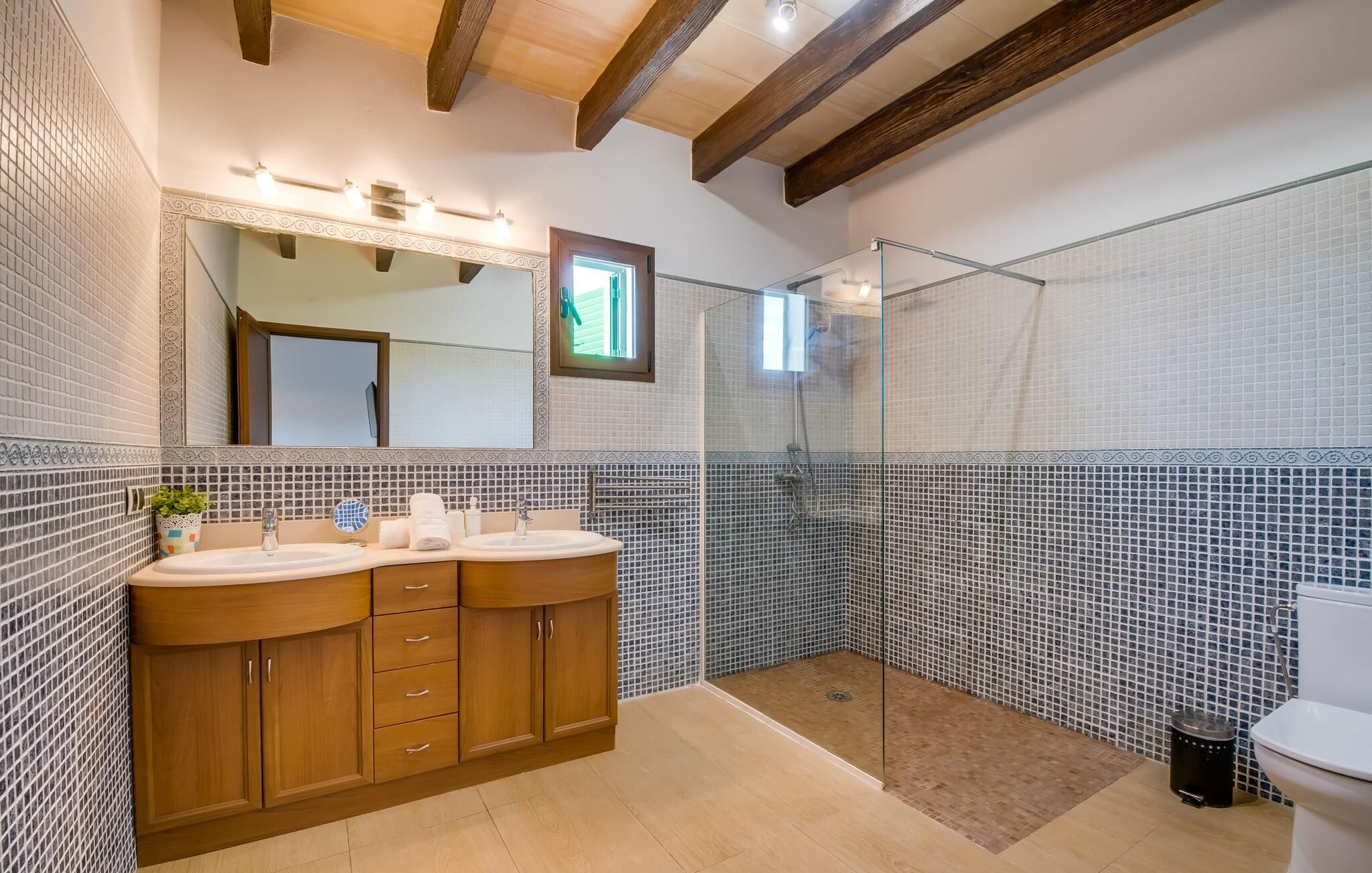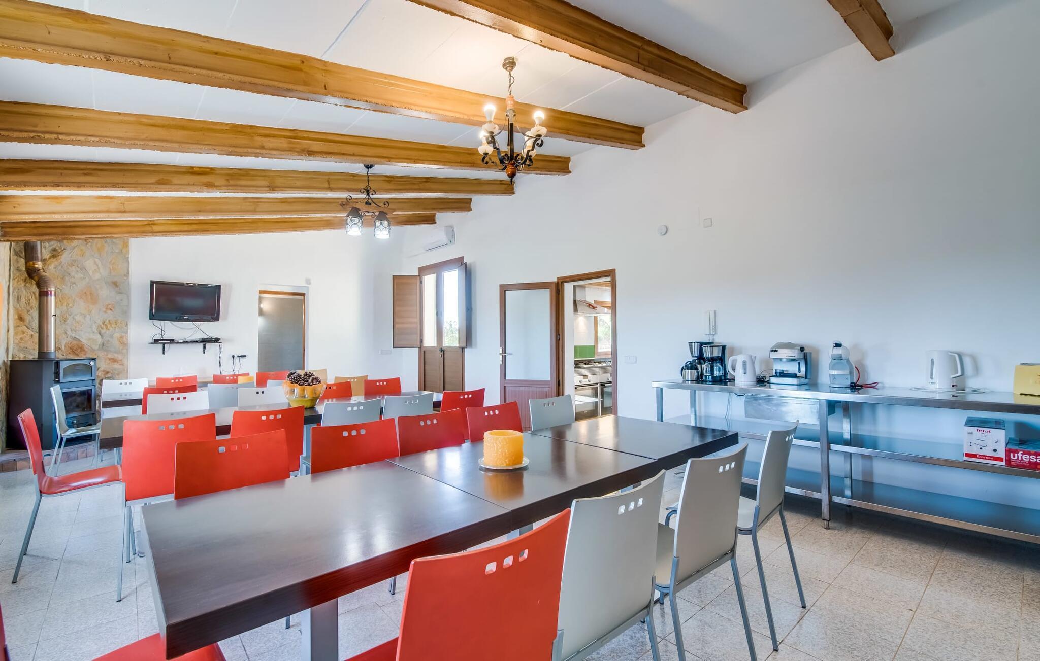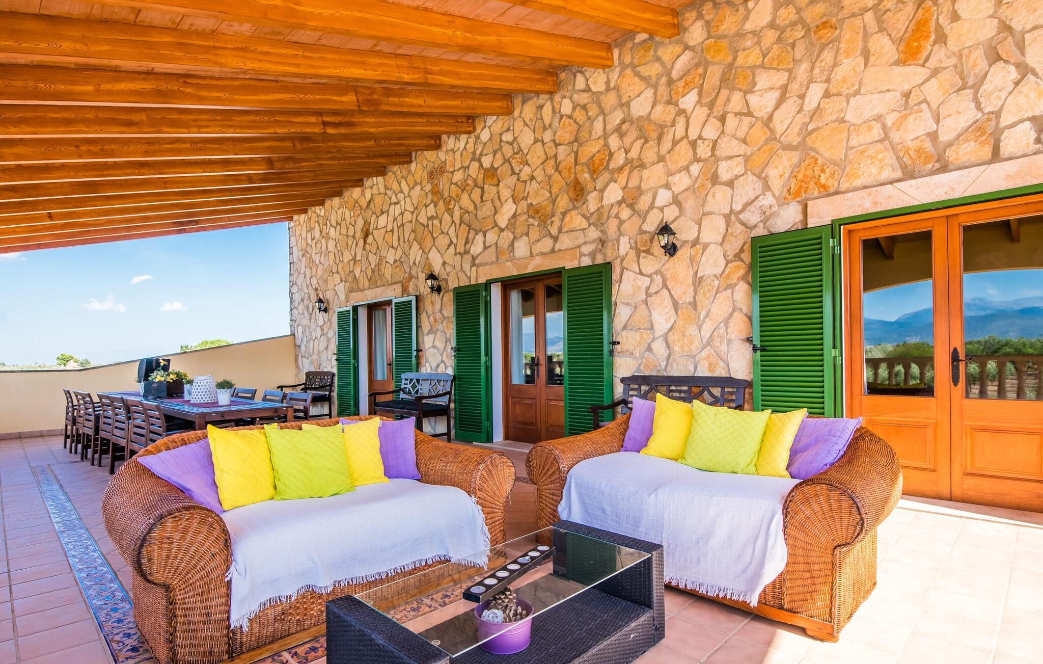 Når du kommer inn i villaen, som ikke bare har vakre, men også svært originale natursteinsfasader, finner du den nedre stuen med en ekstremt stor og komfortabel sofa og et rustikt spisebord for seks personer. TV-en og peisen er praktisk installert i dette rommet. Det klassisk designede kjøkkenet er lett å rengjøre og fullt utstyrt, inkludert vannkoker og kaffemaskin. I andre etasje finner man en lignende planløsning (inkludert et kjøkken til), med praktisk og attraktiv design og god plass til å føle seg hjemme. I denne første etasjen er det også en peis, noe som gir en koselig atmosfære på kjølige kvelder. En stor stue/spisestue gir alle gjestene i huset mulighet til å spise sammen og nyte fritiden innendørs. Seks av de ni individuelt utformede soverommene, som for det meste har klimaanlegg (ett av dem er et gjennomgangsrom som fører til et annet soverom), har eget bad. Alle de 11 badene har en behagelig, lys design, moderne inventar og noen av dem har vakre, typiske mallorkinske border. En original og unik bonus er de to ekstra selvbetjente oppholdsrommene som ble bygget i 2017 i nabobygningene. Det ene har plass til opptil seks personer, med tre soverom med dobbeltseng, to bad med dusj, kjøkken samt spisestue og stue. Det tredje rommet har fire soverom med dobbeltseng, to bad med dusj, kjøkken, spisestue og stue. Det første og det andre rommet er tilgjengelig for grupper på opptil 24 personer, mens grupper på 32 personer eller mer kan benytte hele eiendommen.