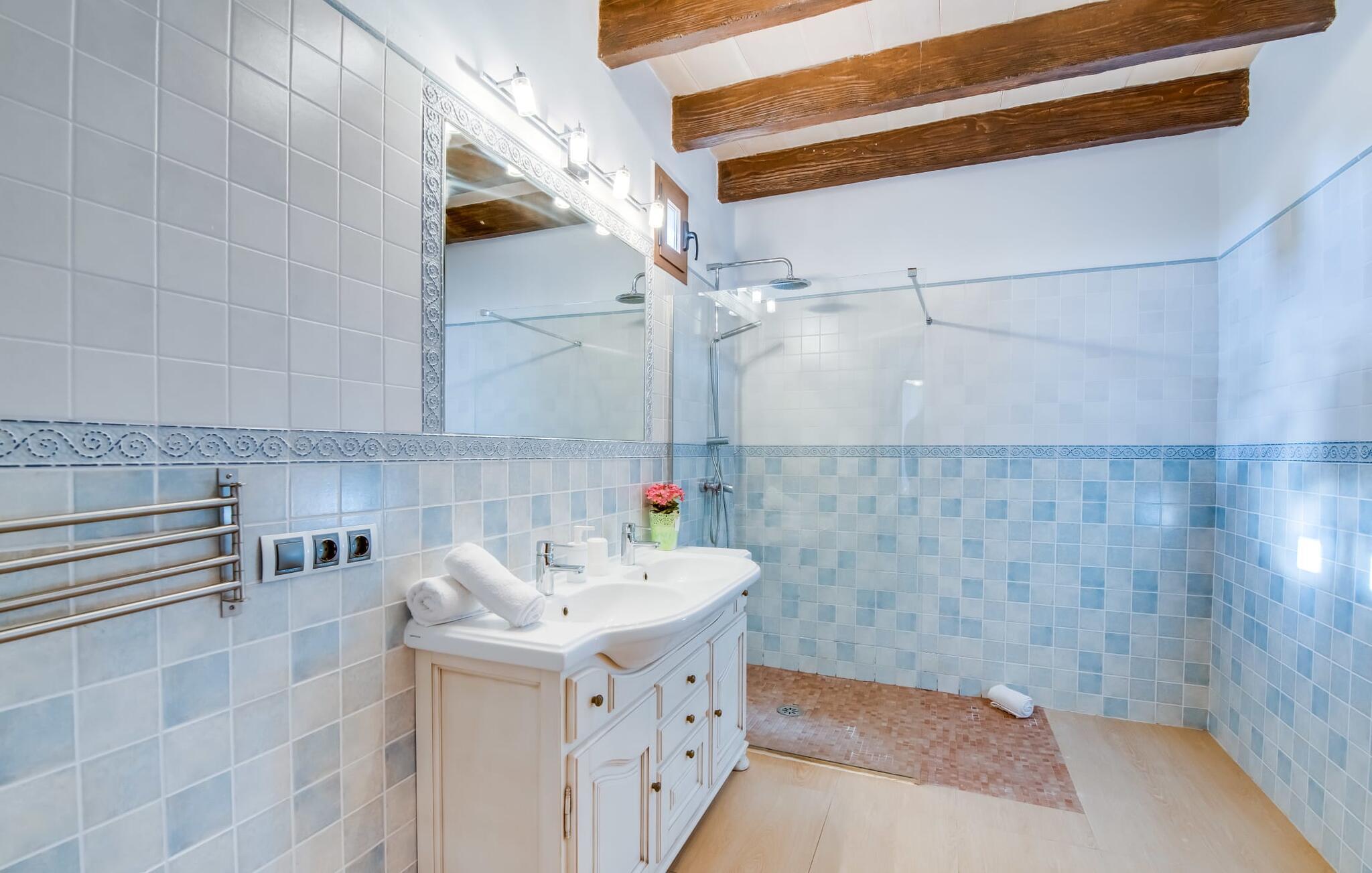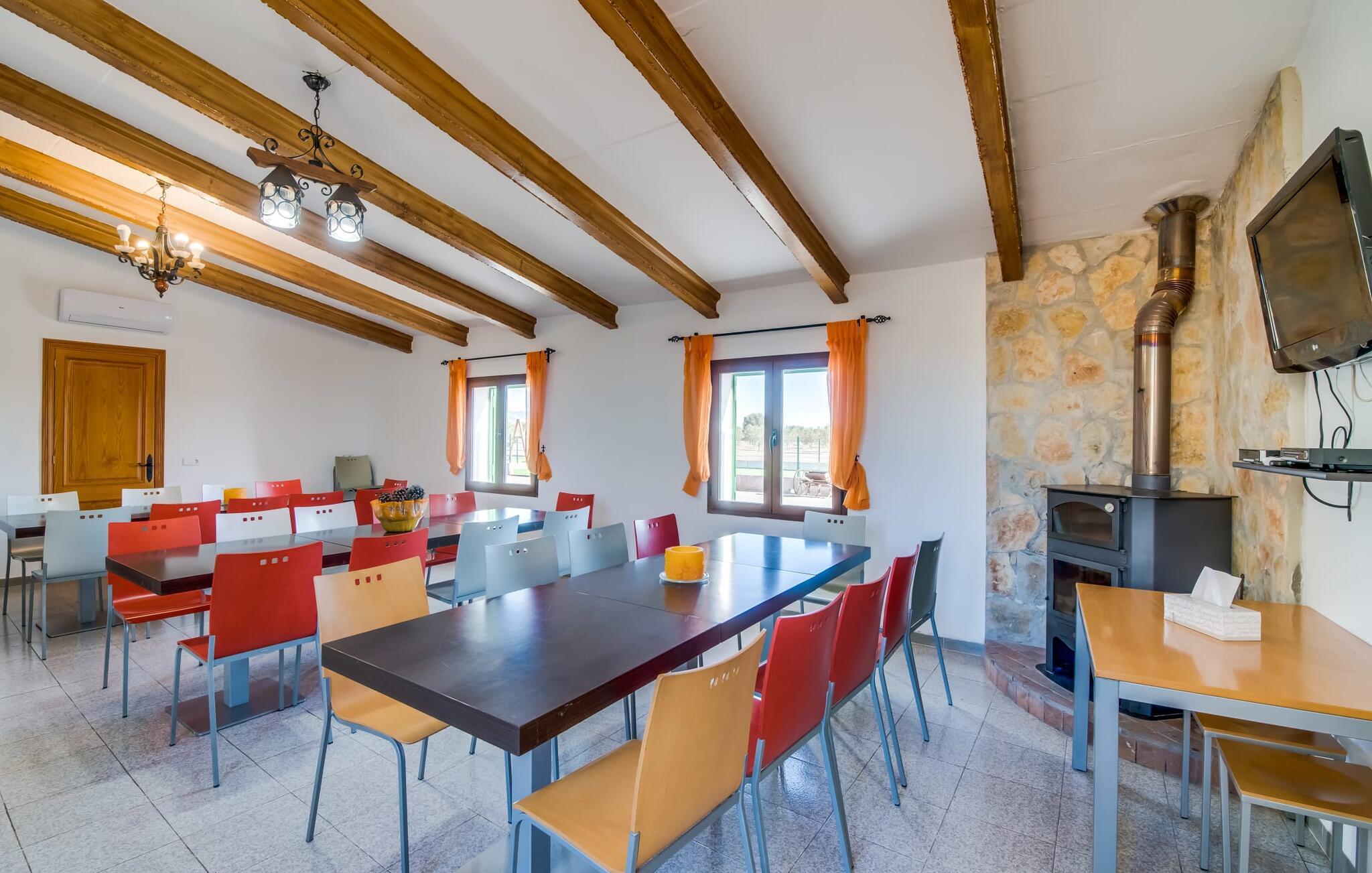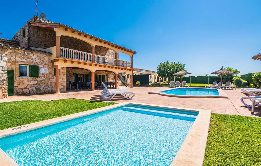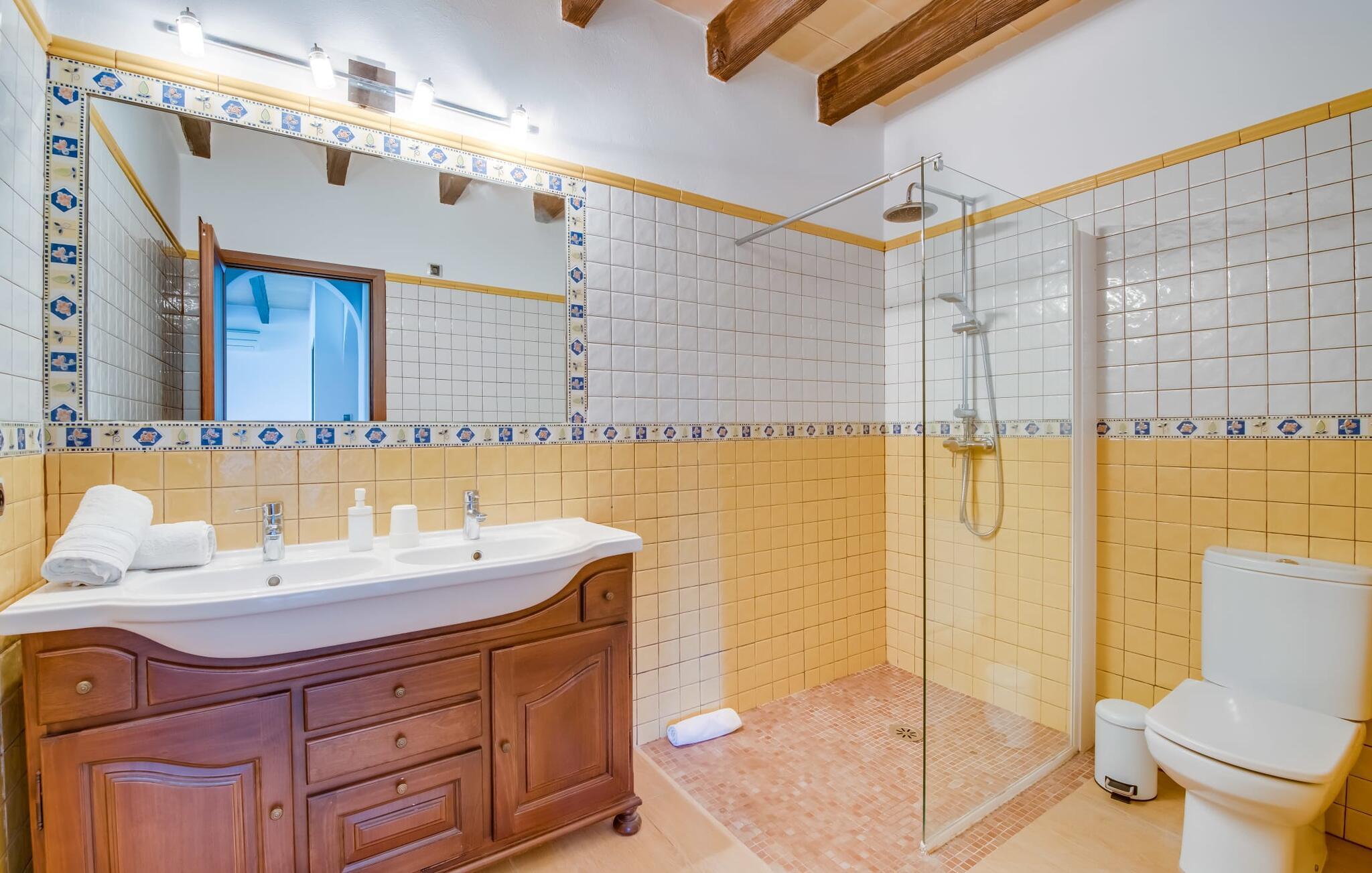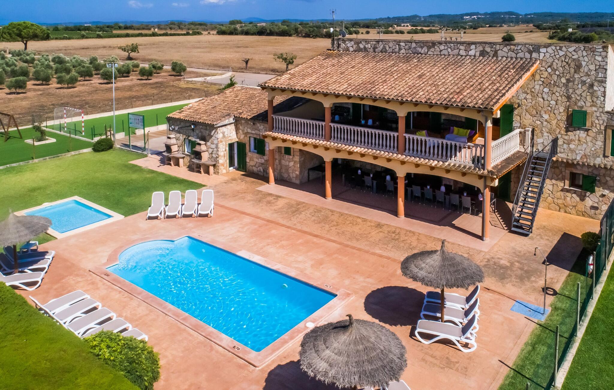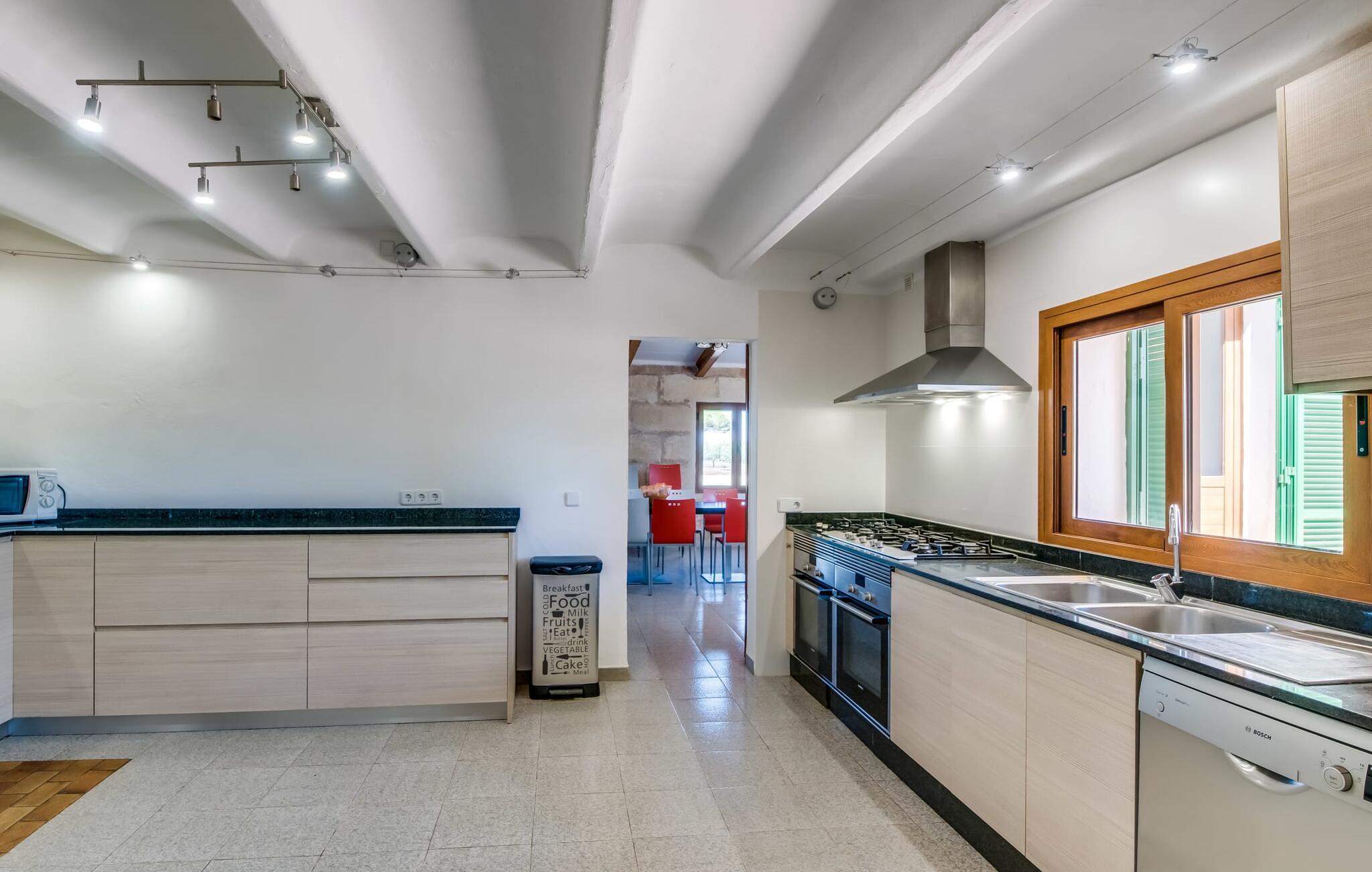 Når du kommer inn i villaen, som ikke bare har vakre, men også svært originale natursteinsfasader, finner du den nedre stuen med en ekstremt stor og komfortabel sofa og et rustikt spisebord for seks personer. TV-en og peisen er praktisk installert i dette rommet. Det klassisk designede kjøkkenet er lett å rengjøre og fullt utstyrt, inkludert vannkoker og kaffemaskin. I andre etasje finner man en lignende planløsning (inkludert et kjøkken til), med praktisk og attraktiv design og god plass til å føle seg hjemme. I denne første etasjen er det også en peis, noe som gir en koselig atmosfære på kjølige kvelder. En stor stue/spisestue gir alle gjestene i huset mulighet til å spise sammen og nyte fritiden innendørs. Seks av de ni individuelt utformede soverommene, som for det meste har klimaanlegg (ett av dem er et gjennomgangsrom som fører til et annet soverom), har eget bad. Alle de 11 badene har en behagelig, lys design, moderne inventar og noen av dem har vakre, typiske mallorkinske border. En original og unik bonus er de to ekstra selvbetjente oppholdsrommene som ble bygget i 2017 i nabobygningene. Det ene har plass til opptil seks personer, med tre soverom med dobbeltseng, to bad med dusj, kjøkken samt spisestue og stue. Det tredje rommet har fire soverom med dobbeltseng, to bad med dusj, kjøkken, spisestue og stue. Det første og det andre rommet er tilgjengelig for grupper på opptil 24 personer, mens grupper på 32 personer eller mer kan benytte hele eiendommen.