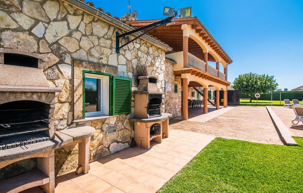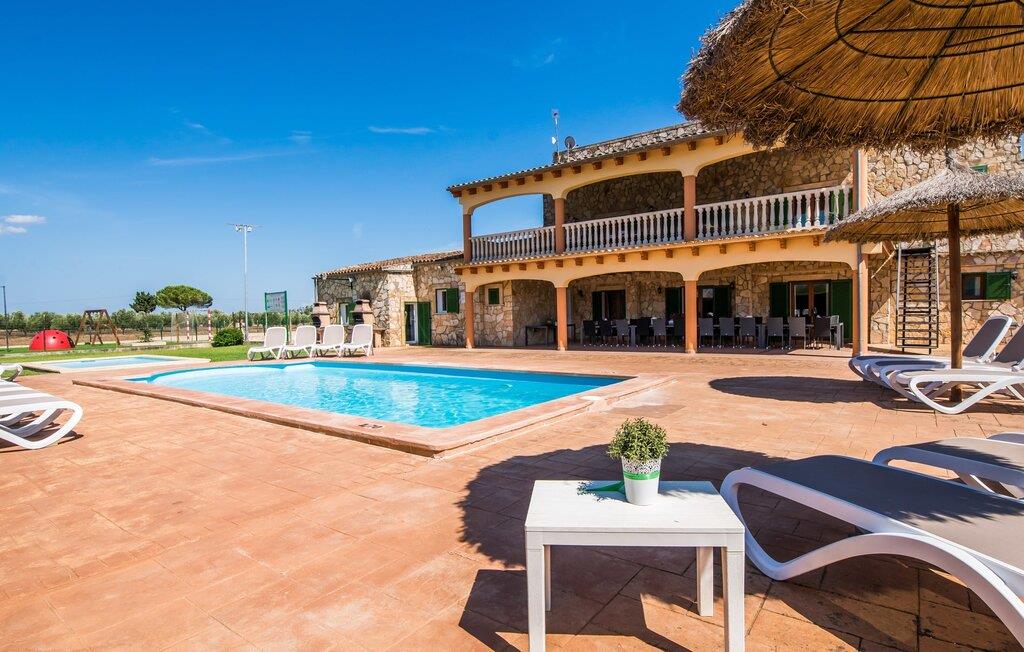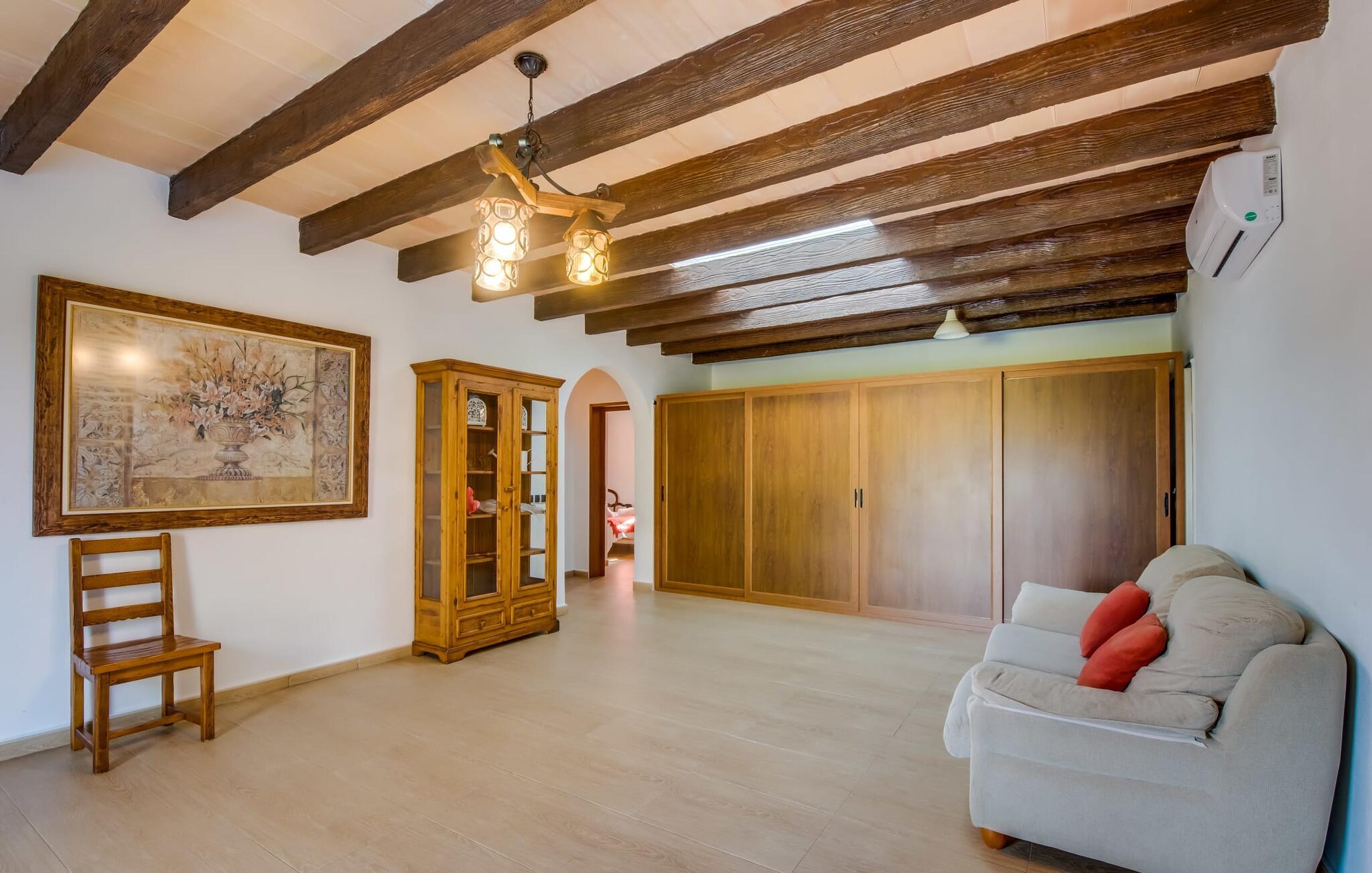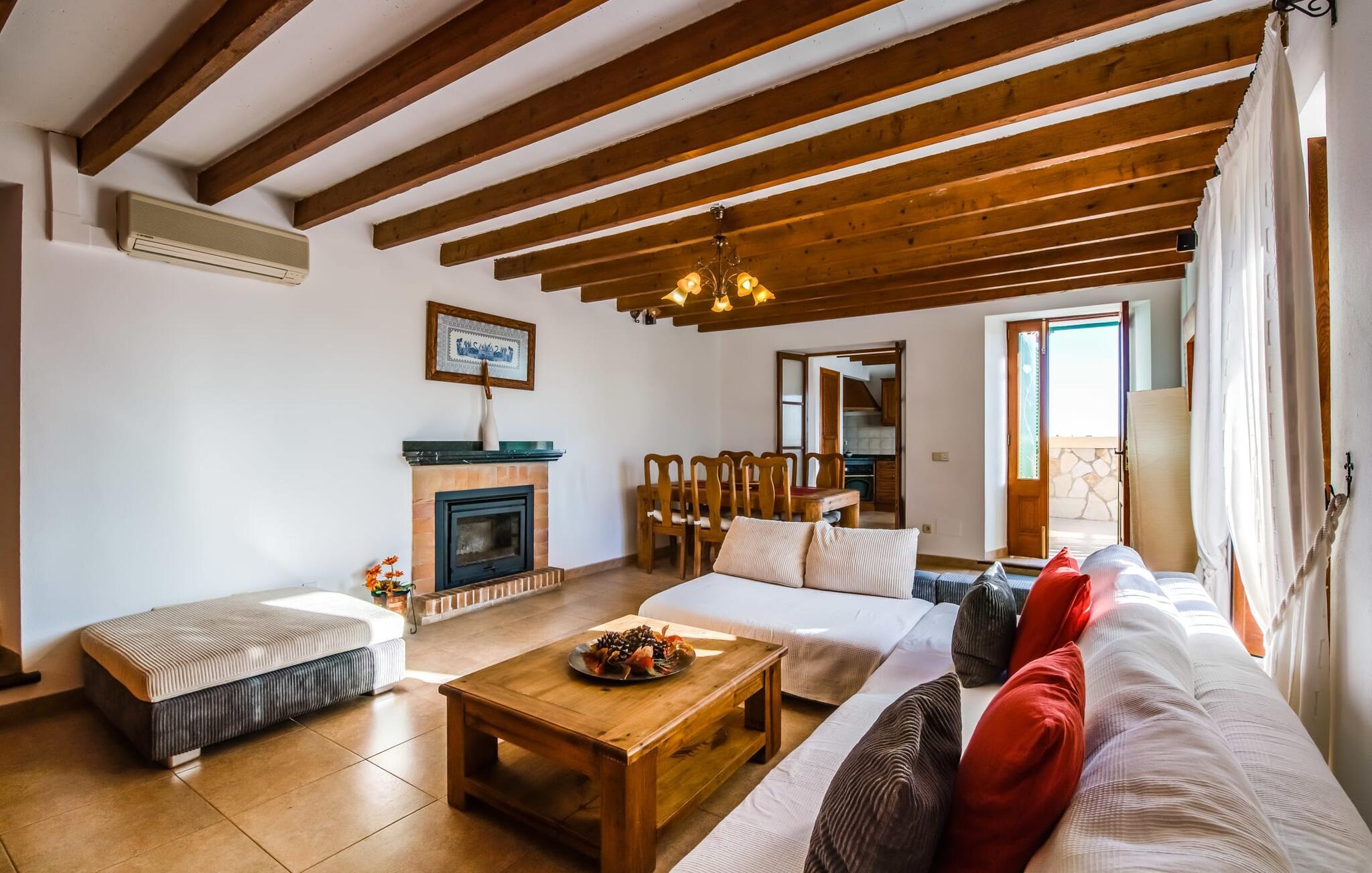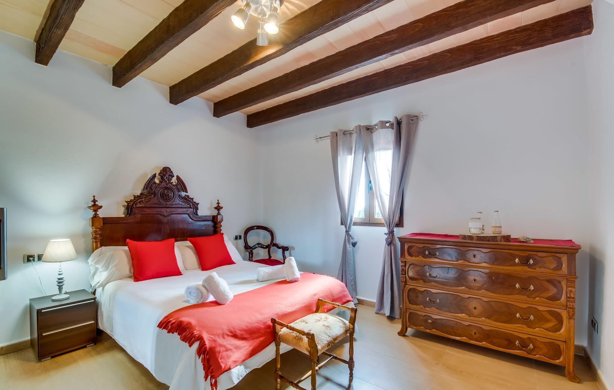 Når du kommer inn i villaen, som ikke bare har vakre, men også svært originale natursteinsfasader, finner du den nedre stuen med en ekstremt stor og komfortabel sofa og et rustikt spisebord for seks personer. TV-en og peisen er praktisk installert i dette rommet. Det klassisk designede kjøkkenet er lett å rengjøre og fullt utstyrt, inkludert vannkoker og kaffemaskin. I andre etasje finner man en lignende planløsning (inkludert et kjøkken til), med praktisk og attraktiv design og god plass til å føle seg hjemme. I denne første etasjen er det også en peis, noe som gir en koselig atmosfære på kjølige kvelder. En stor stue/spisestue gir alle gjestene i huset mulighet til å spise sammen og nyte fritiden innendørs. Seks av de ni individuelt utformede soverommene, som for det meste har klimaanlegg (ett av dem er et gjennomgangsrom som fører til et annet soverom), har eget bad. Alle de 11 badene har en behagelig, lys design, moderne inventar og noen av dem har vakre, typiske mallorkinske border. En original og unik bonus er de to ekstra selvbetjente oppholdsrommene som ble bygget i 2017 i nabobygningene. Det ene har plass til opptil seks personer, med tre soverom med dobbeltseng, to bad med dusj, kjøkken samt spisestue og stue. Det tredje rommet har fire soverom med dobbeltseng, to bad med dusj, kjøkken, spisestue og stue. Det første og det andre rommet er tilgjengelig for grupper på opptil 24 personer, mens grupper på 32 personer eller mer kan benytte hele eiendommen.