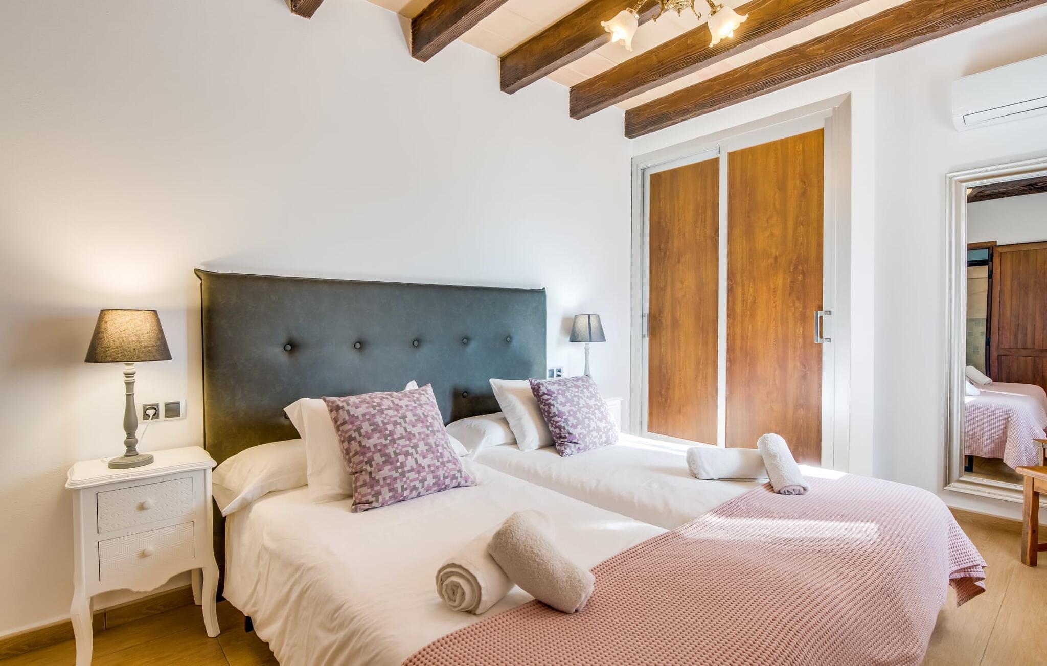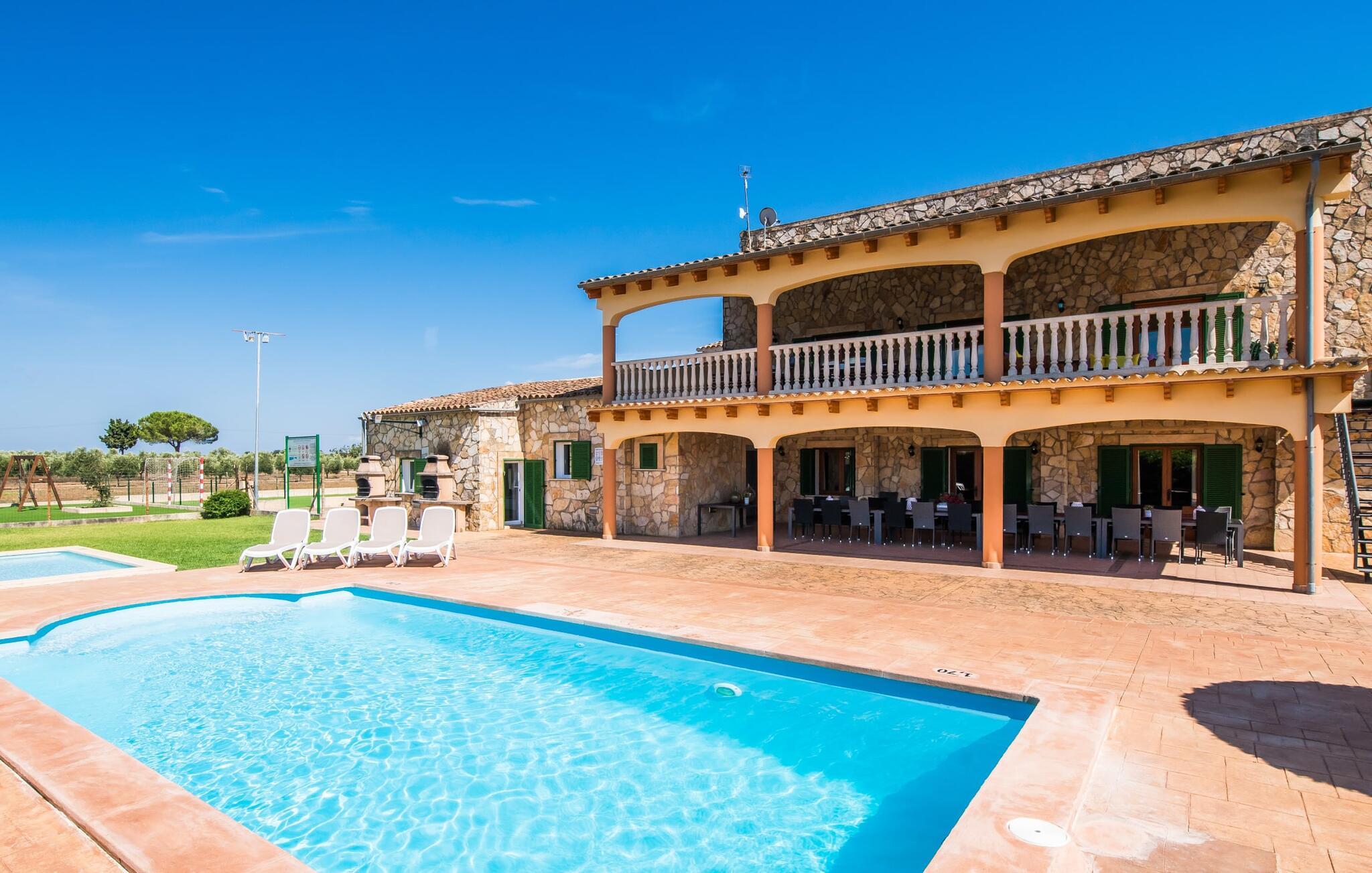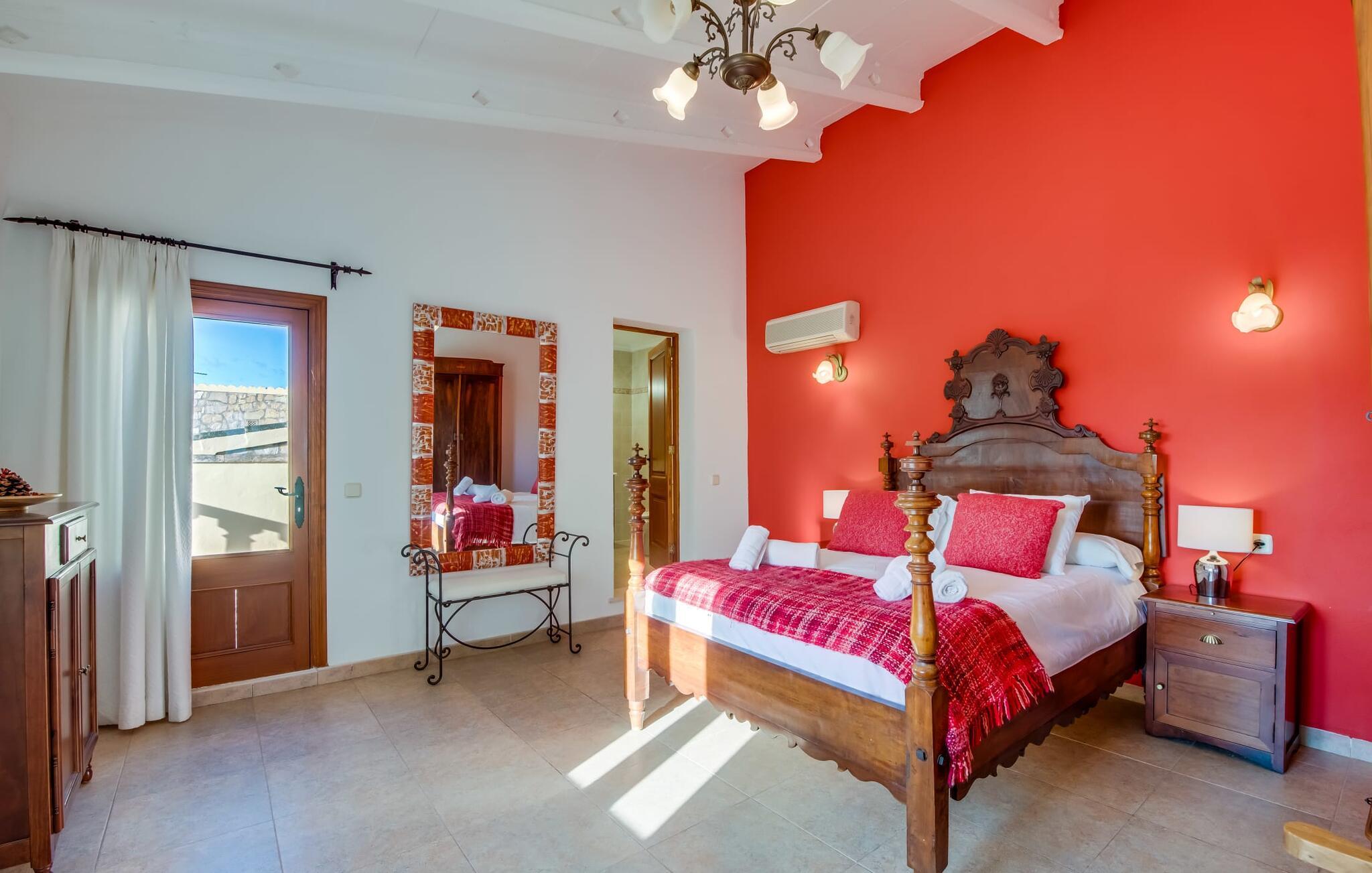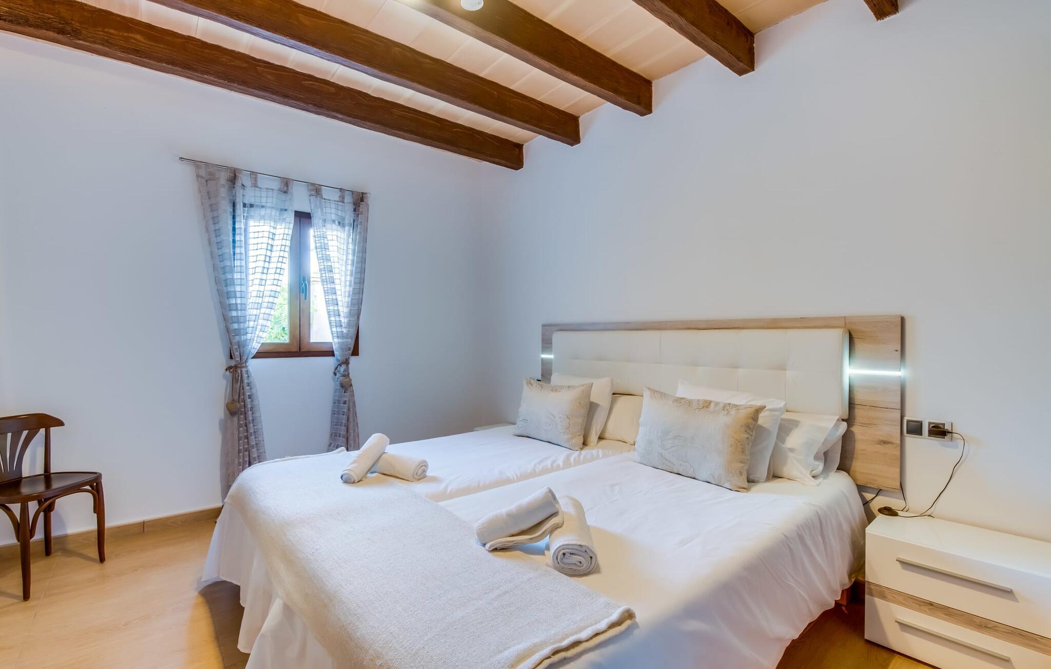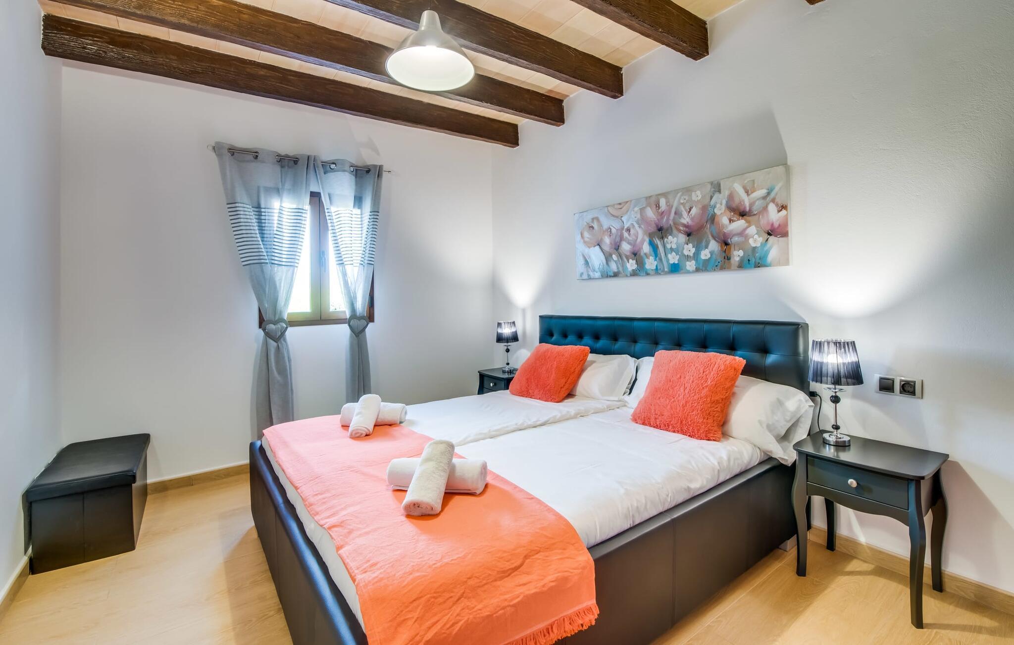 Når du kommer inn i villaen, som ikke bare har vakre, men også svært originale natursteinsfasader, finner du den nedre stuen med en ekstremt stor og komfortabel sofa og et rustikt spisebord for seks personer. TV-en og peisen er praktisk installert i dette rommet. Det klassisk designede kjøkkenet er lett å rengjøre og fullt utstyrt, inkludert vannkoker og kaffemaskin. I andre etasje finner man en lignende planløsning (inkludert et kjøkken til), med praktisk og attraktiv design og god plass til å føle seg hjemme. I denne første etasjen er det også en peis, noe som gir en koselig atmosfære på kjølige kvelder. En stor stue/spisestue gir alle gjestene i huset mulighet til å spise sammen og nyte fritiden innendørs. Seks av de ni individuelt utformede soverommene, som for det meste har klimaanlegg (ett av dem er et gjennomgangsrom som fører til et annet soverom), har eget bad. Alle de 11 badene har en behagelig, lys design, moderne inventar og noen av dem har vakre, typiske mallorkinske border. En original og unik bonus er de to ekstra selvbetjente oppholdsrommene som ble bygget i 2017 i nabobygningene. Det ene har plass til opptil seks personer, med tre soverom med dobbeltseng, to bad med dusj, kjøkken samt spisestue og stue. Det tredje rommet har fire soverom med dobbeltseng, to bad med dusj, kjøkken, spisestue og stue. Det første og det andre rommet er tilgjengelig for grupper på opptil 24 personer, mens grupper på 32 personer eller mer kan benytte hele eiendommen.