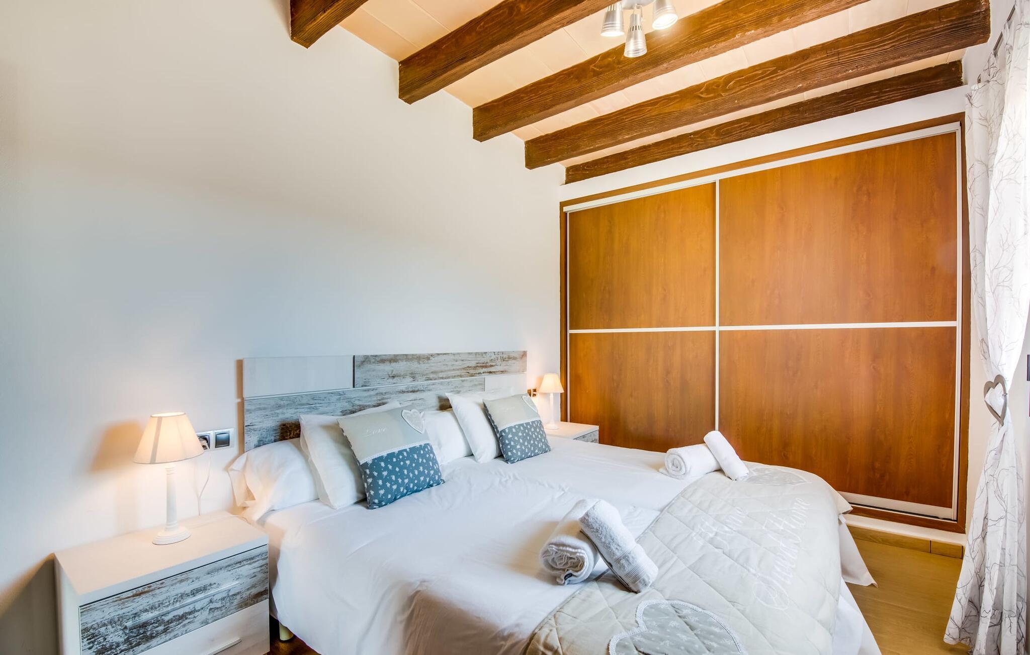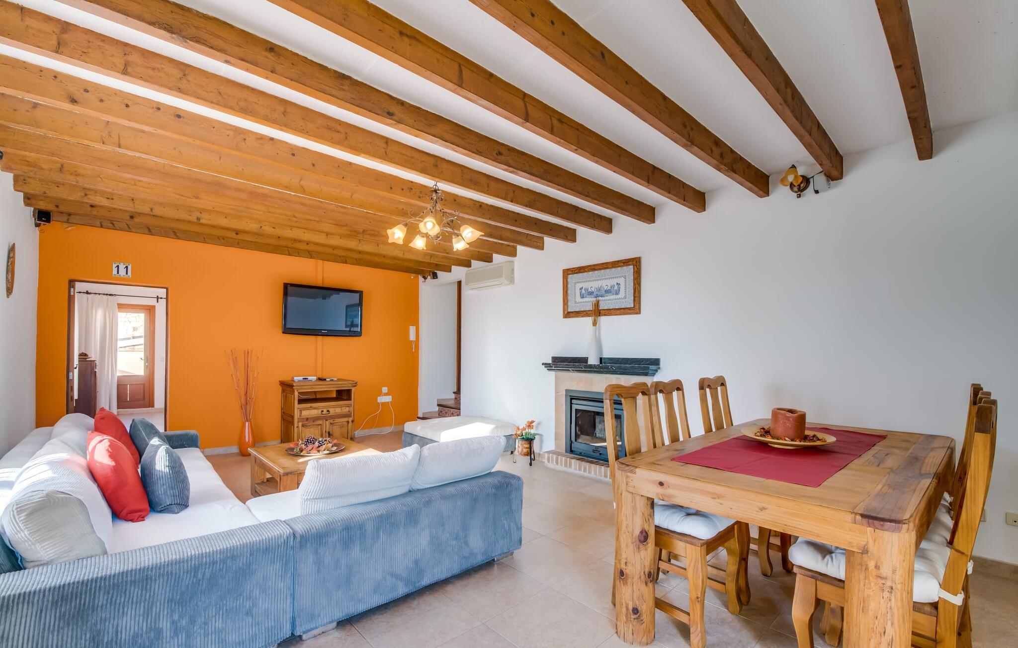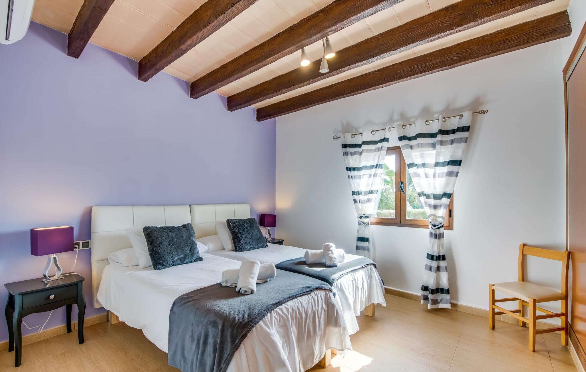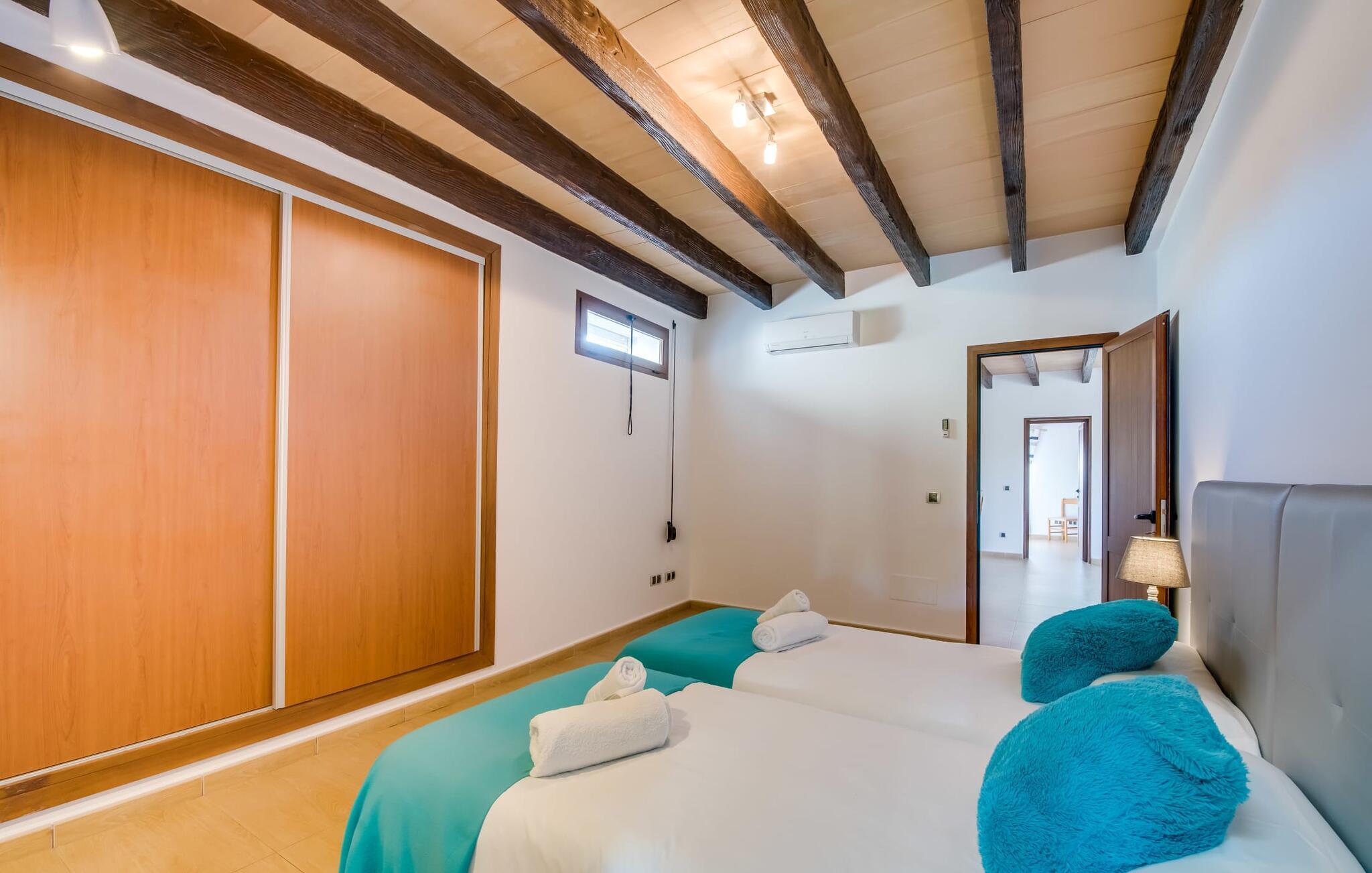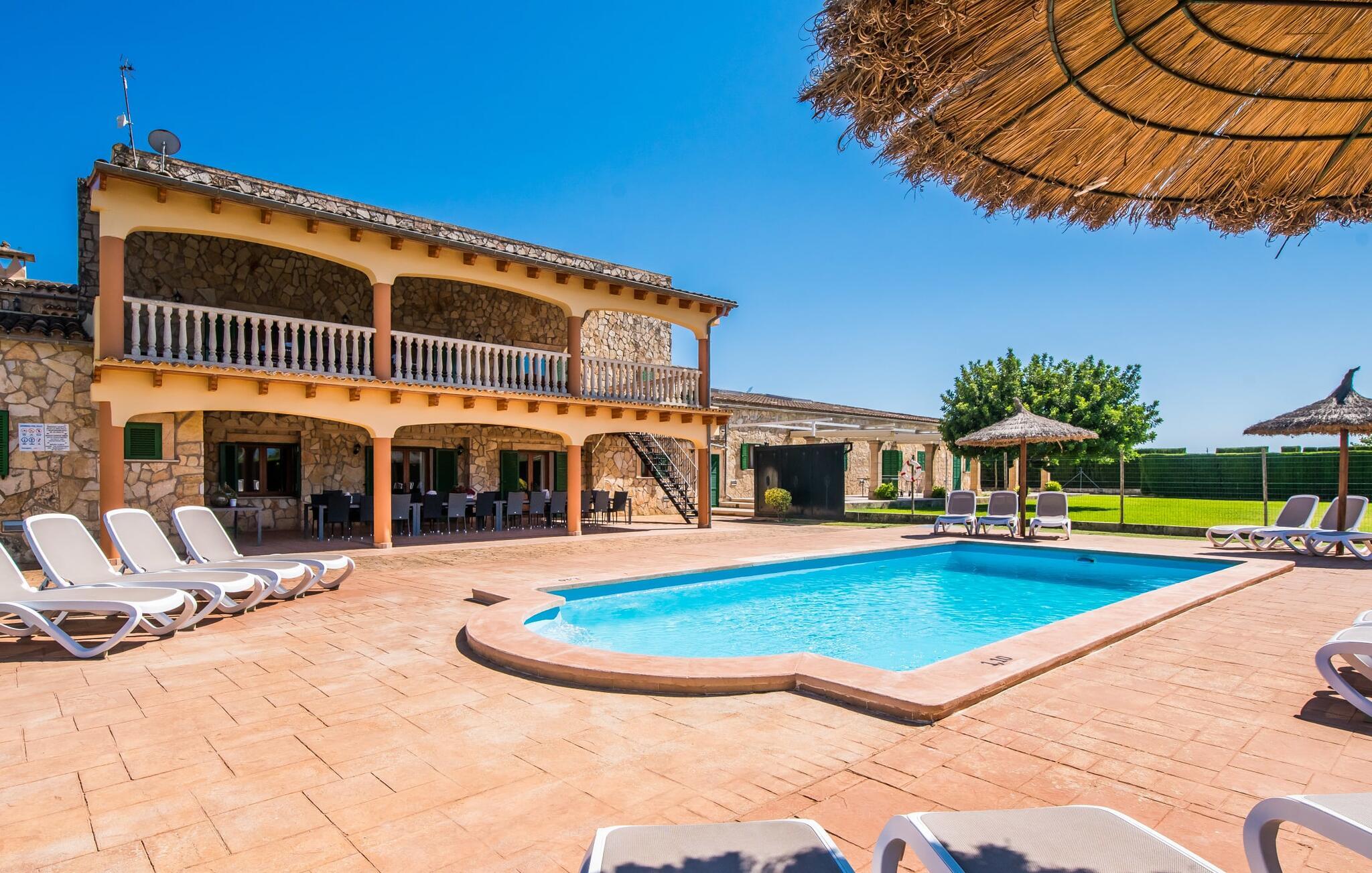 Når du kommer inn i villaen, som ikke bare har vakre, men også svært originale natursteinsfasader, finner du den nedre stuen med en ekstremt stor og komfortabel sofa og et rustikt spisebord for seks personer. TV-en og peisen er praktisk installert i dette rommet. Det klassisk designede kjøkkenet er lett å rengjøre og fullt utstyrt, inkludert vannkoker og kaffemaskin. I andre etasje finner man en lignende planløsning (inkludert et kjøkken til), med praktisk og attraktiv design og god plass til å føle seg hjemme. I denne første etasjen er det også en peis, noe som gir en koselig atmosfære på kjølige kvelder. En stor stue/spisestue gir alle gjestene i huset mulighet til å spise sammen og nyte fritiden innendørs. Seks av de ni individuelt utformede soverommene, som for det meste har klimaanlegg (ett av dem er et gjennomgangsrom som fører til et annet soverom), har eget bad. Alle de 11 badene har en behagelig, lys design, moderne inventar og noen av dem har vakre, typiske mallorkinske border. En original og unik bonus er de to ekstra selvbetjente oppholdsrommene som ble bygget i 2017 i nabobygningene. Det ene har plass til opptil seks personer, med tre soverom med dobbeltseng, to bad med dusj, kjøkken samt spisestue og stue. Det tredje rommet har fire soverom med dobbeltseng, to bad med dusj, kjøkken, spisestue og stue. Det første og det andre rommet er tilgjengelig for grupper på opptil 24 personer, mens grupper på 32 personer eller mer kan benytte hele eiendommen.